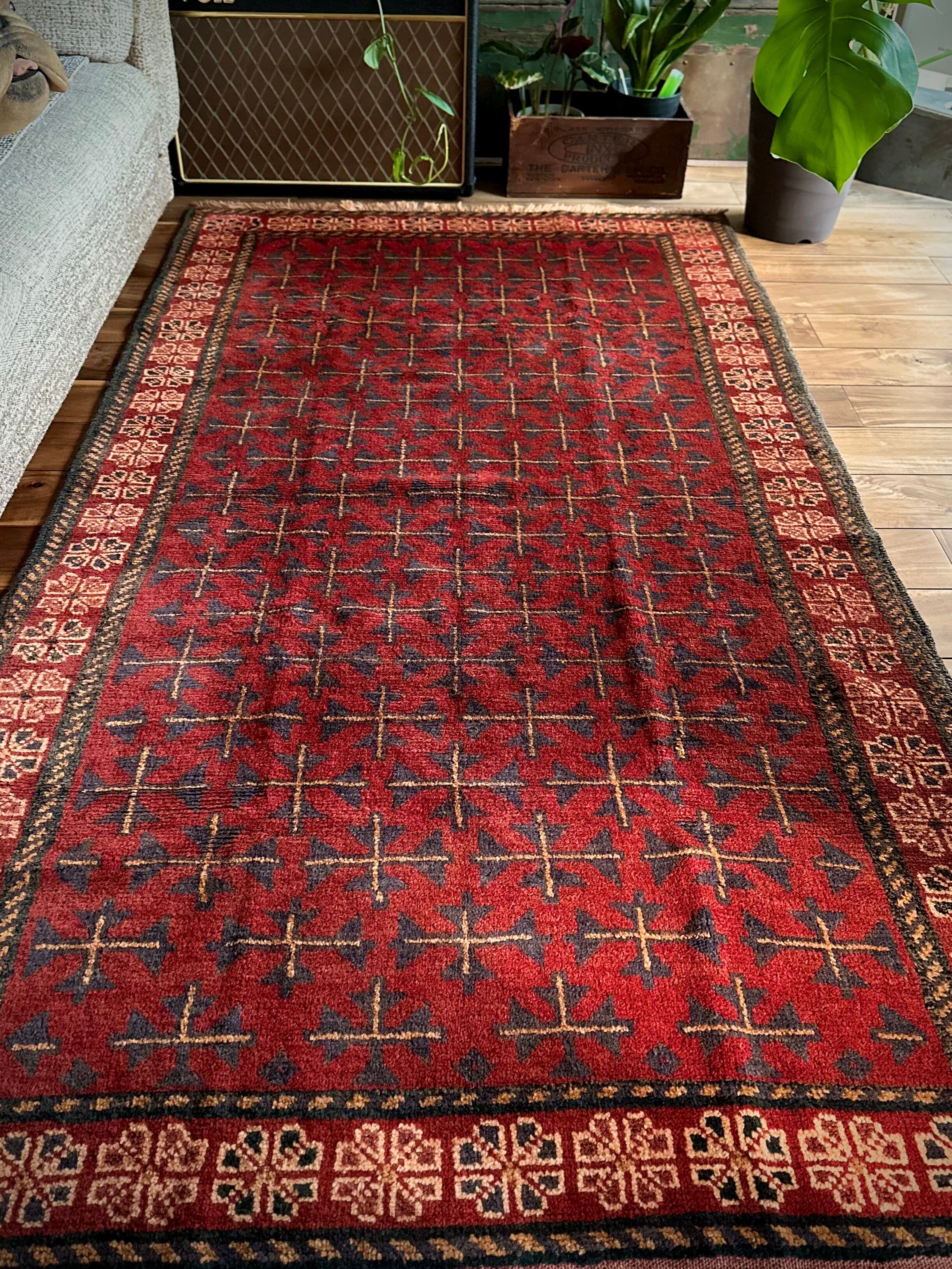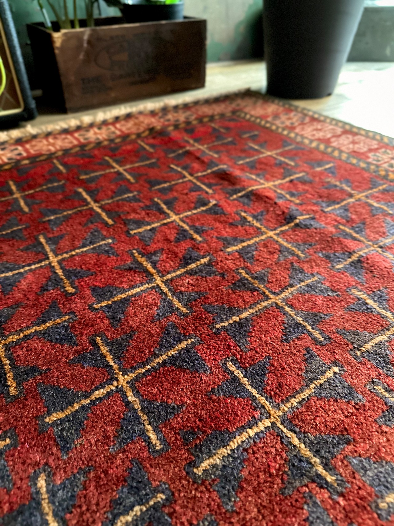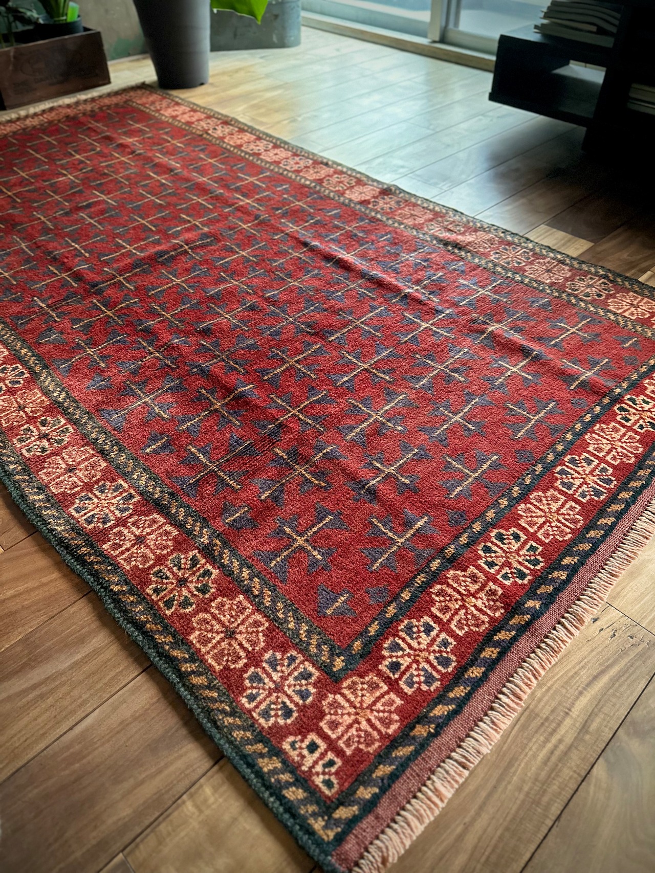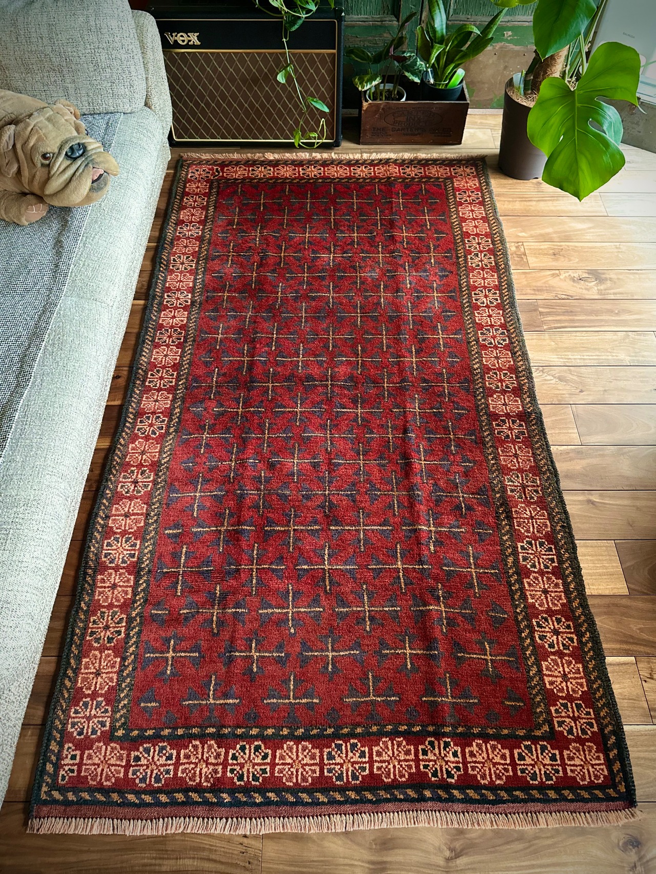 小豆色の落ち着きのあるバーガンディレッドにシンプルな十字の模様がモダンな雰囲気のこちらは、アフガニスタンはヘラート州に居住するバルーチ族のトライバルラグで、見た目通りな毛足長めのふっくらとしたメインラグになります。