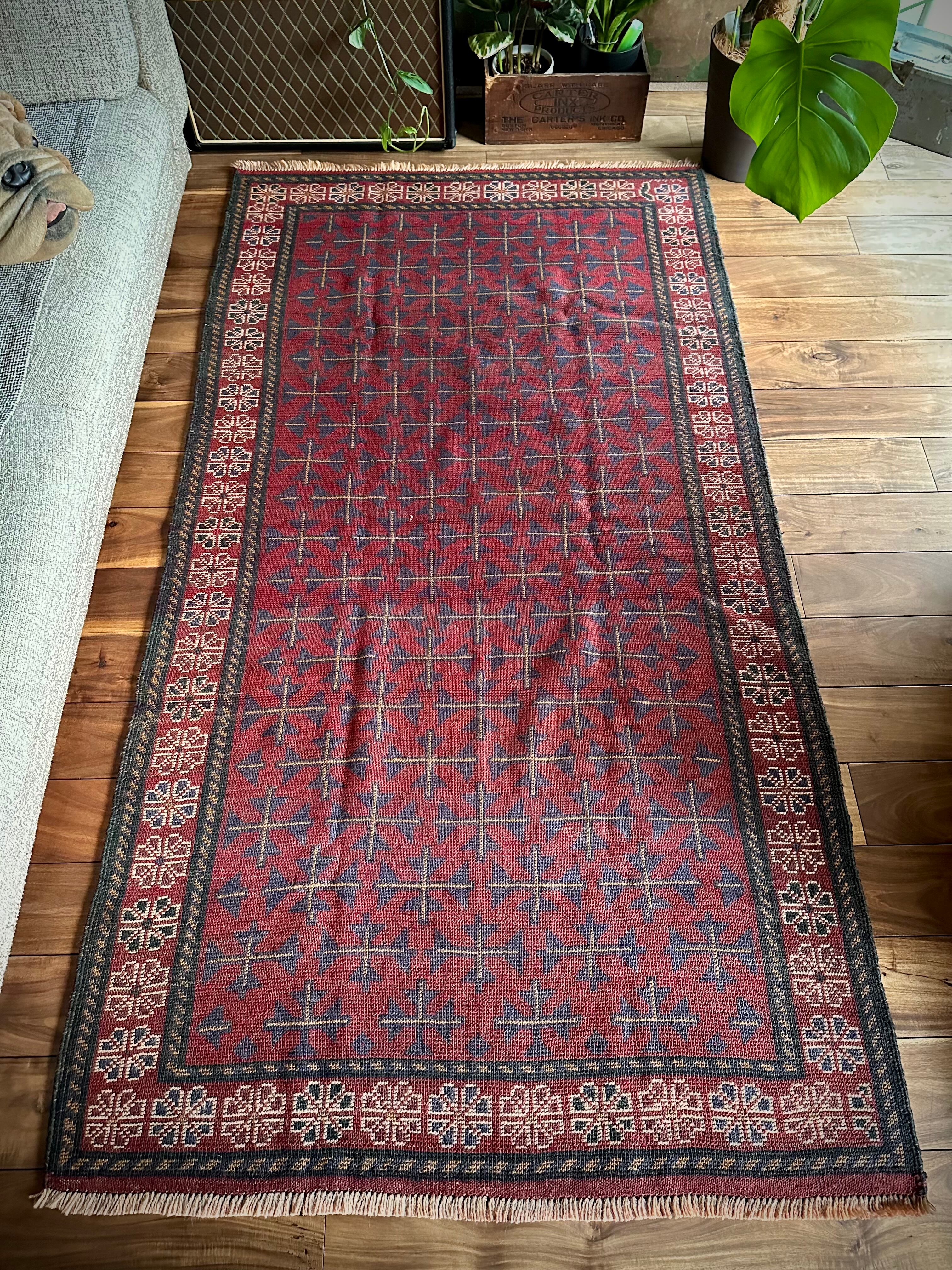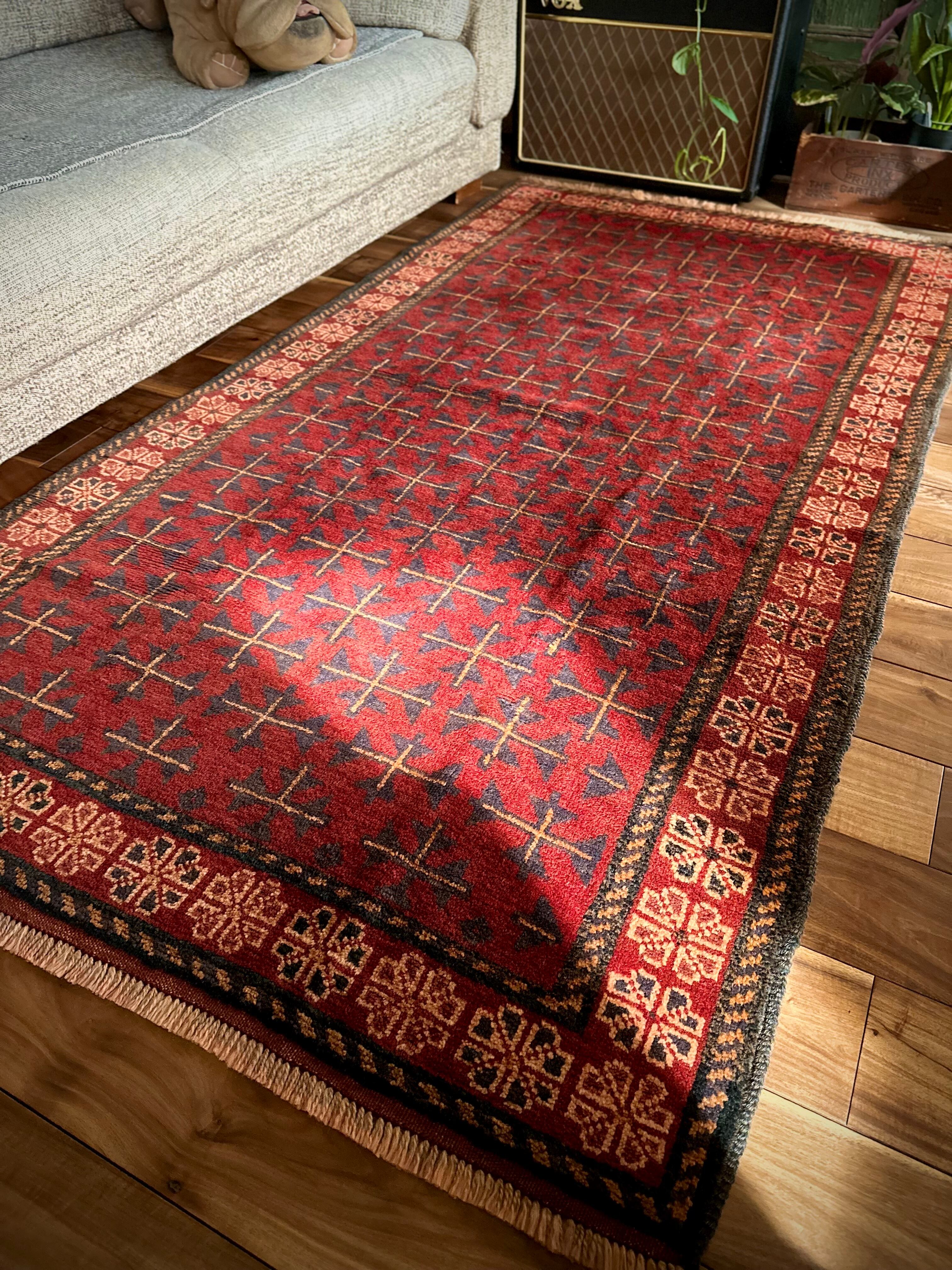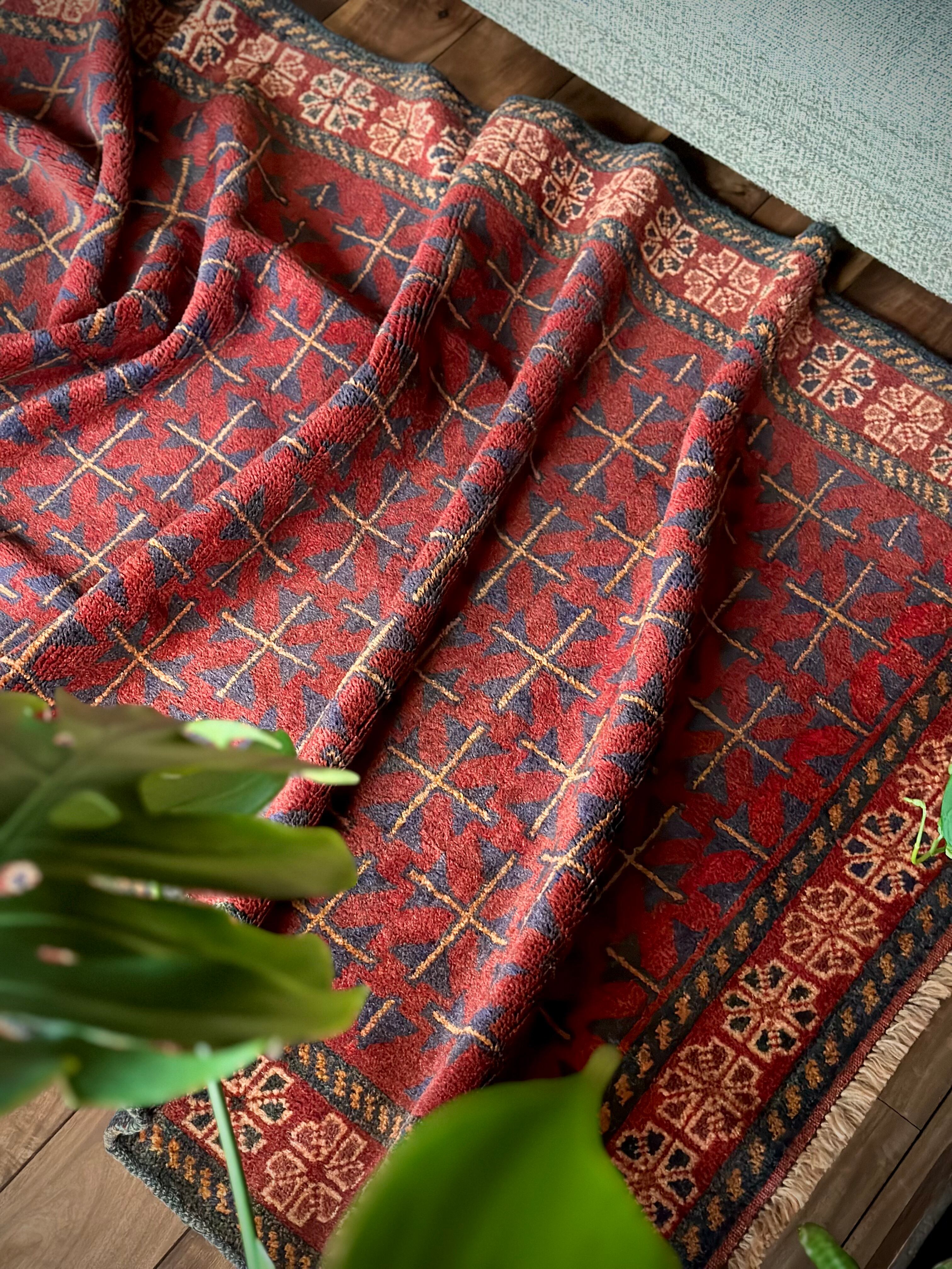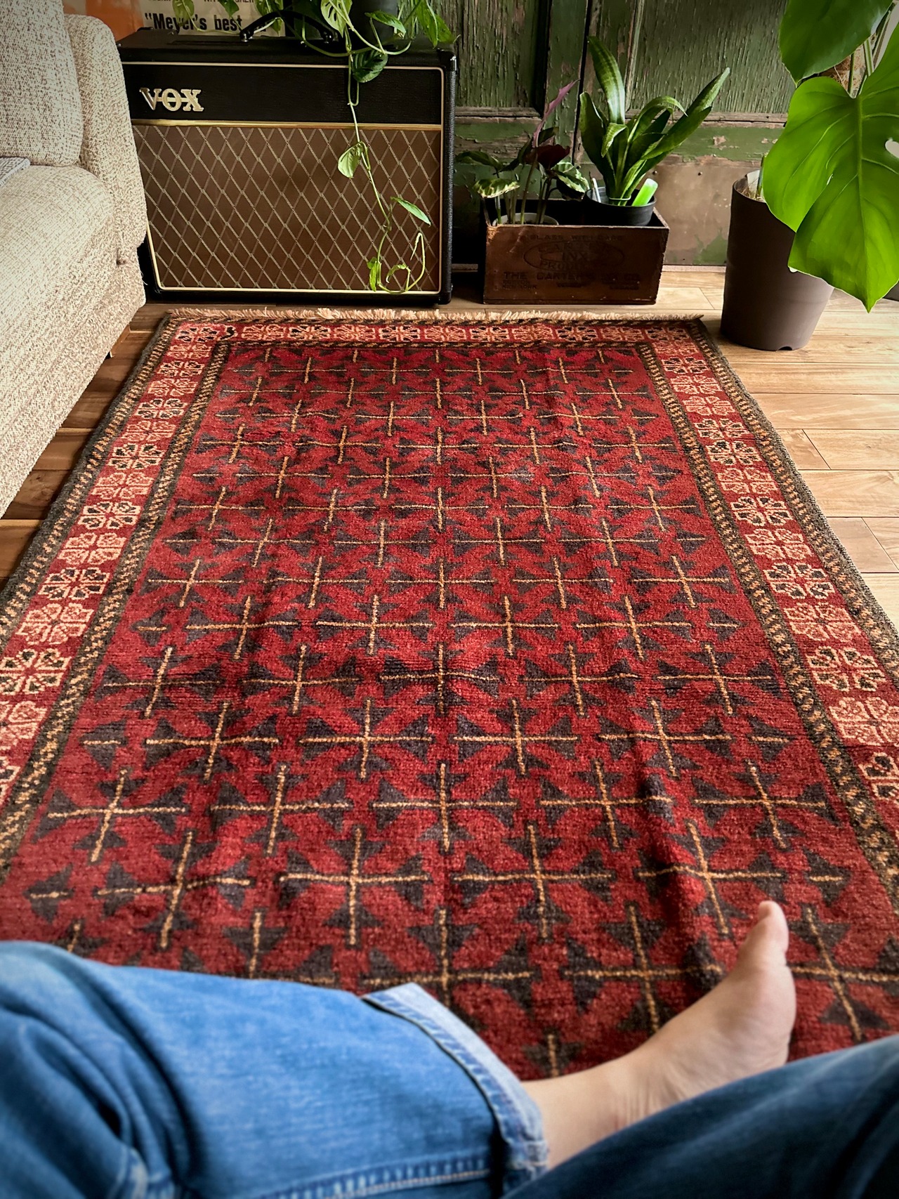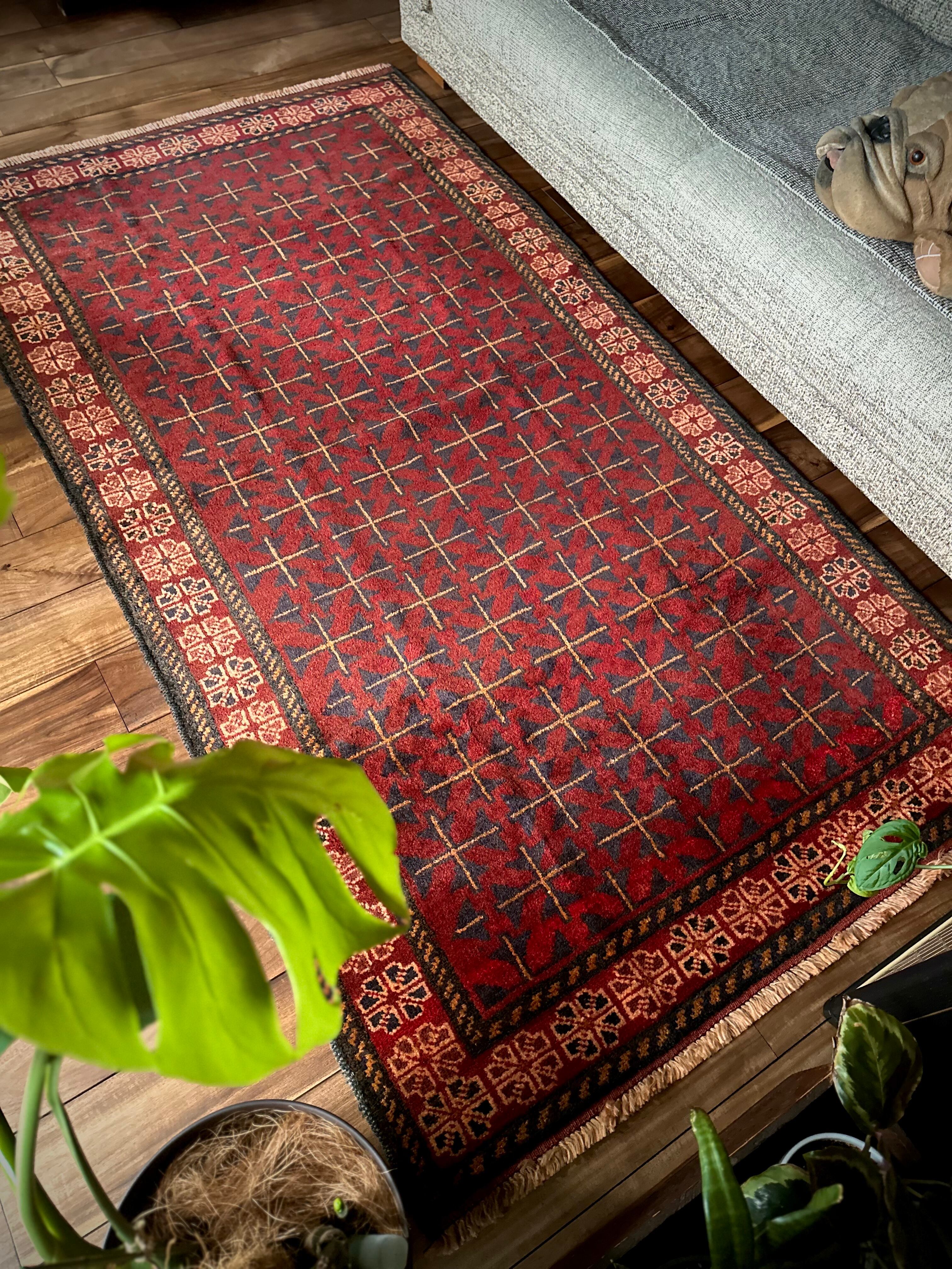 小豆色の落ち着きのあるバーガンディレッドにシンプルな十字の模様がモダンな雰囲気のこちらは、アフガニスタンはヘラート州に居住するバルーチ族のトライバルラグで、見た目通りな毛足長めのふっくらとしたメインラグになります。