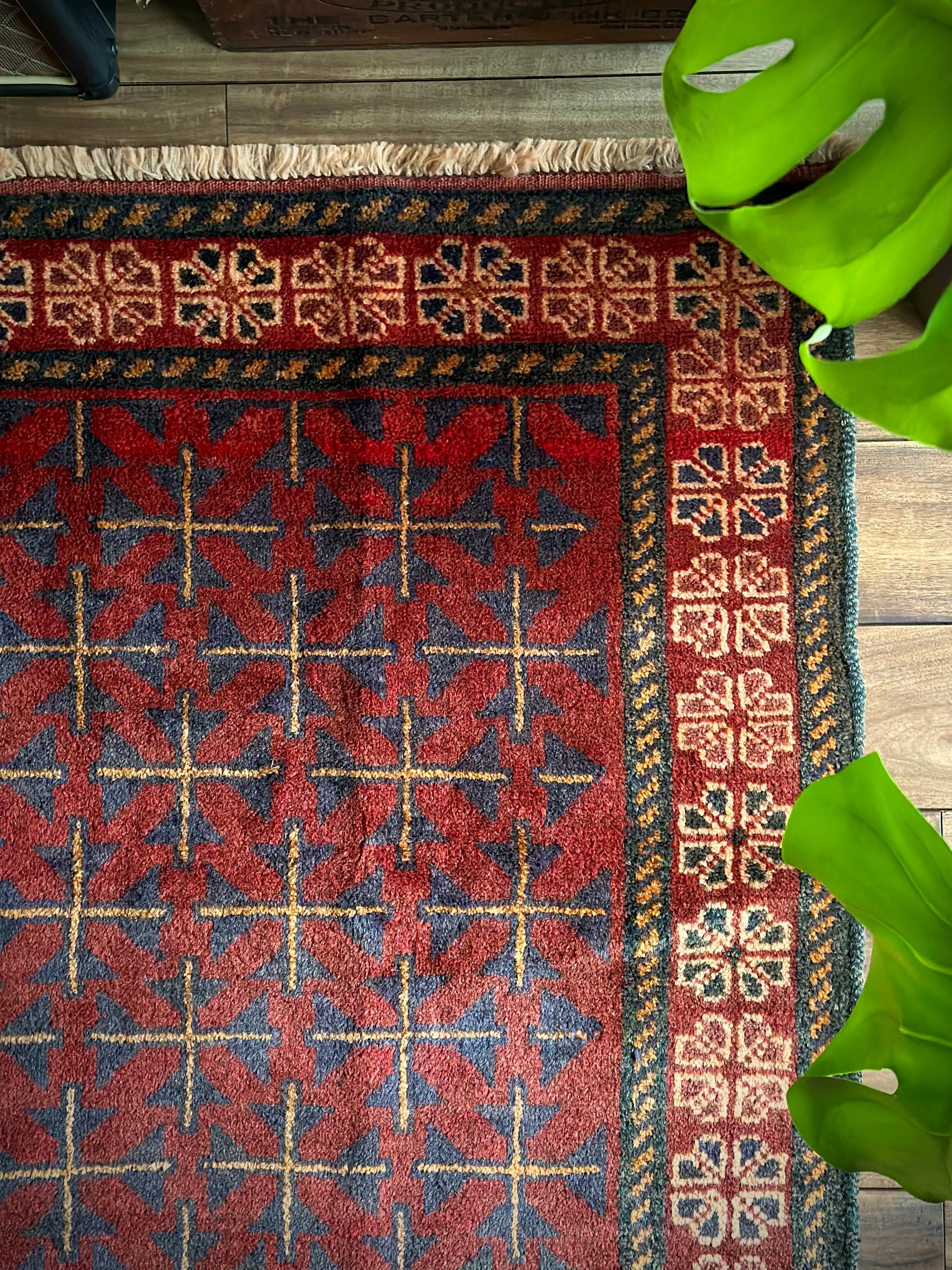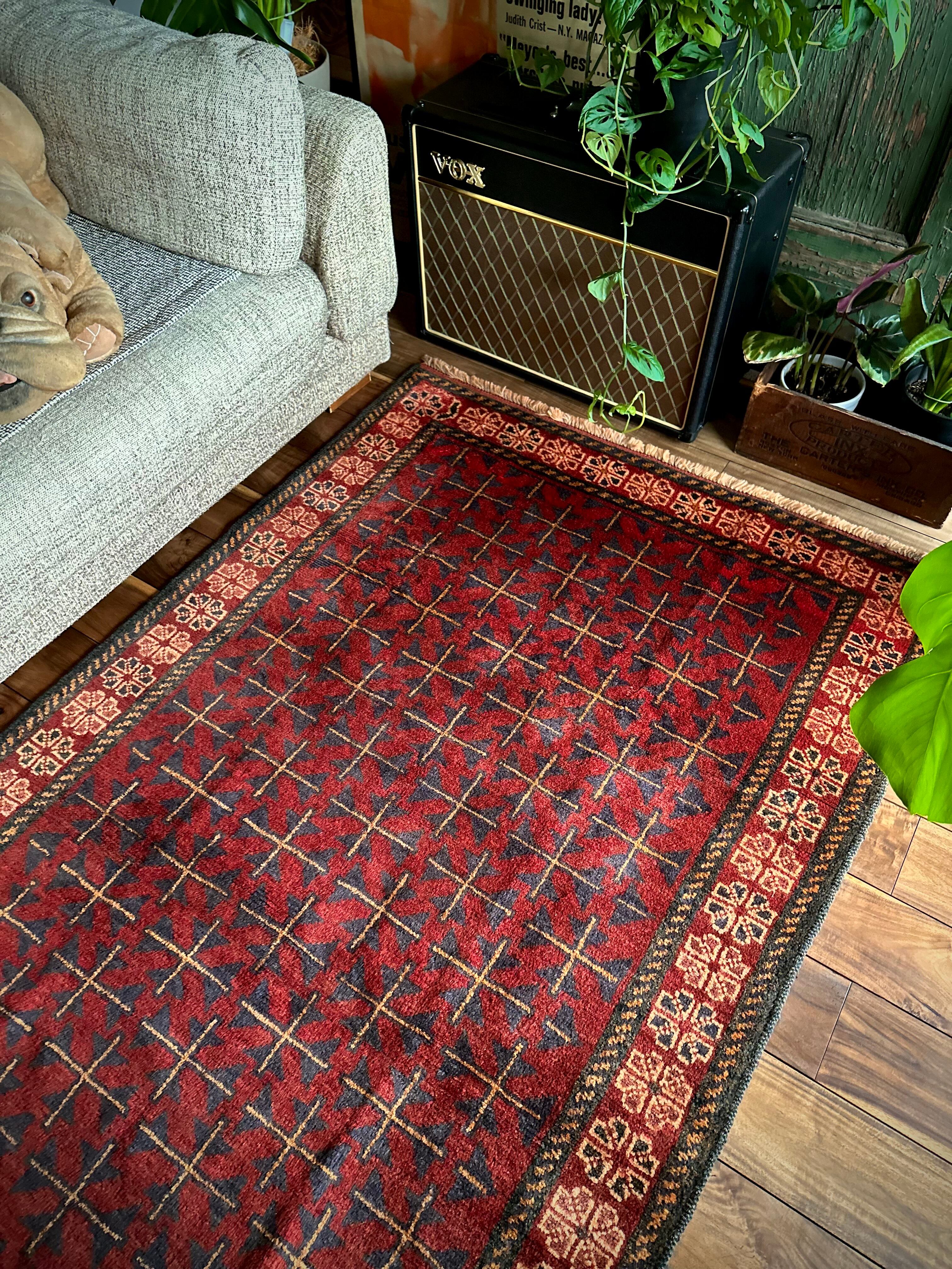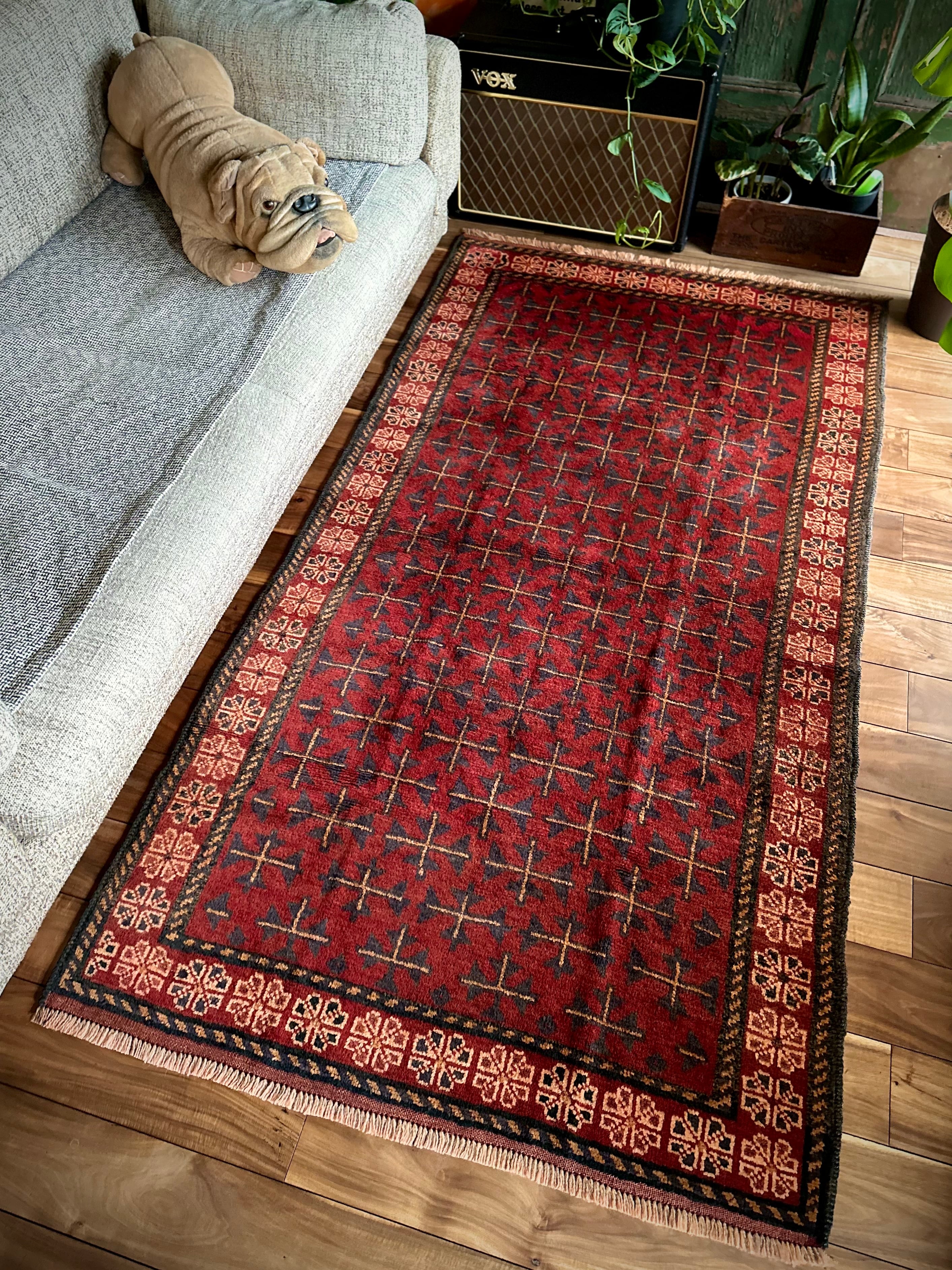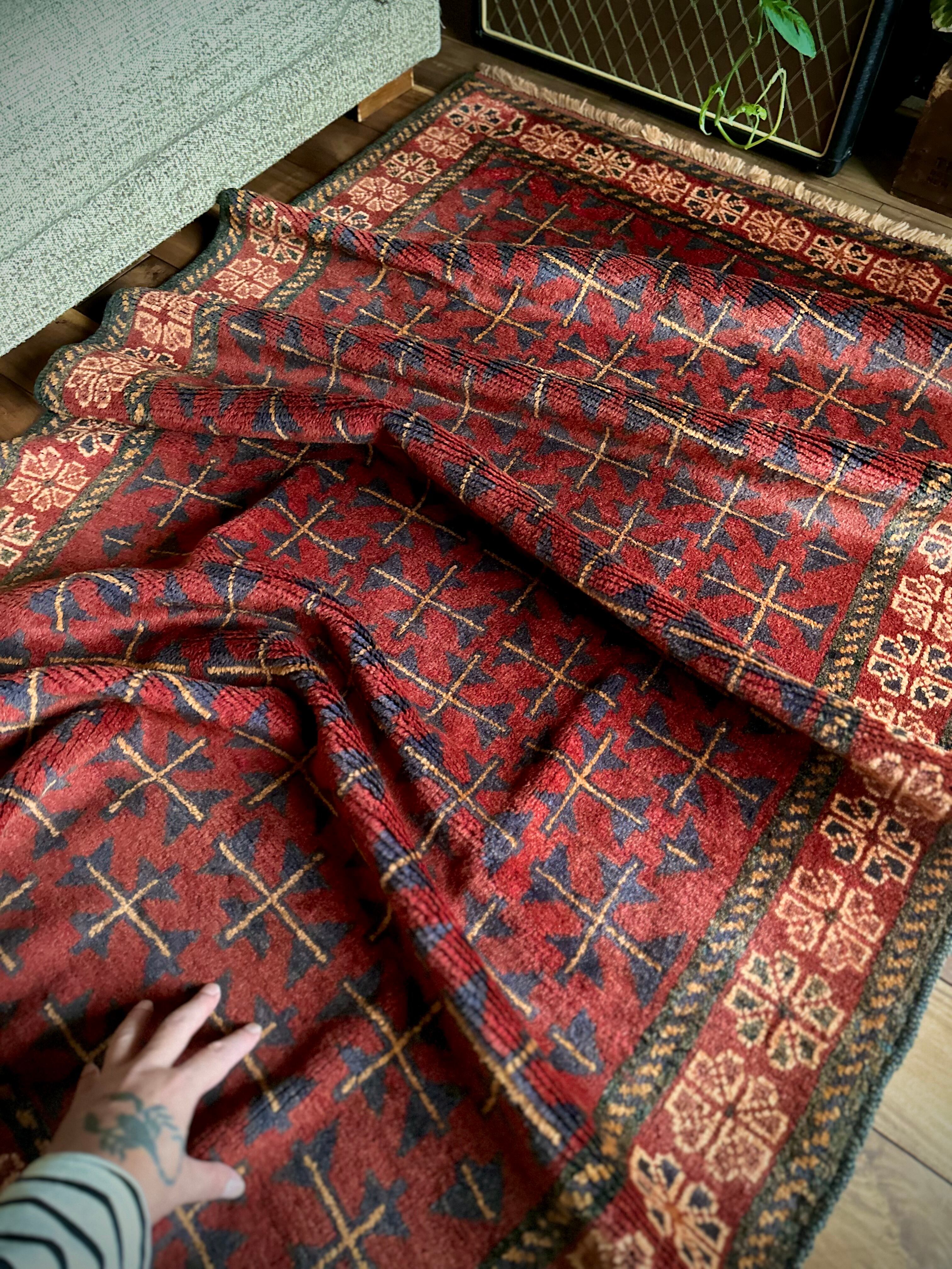 小豆色の落ち着きのあるバーガンディレッドにシンプルな十字の模様がモダンな雰囲気のこちらは、アフガニスタンはヘラート州に居住するバルーチ族のトライバルラグで、見た目通りな毛足長めのふっくらとしたメインラグになります。