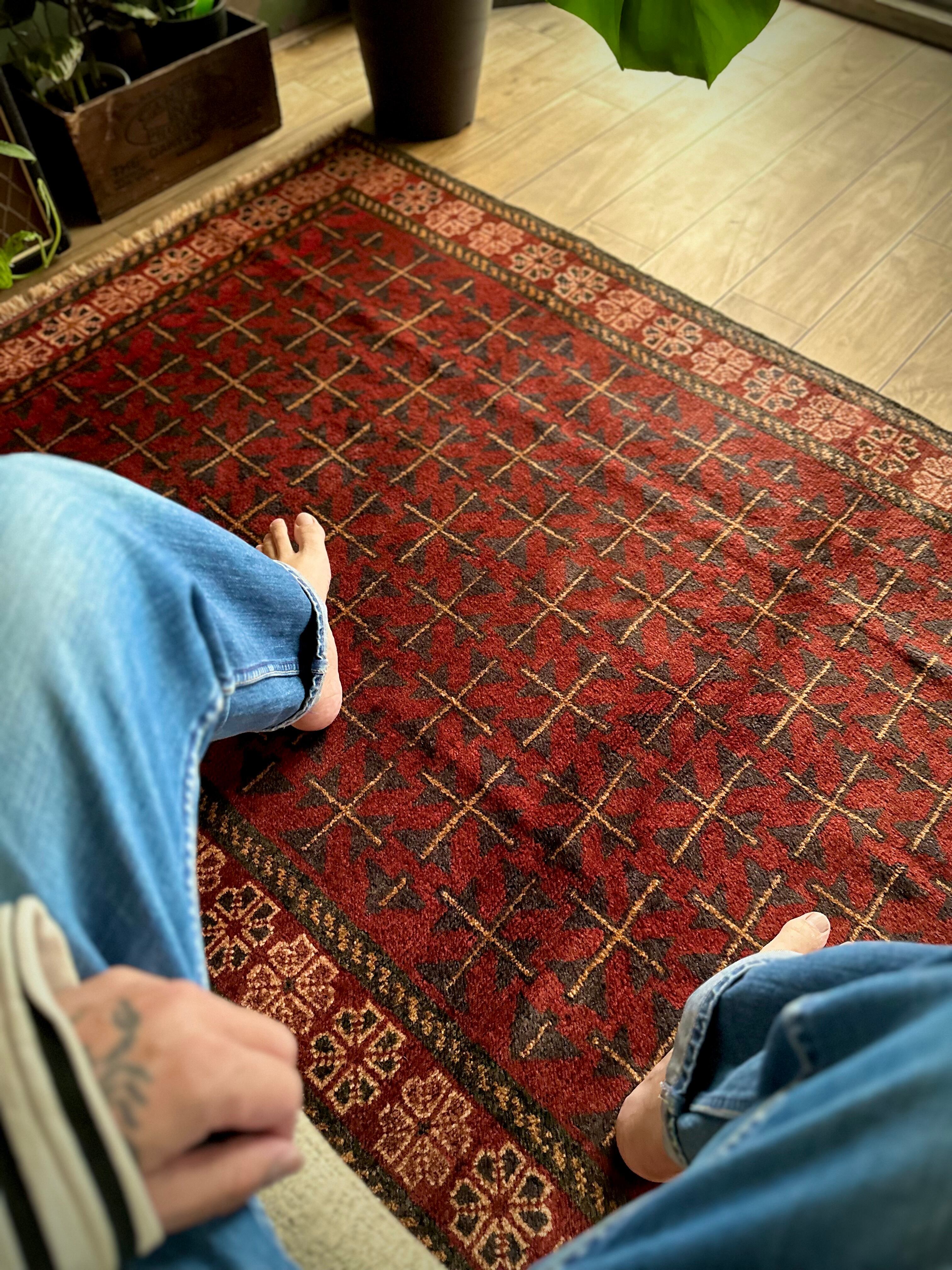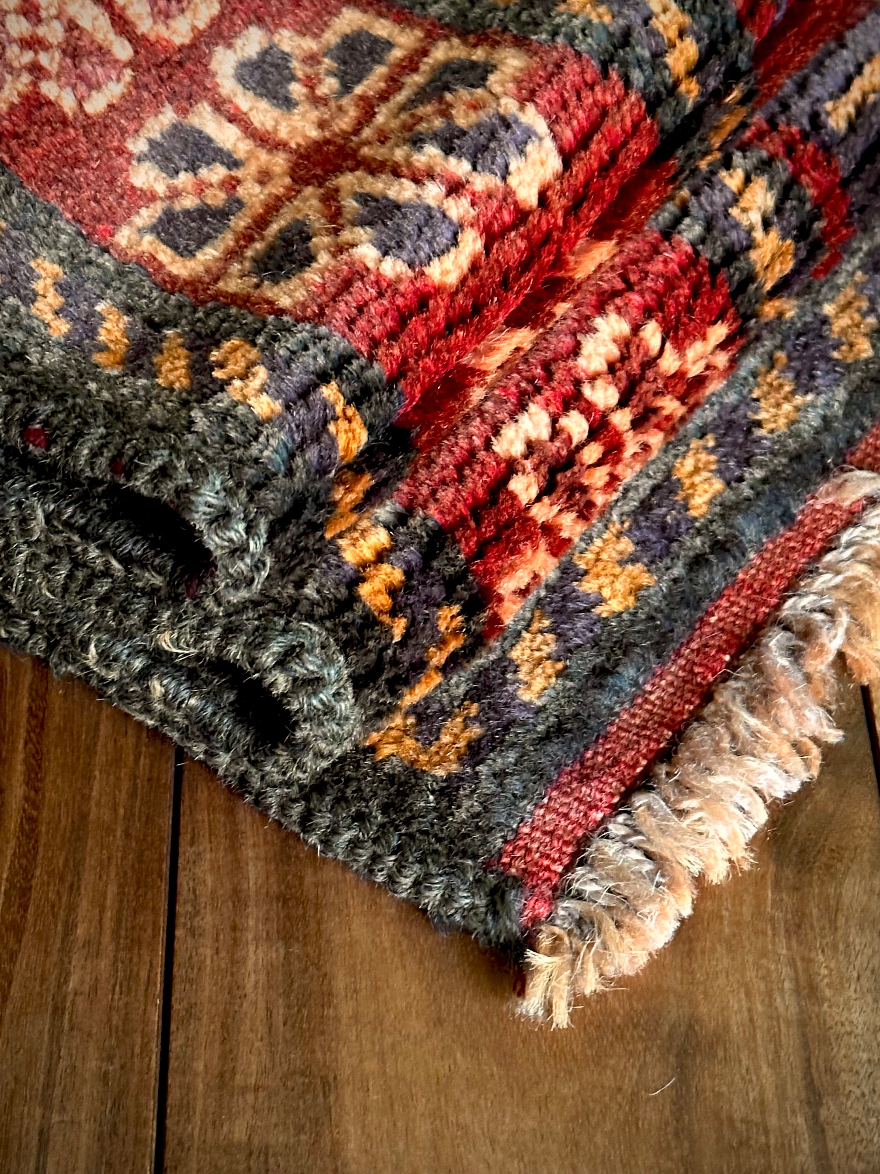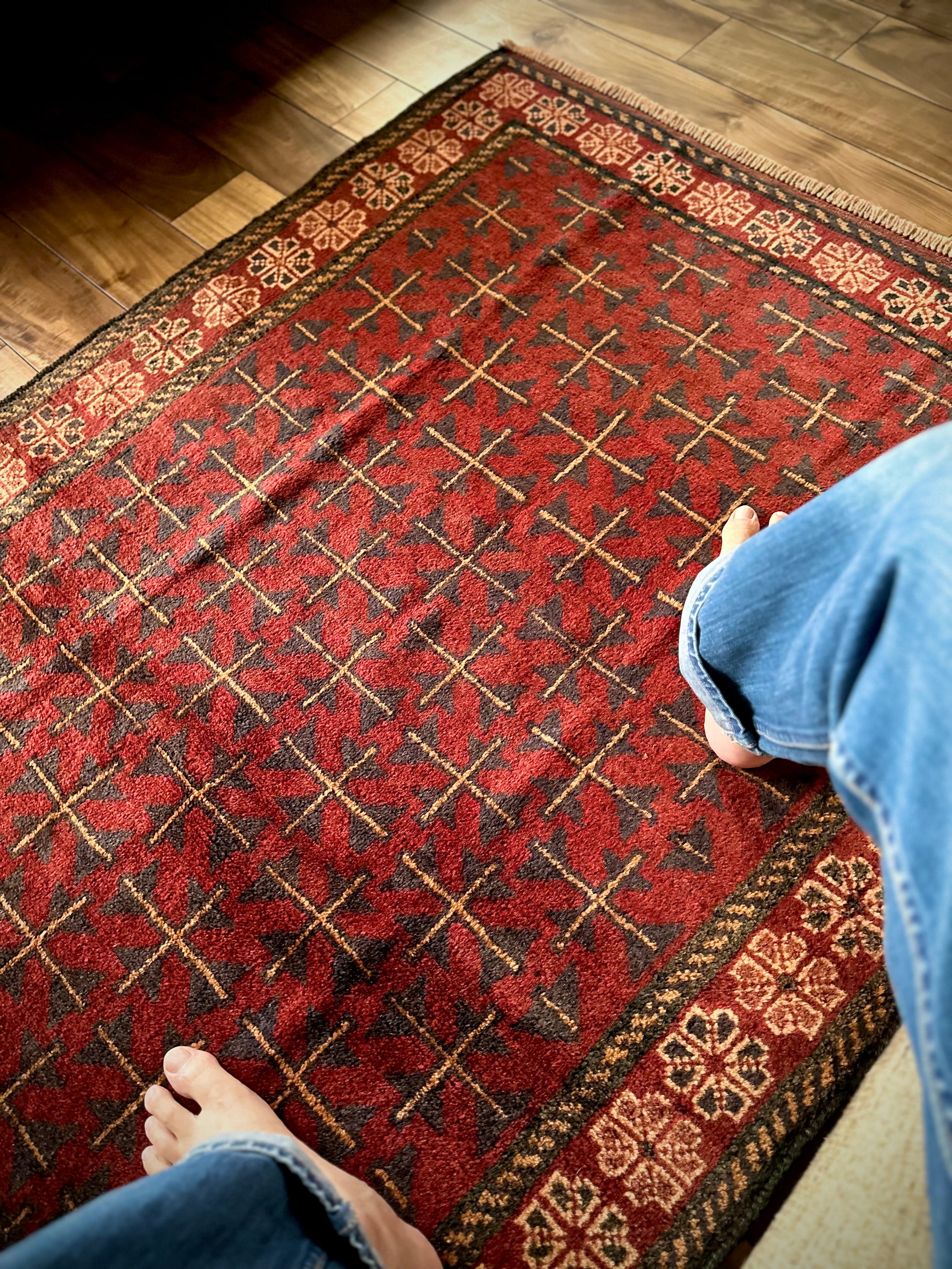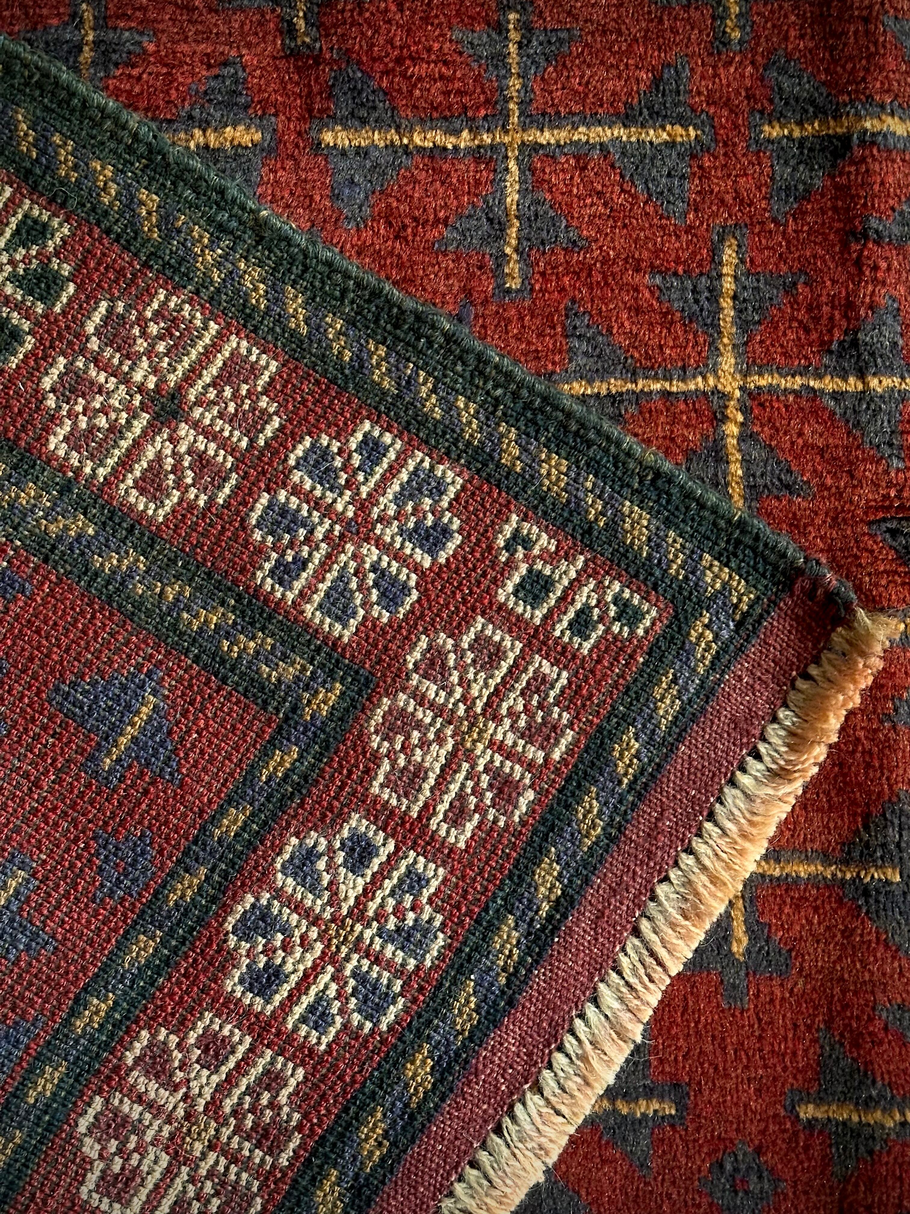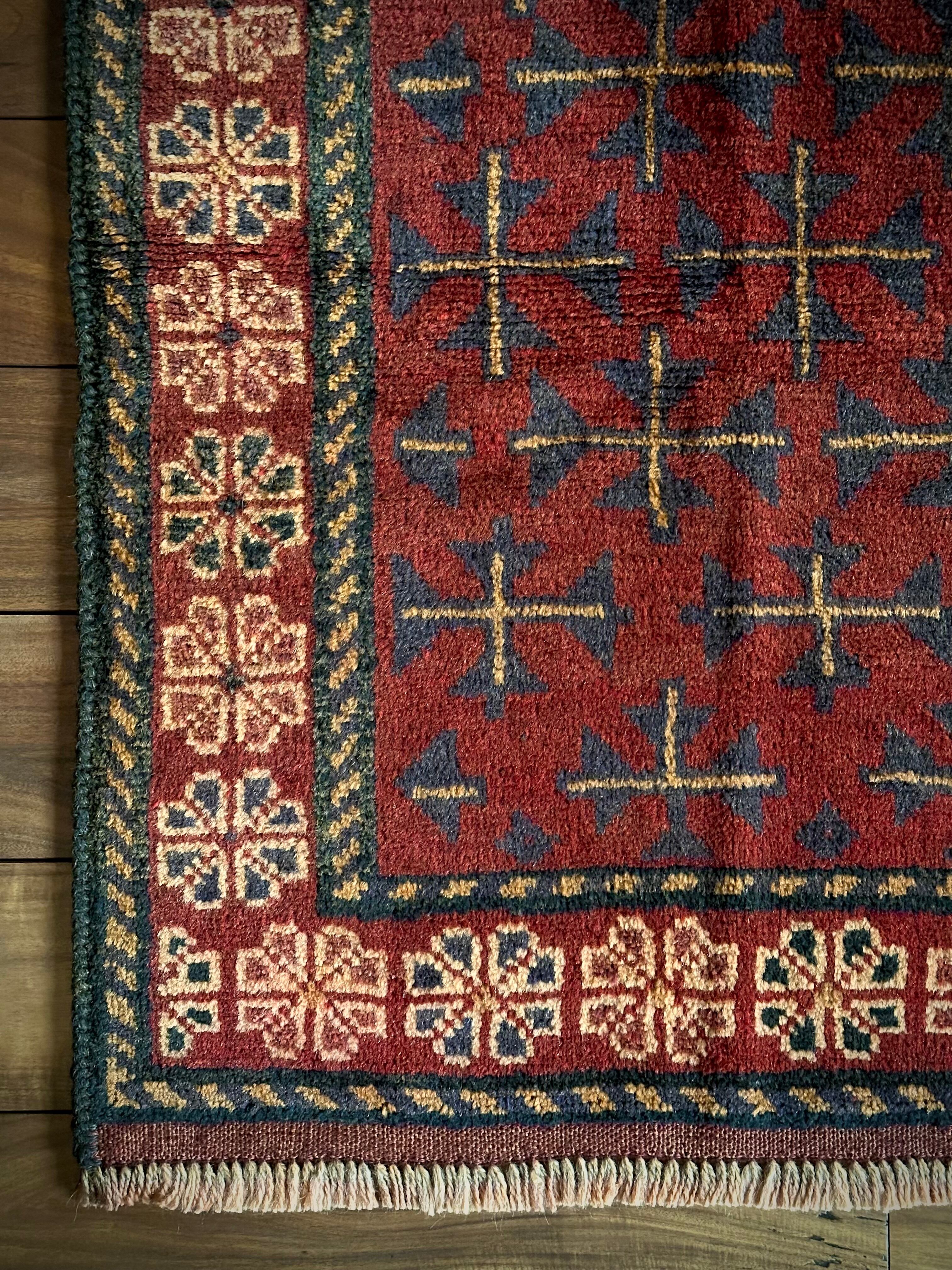小豆色の落ち着きのあるバーガンディレッドにシンプルな十字の模様がモダンな雰囲気のこちらは、アフガニスタンはヘラート州に居住するバルーチ族のトライバルラグで、見た目通りな毛足長めのふっくらとしたメインラグになります。