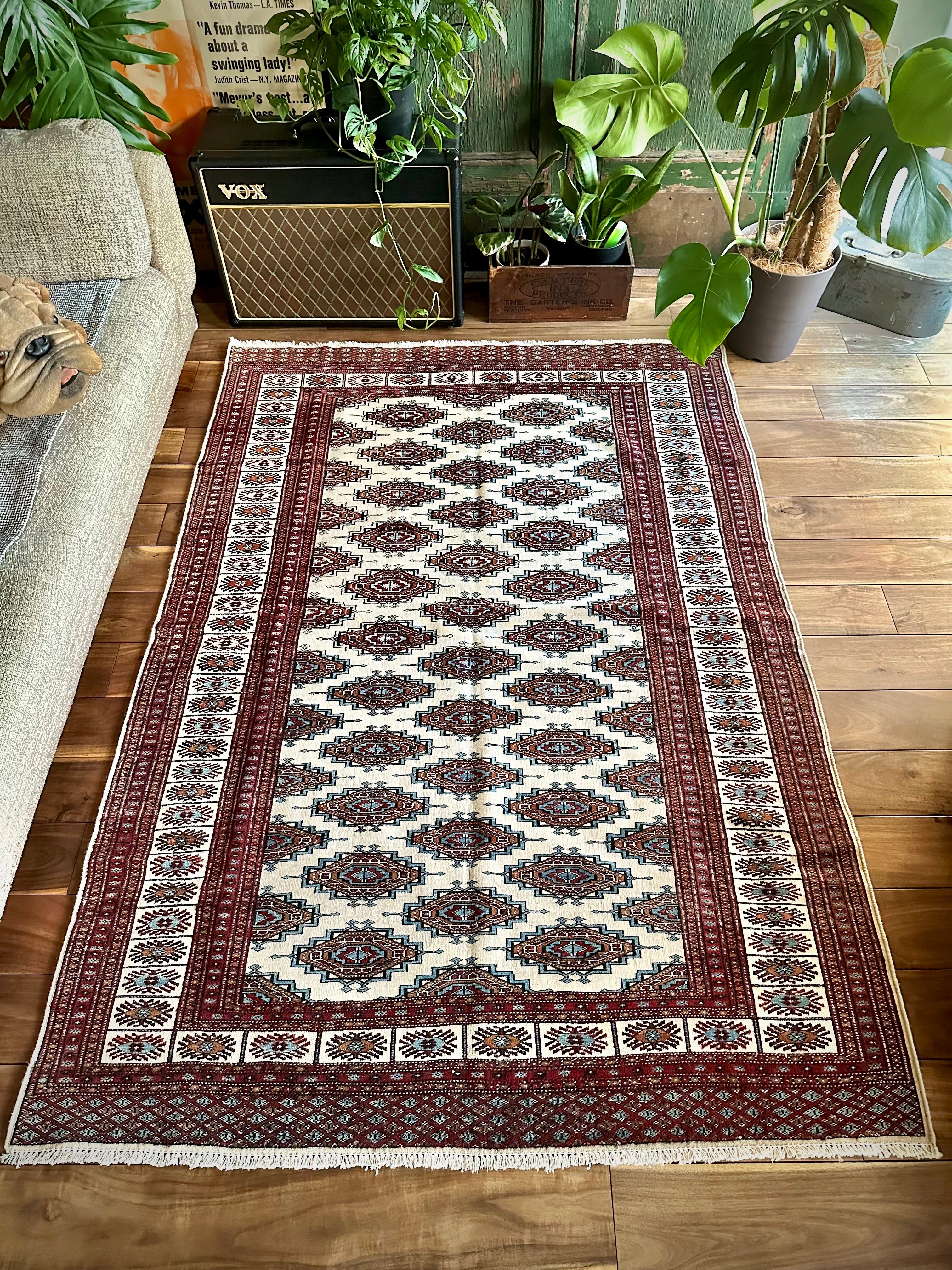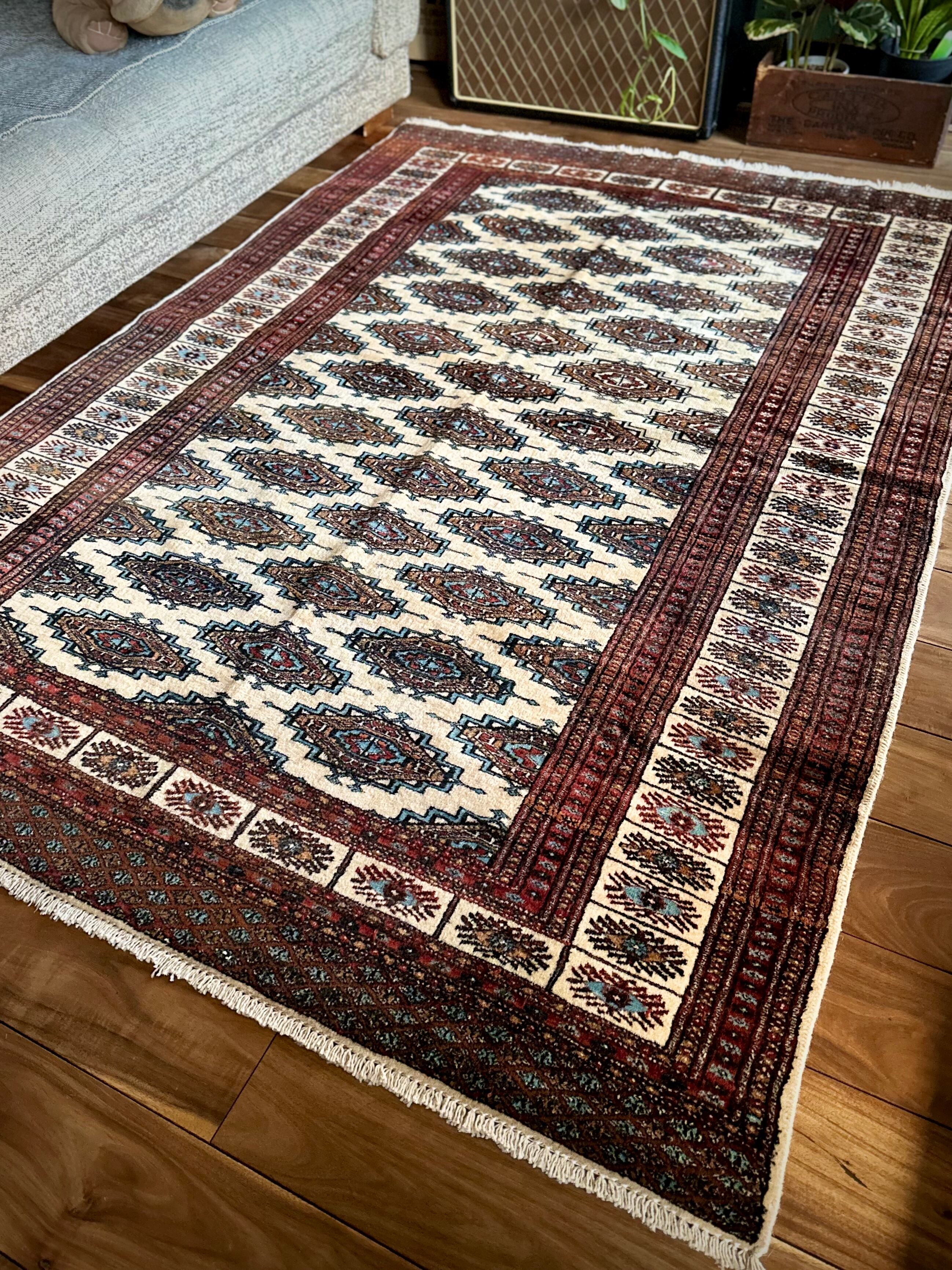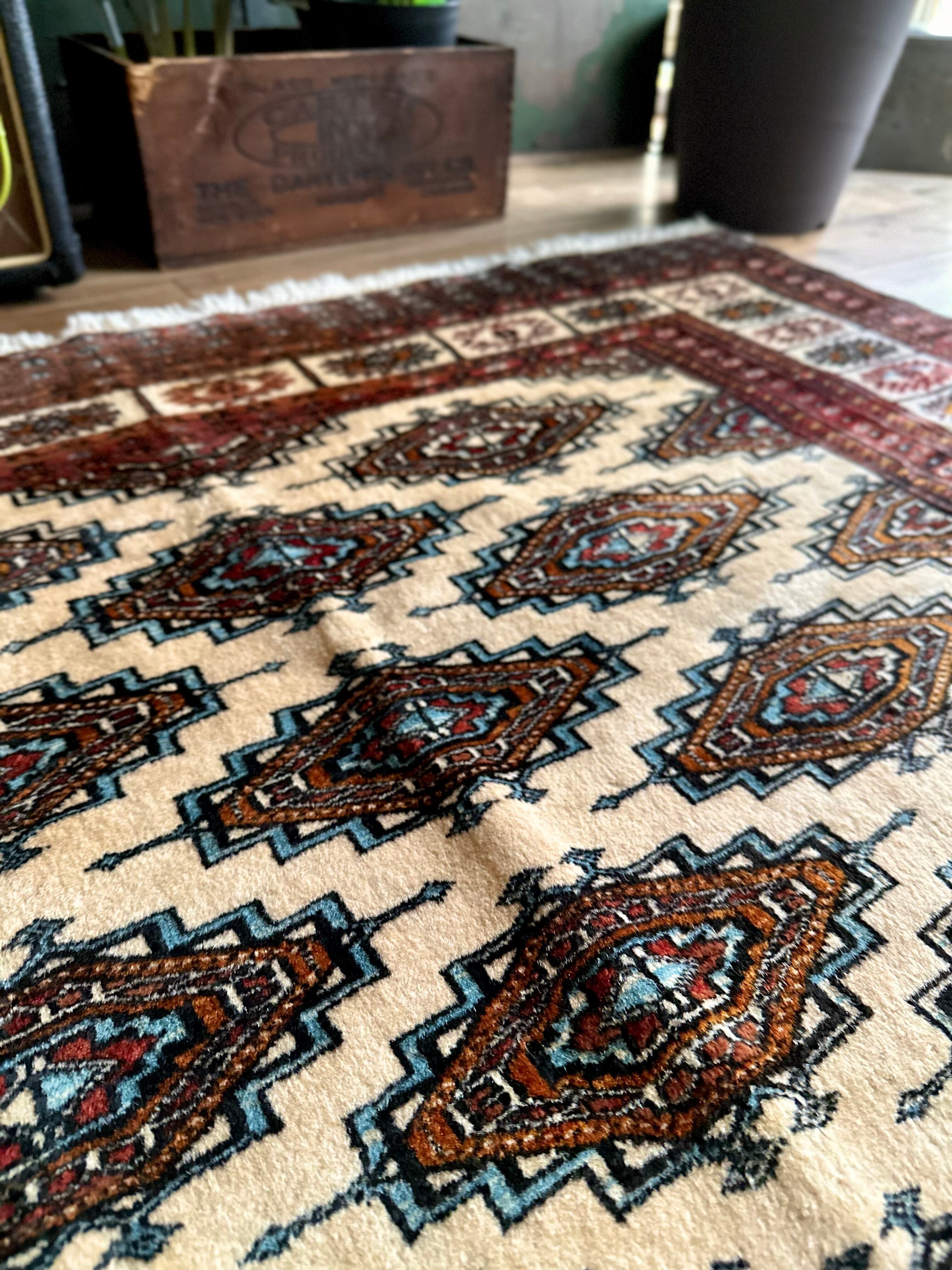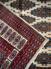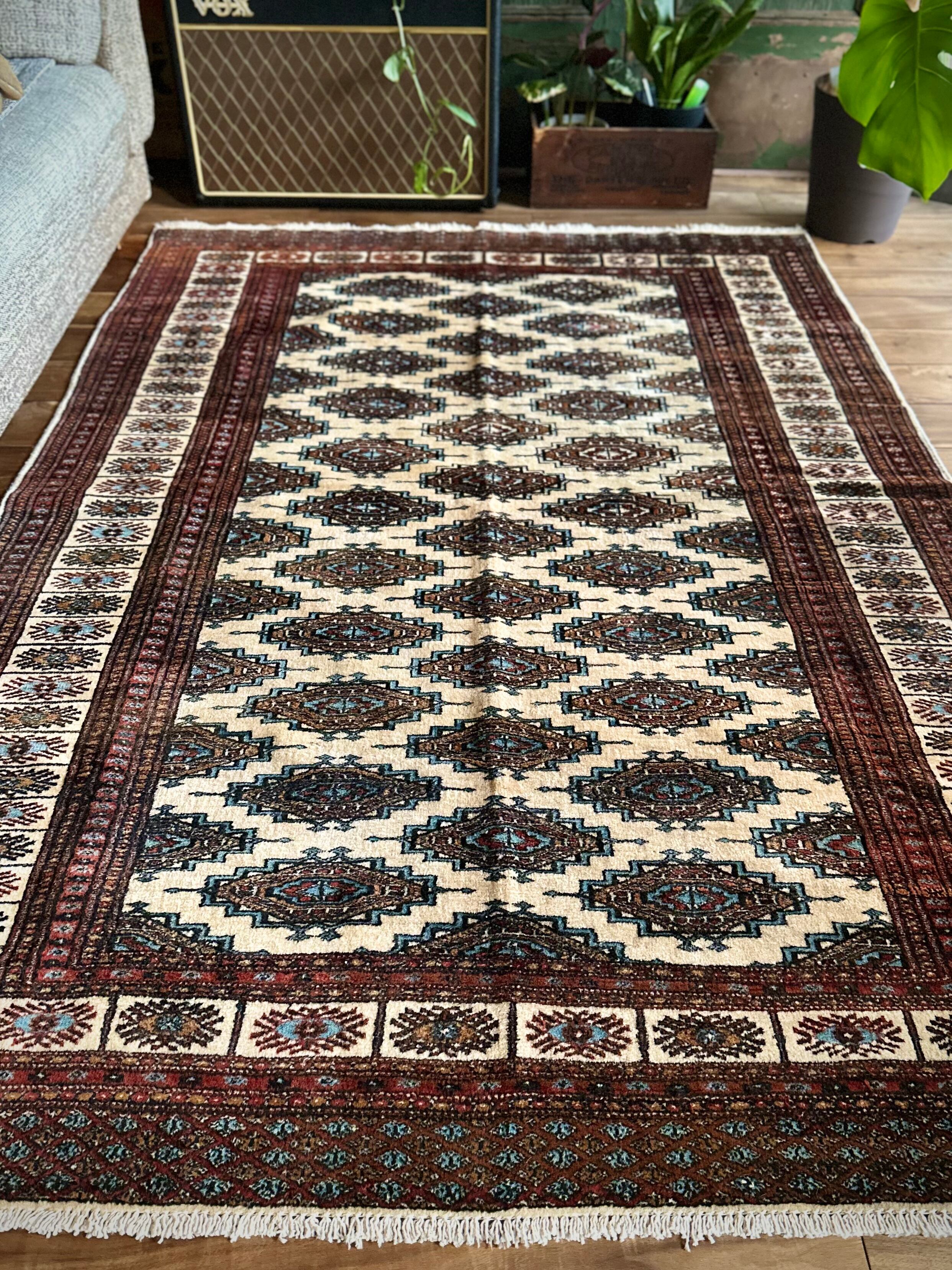 大きさはバルーチによく見られる100cm幅のシングルタイプよりもゆとりのあるサイズ感で、ソファ前にテーブルを置くならこれくらいの幅は欲しいでしょうかと、ダイニング下にもOKハウジングなメインラグになりますが、こういったサイズがなかなか無いのは言うまでもありません。