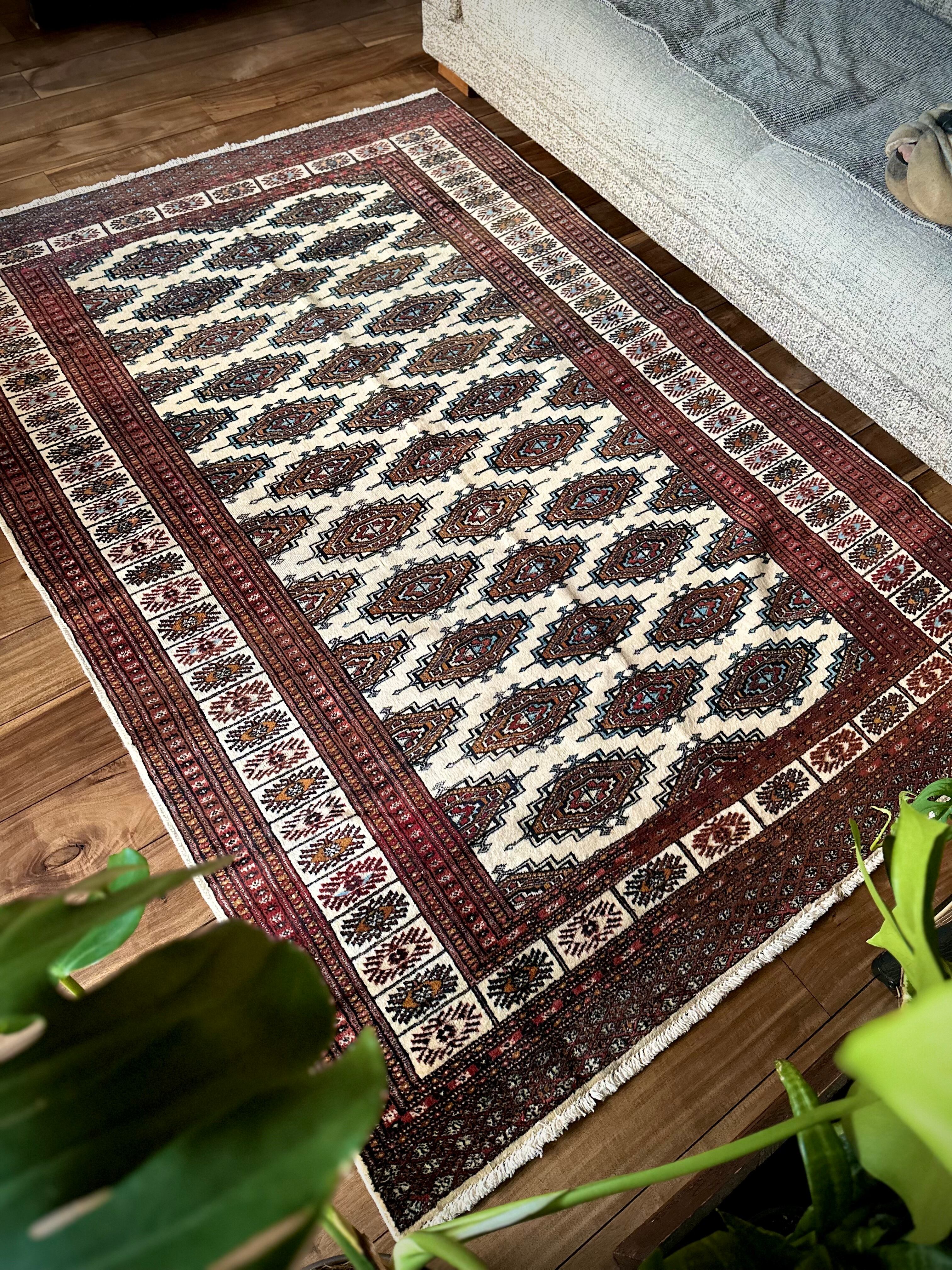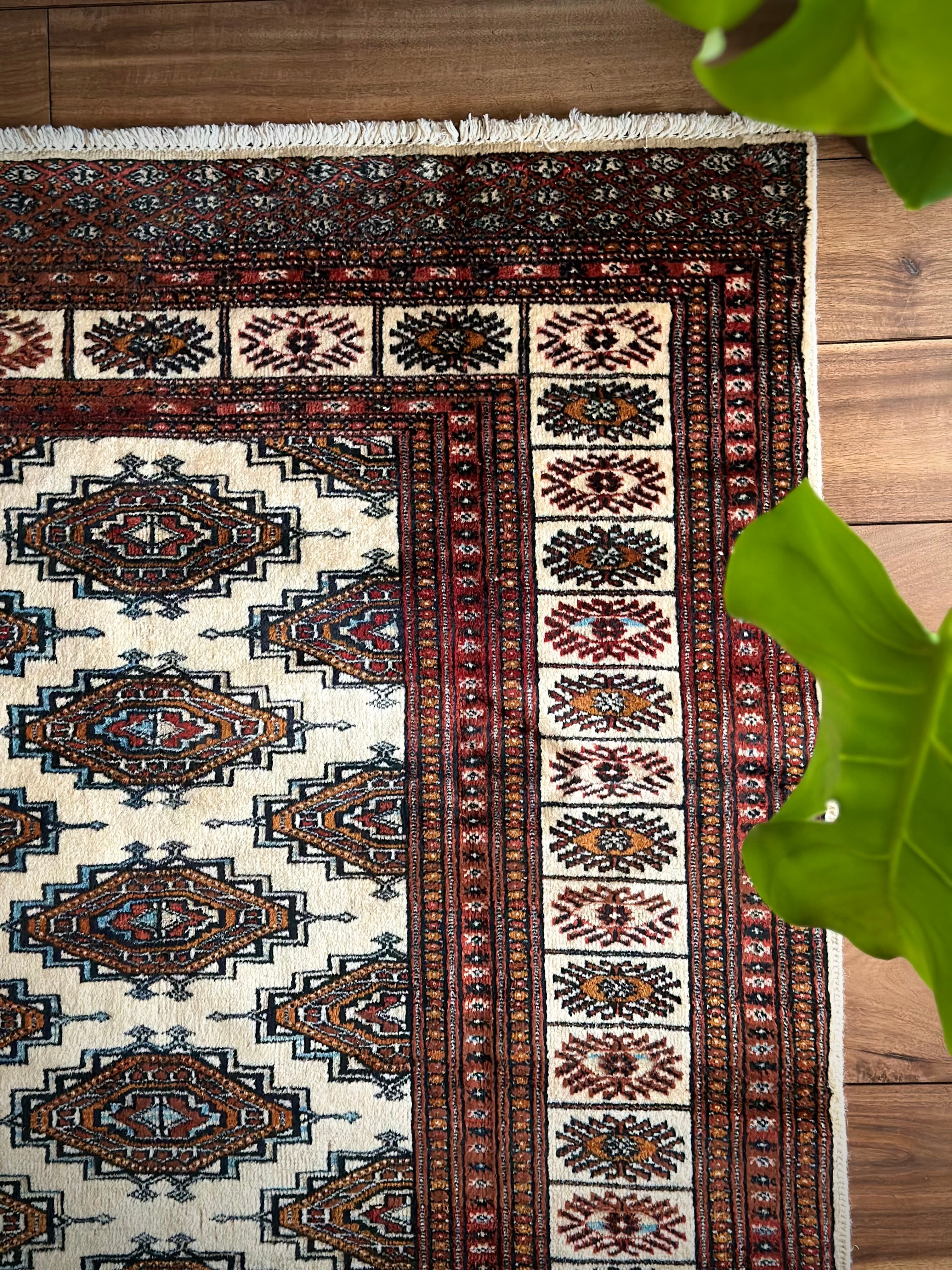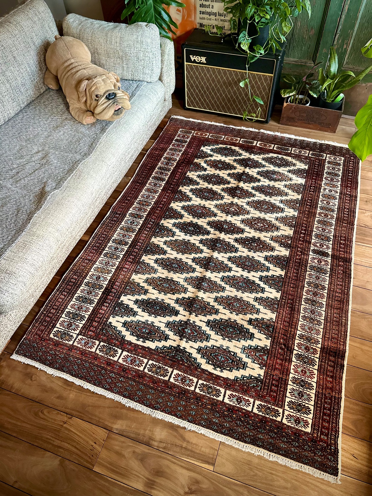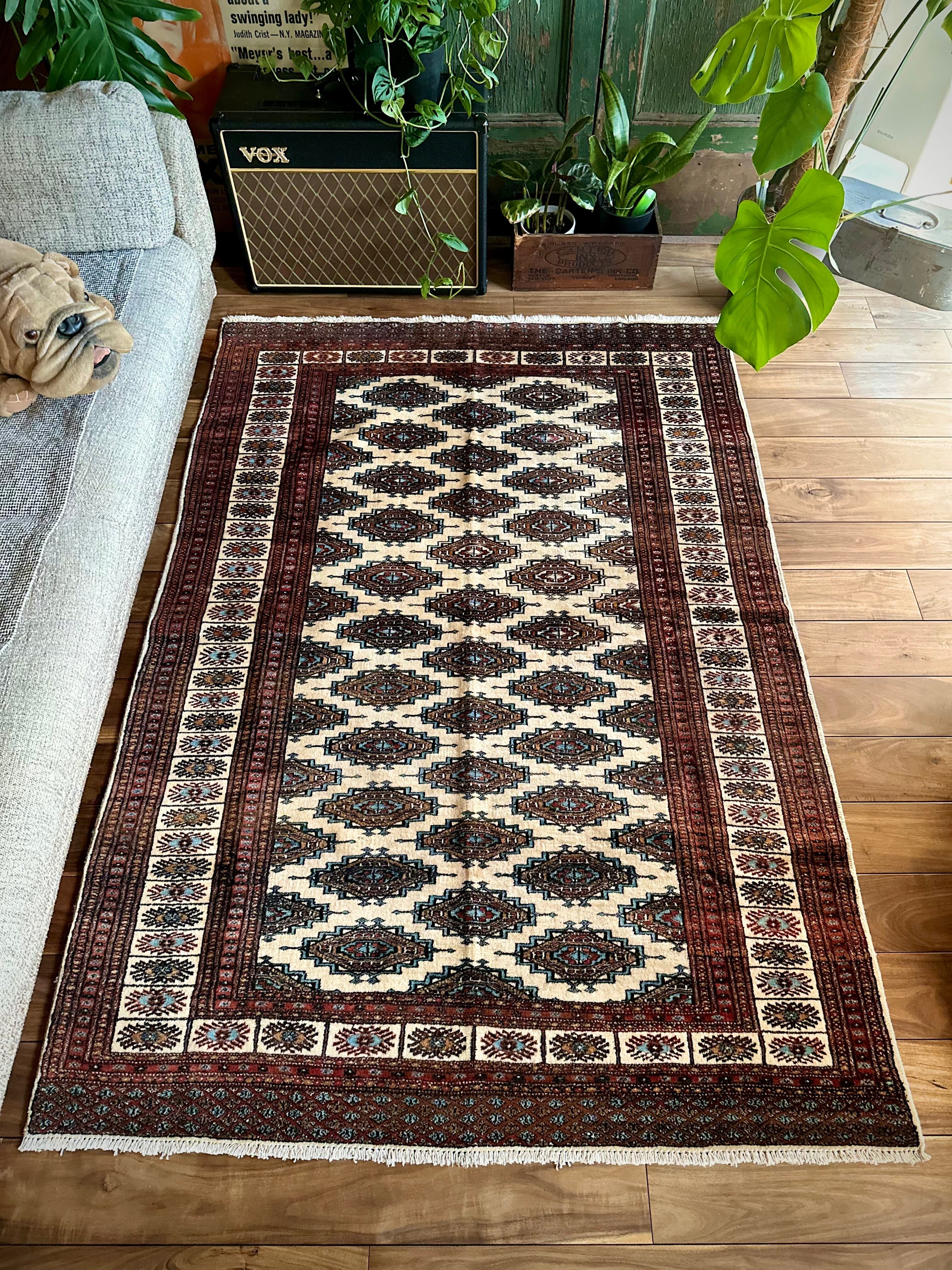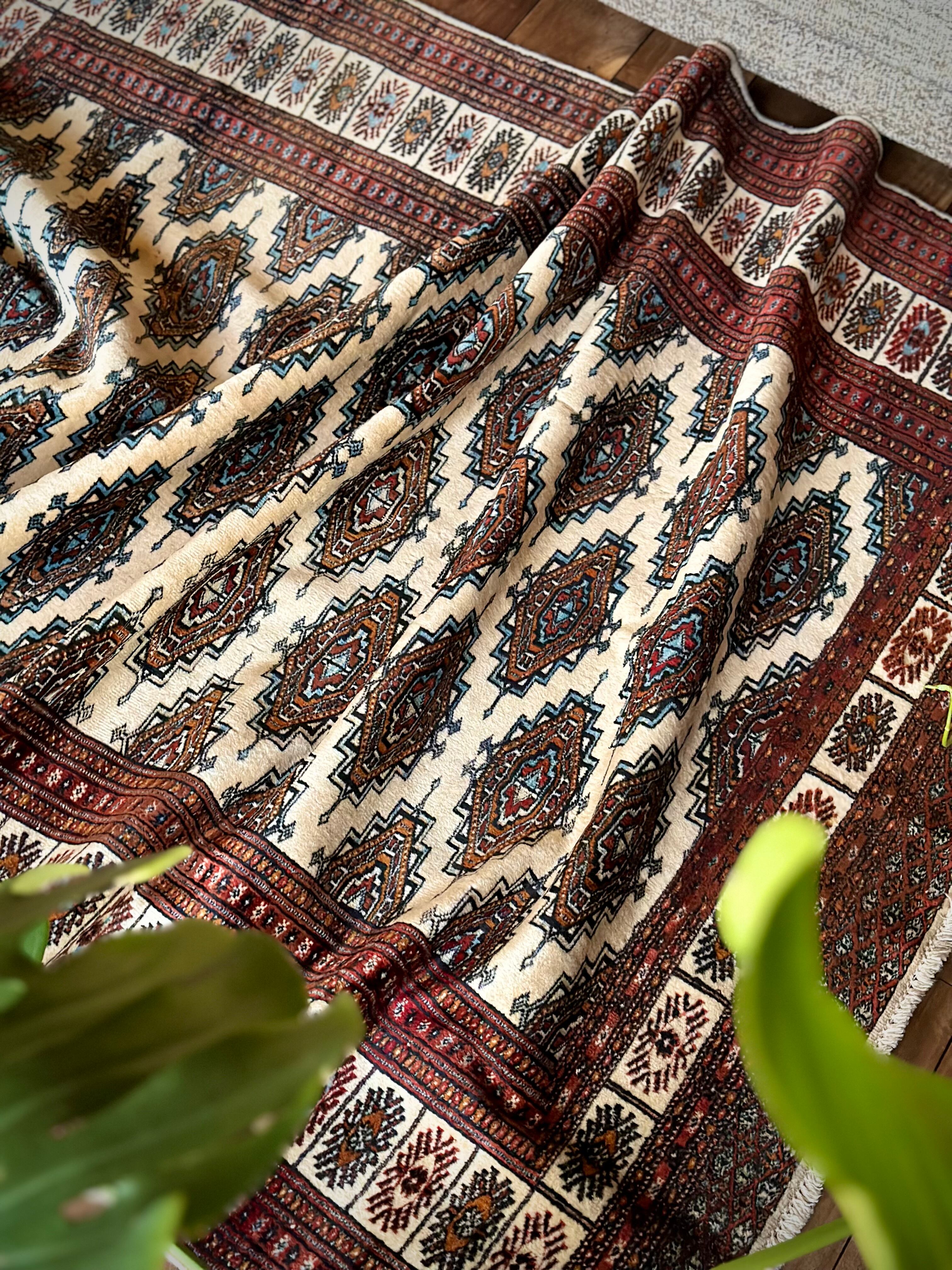 大きさはバルーチによく見られる100cm幅のシングルタイプよりもゆとりのあるサイズ感で、ソファ前にテーブルを置くならこれくらいの幅は欲しいでしょうかと、ダイニング下にもOKハウジングなメインラグになりますが、こういったサイズがなかなか無いのは言うまでもありません。