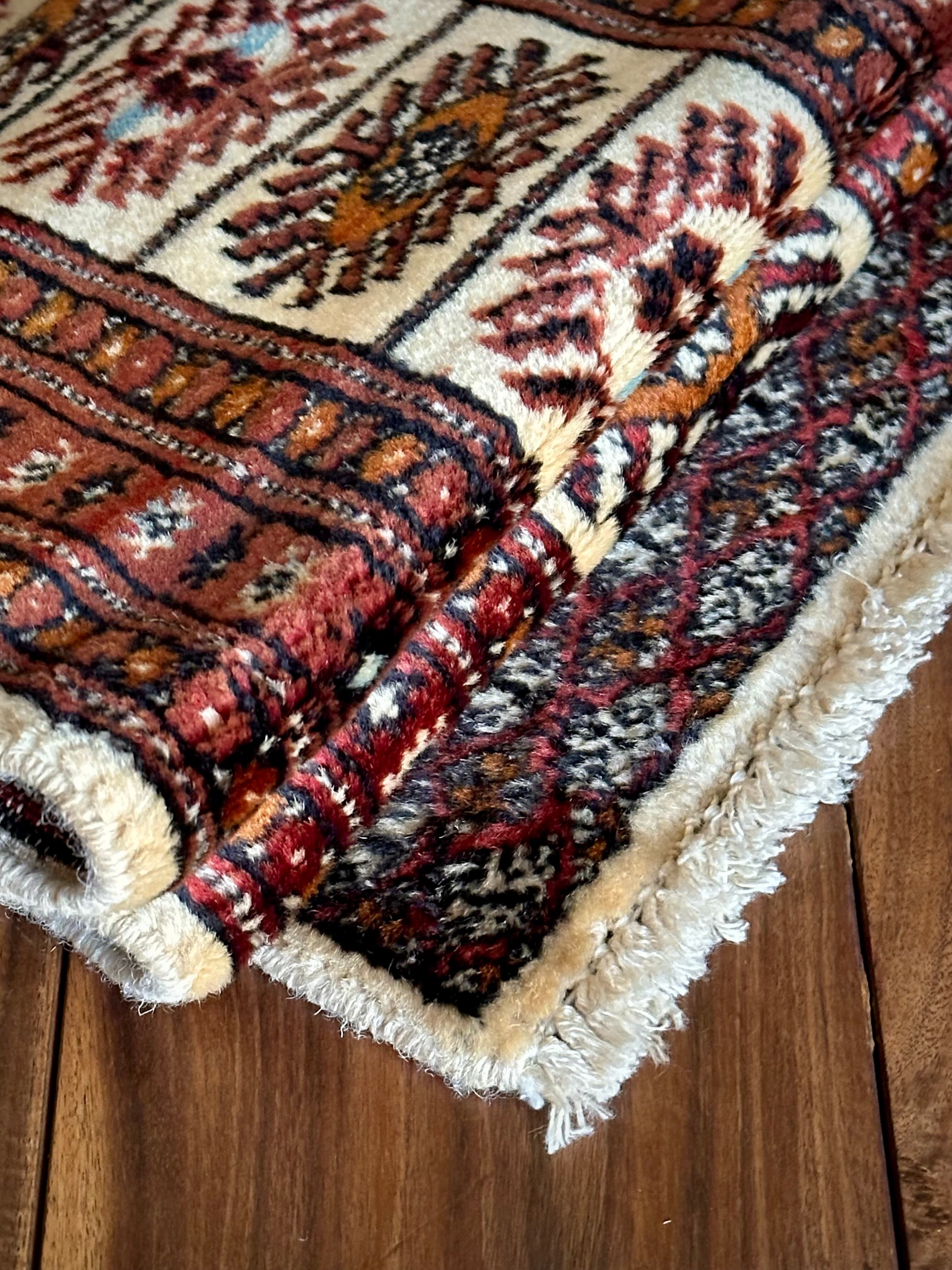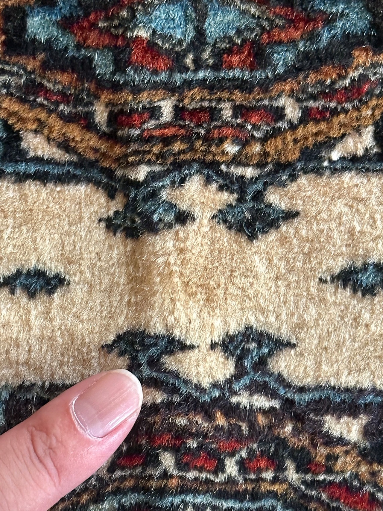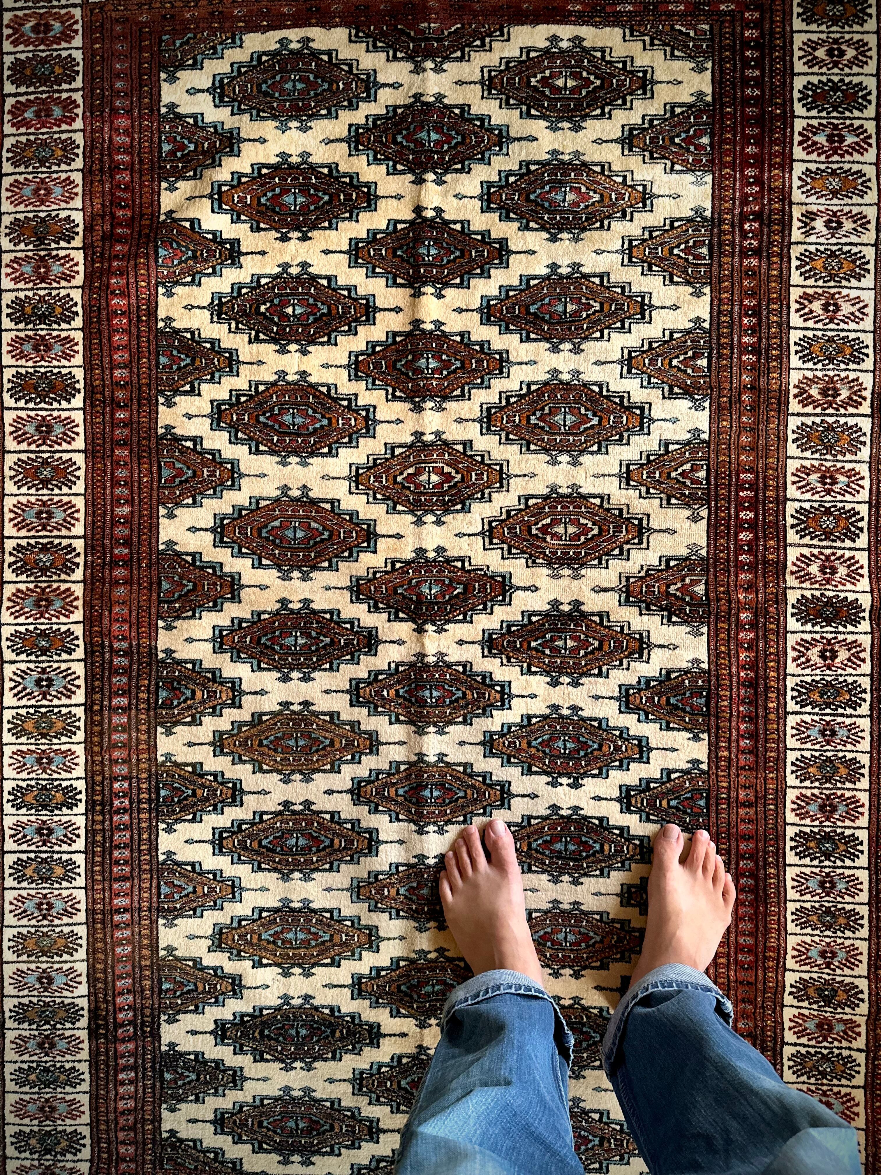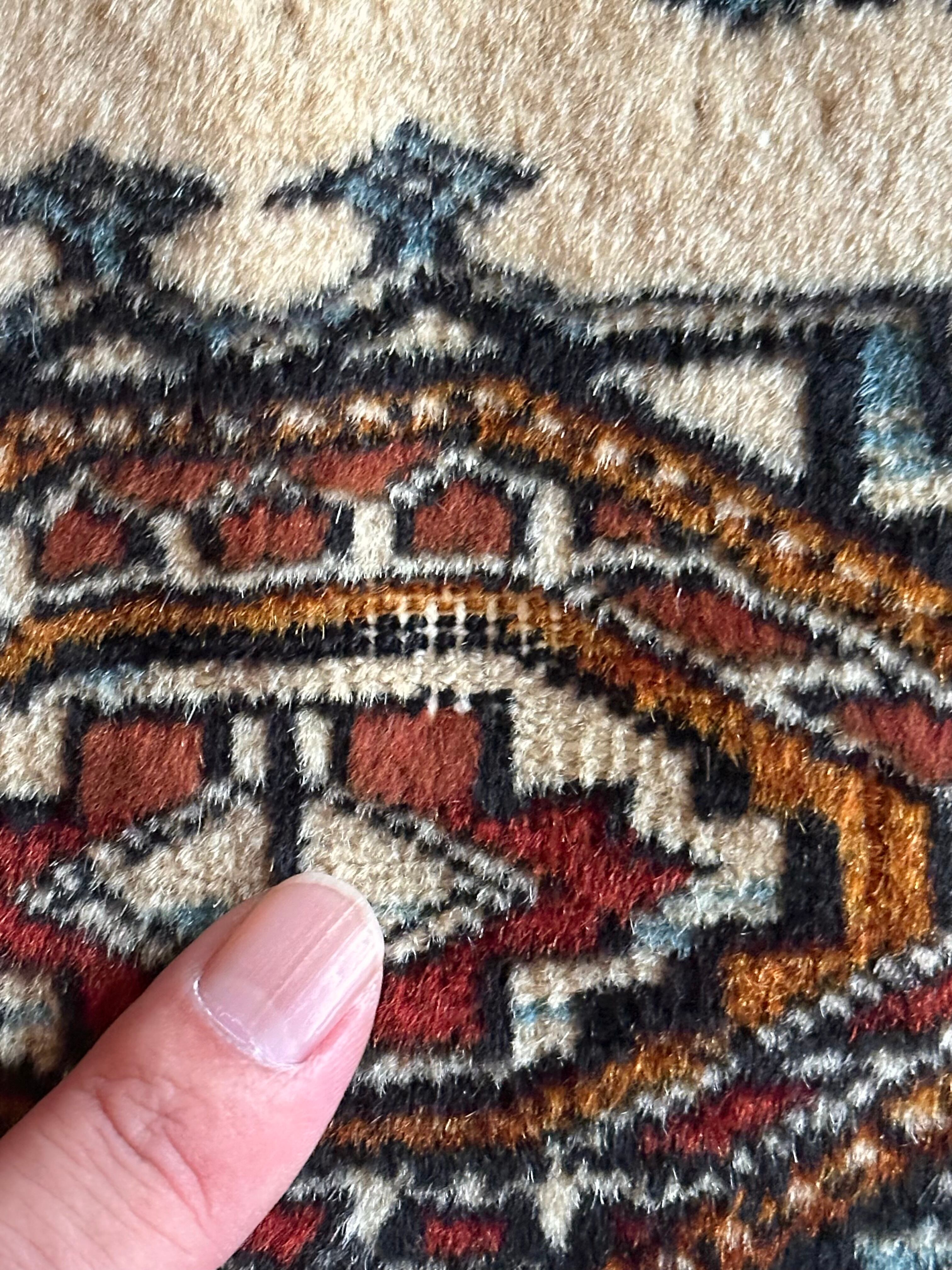 経年としては40年のヴィンテージラグとなりそれほどの使用感は見られませんが、小さなパイル抜けと分からない程度の染みがありますので写真にてご確認ください。またパイル自体は短めながらもみっちりとした織りで、油分を含んだサラッとした肌触りに足裏も喜びます。