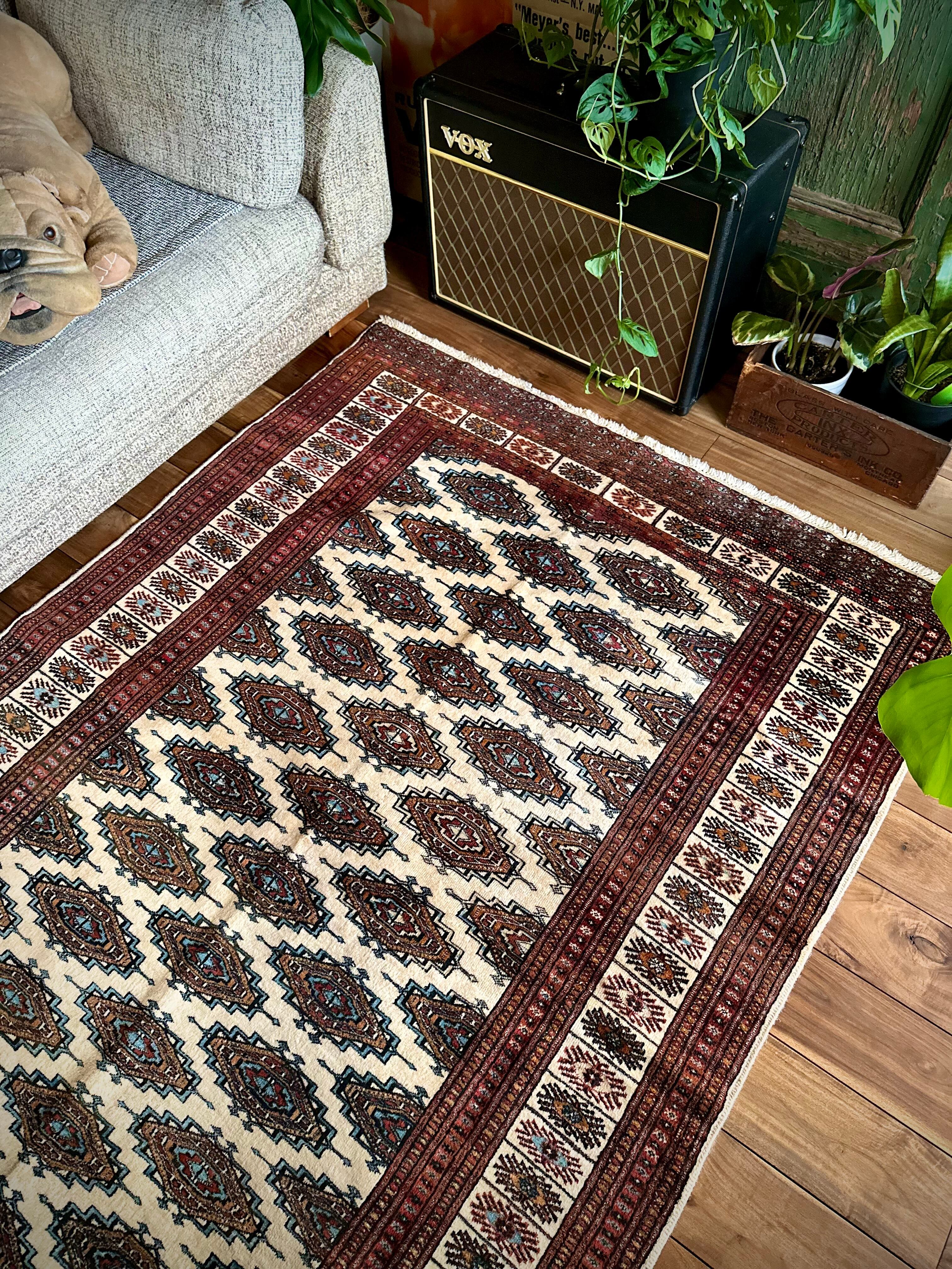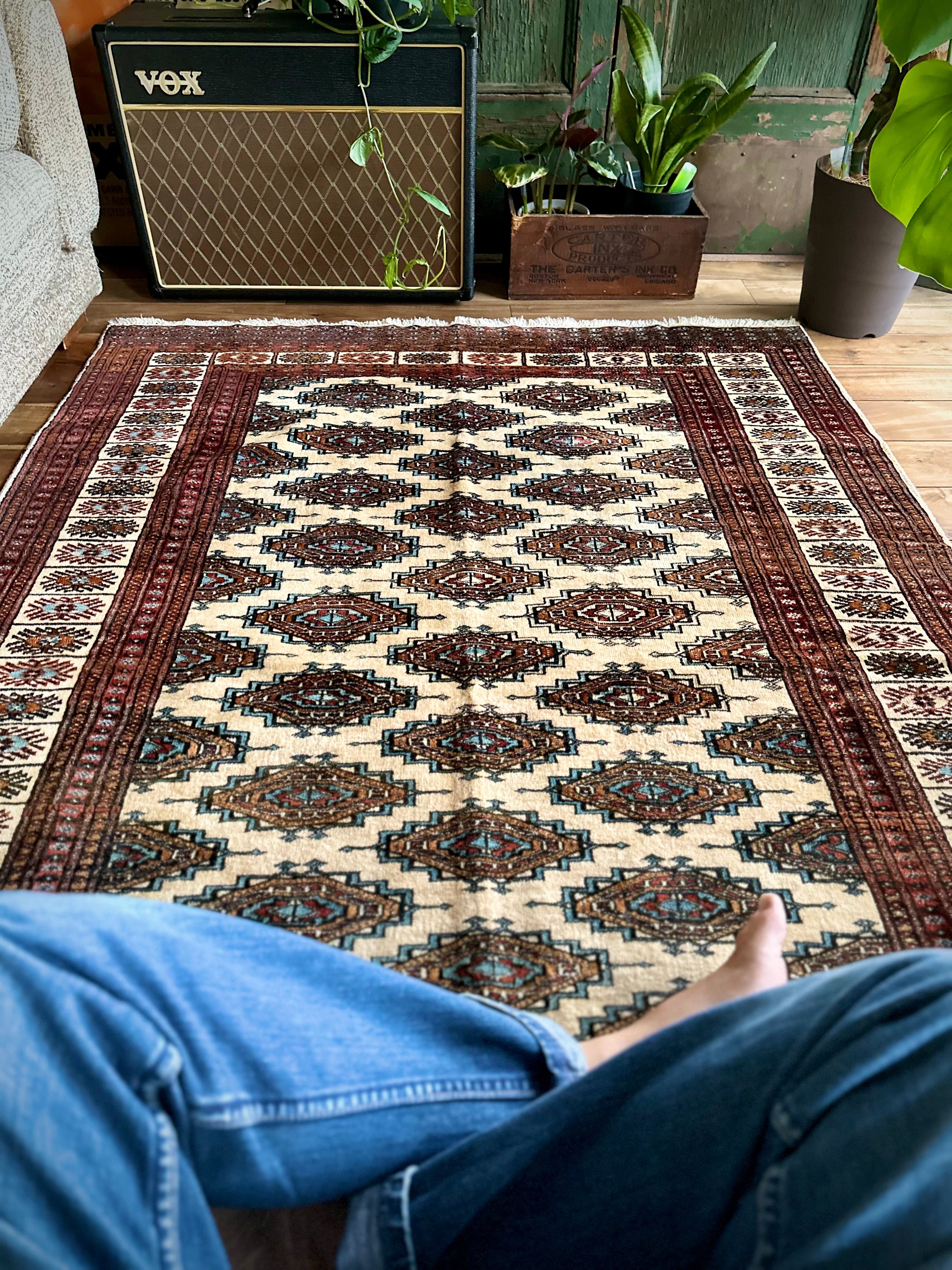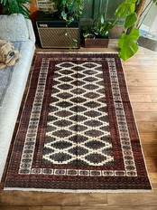 最後にラグそのものに関しては羊毛特有の匂いがあり、採寸は中央付近で計測していますが、手織りならではの歪みによる誤差や水洗いクリーニングによる縮み、また草木染めによる経年劣化の色ムラなどがありますが、それもまたヴィンテージラグの魅力かとご理解ください。