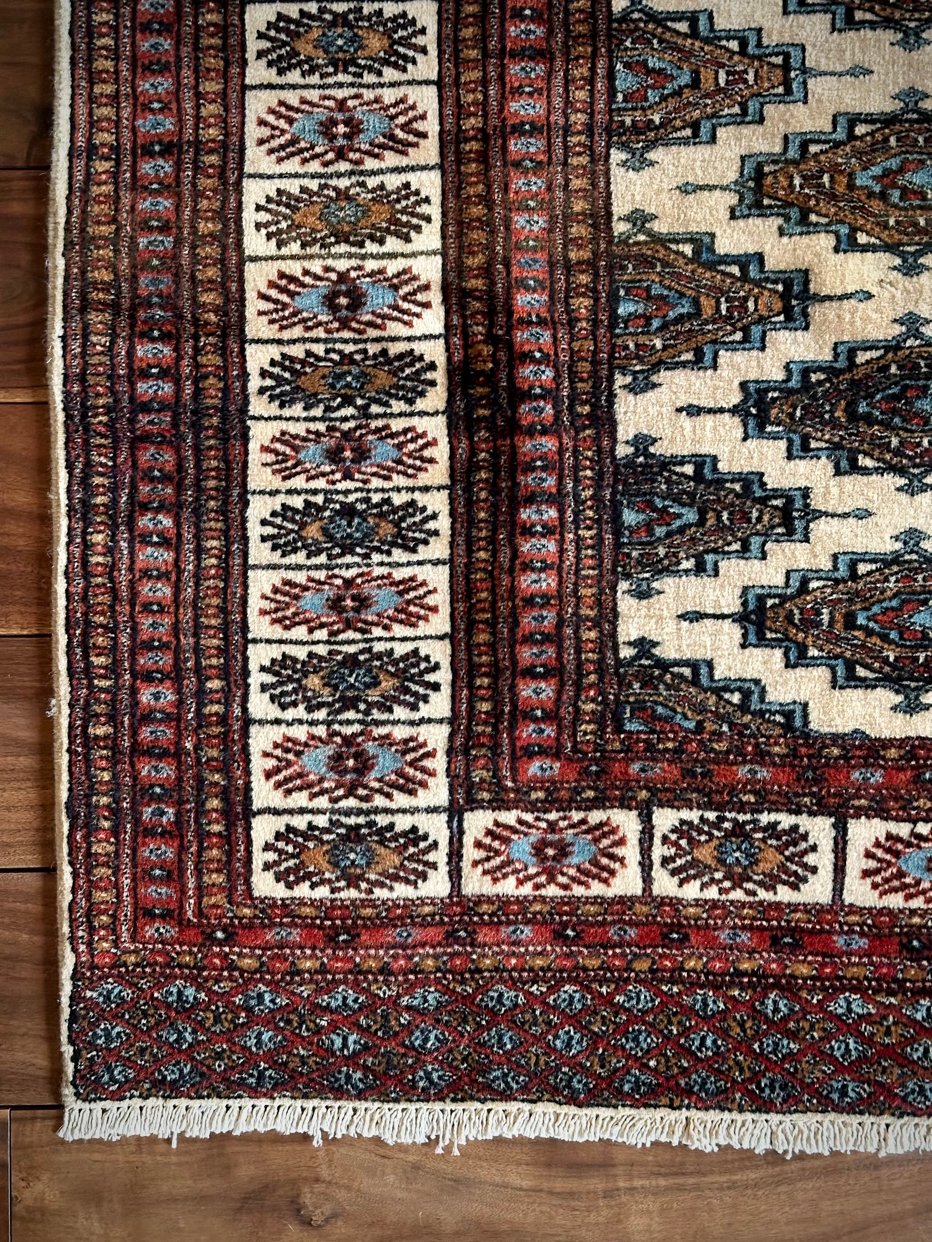 無染色のベージュカラーにボーダー部分のブラウンが好配色なペルシャ絨毯らしい雰囲気のこちらは、イラン東部のマシュハド近郊で手織りされたバルーチ族のトライバルラグで、ギュルの連続紋様やボーダーに使われるスカイブルーが全体を調和したセンスが光る1枚になります。