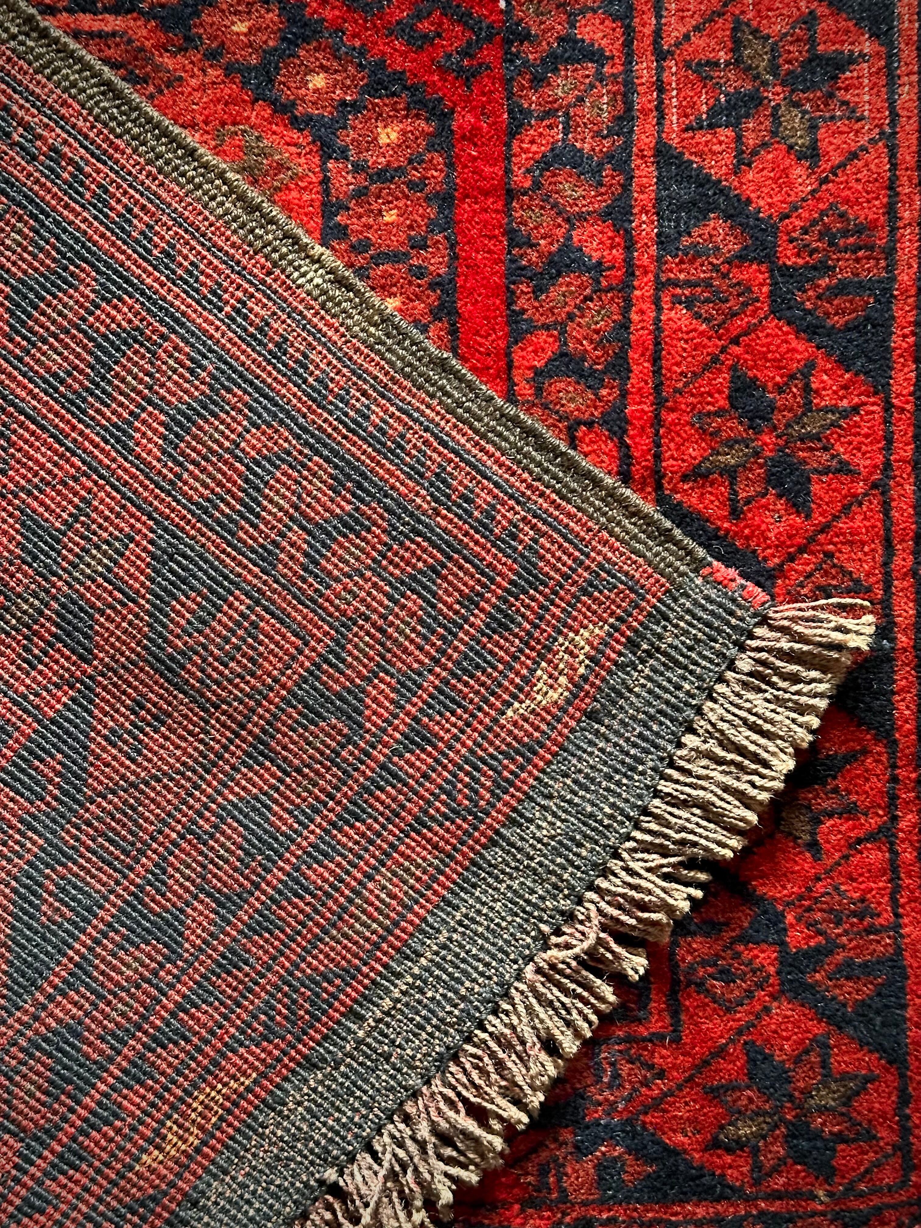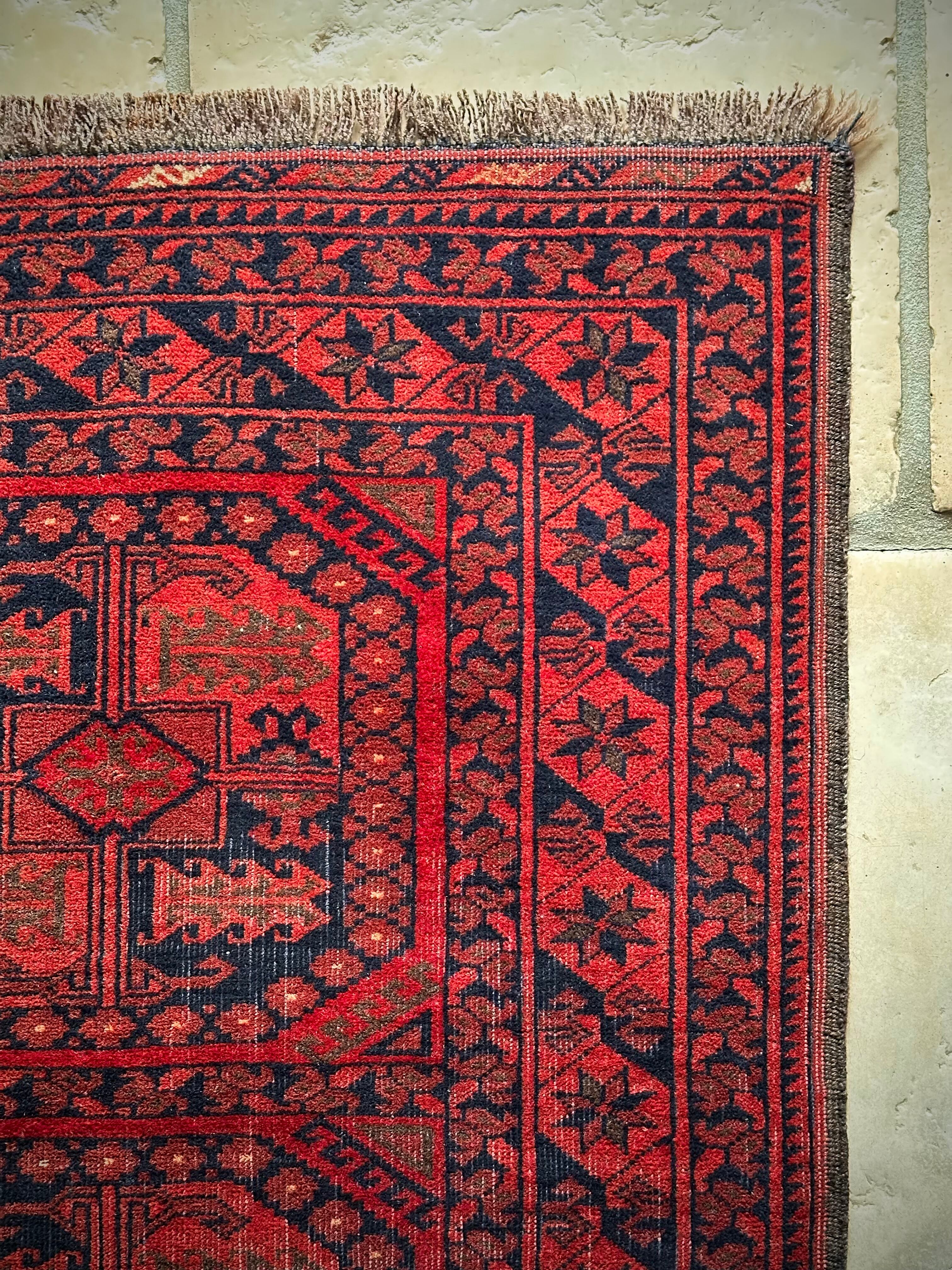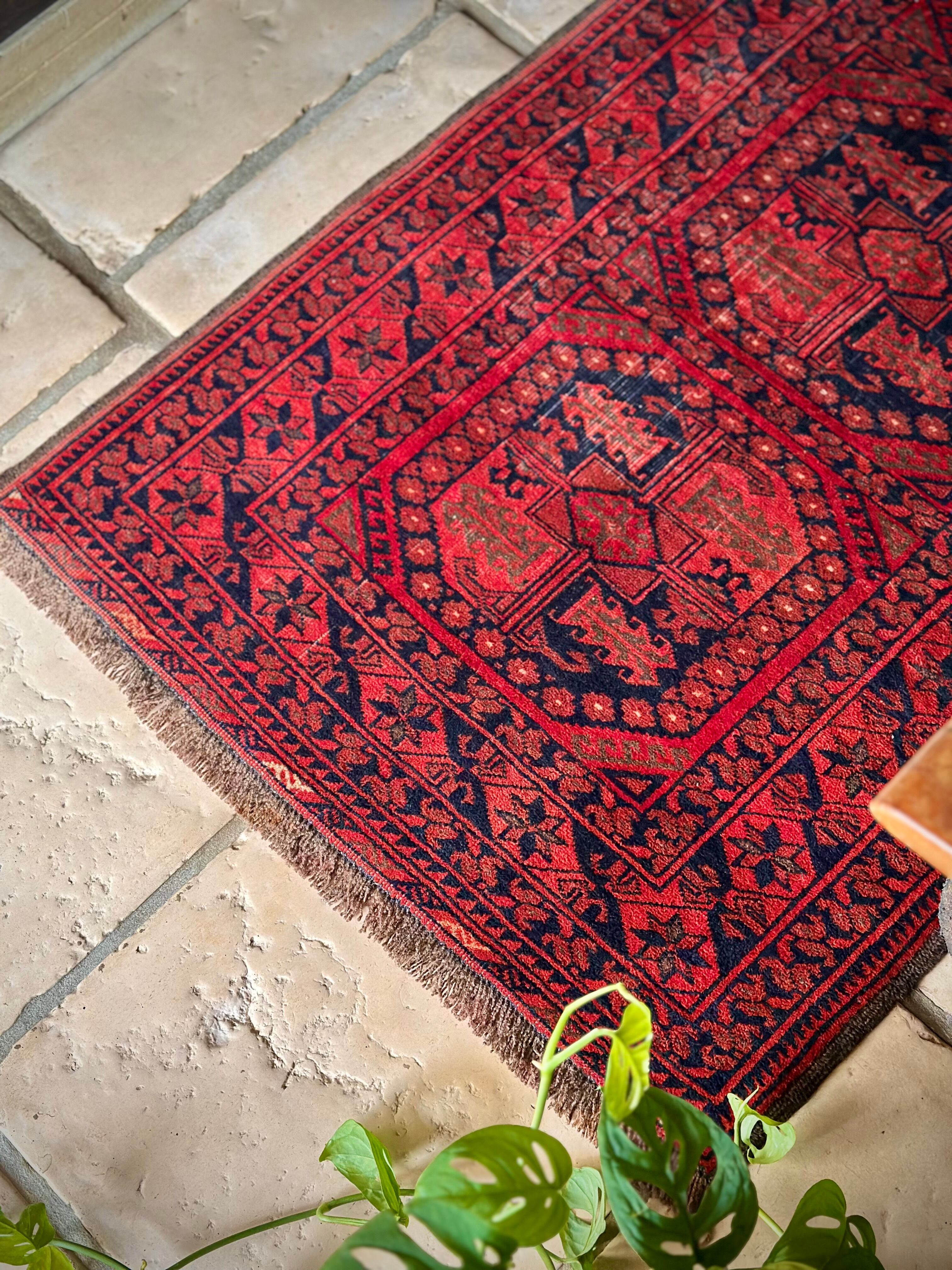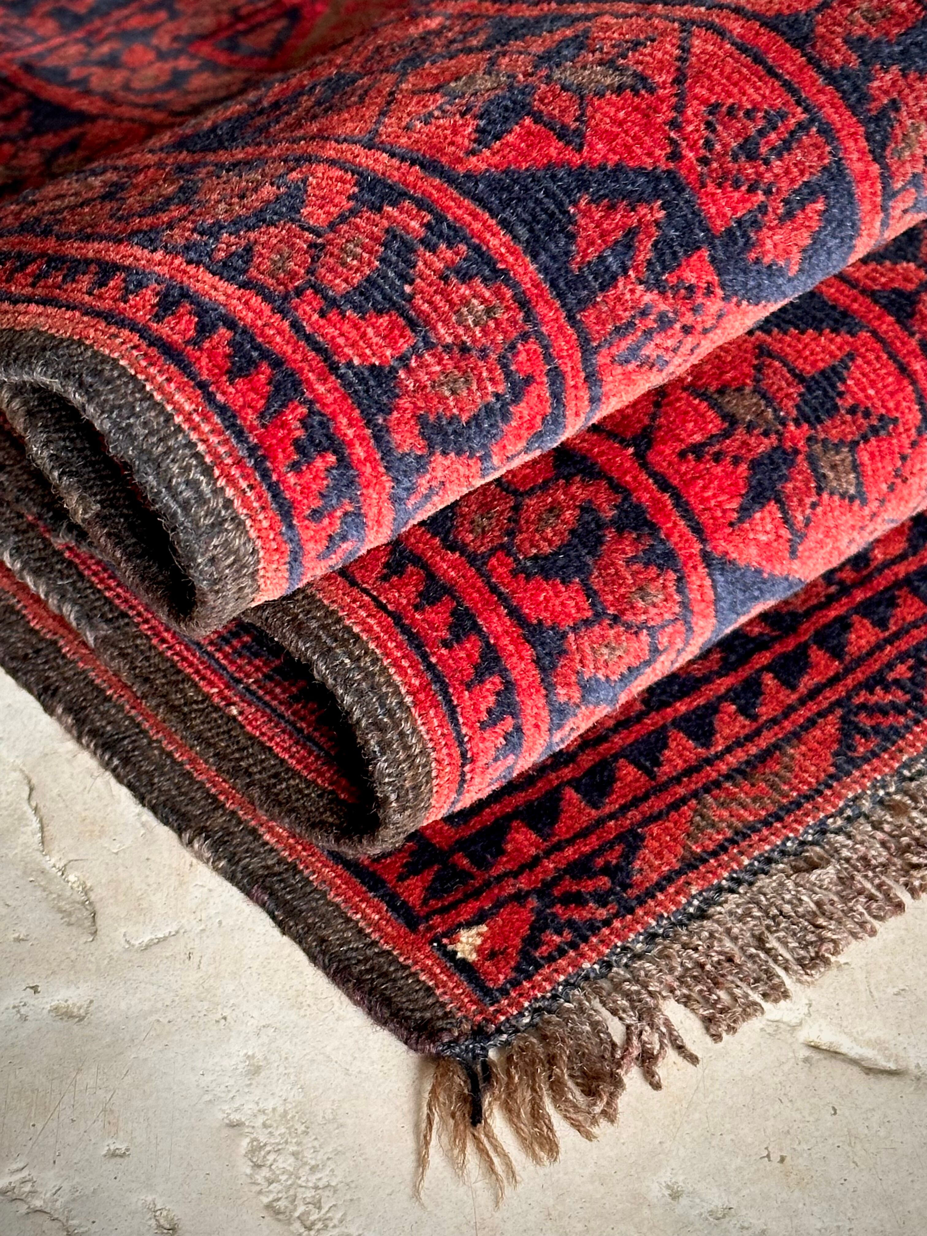 真っ赤なフィールドに描かれたブラックとオリーブブラウンのシンプルな配色ながらも緻密に織りなされた模様が素晴らしいこちらは、アフガニスタン北部に居住するトルクメンの支族で、フィルパイと呼ばれる象の足跡に似たスレイマンギュルを紋章とするエルサリ族からの1枚になります。