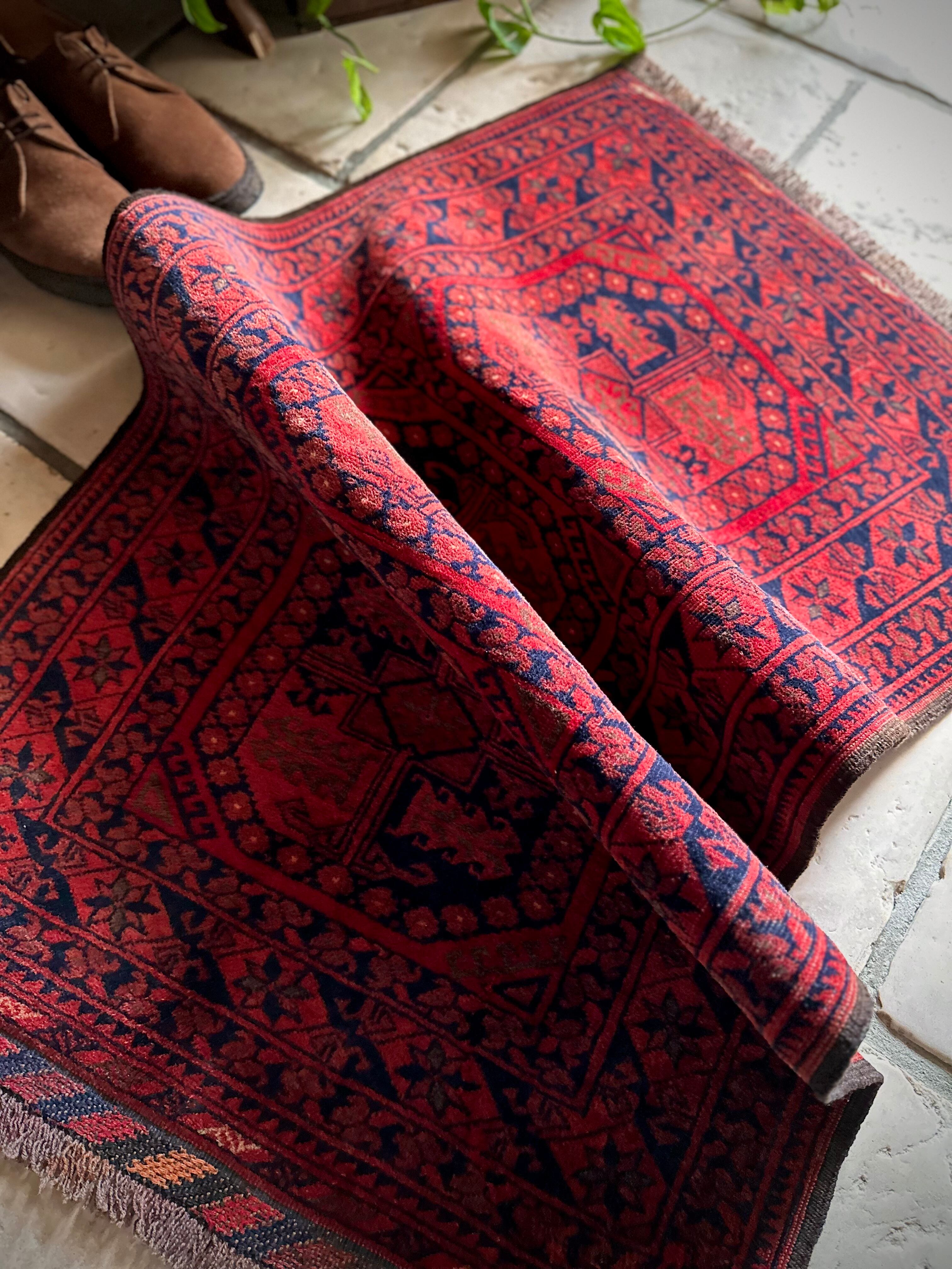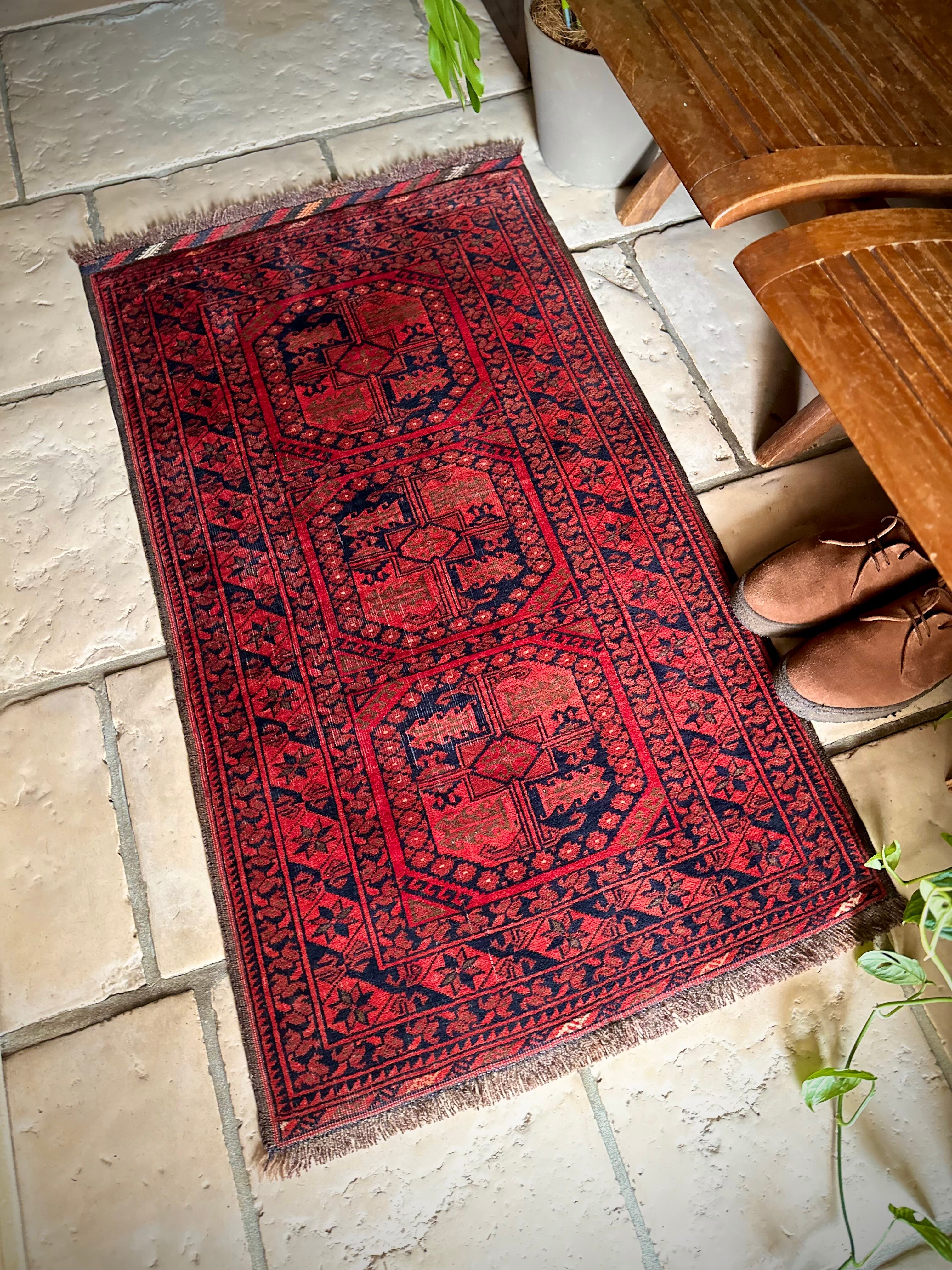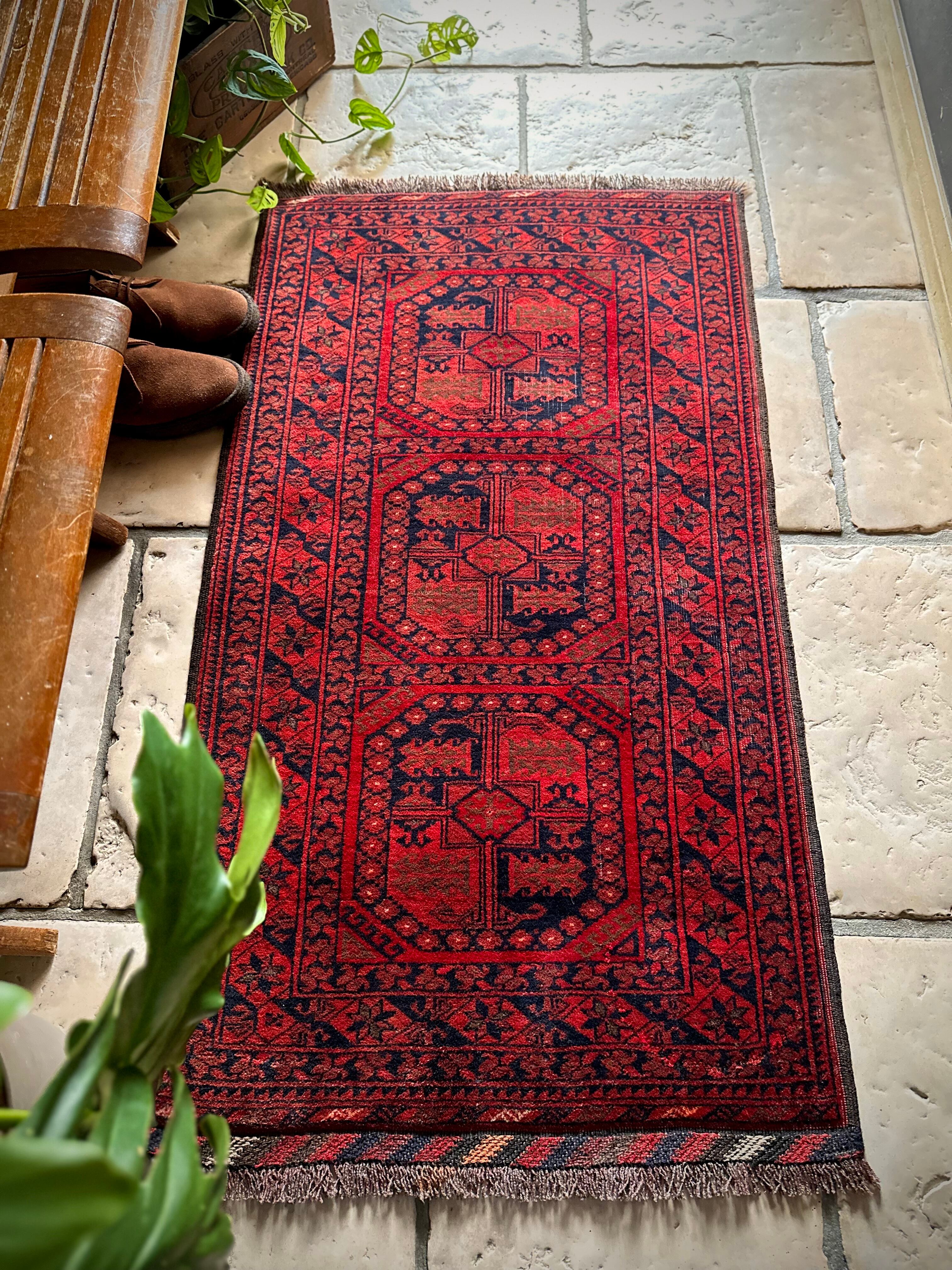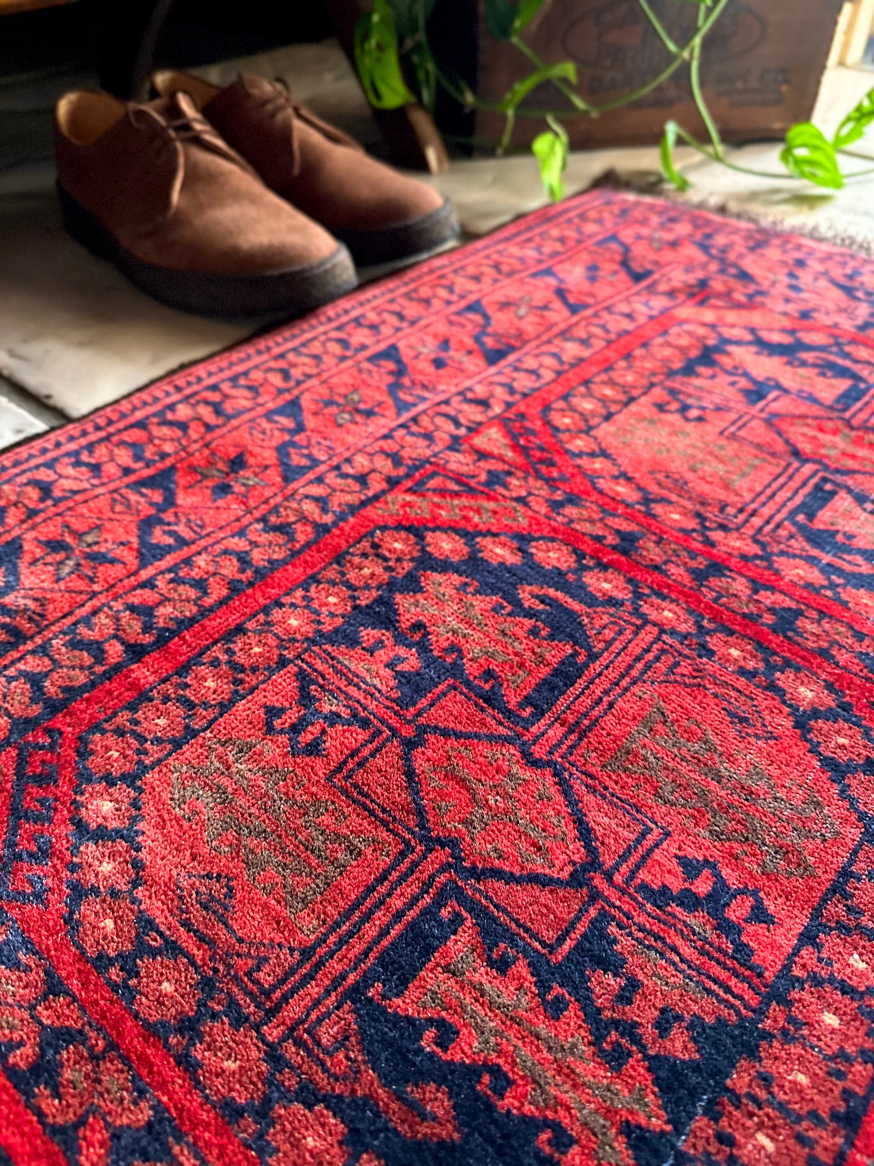 真っ赤なフィールドに描かれたブラックとオリーブブラウンのシンプルな配色ながらも緻密に織りなされた模様が素晴らしいこちらは、アフガニスタン北部に居住するトルクメンの支族で、フィルパイと呼ばれる象の足跡に似たスレイマンギュルを紋章とするエルサリ族からの1枚になります。