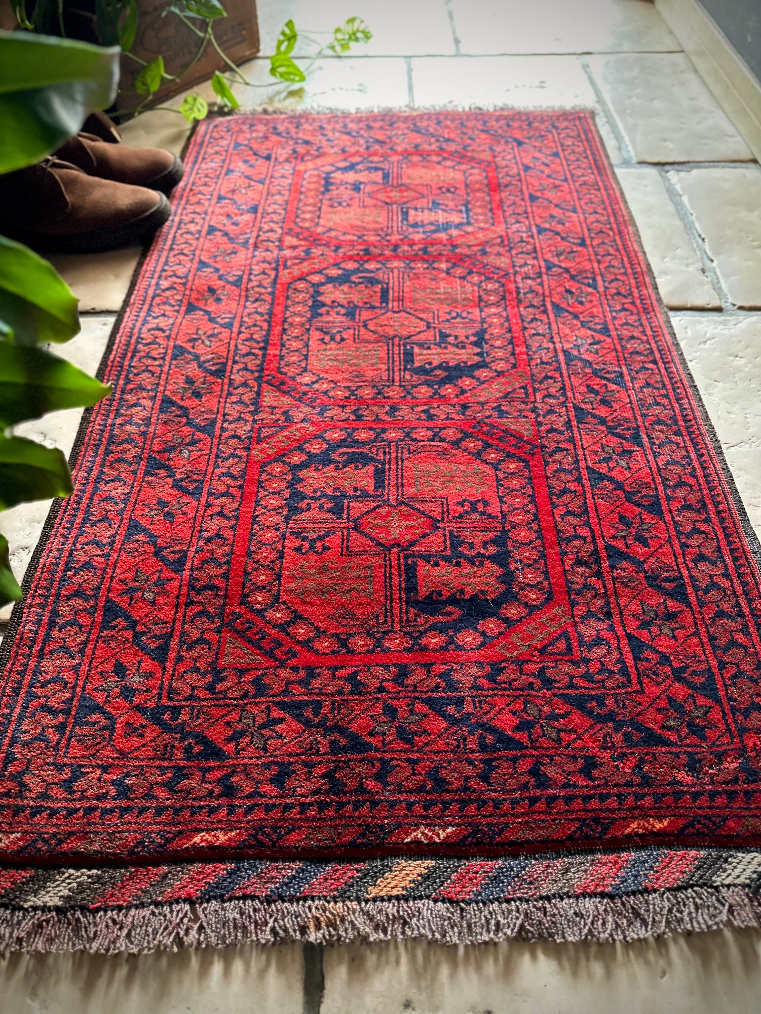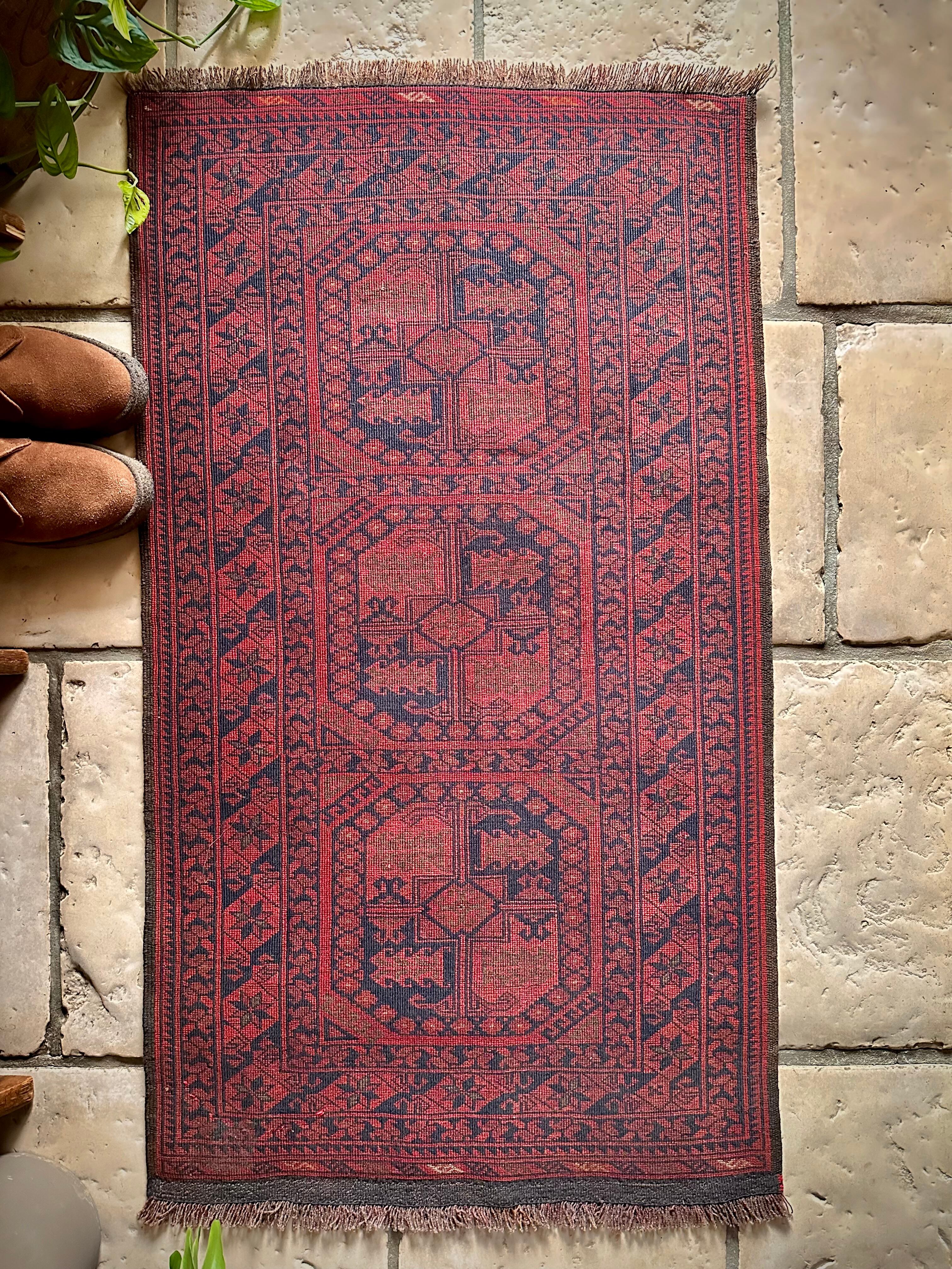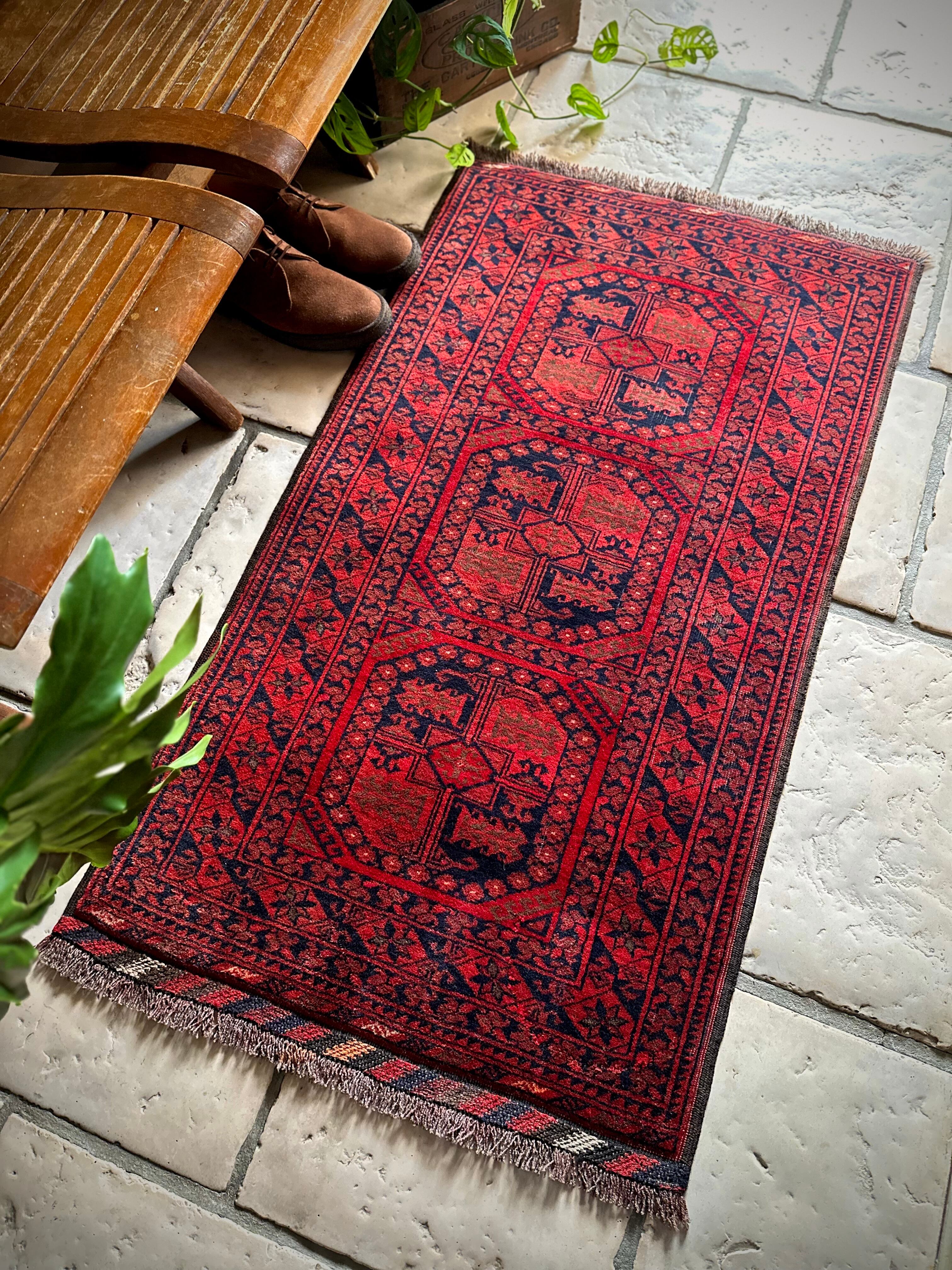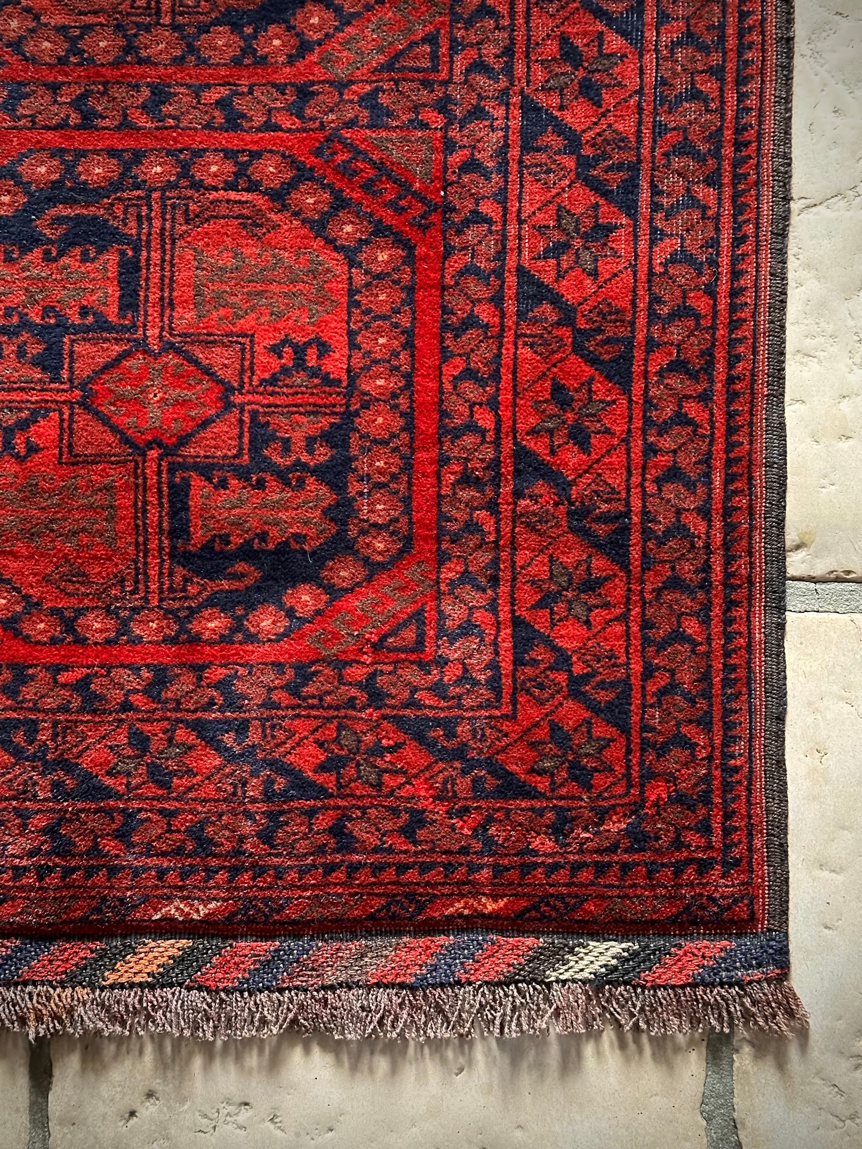 真っ赤なフィールドに描かれたブラックとオリーブブラウンのシンプルな配色ながらも緻密に織りなされた模様が素晴らしいこちらは、アフガニスタン北部に居住するトルクメンの支族で、フィルパイと呼ばれる象の足跡に似たスレイマンギュルを紋章とするエルサリ族からの1枚になります。