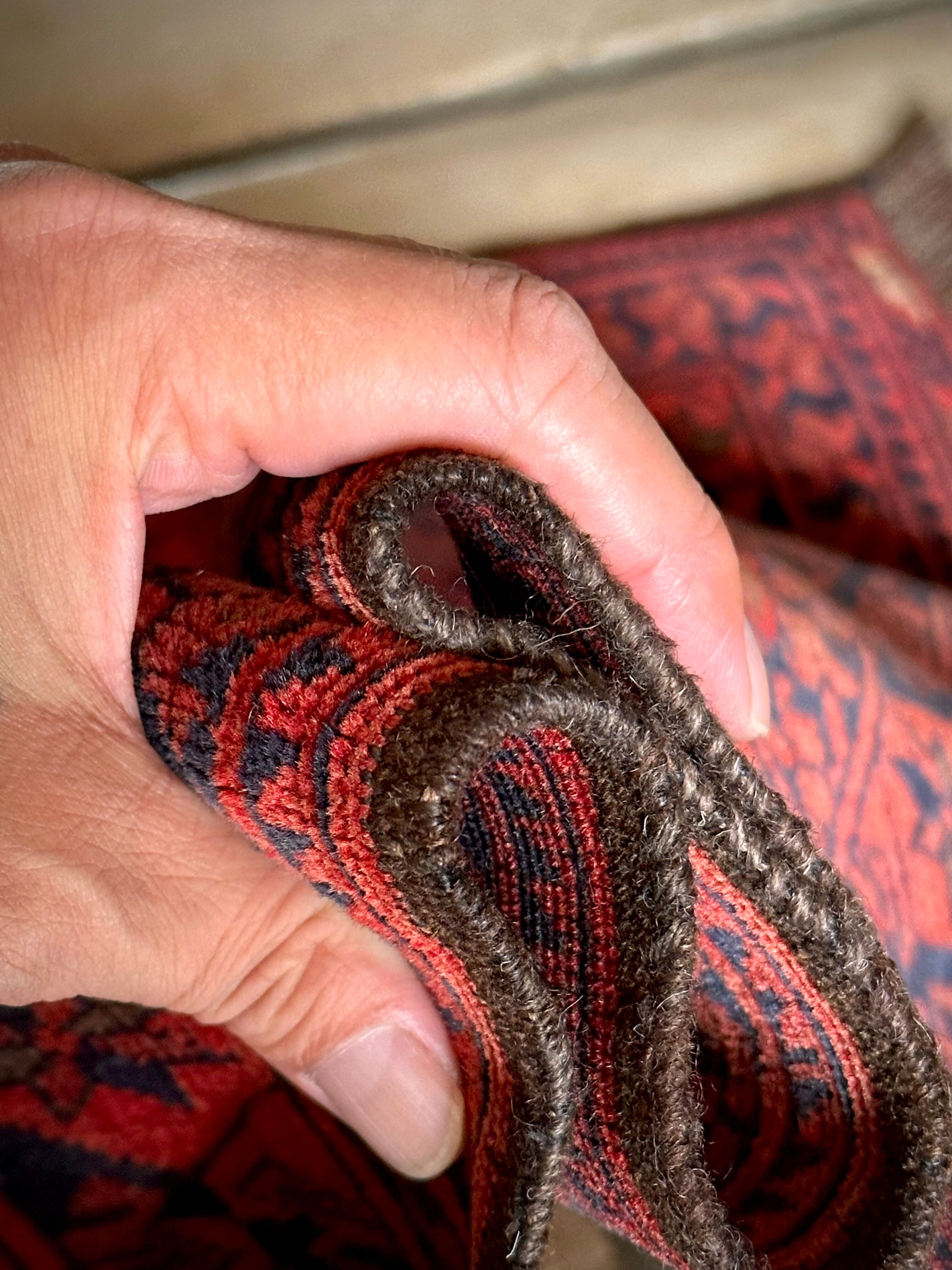 経年としては50年のヴィンテージラグらしく、それなりの使用感にパイルの擦れから白い緯糸がチラ見えしますが強度に問題はありませんし、それ以外に目立つ汚れやダメージにリペア箇所はありませんのでご安心ください。