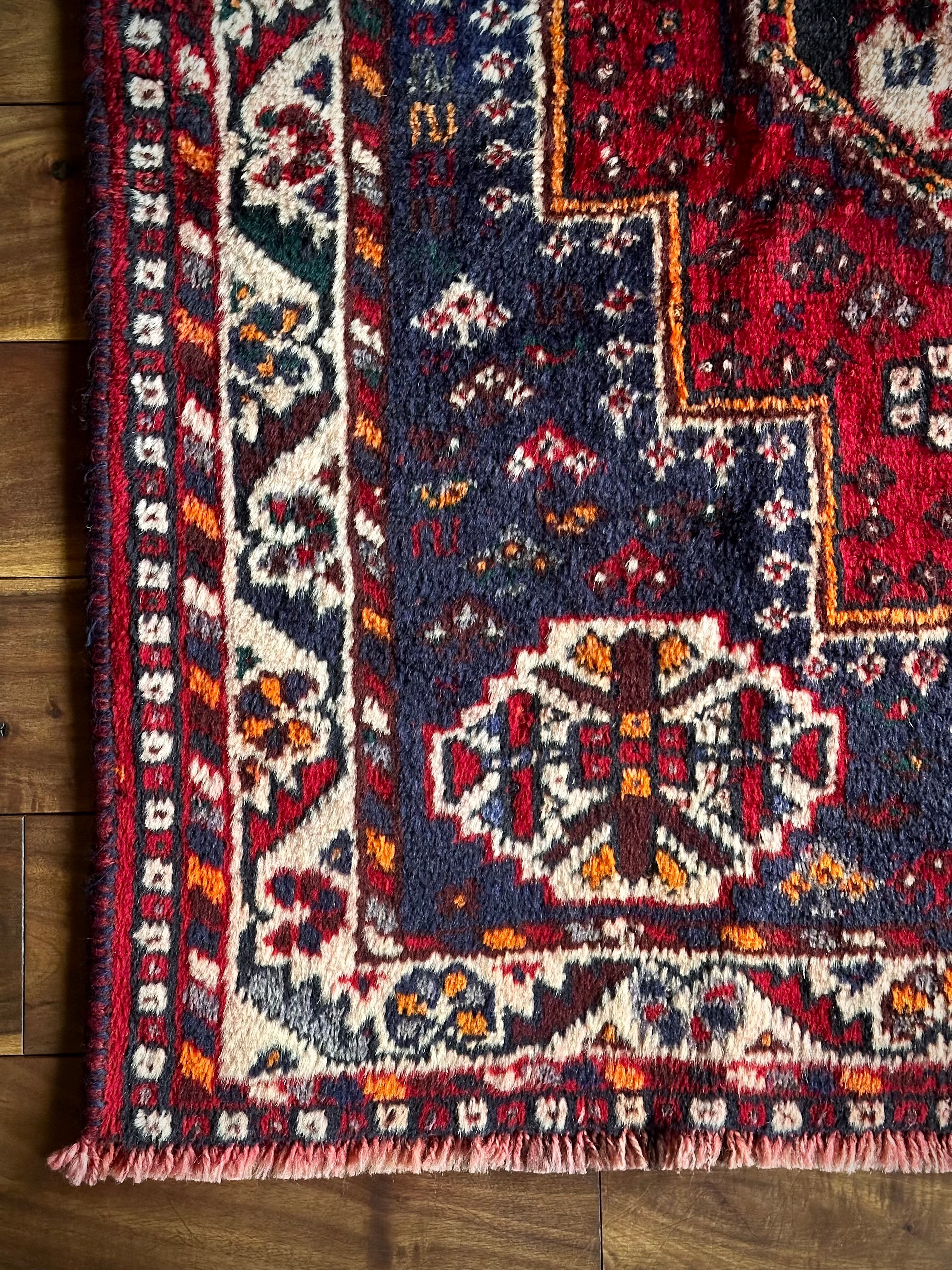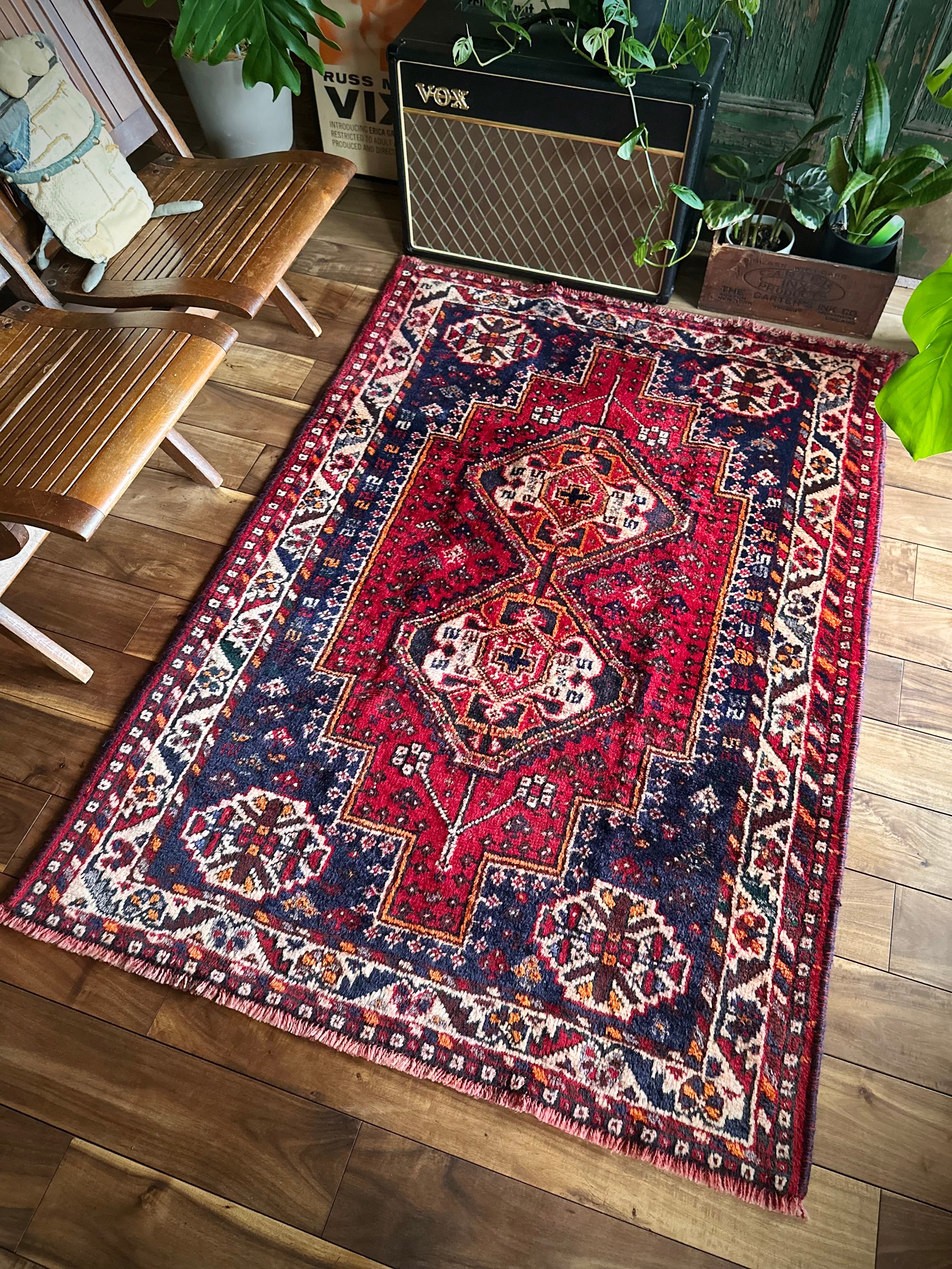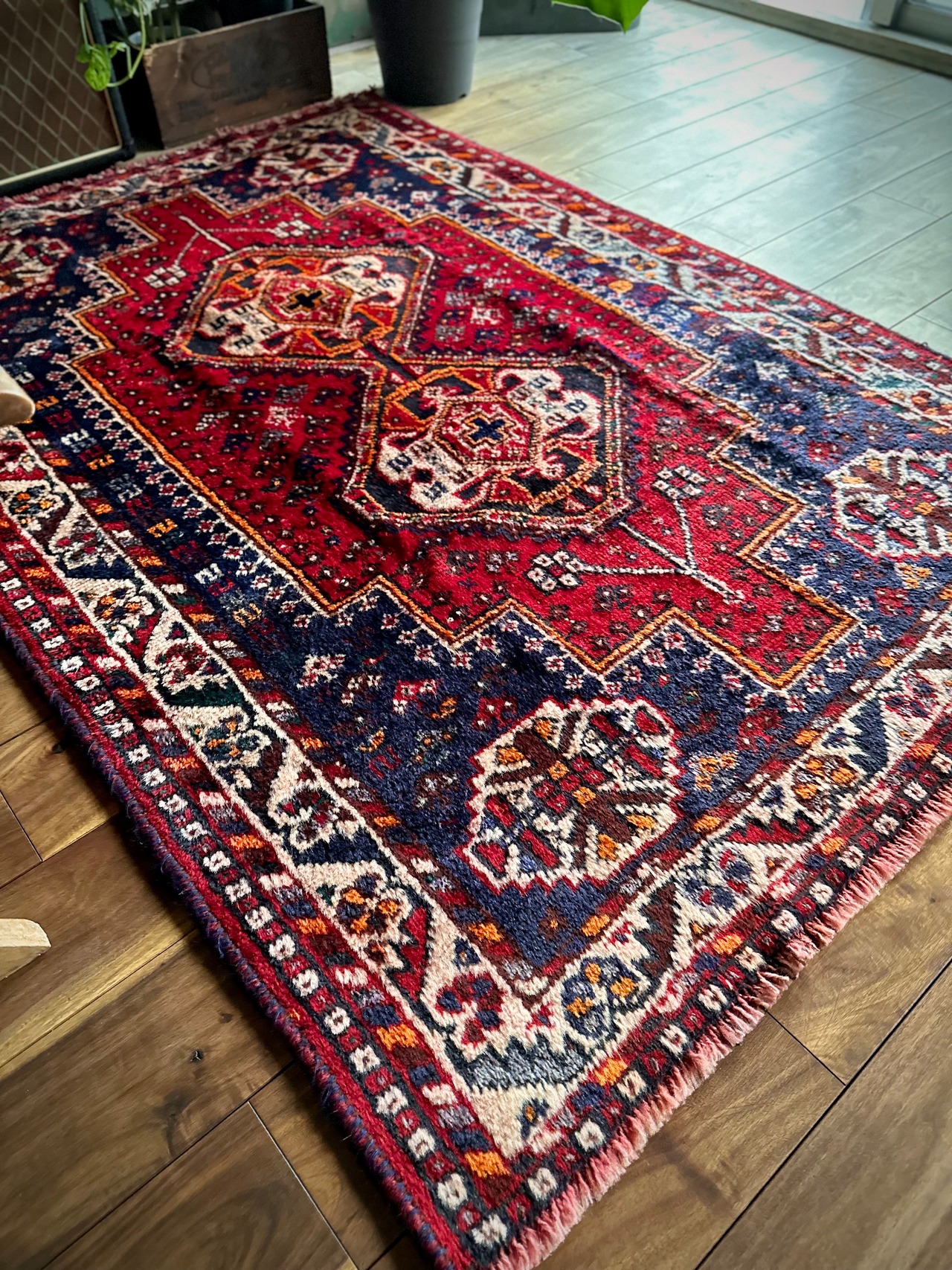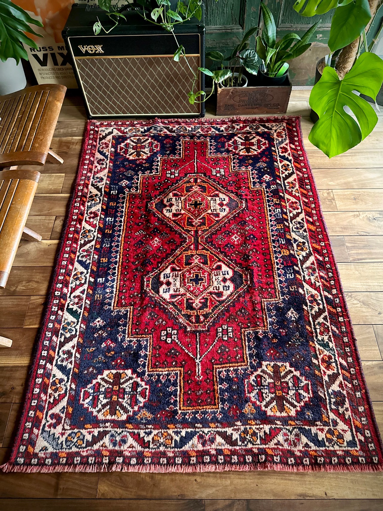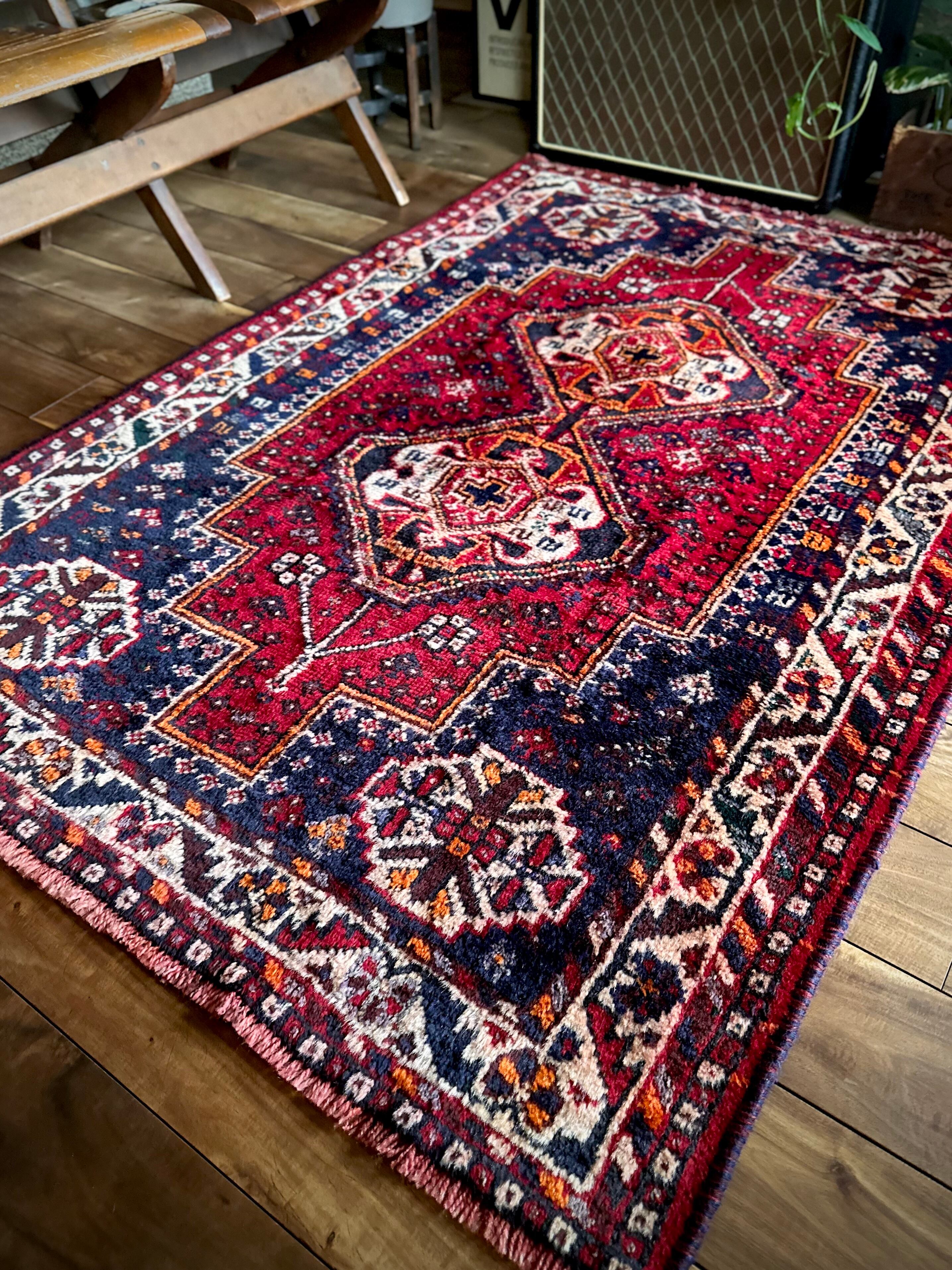 真っ赤なフィールドに2連のメダリオン、そこに合わさったネイビーカラーがお馴染みな配色のこちらは、イラン西部の街シラーズ近郊に居住するカシュガイ族のトライバルラグで、ペルシャ絨毯さながらのデザインが美しい安定感のある1枚になります。
