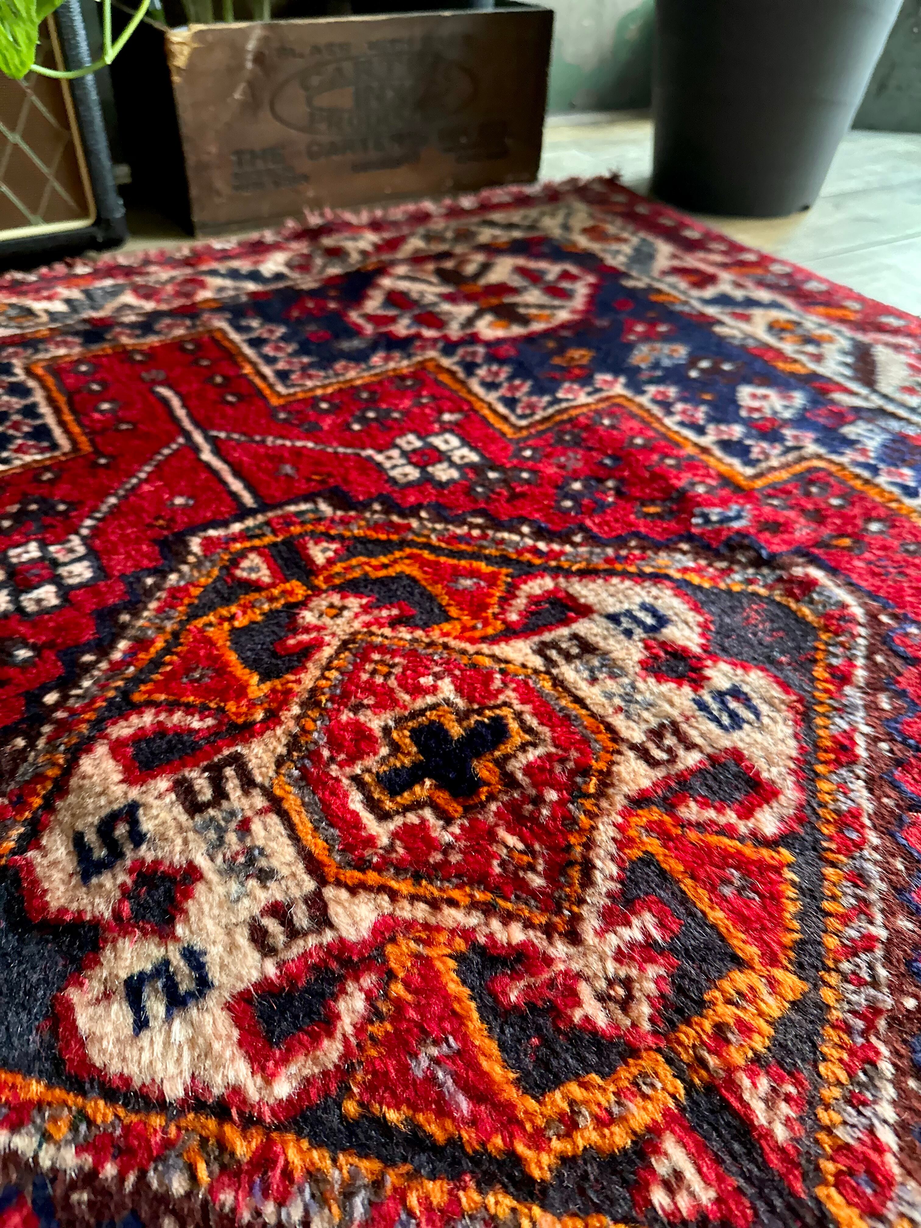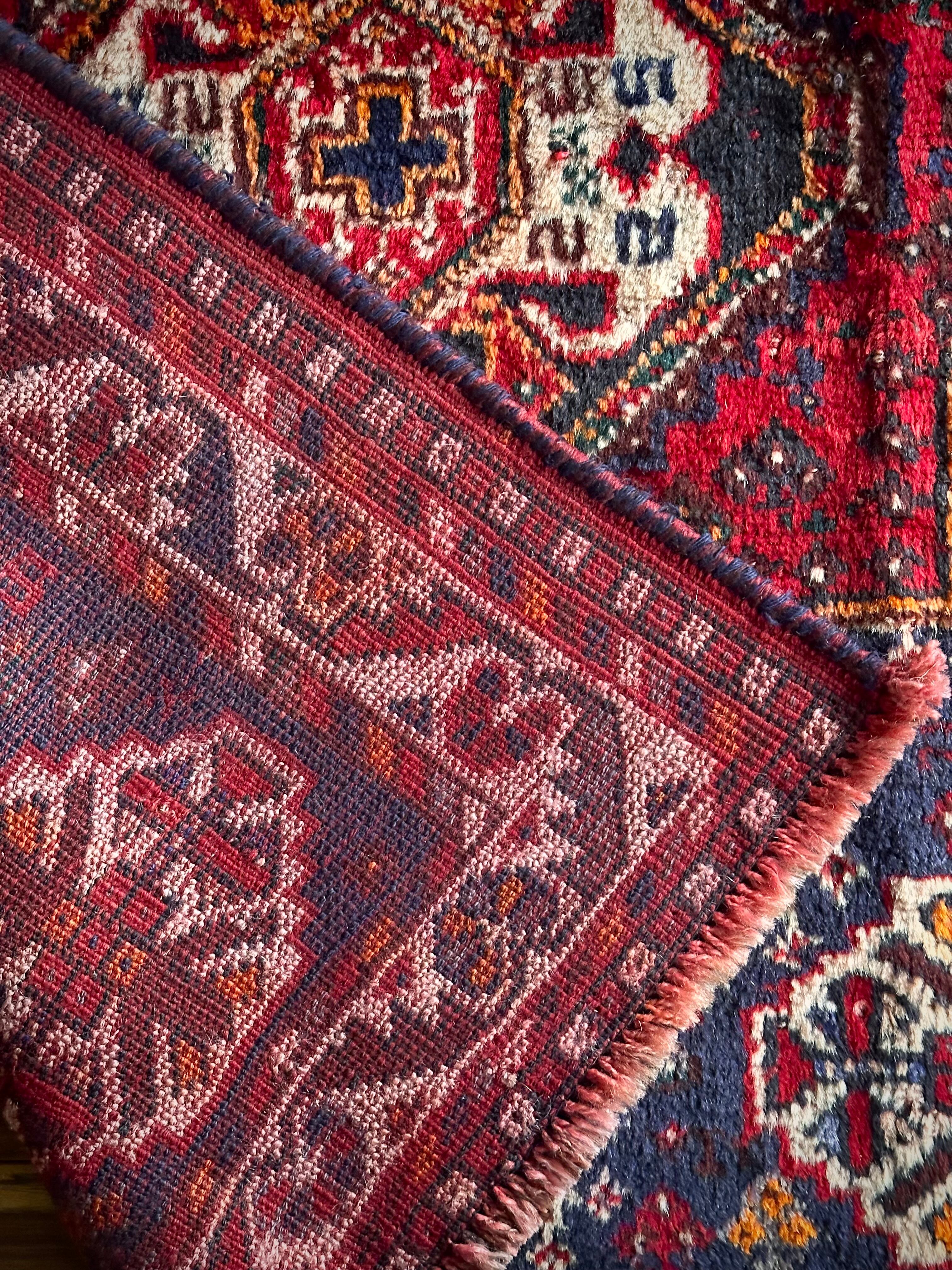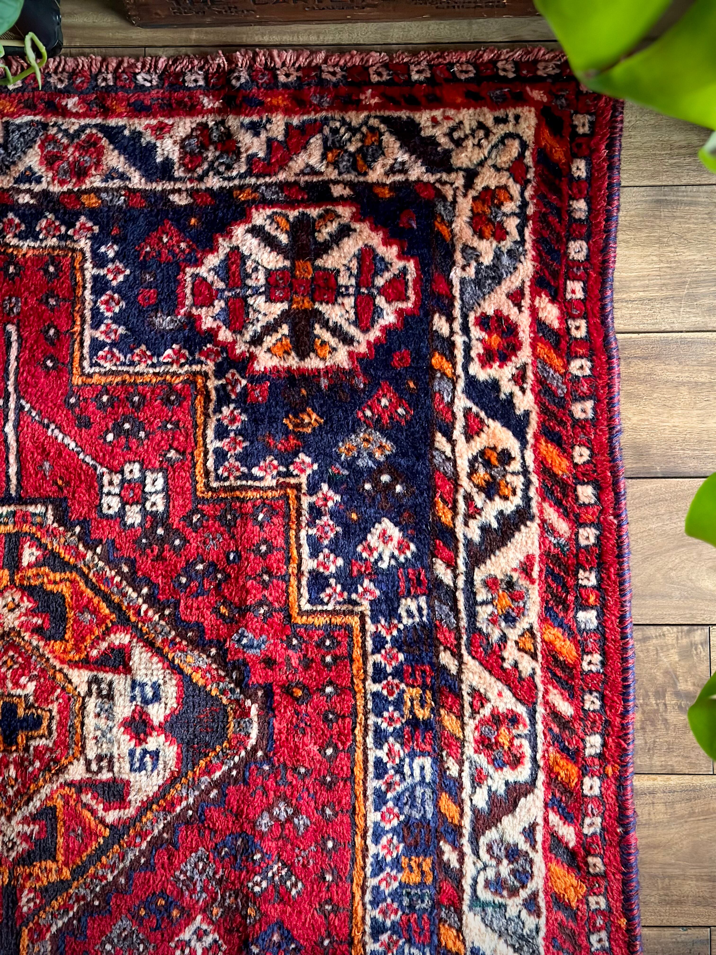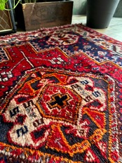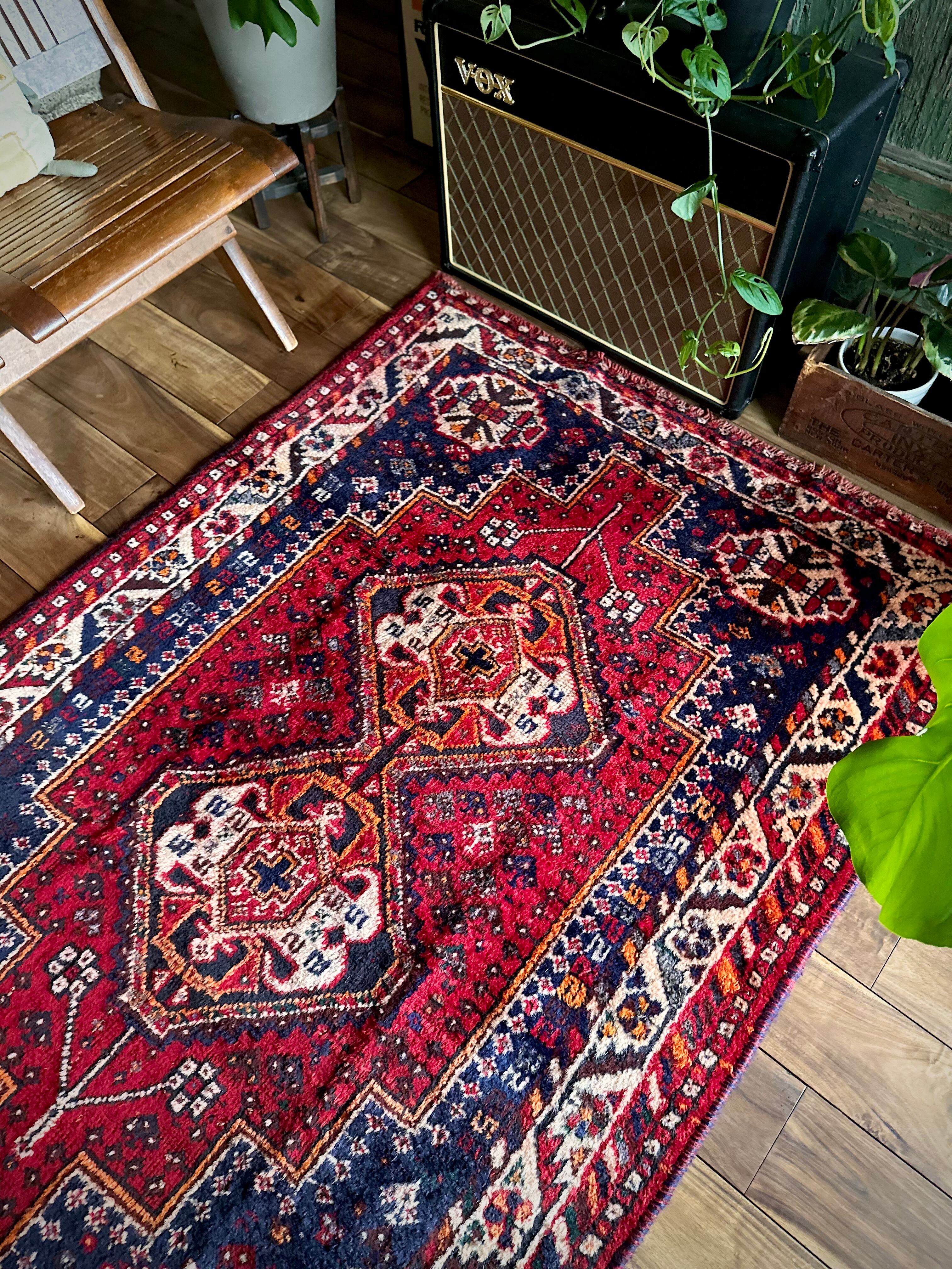 真っ赤なフィールドに2連のメダリオン、そこに合わさったネイビーカラーがお馴染みな配色のこちらは、イラン西部の街シラーズ近郊に居住するカシュガイ族のトライバルラグで、ペルシャ絨毯さながらのデザインが美しい安定感のある1枚になります。