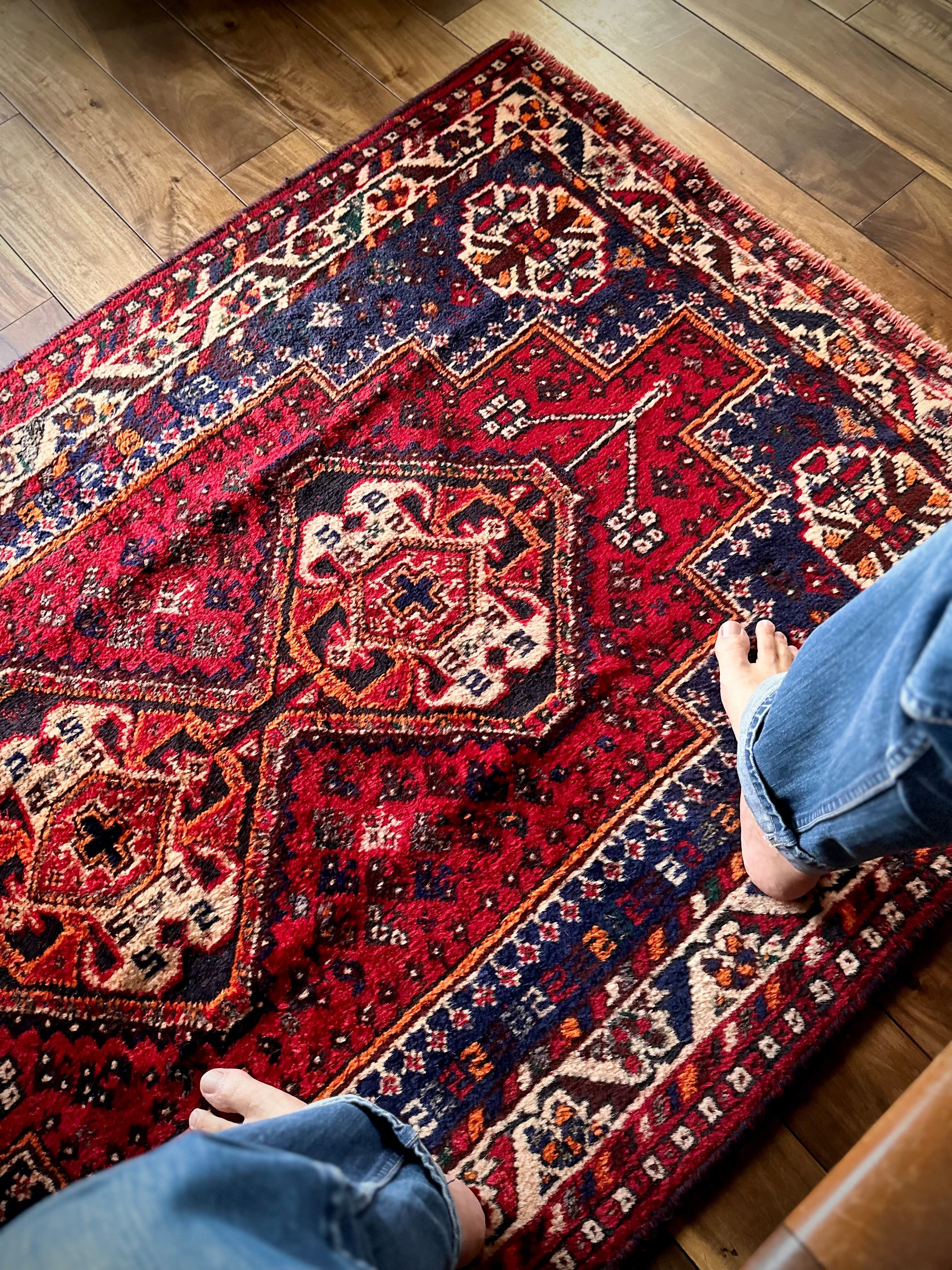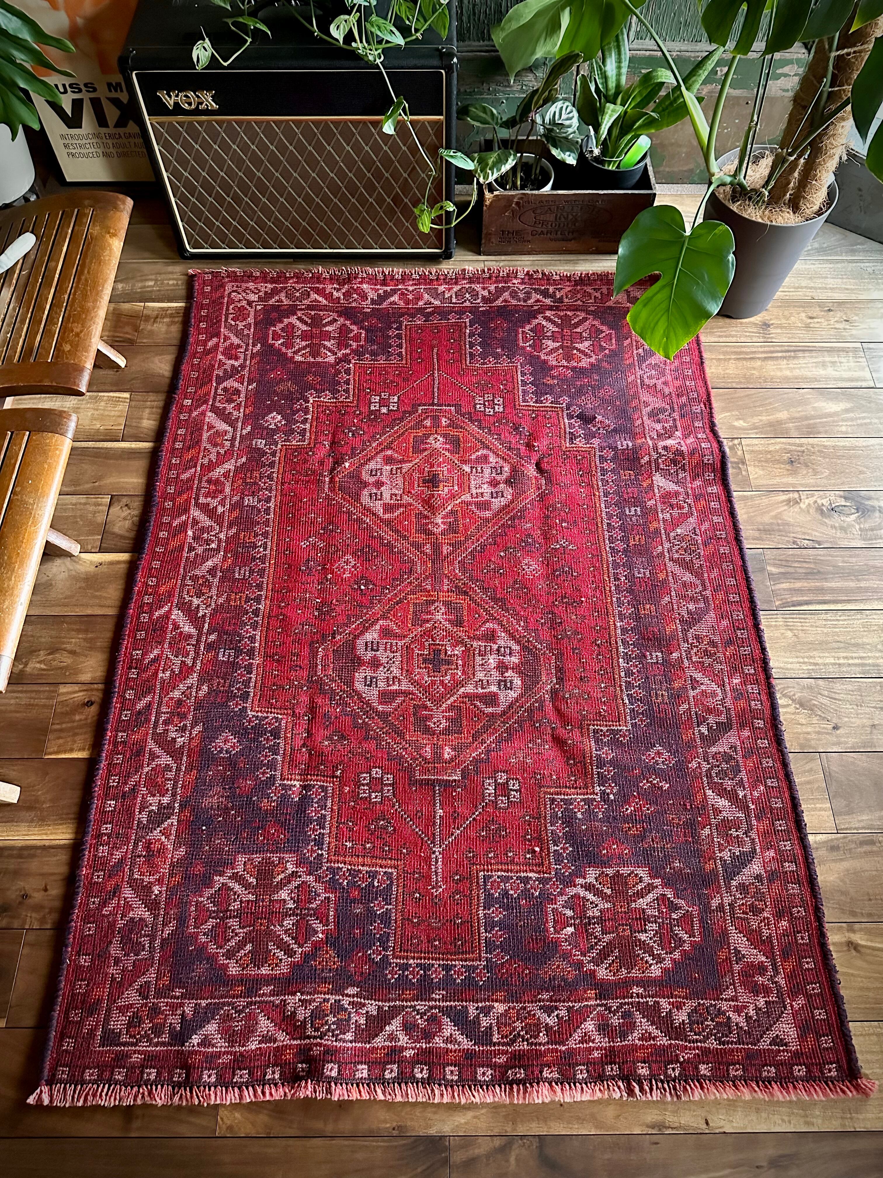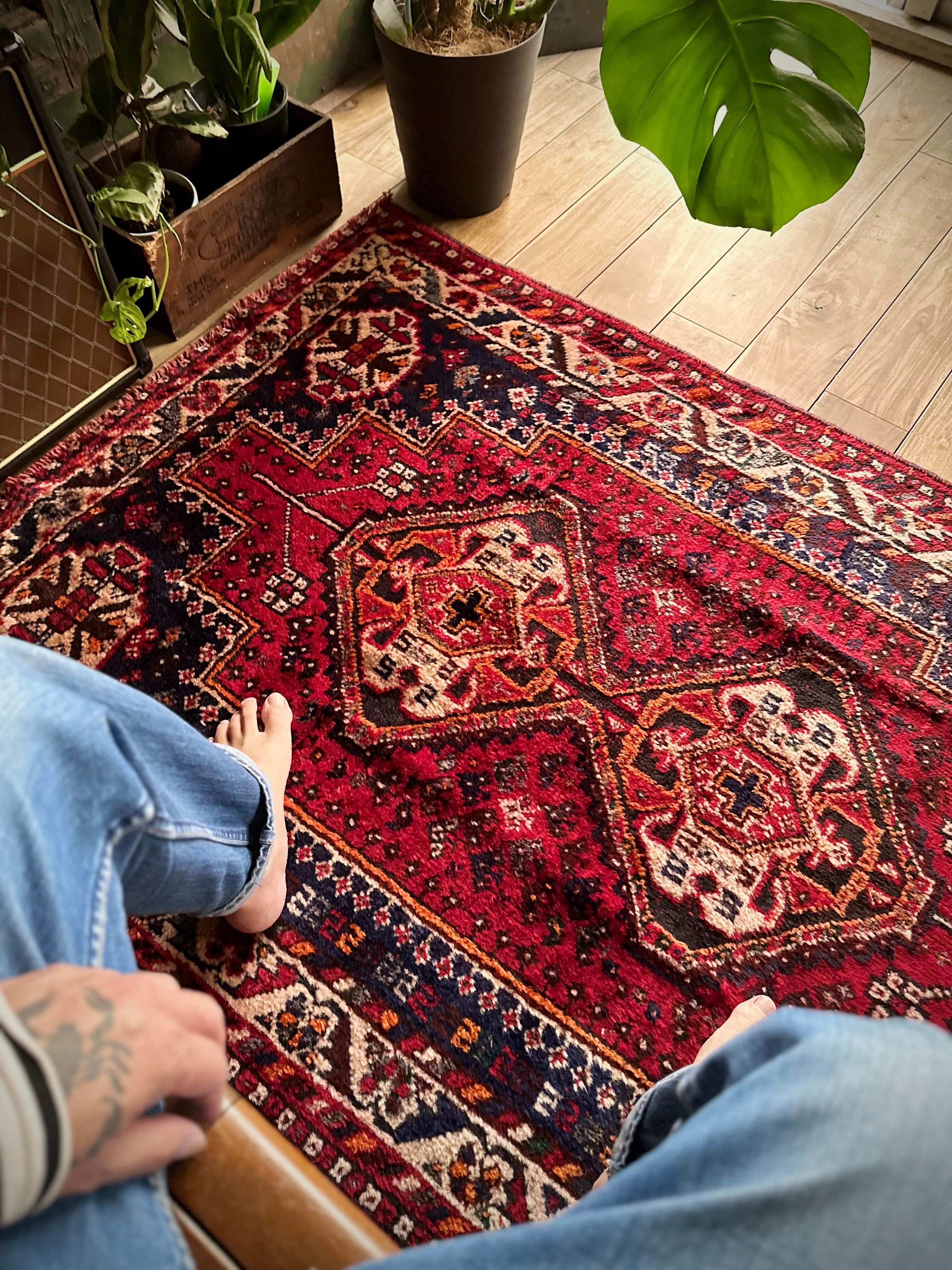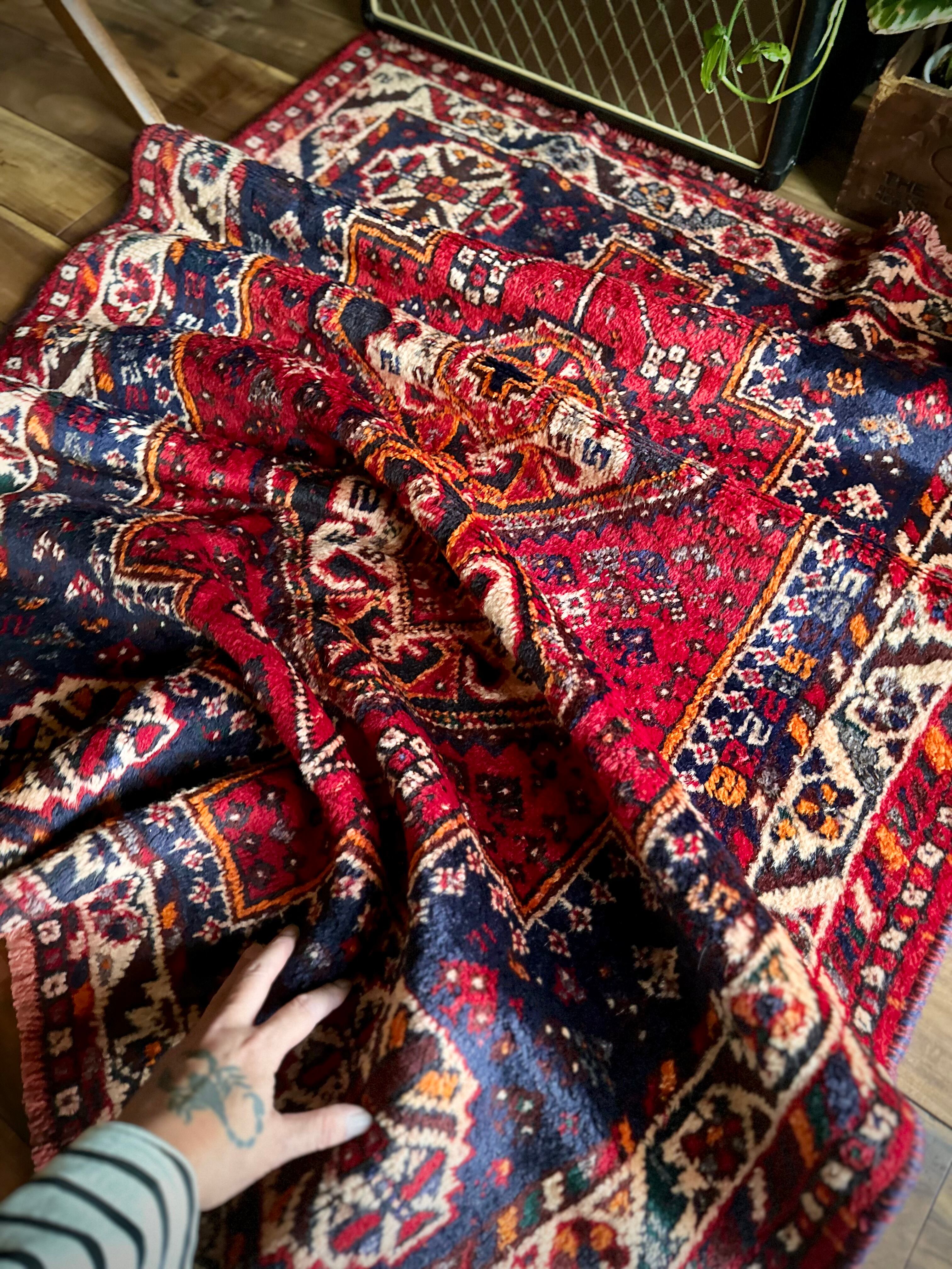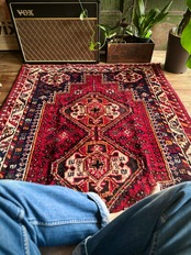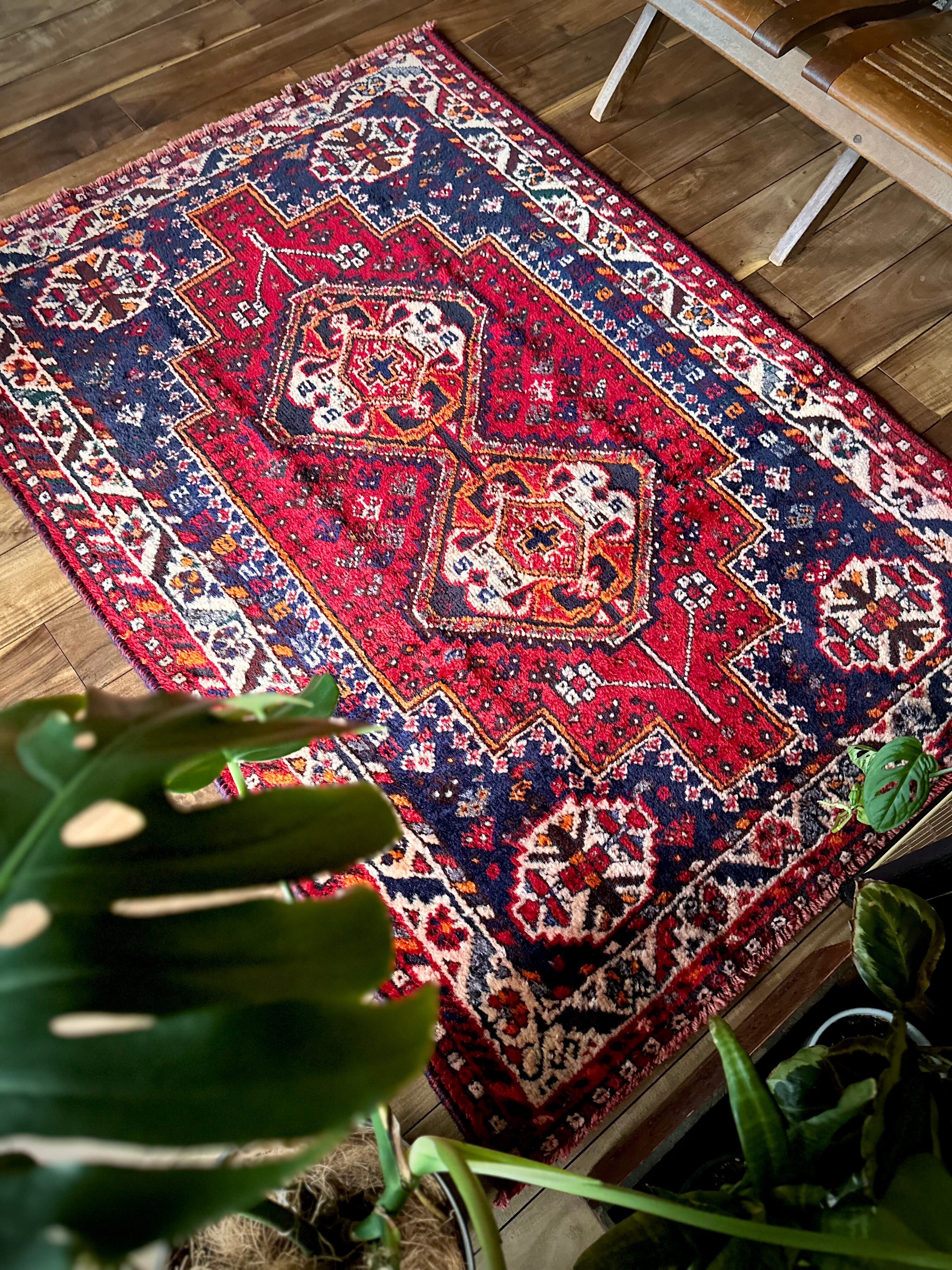 真っ赤なフィールドに2連のメダリオン、そこに合わさったネイビーカラーがお馴染みな配色のこちらは、イラン西部の街シラーズ近郊に居住するカシュガイ族のトライバルラグで、ペルシャ絨毯さながらのデザインが美しい安定感のある1枚になります。
