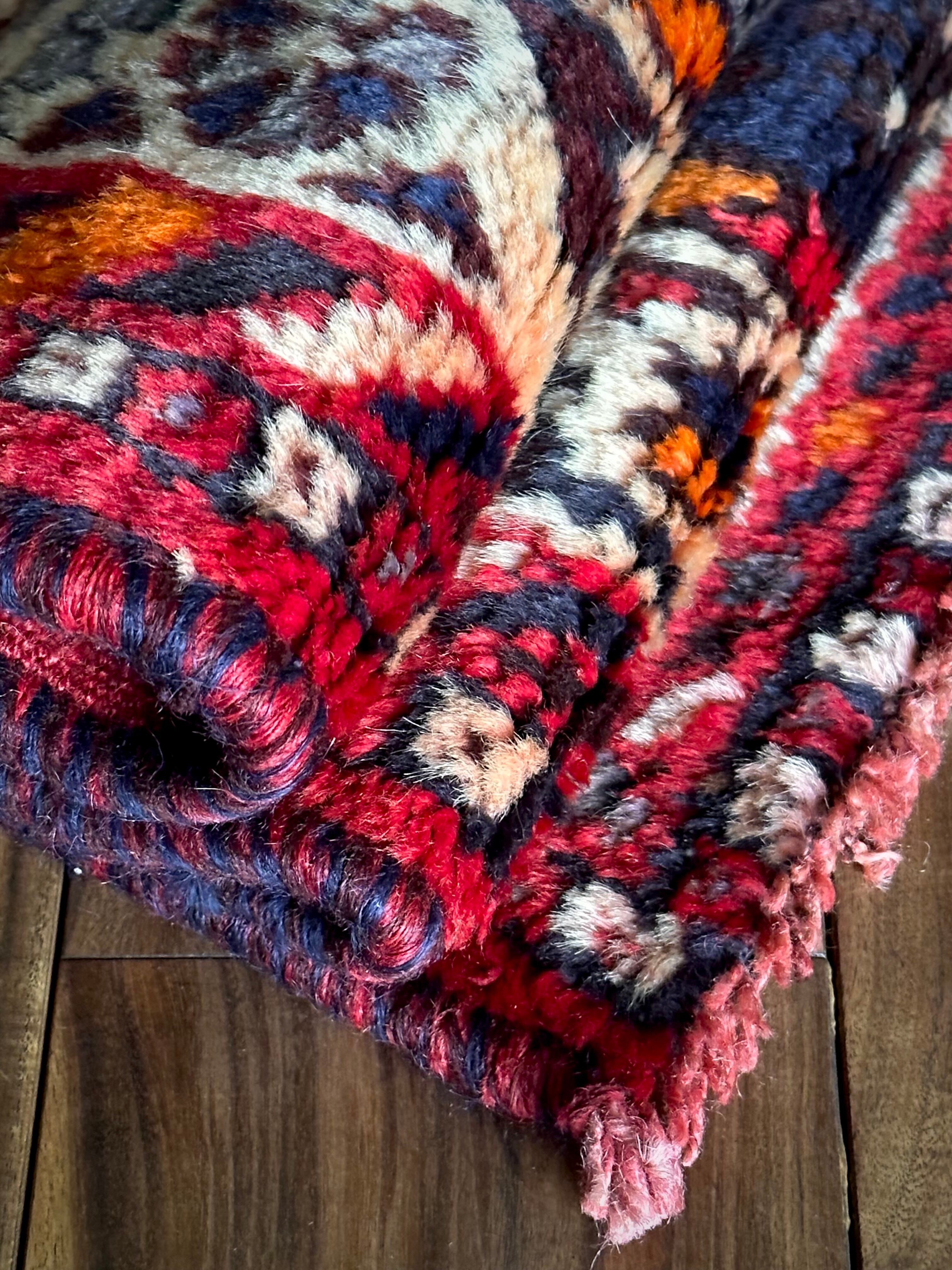 見た目にも豪快なカシュガイ独特のざっくりとした柔らかな織りで長いパイルの毛足はフカフカと、大きさは2人掛けソファ前やベッドサイドに最適なミディアムサイズとなり、お部屋のムードを華やかにしてくれるでしょう。