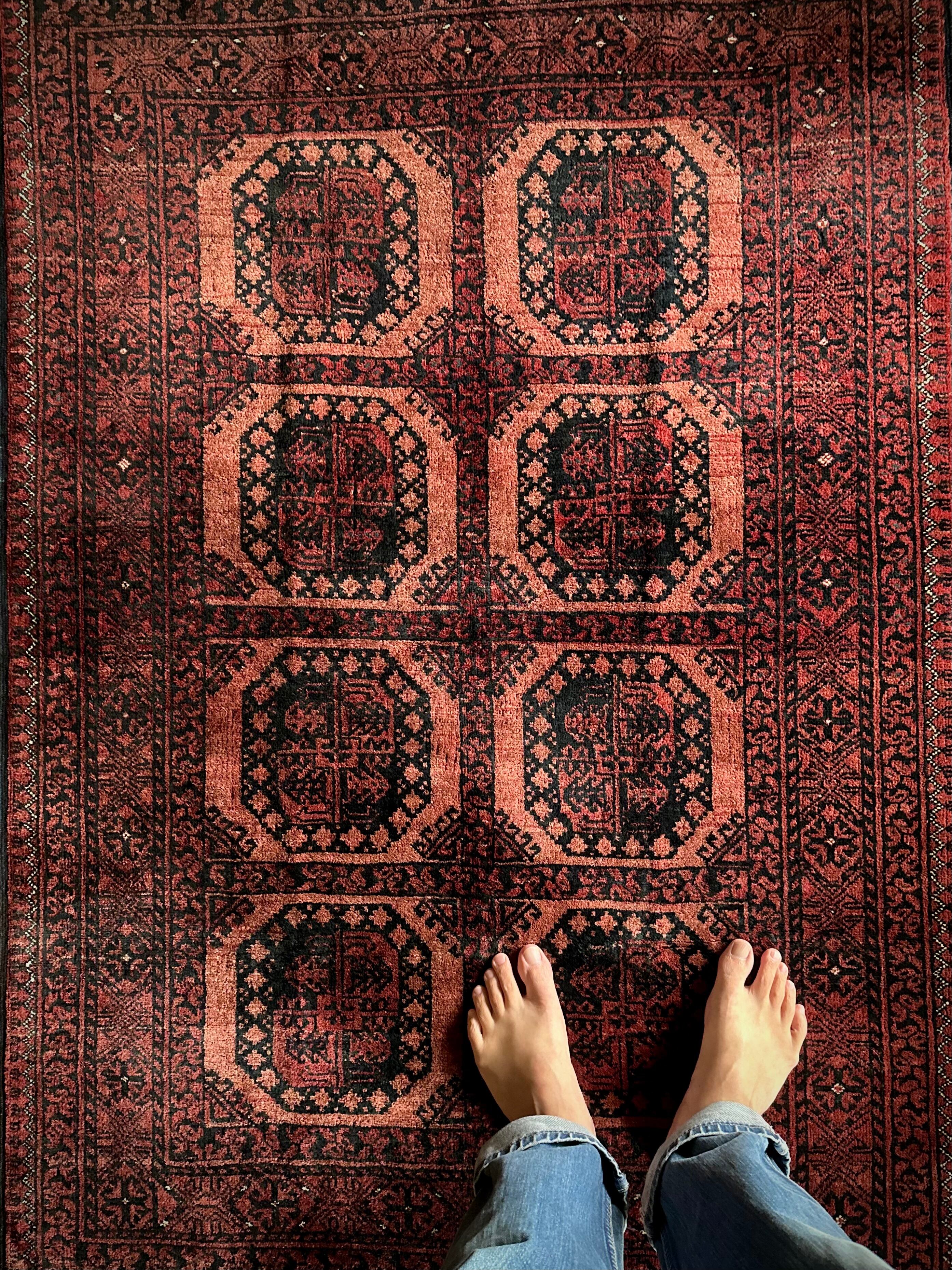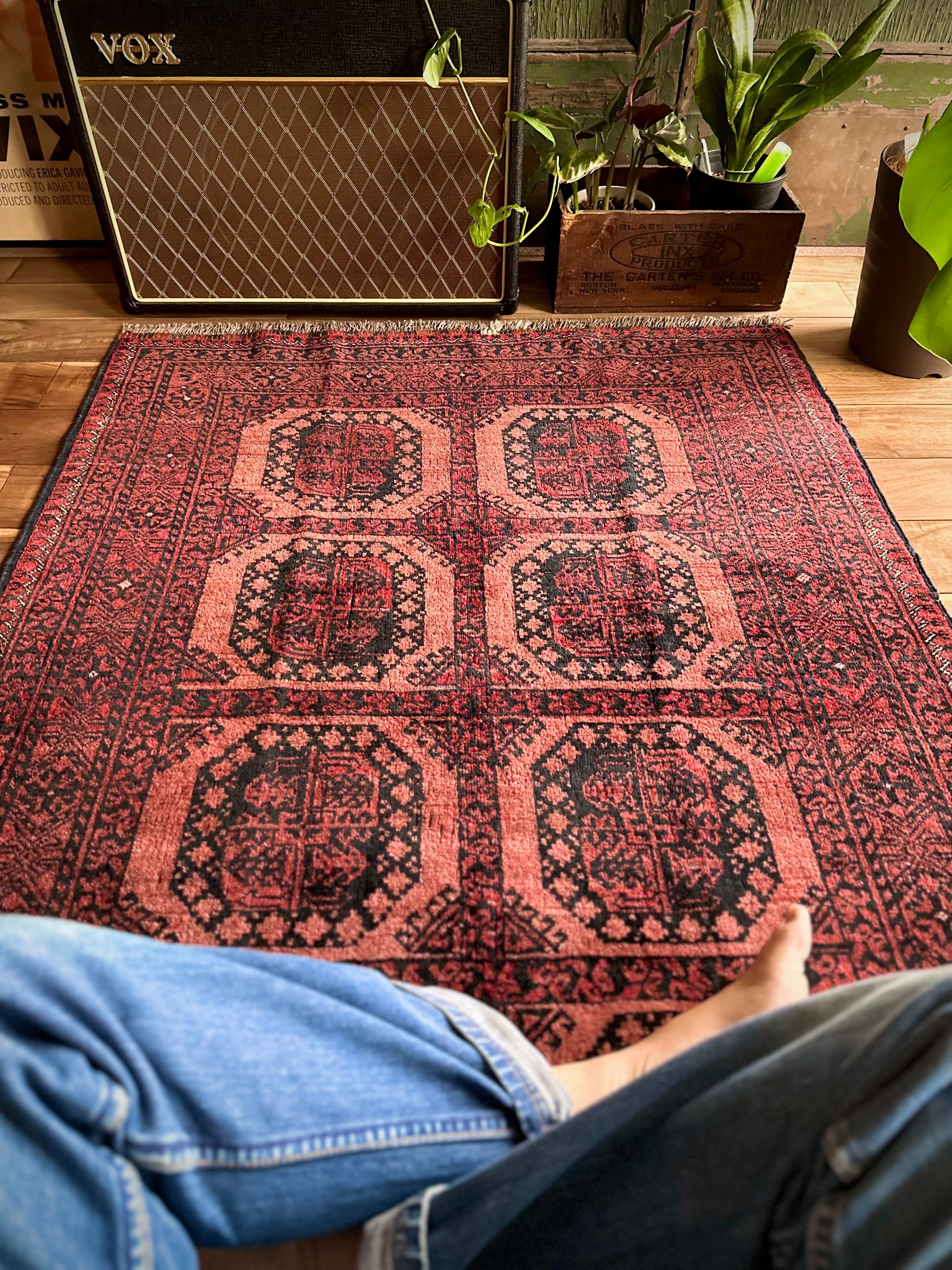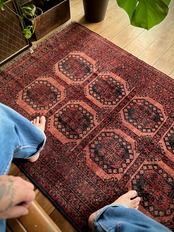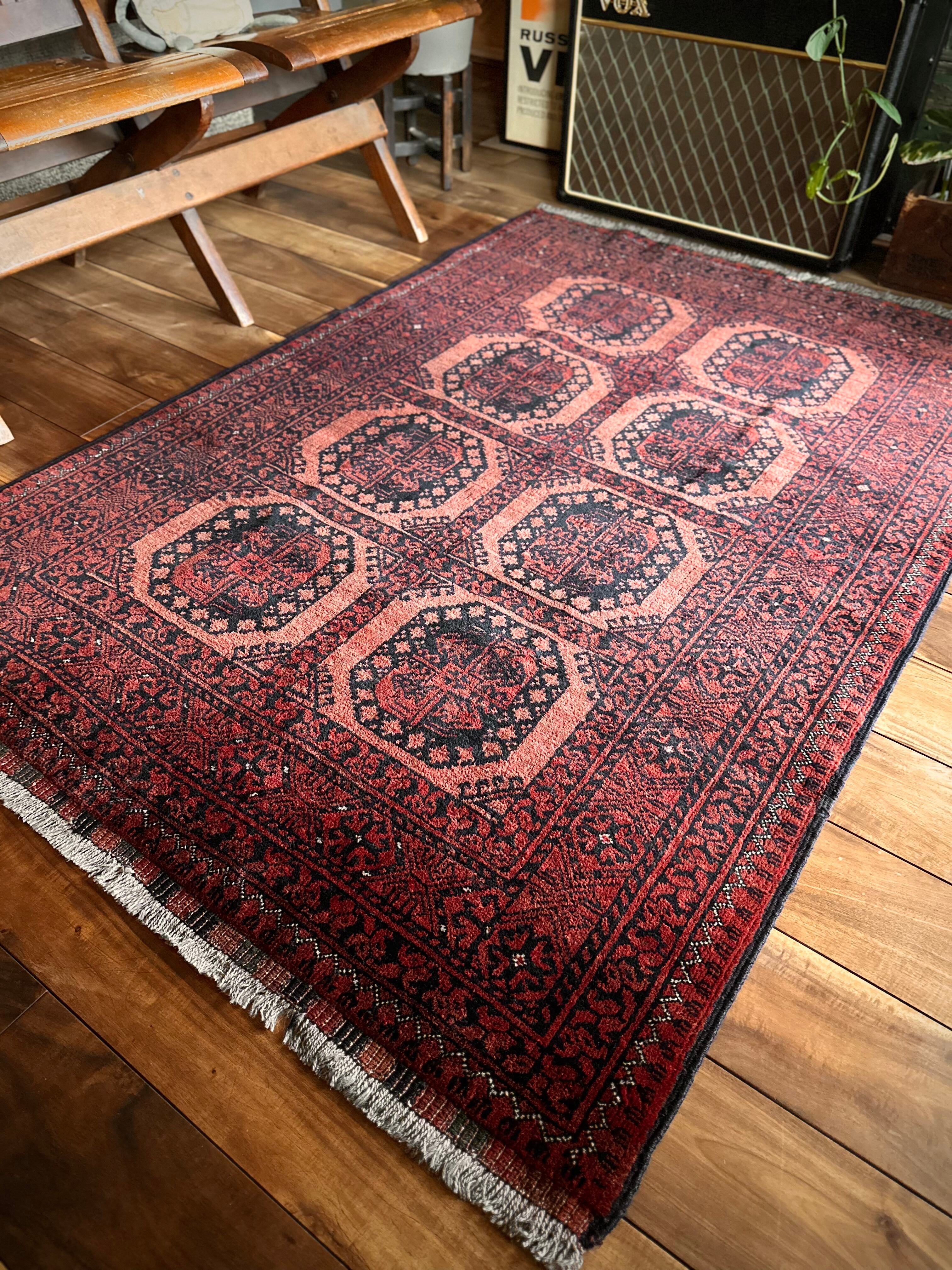 最後にラグそのものに関しては羊毛特有の匂いがあり、採寸は中央付近で計測していますが、手織りならではの歪みによる誤差や水洗いクリーニングによる縮み、また草木染めによる経年劣化の色ムラなどがありますが、それもまたヴィンテージラグの魅力かとご理解ください。