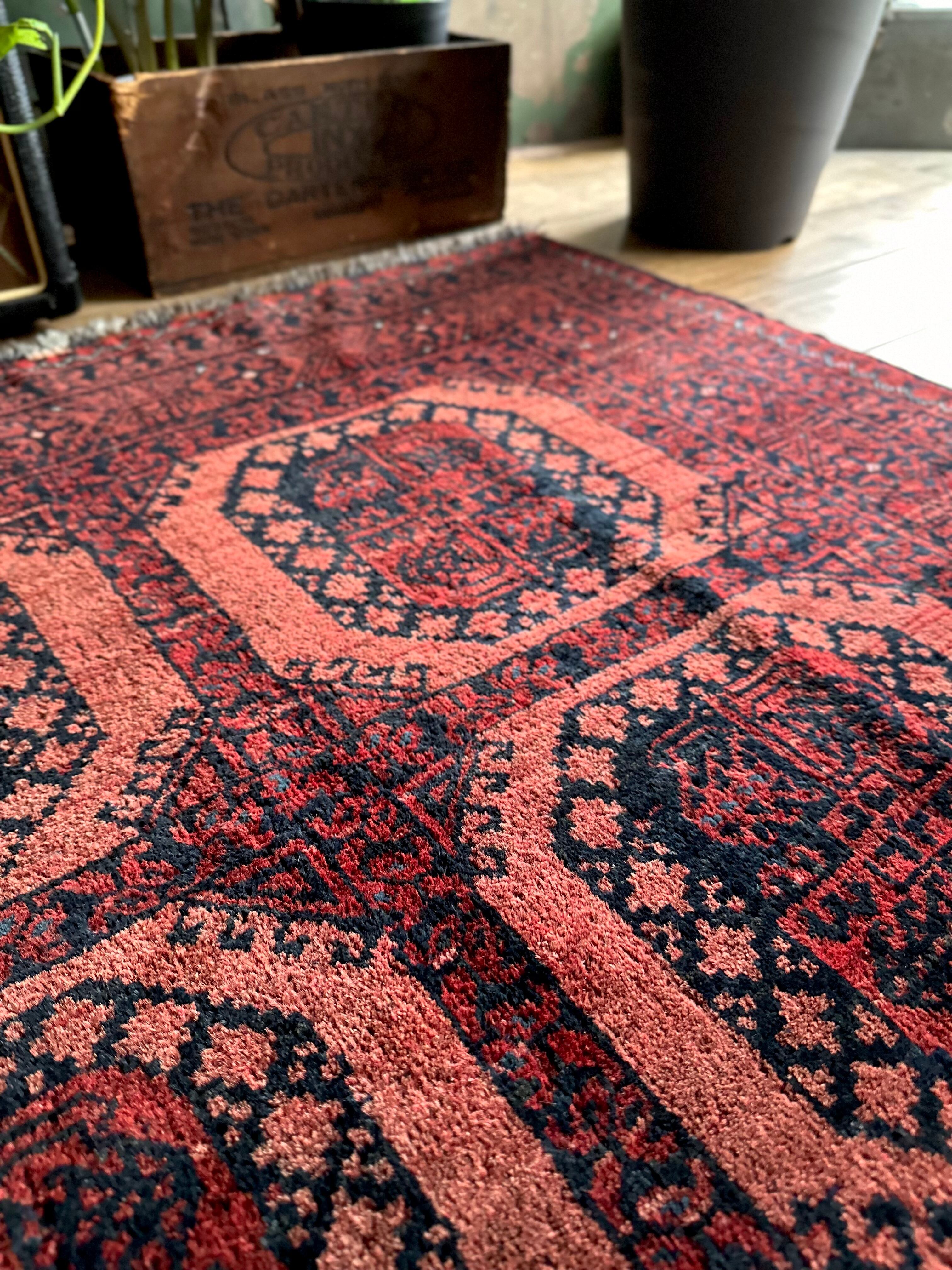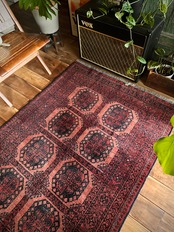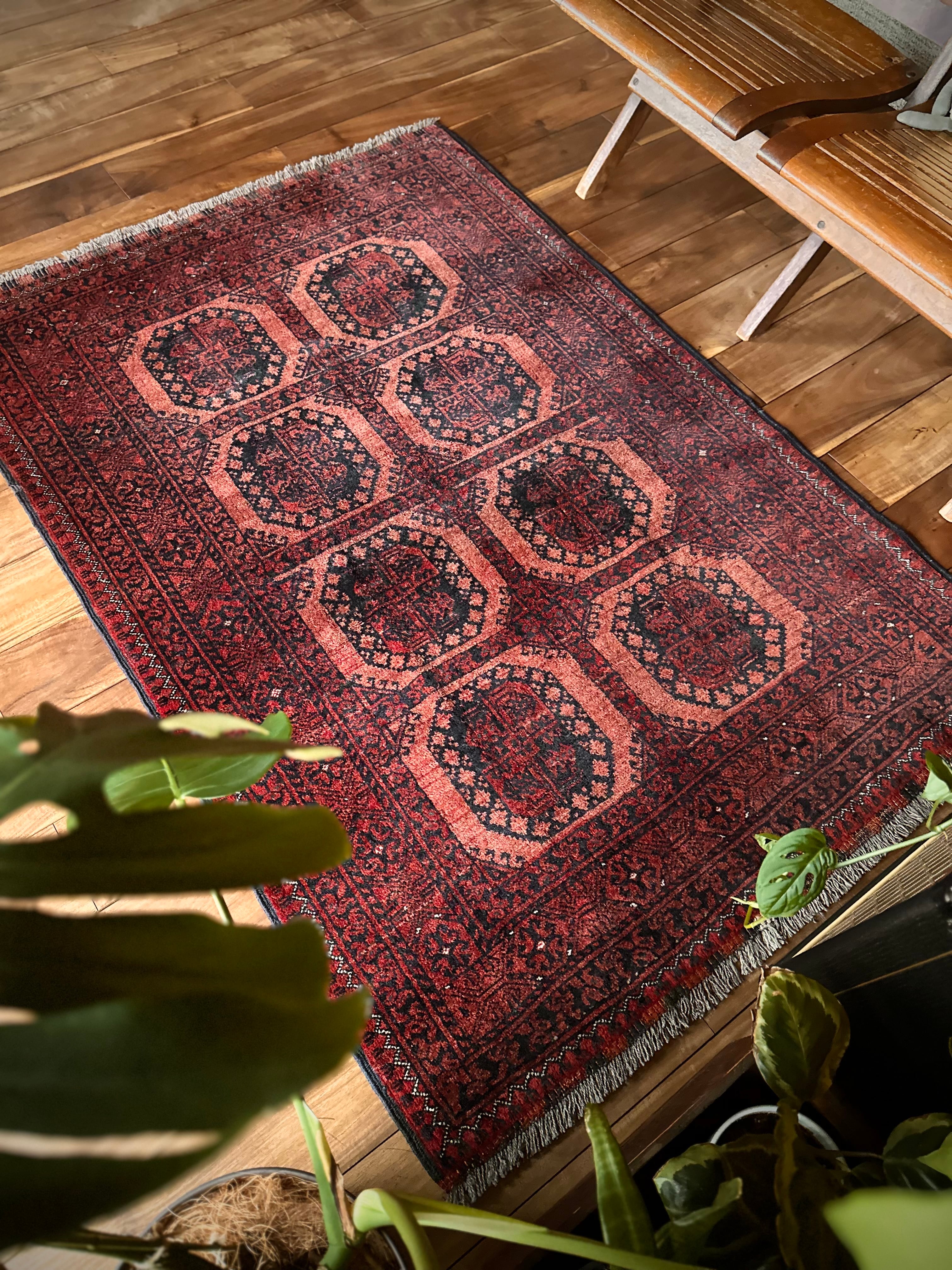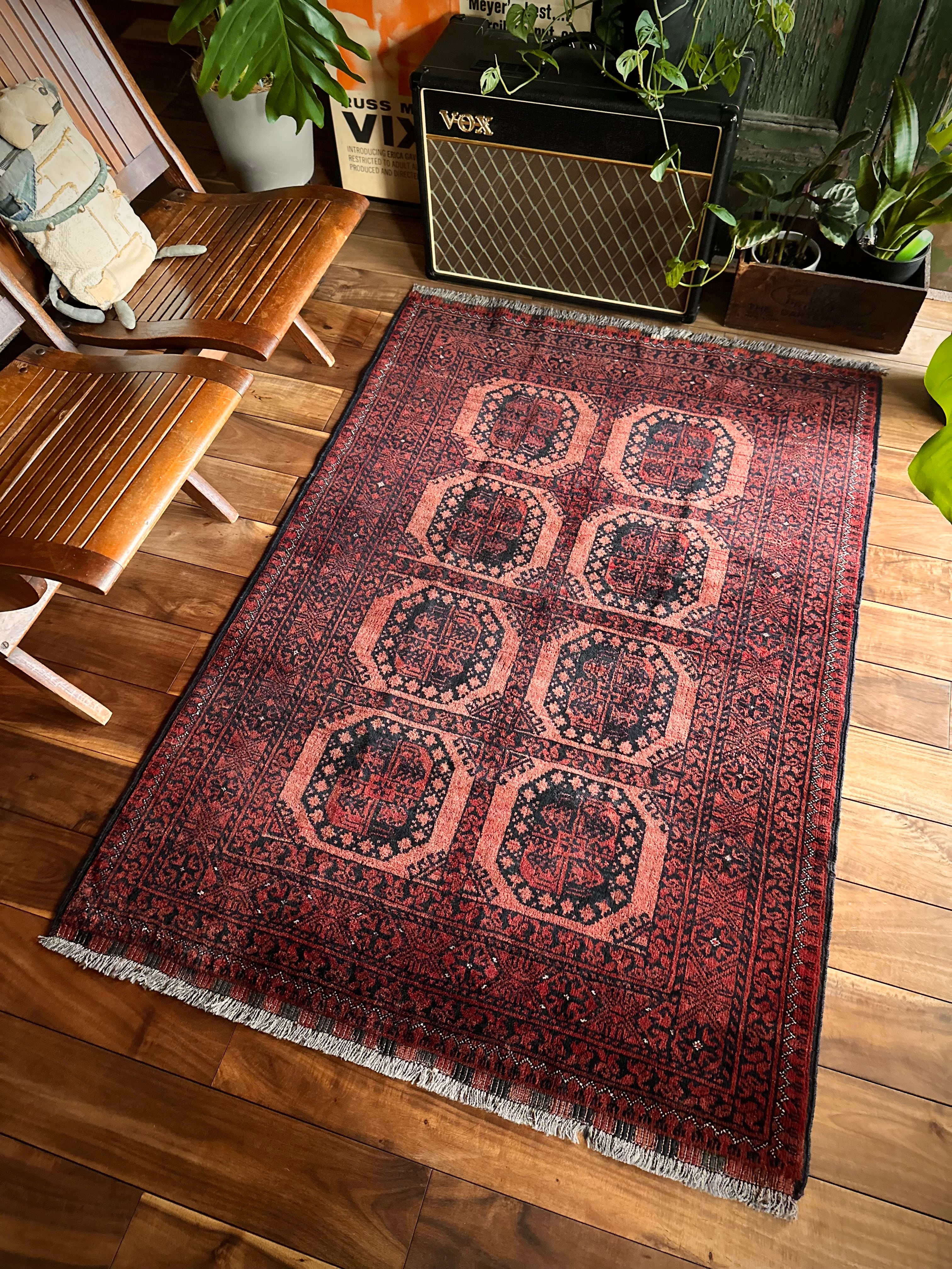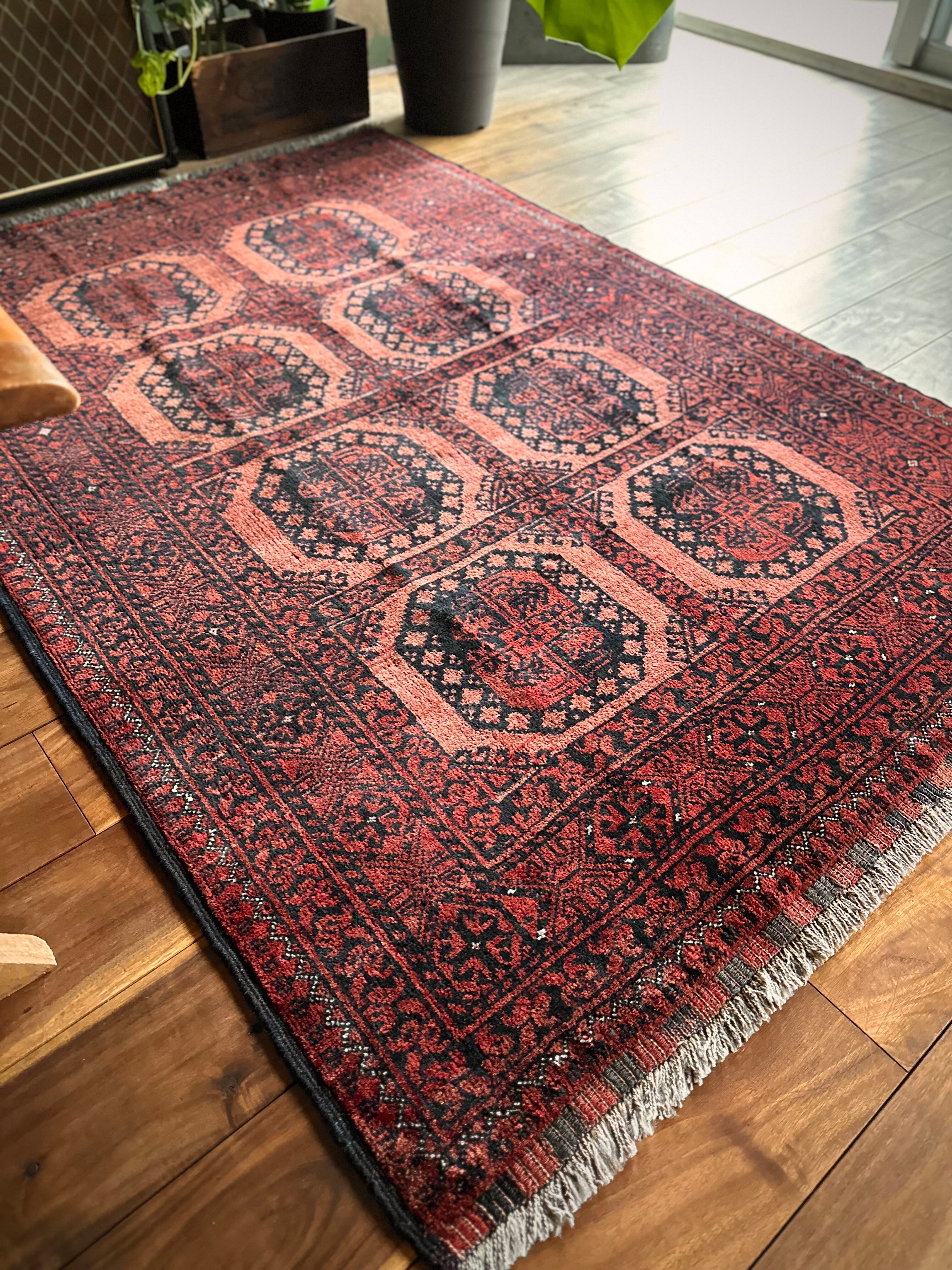 色褪せた濃淡のある赤色の使い方で色彩が変わってしまうインパクトあるこちらは、アフガニスタン北部に居住するトルクメンの支族で、フィルパイと呼ばれる象の足跡のような独特なスレイマン・ギュルがかっこいいエルサリ族のトライバルラグになります。
