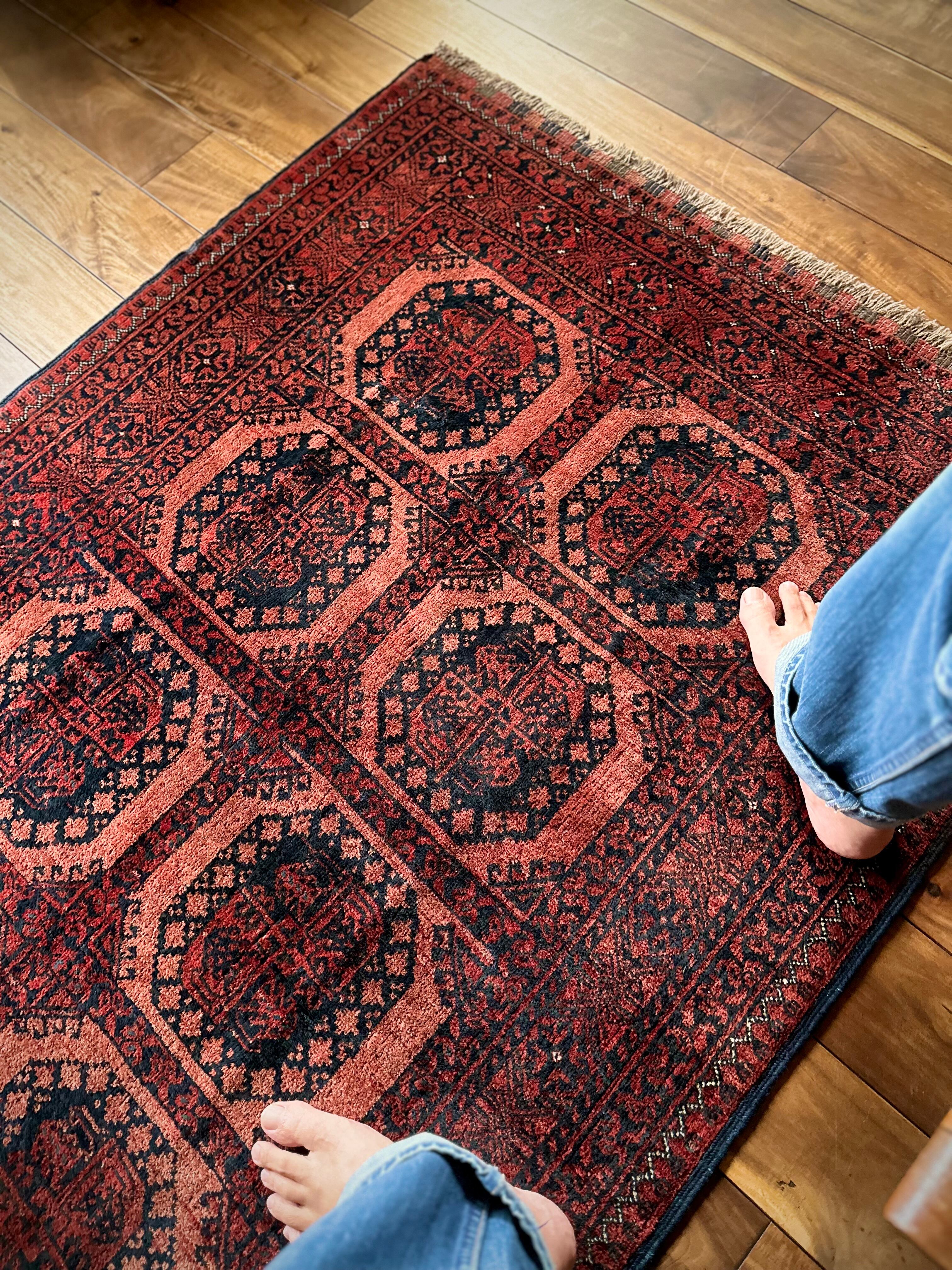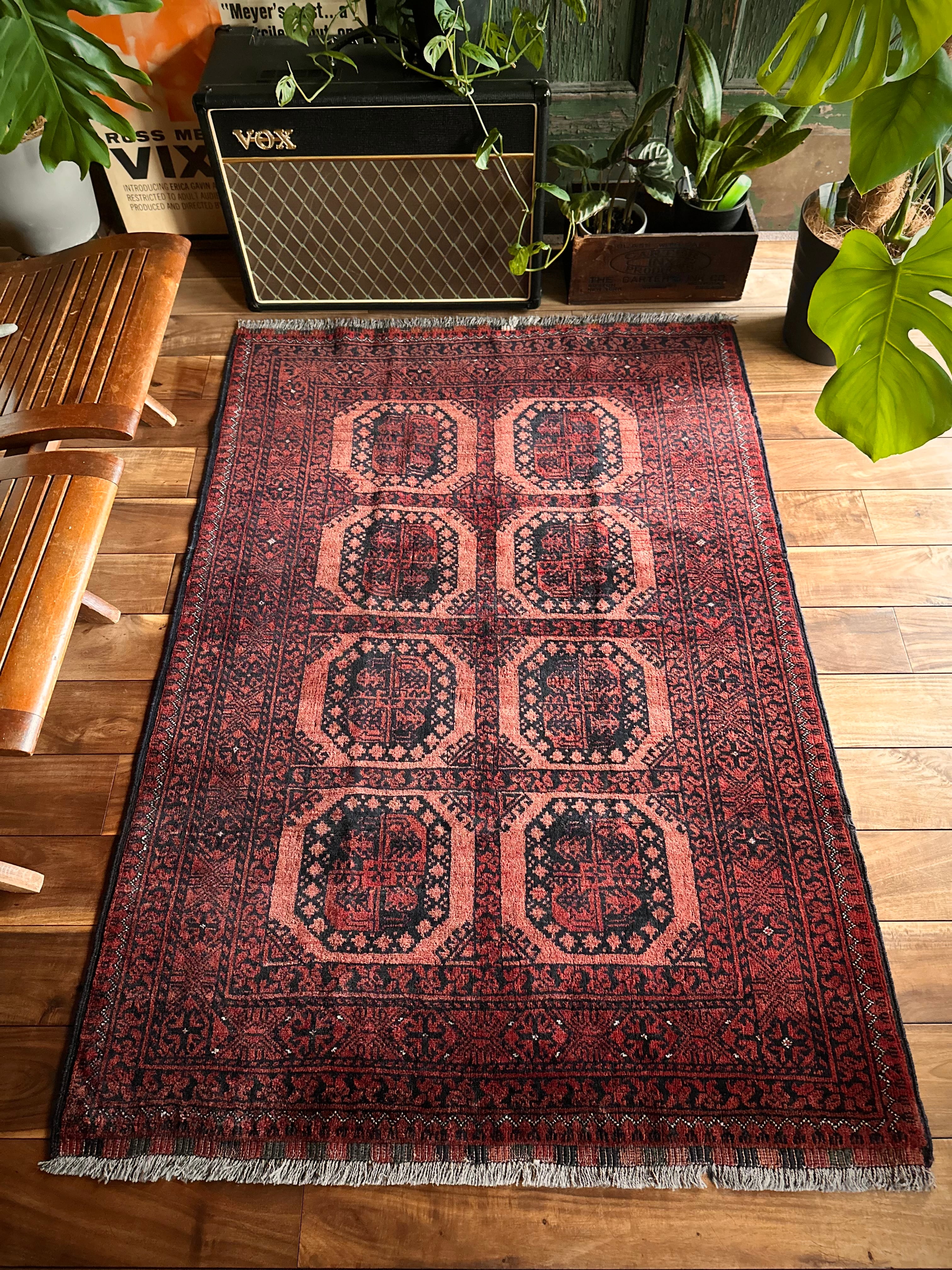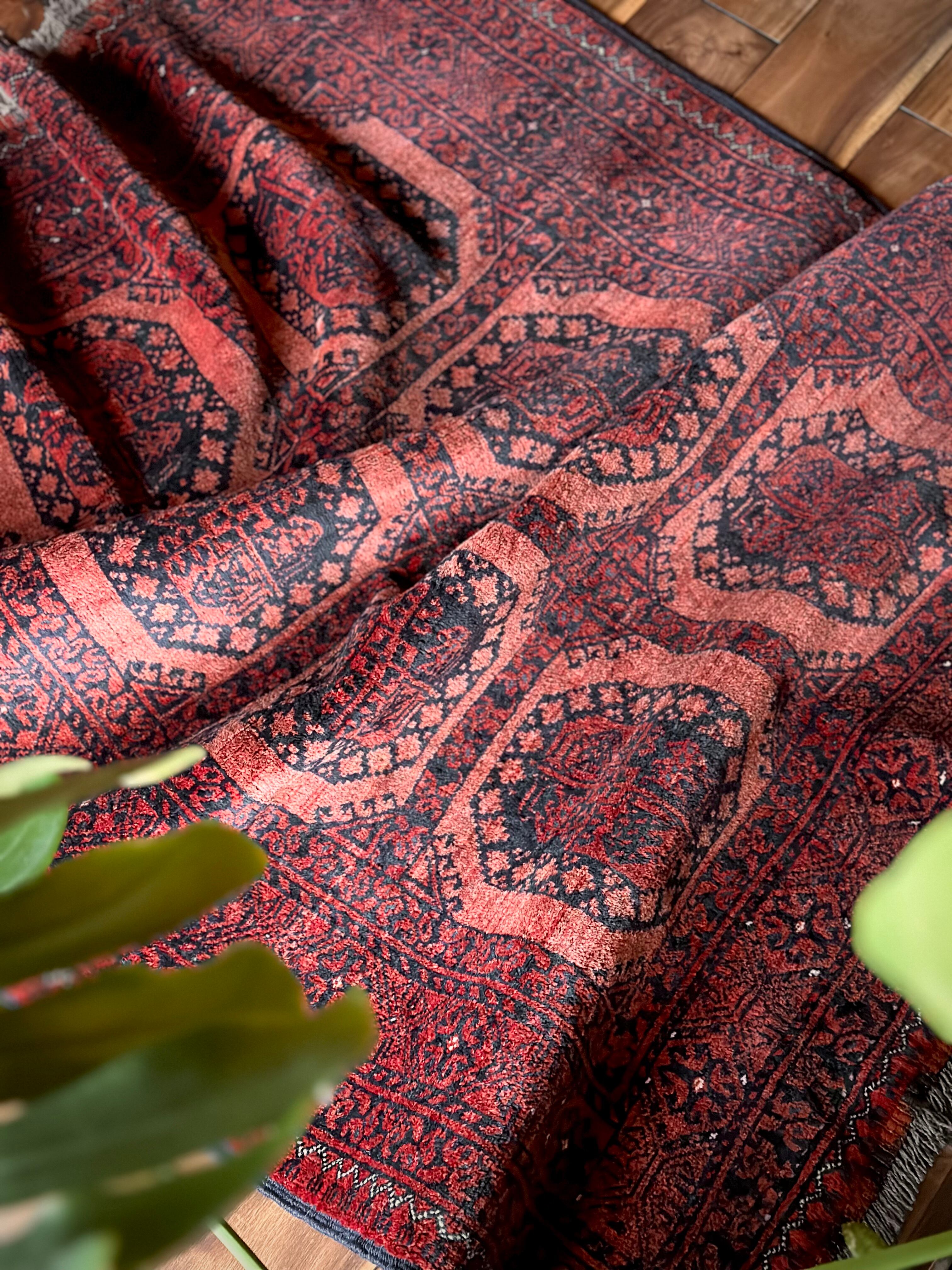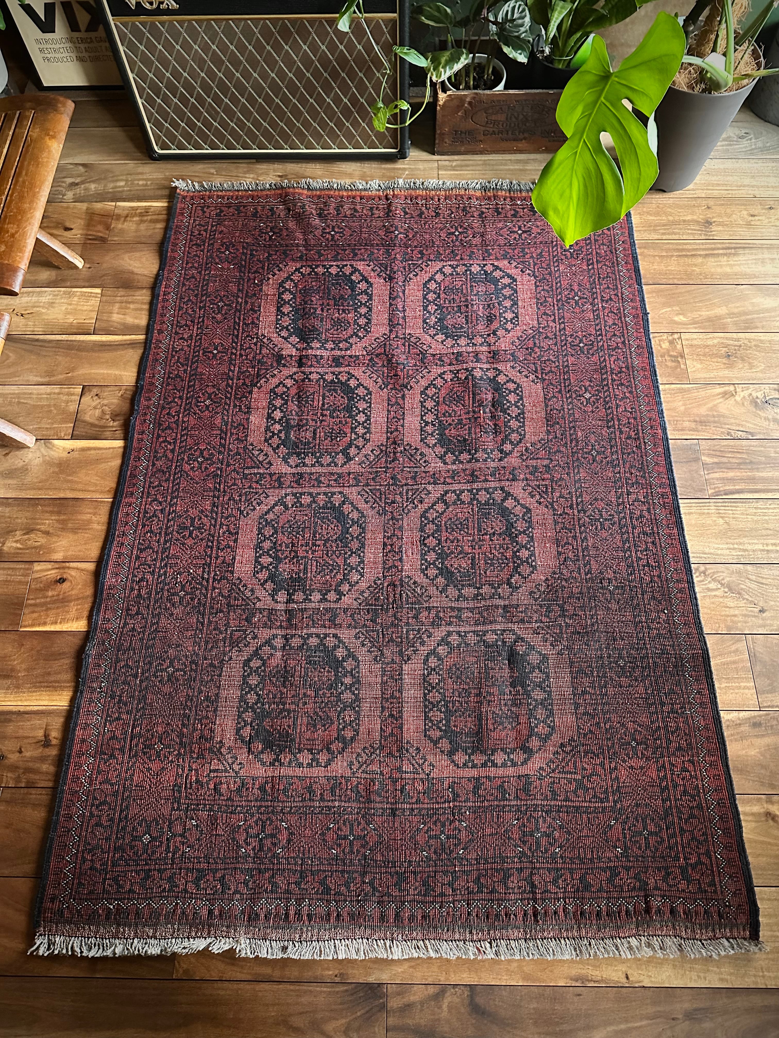 色褪せた濃淡のある赤色の使い方で色彩が変わってしまうインパクトあるこちらは、アフガニスタン北部に居住するトルクメンの支族で、フィルパイと呼ばれる象の足跡のような独特なスレイマン・ギュルがかっこいいエルサリ族のトライバルラグになります。