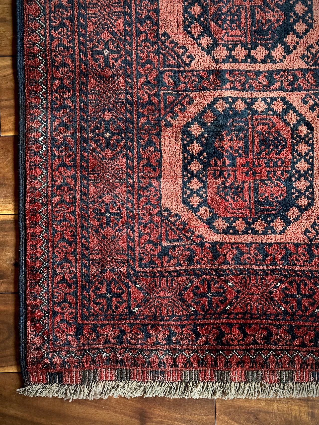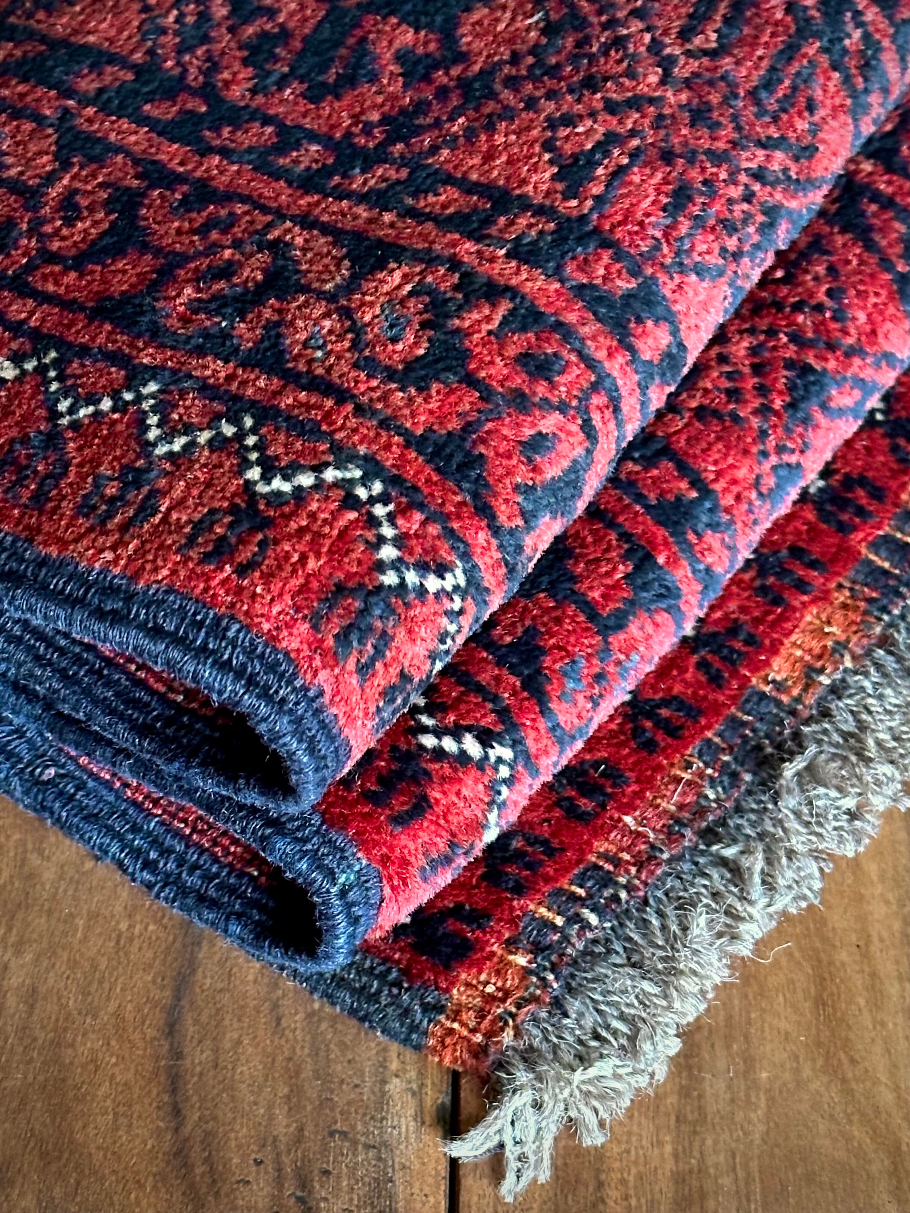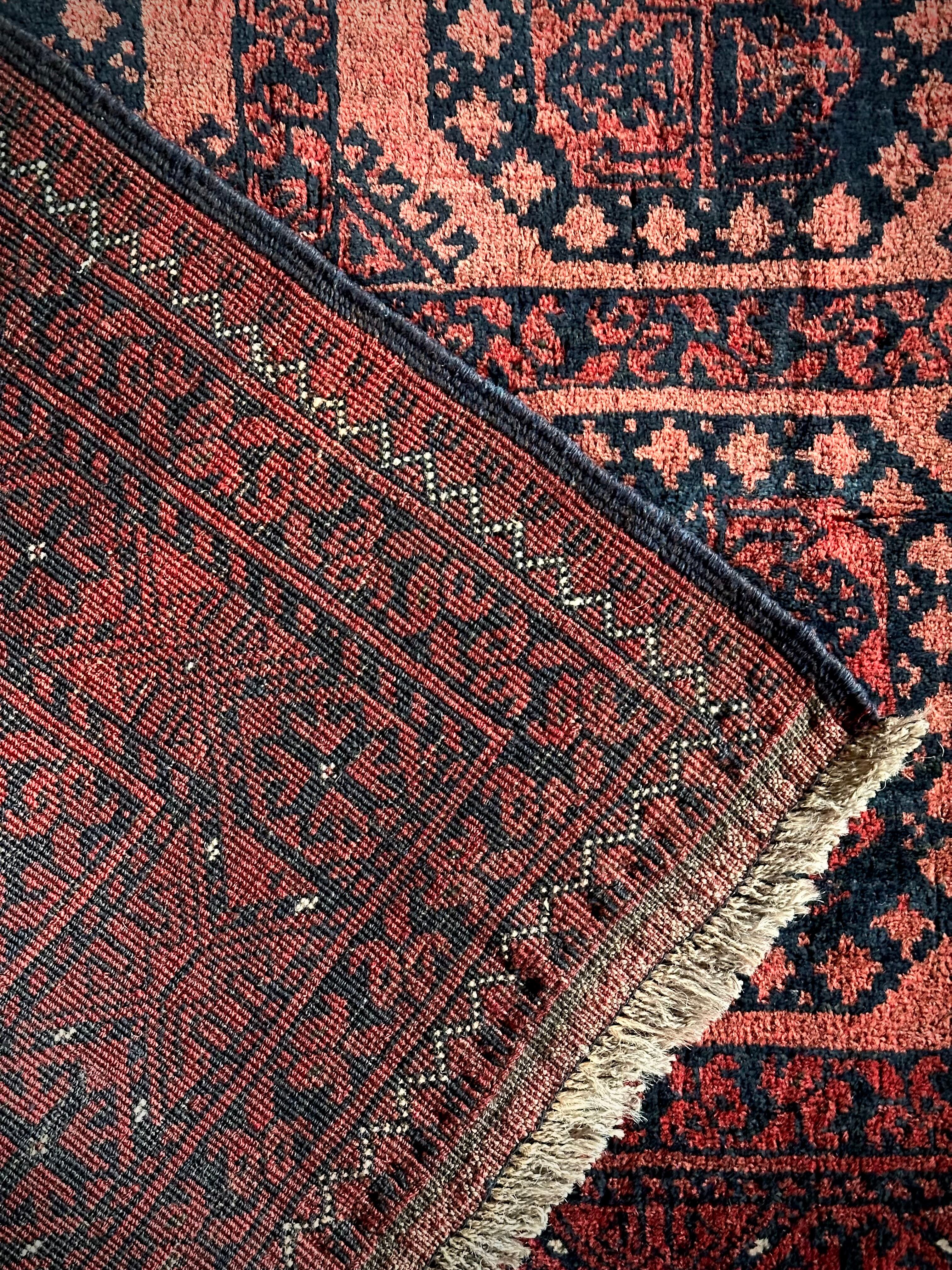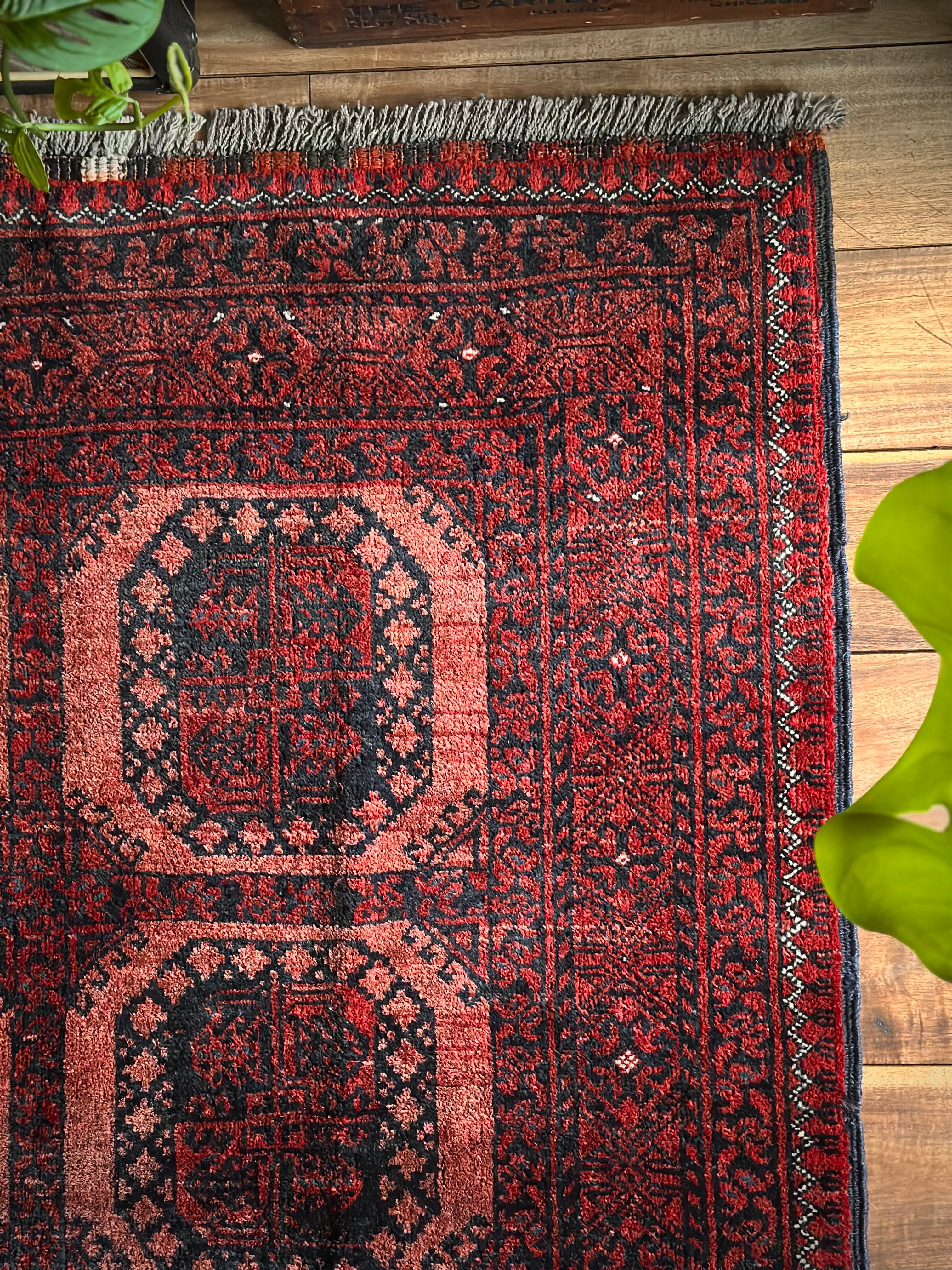 色褪せた濃淡のある赤色の使い方で色彩が変わってしまうインパクトあるこちらは、アフガニスタン北部に居住するトルクメンの支族で、フィルパイと呼ばれる象の足跡のような独特なスレイマン・ギュルがかっこいいエルサリ族のトライバルラグになります。