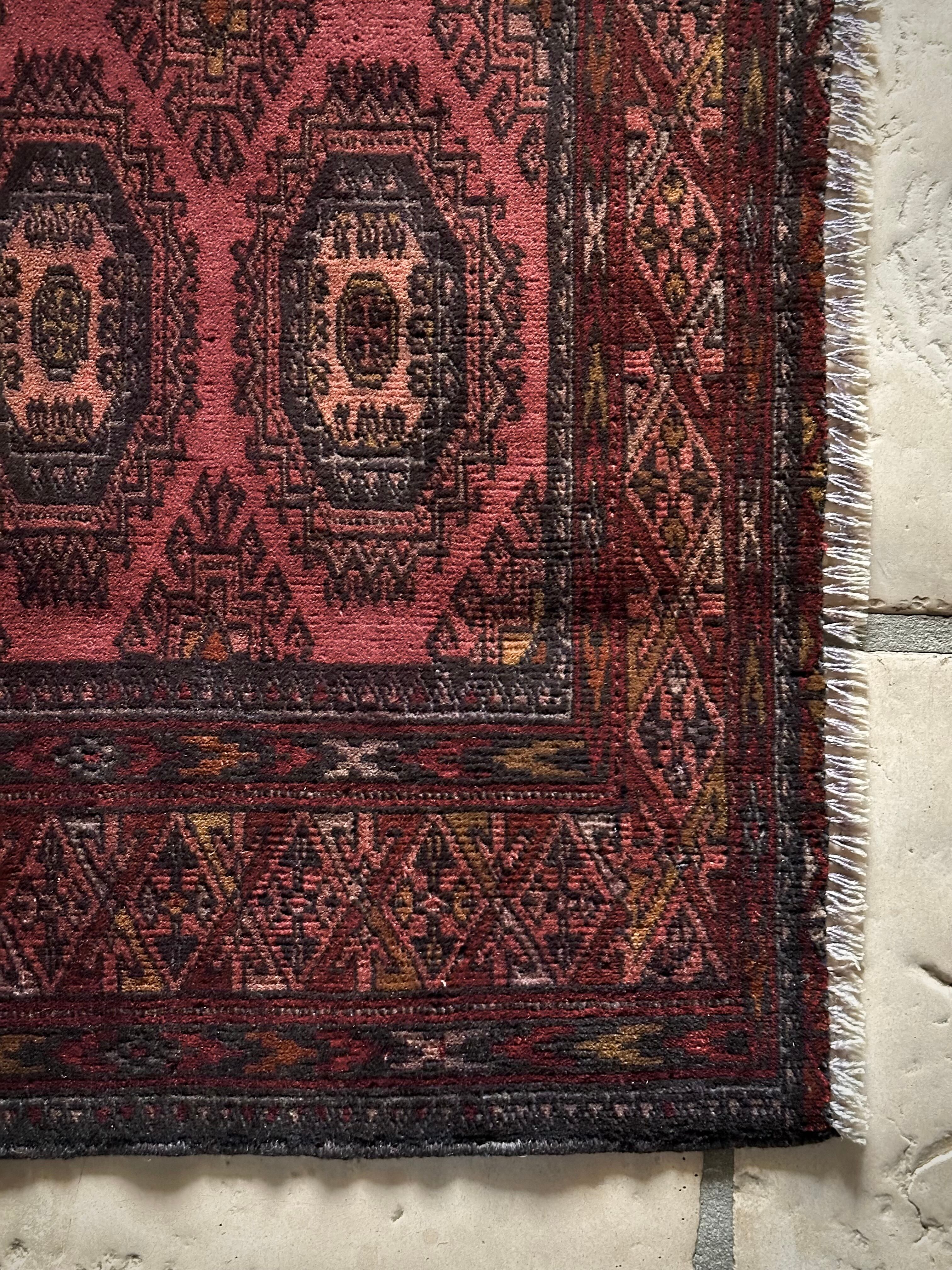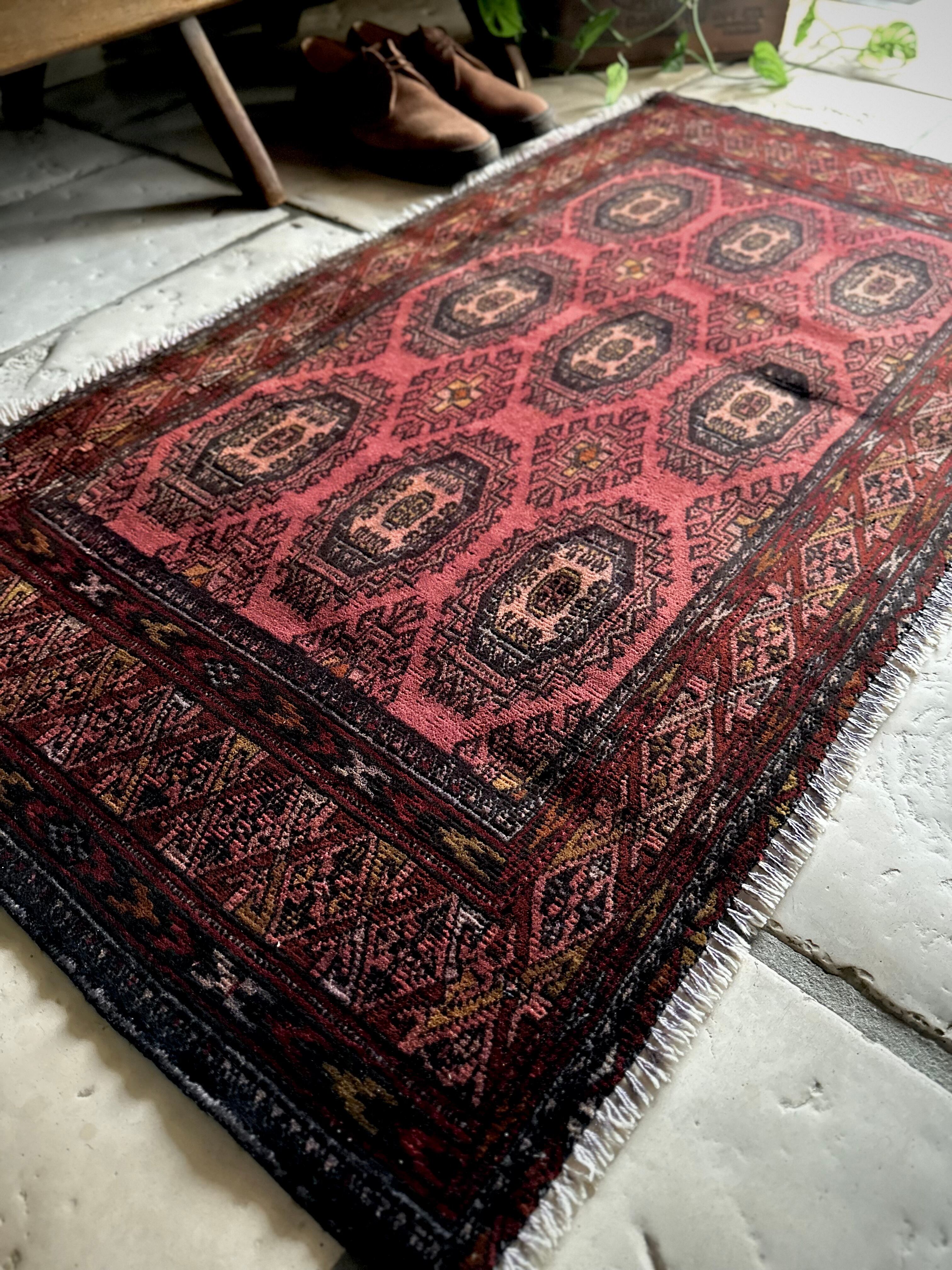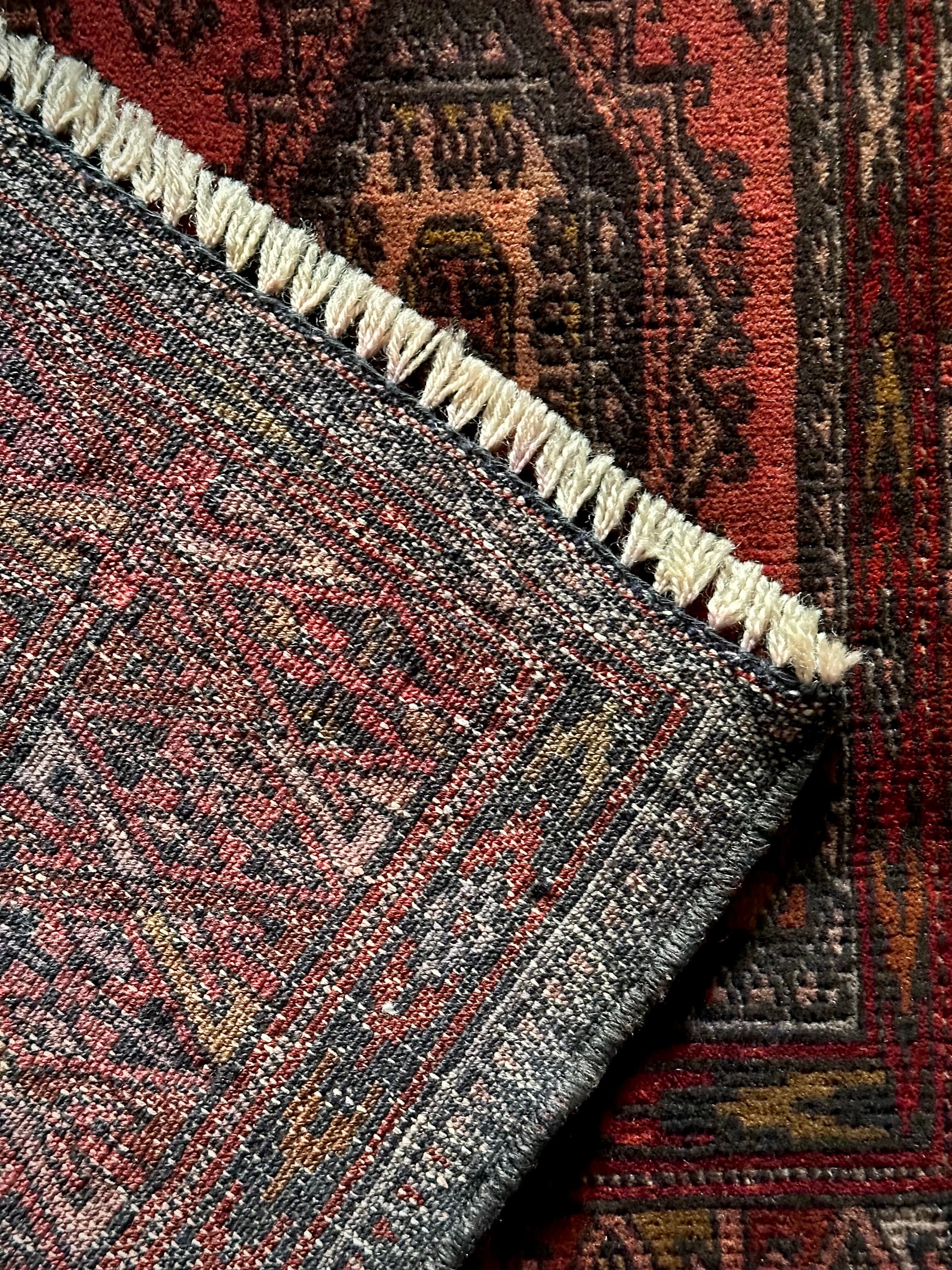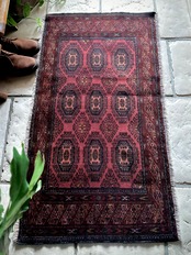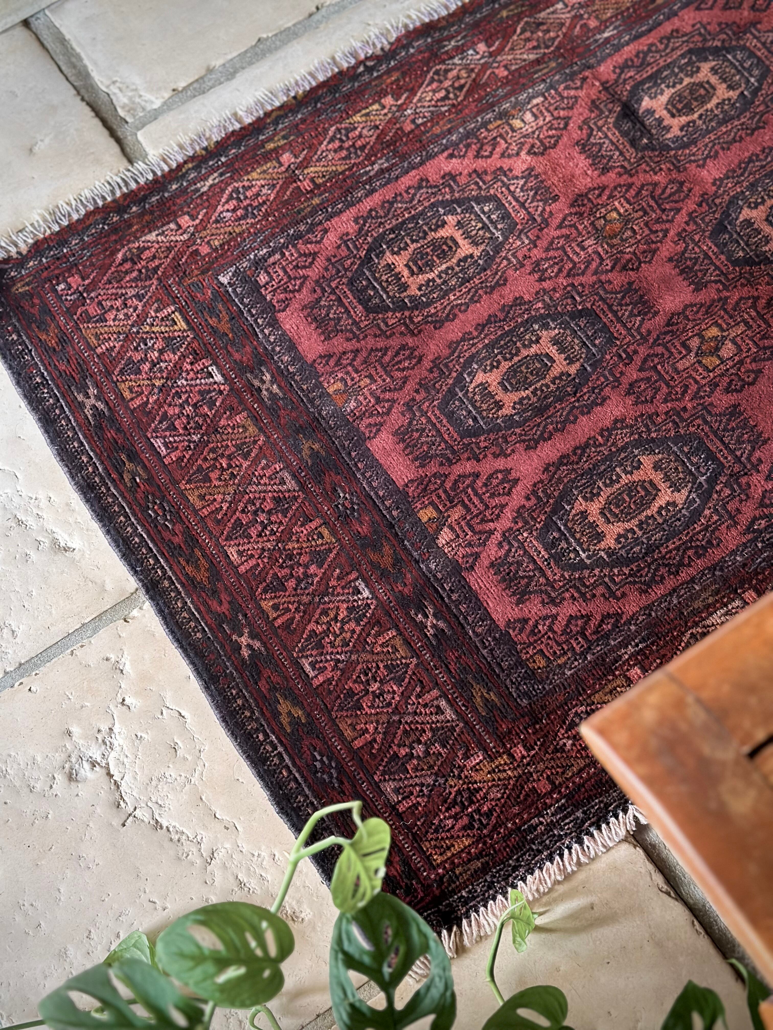 全体的に暗めのバーガンディに女性の装飾具をモチーフにしたサロールギュルの連続紋様があしらわれたこちらは、アフガニスタンはヘラート州に居住するバルーチ族のトライバルラグになります。