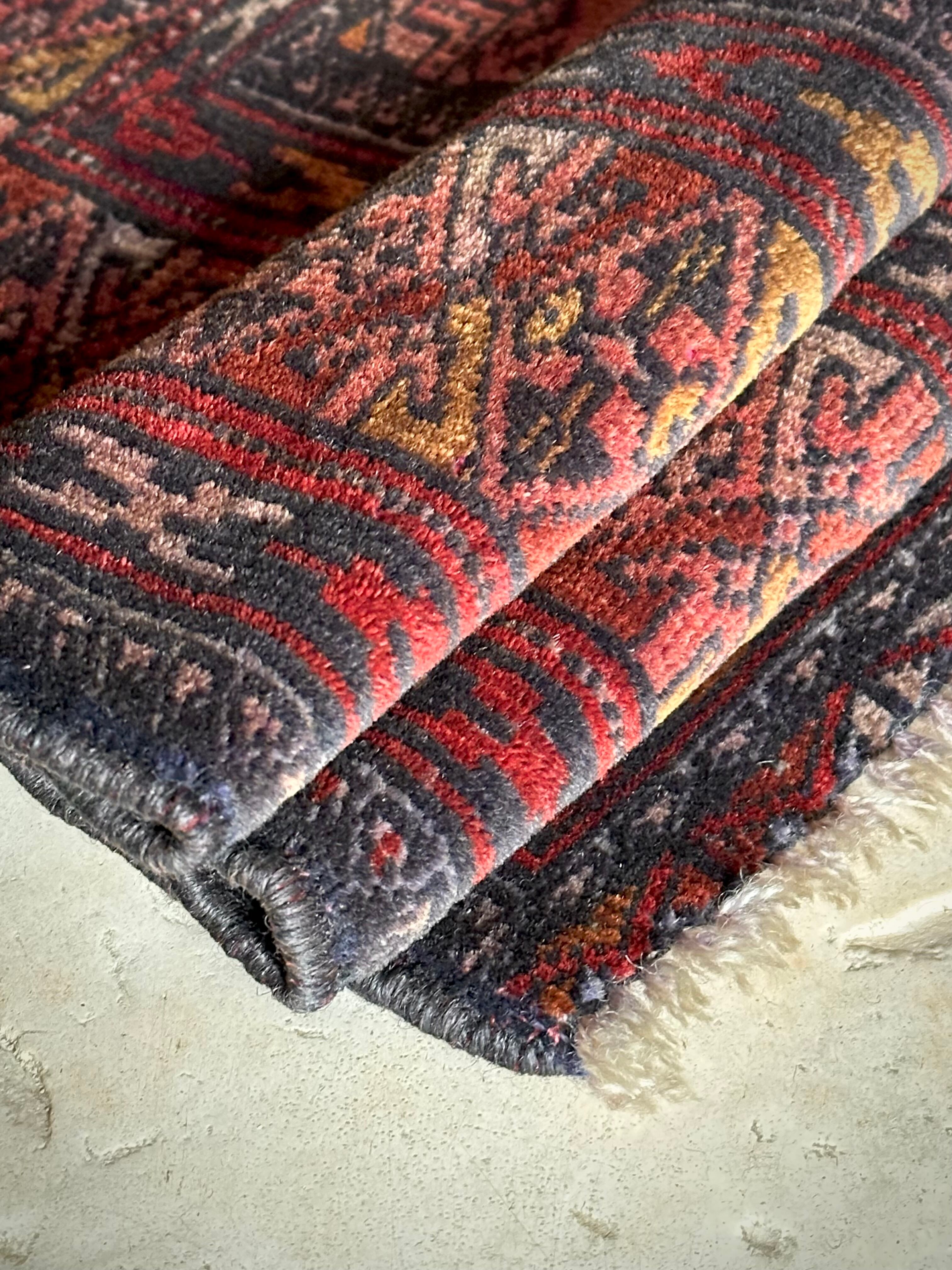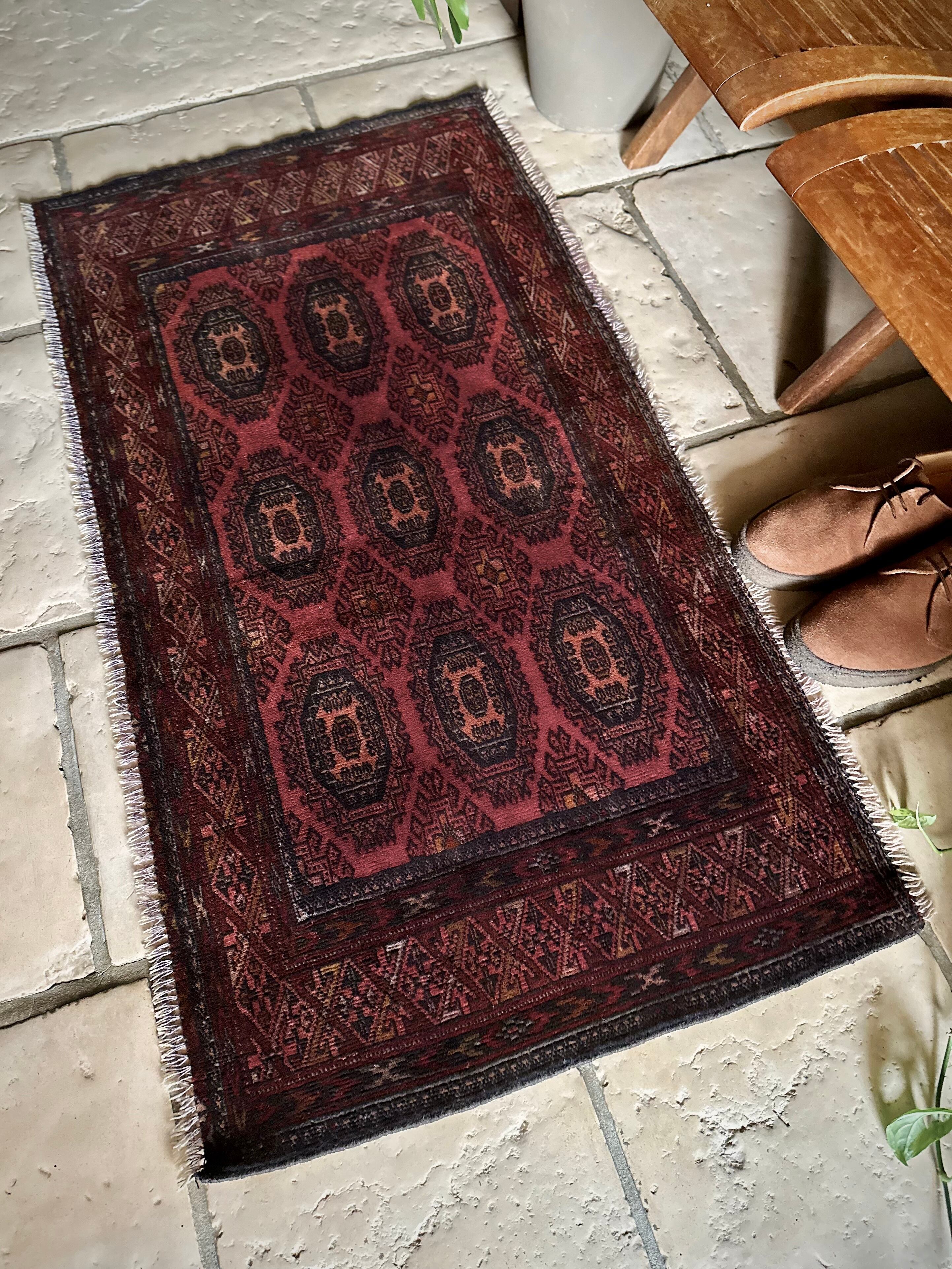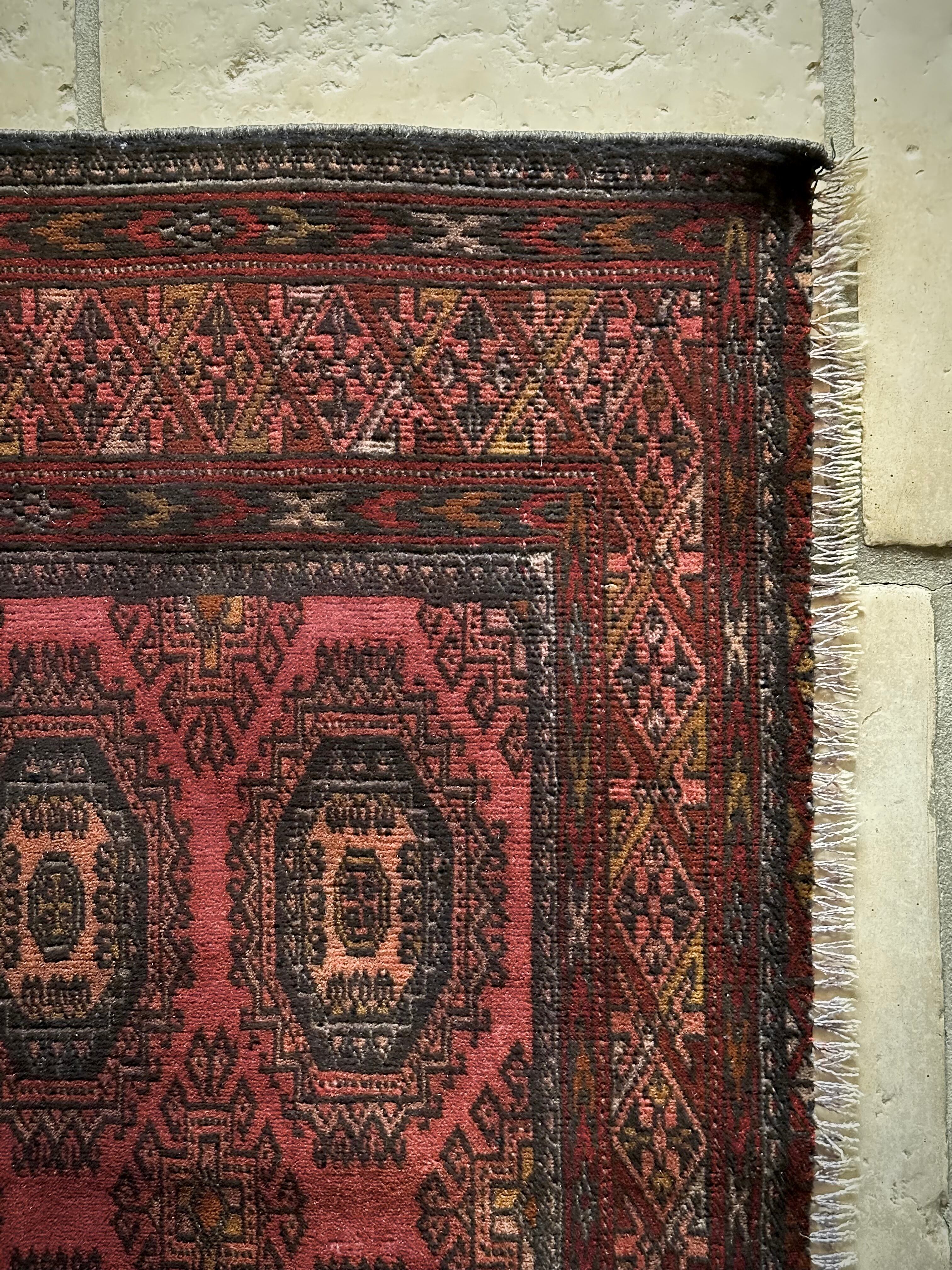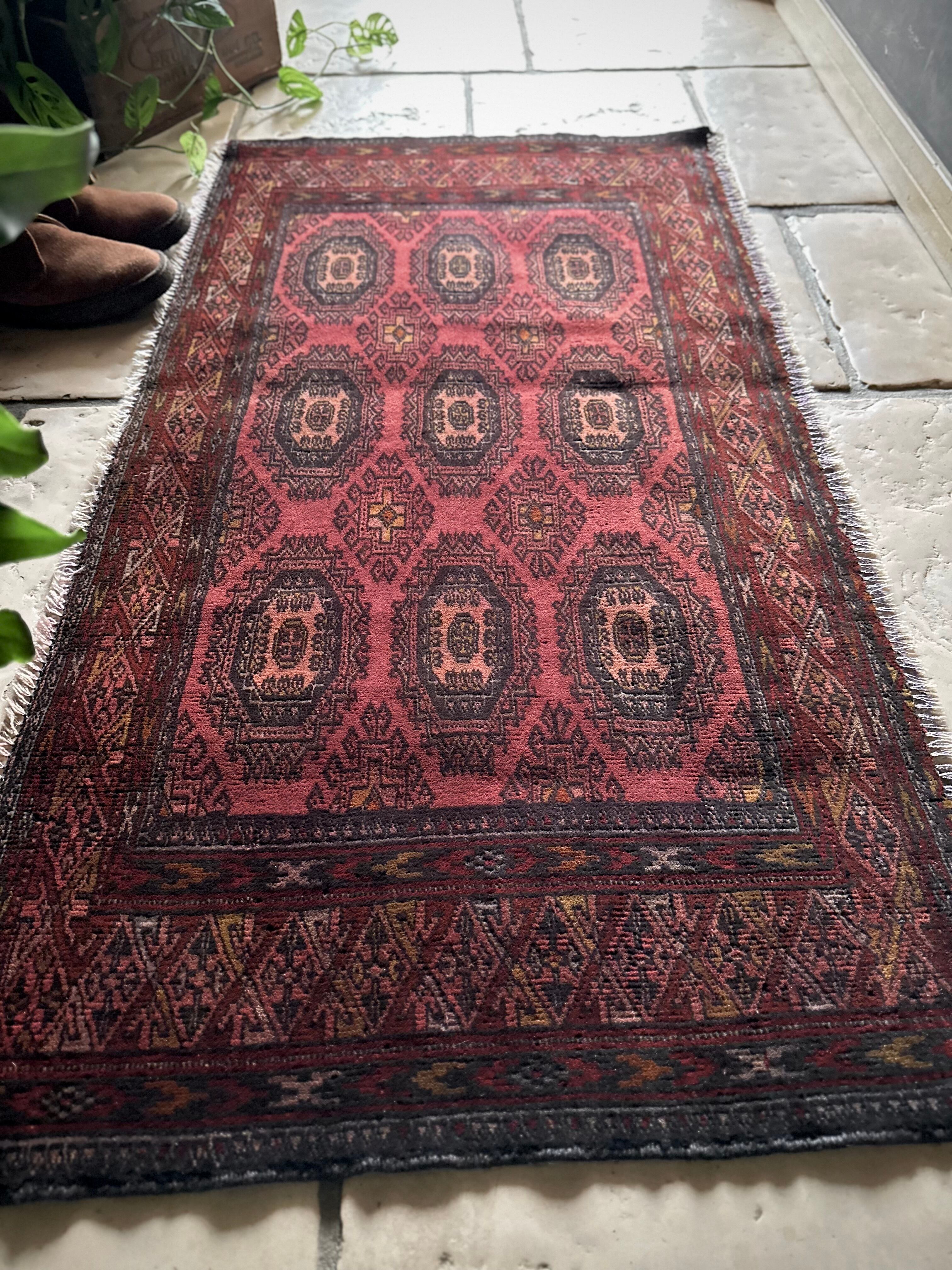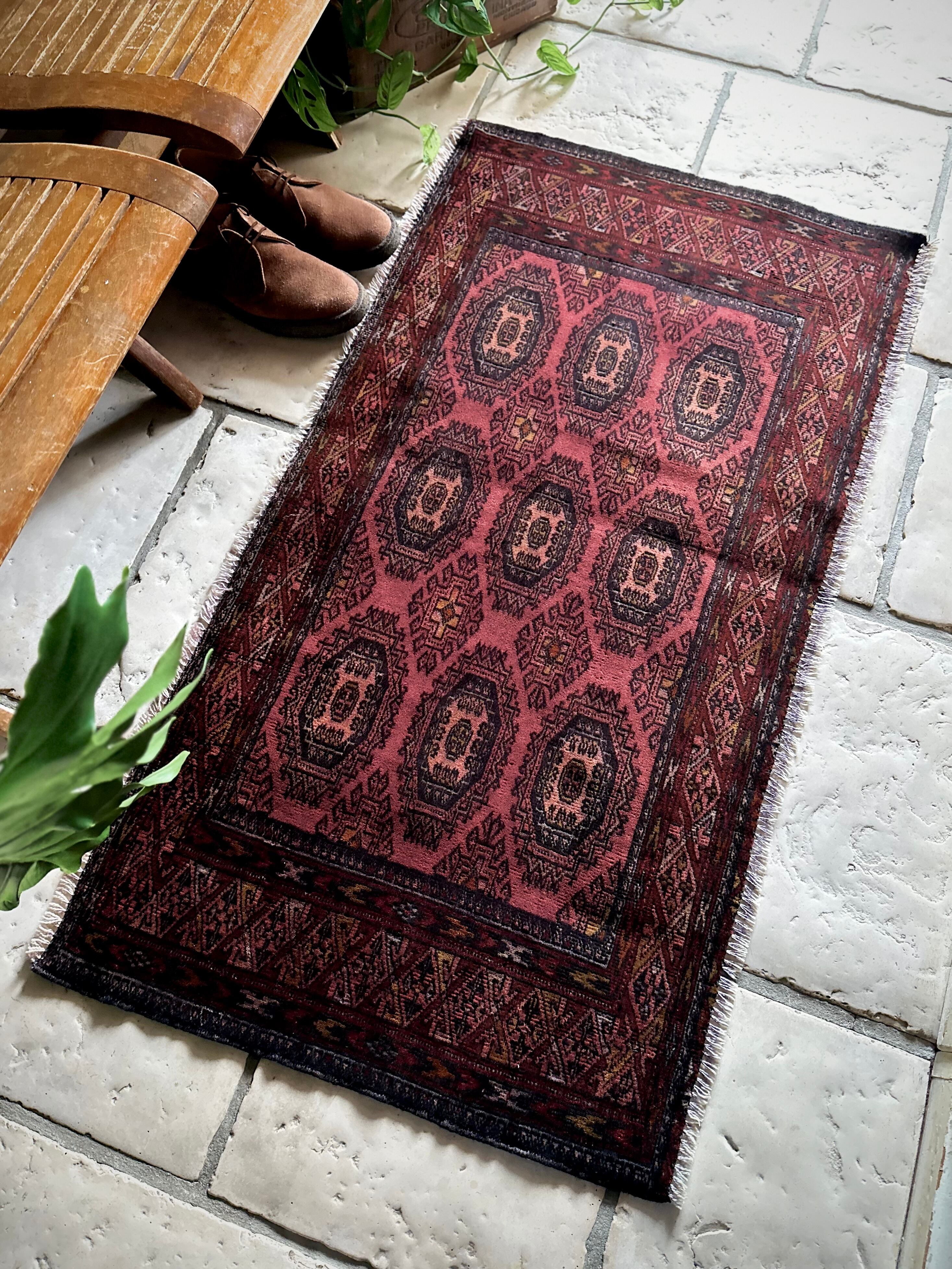 全体的に暗めのバーガンディに女性の装飾具をモチーフにしたサロールギュルの連続紋様があしらわれたこちらは、アフガニスタンはヘラート州に居住するバルーチ族のトライバルラグになります。