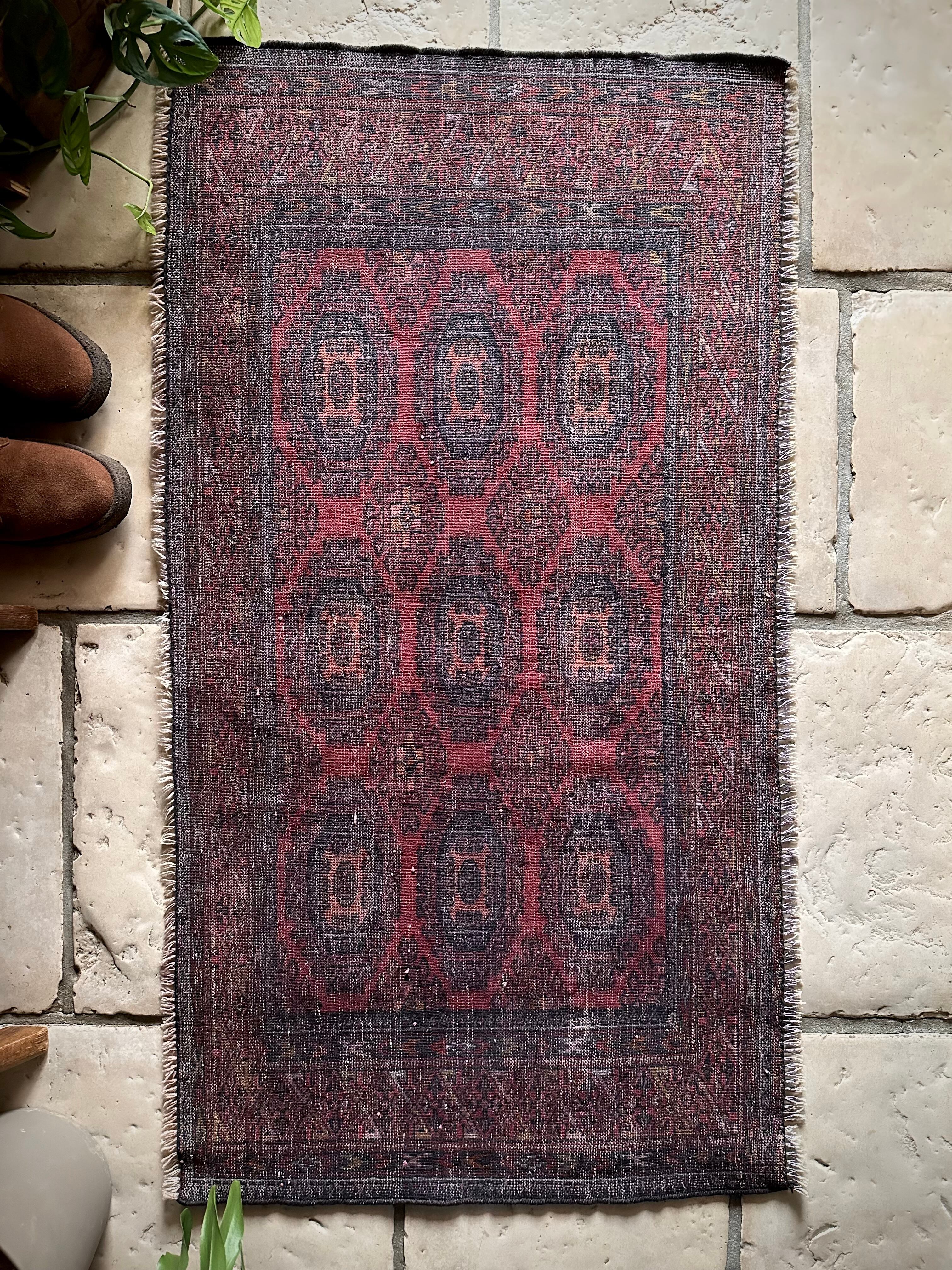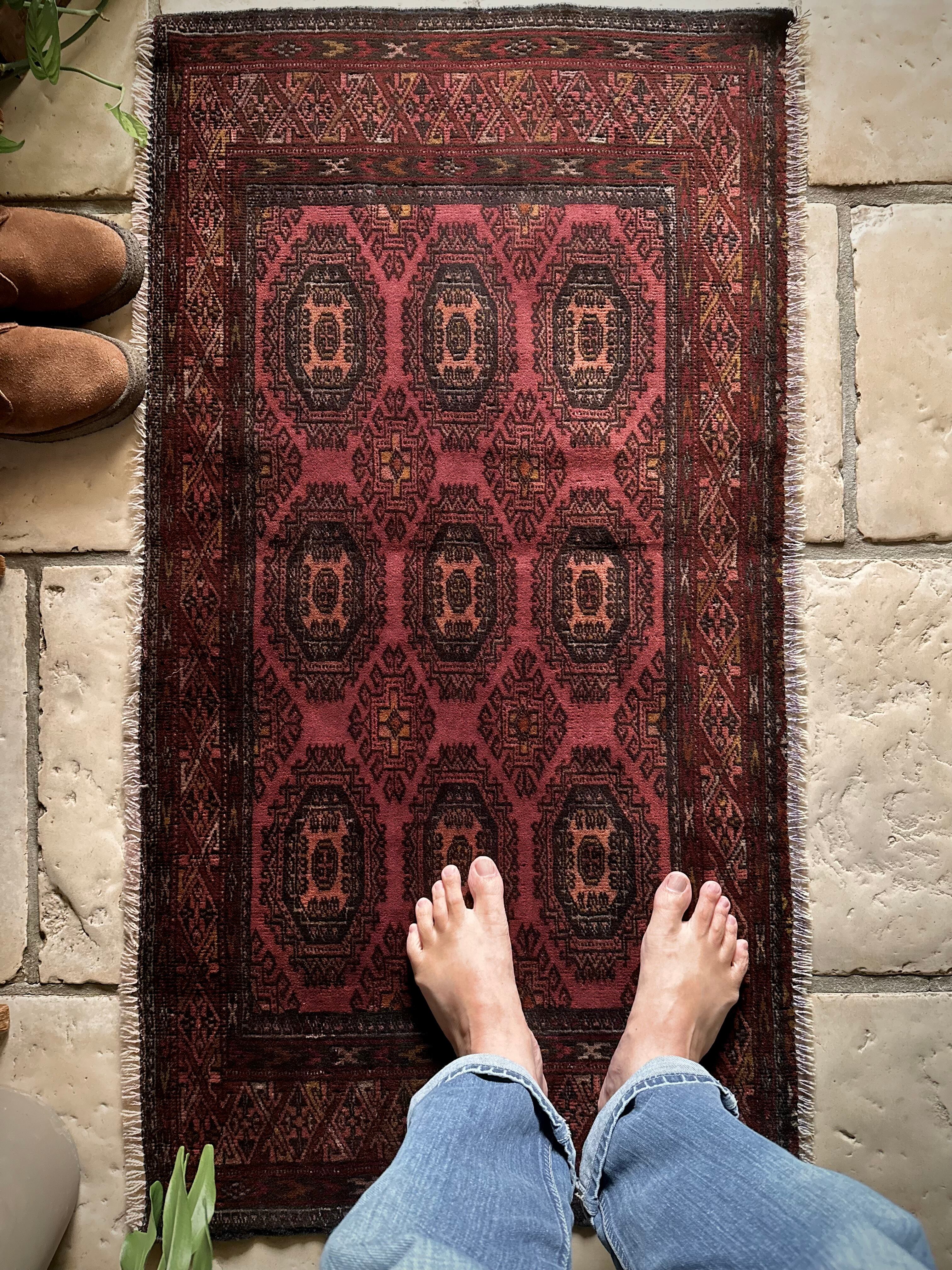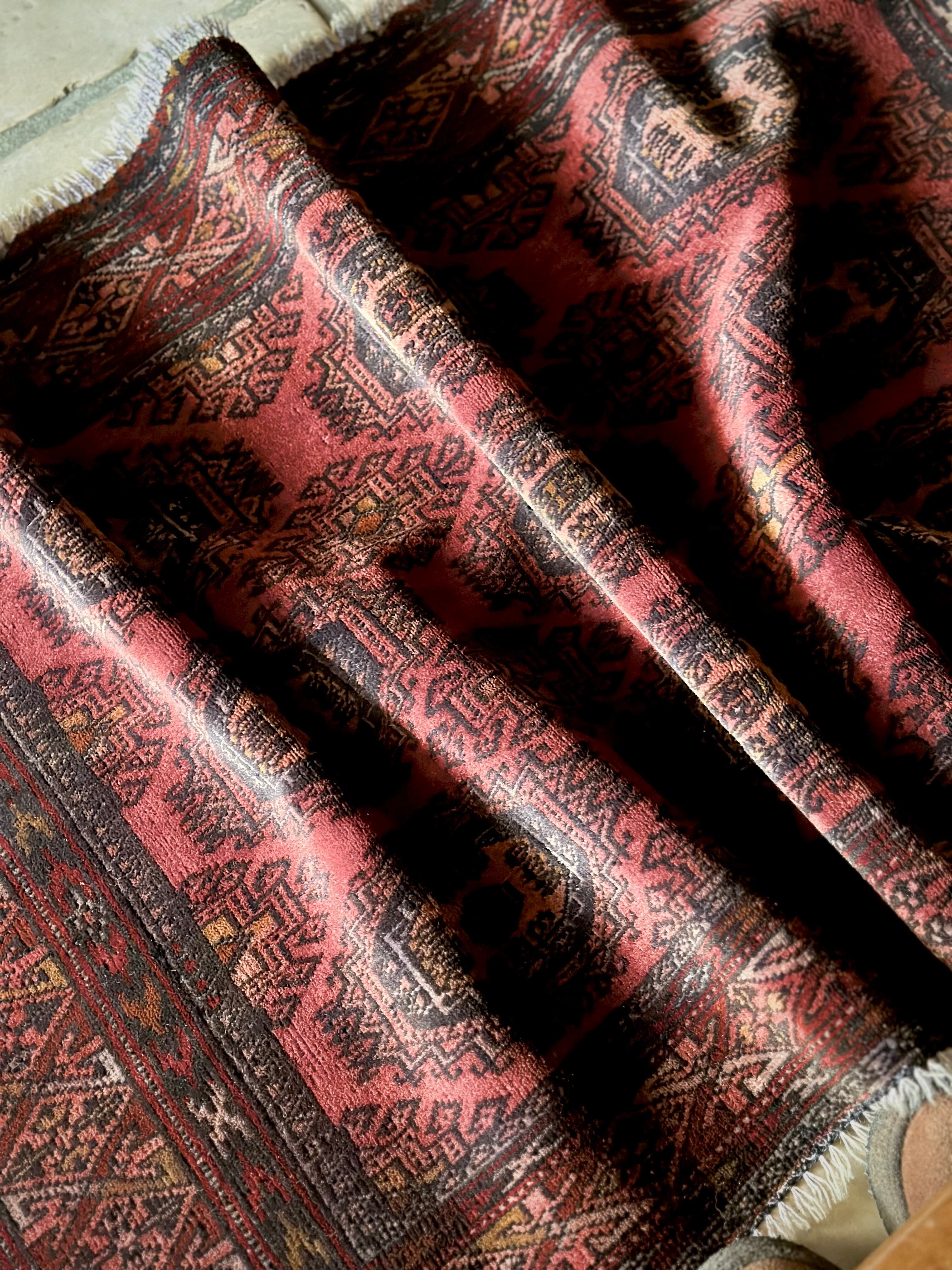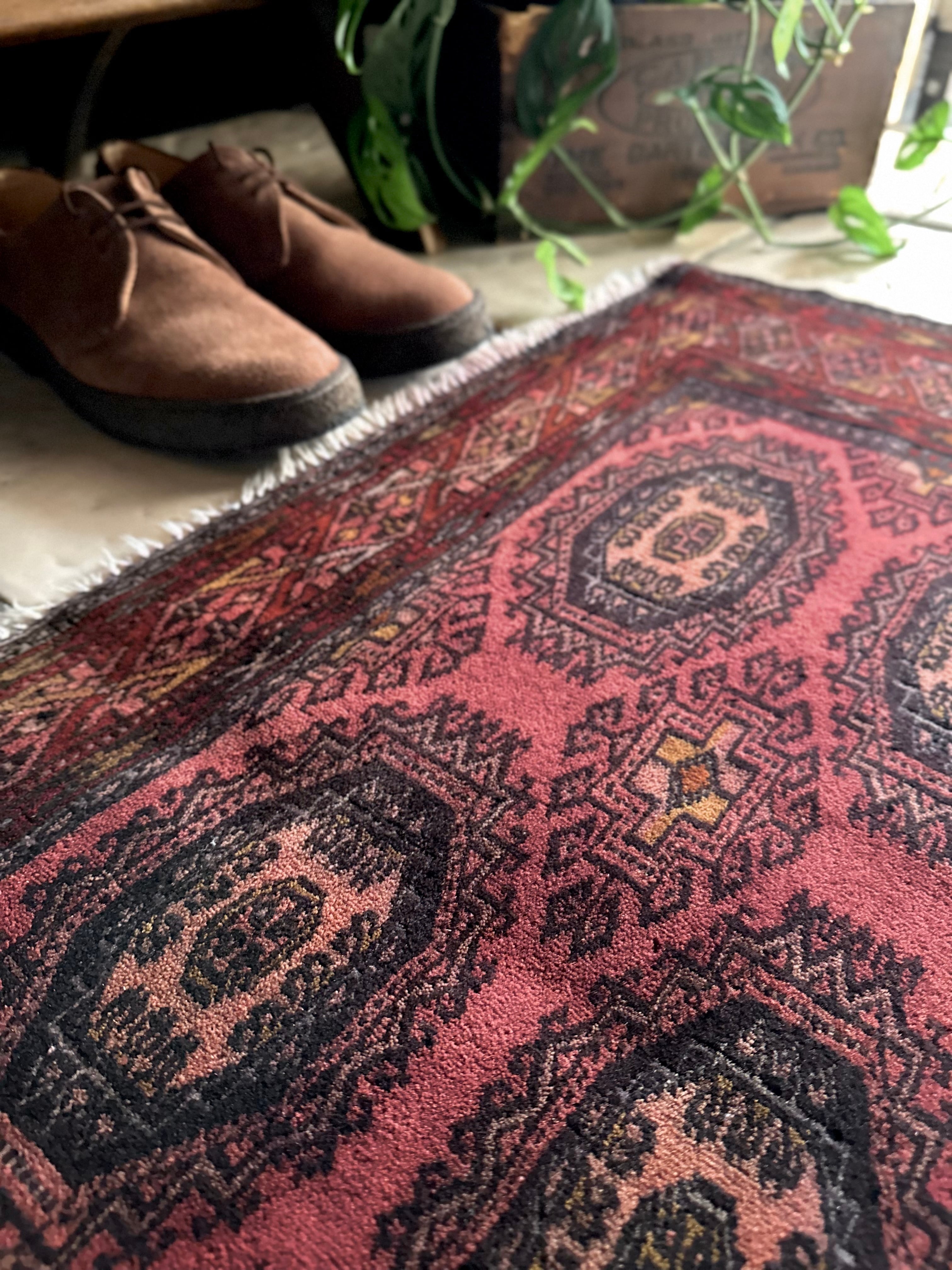 全体的に暗めのバーガンディに女性の装飾具をモチーフにしたサロールギュルの連続紋様があしらわれたこちらは、アフガニスタンはヘラート州に居住するバルーチ族のトライバルラグになります。
