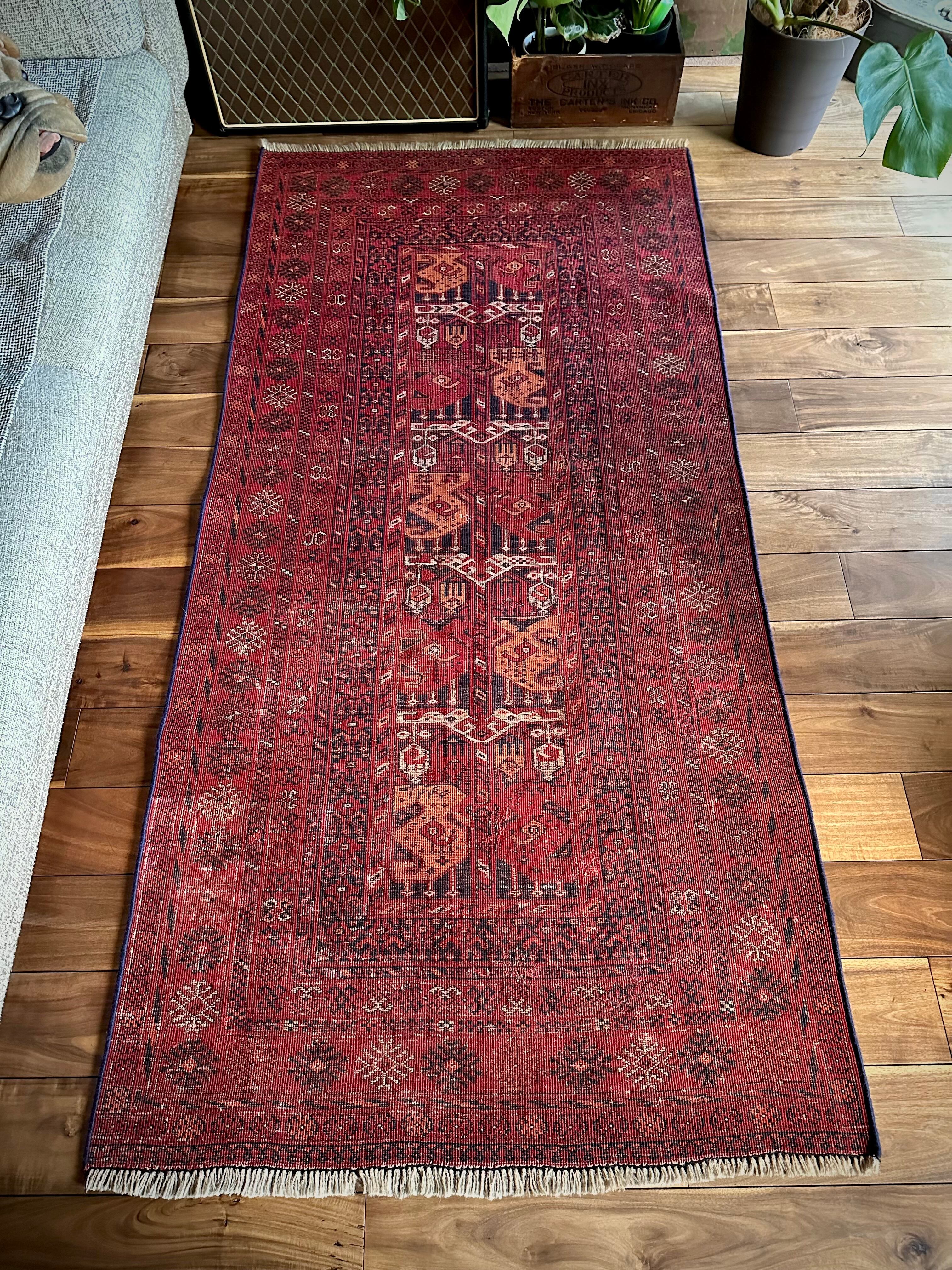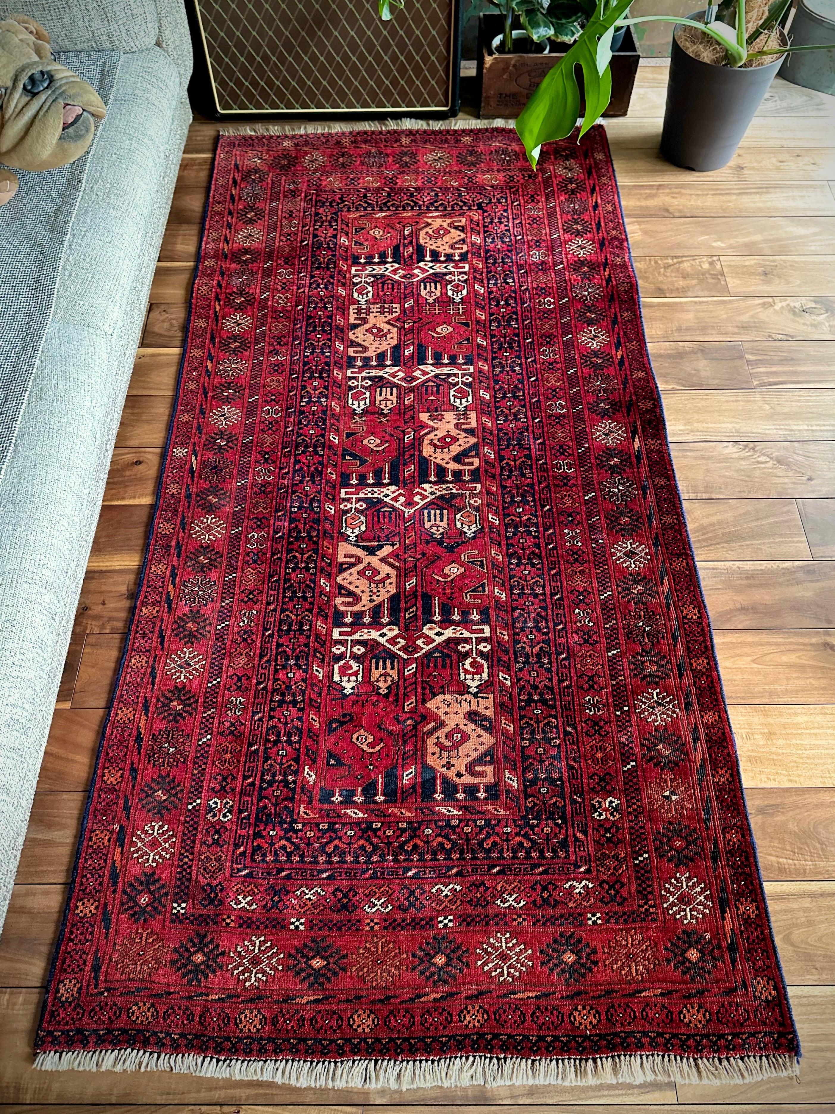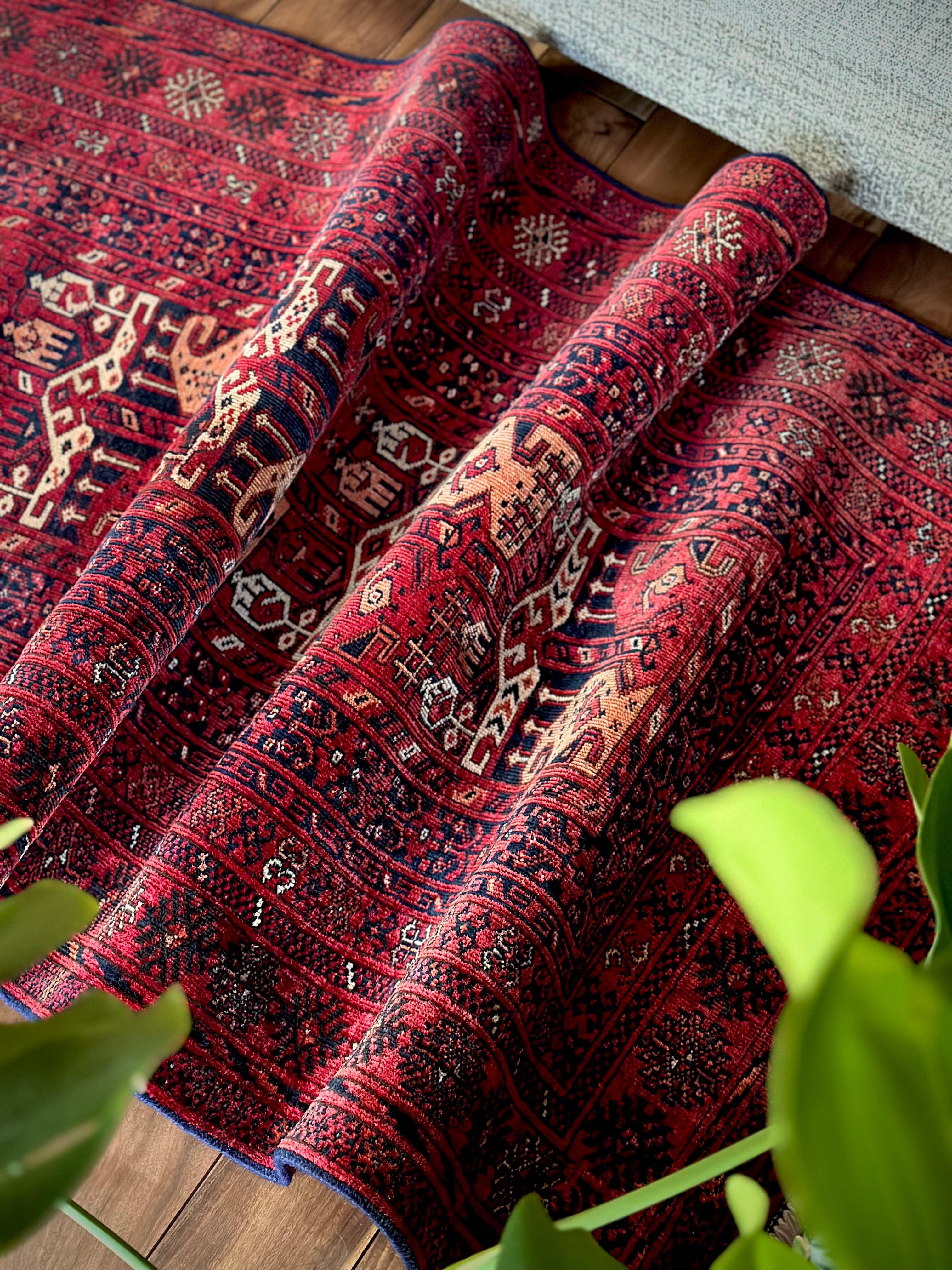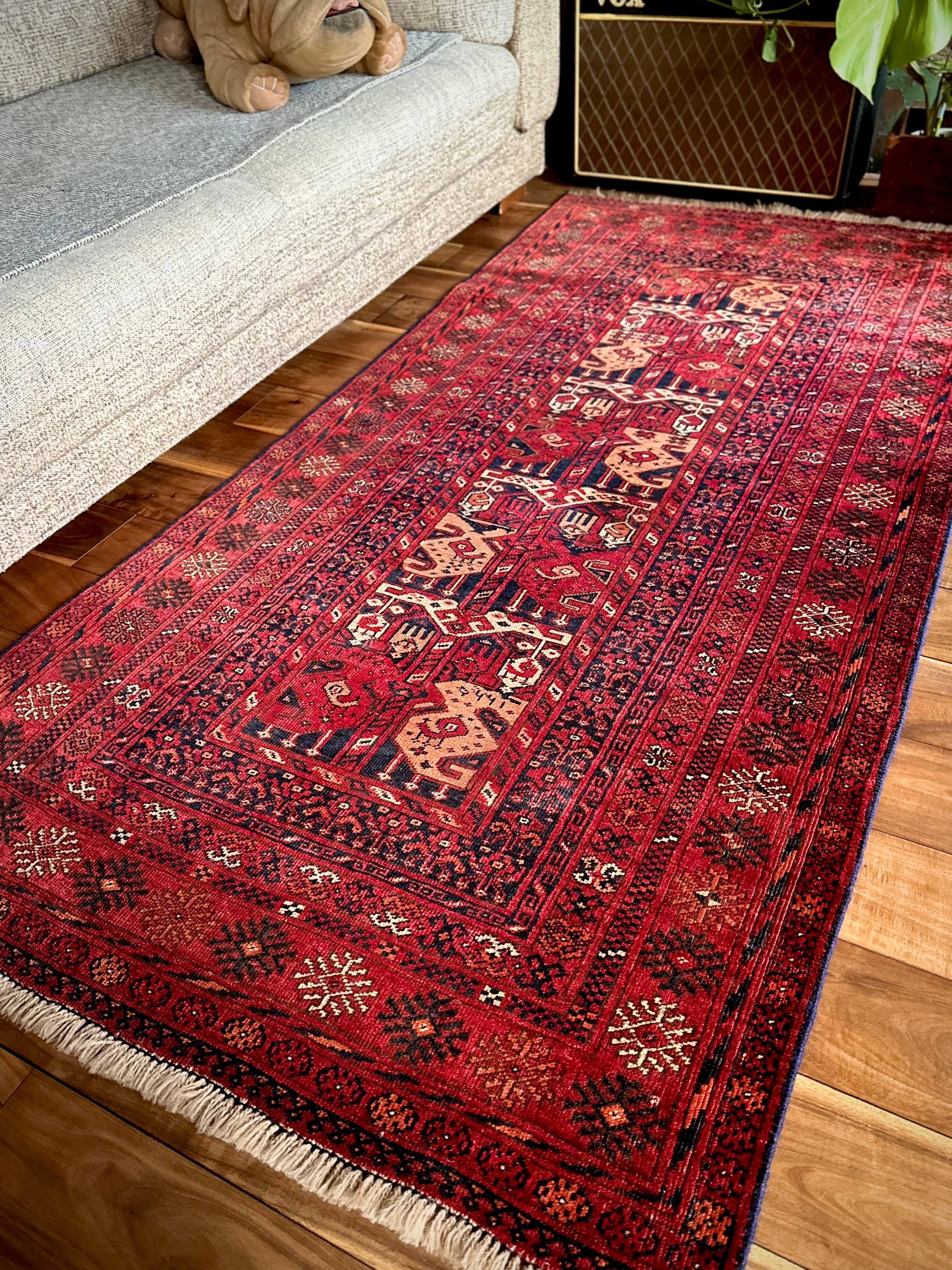 かなり深みのある真紅なレッドが映えるこちらは、アフガニスタン北部に居住するトルクメン族のトライバルラグで、かなり使い込まれてヤレた雰囲気がヴィンテージらしいシングル・タイプの1枚になります。