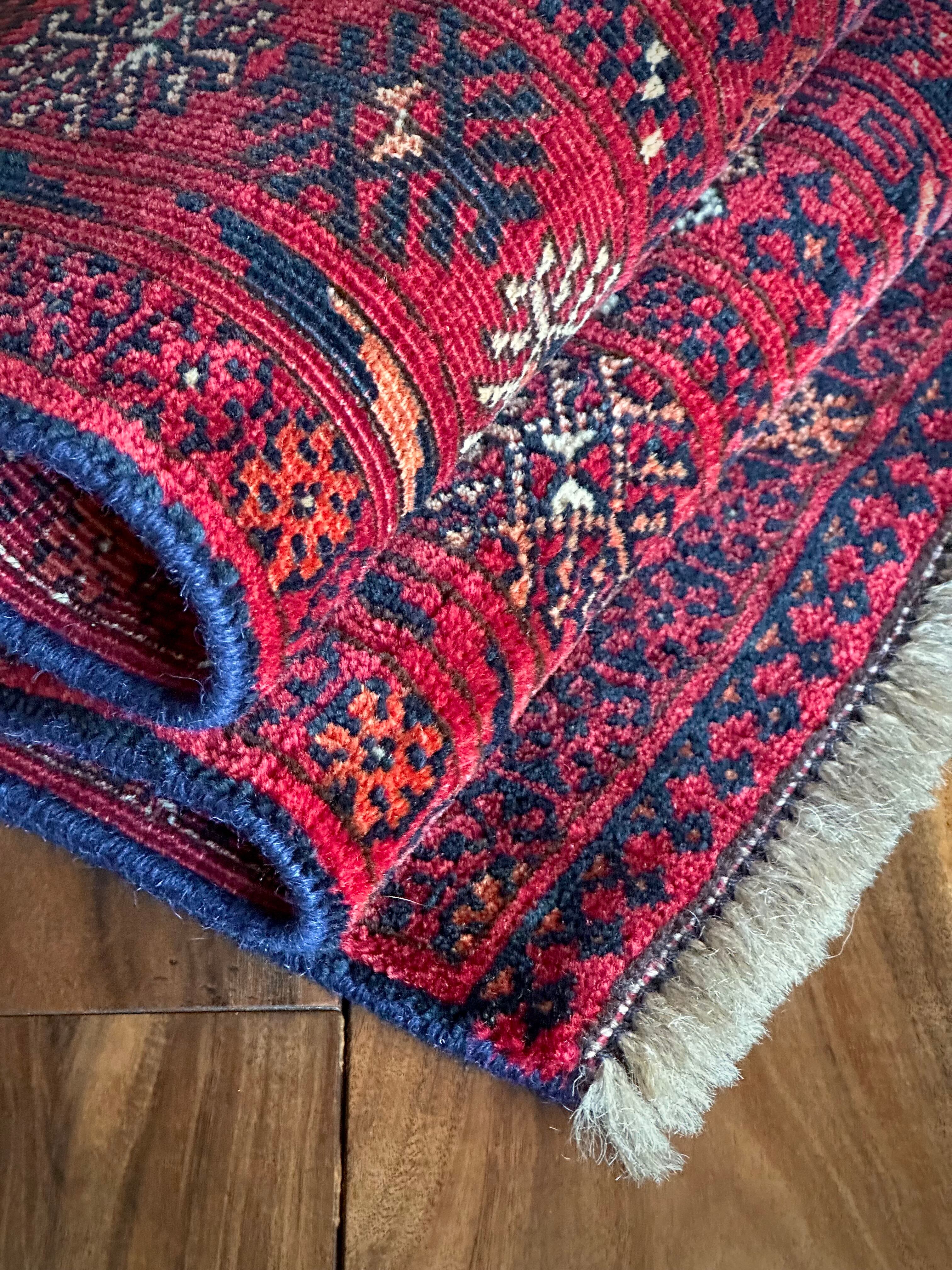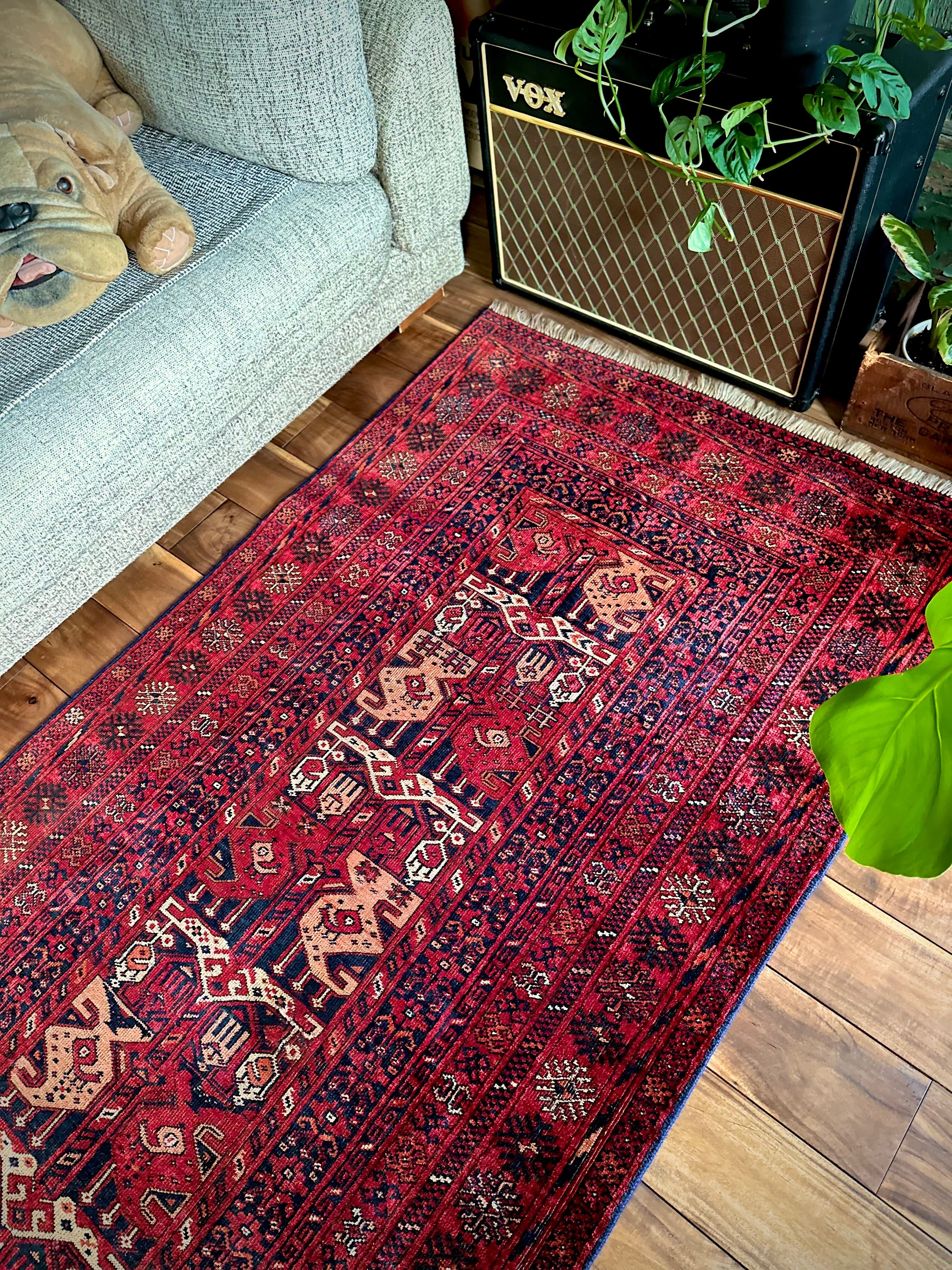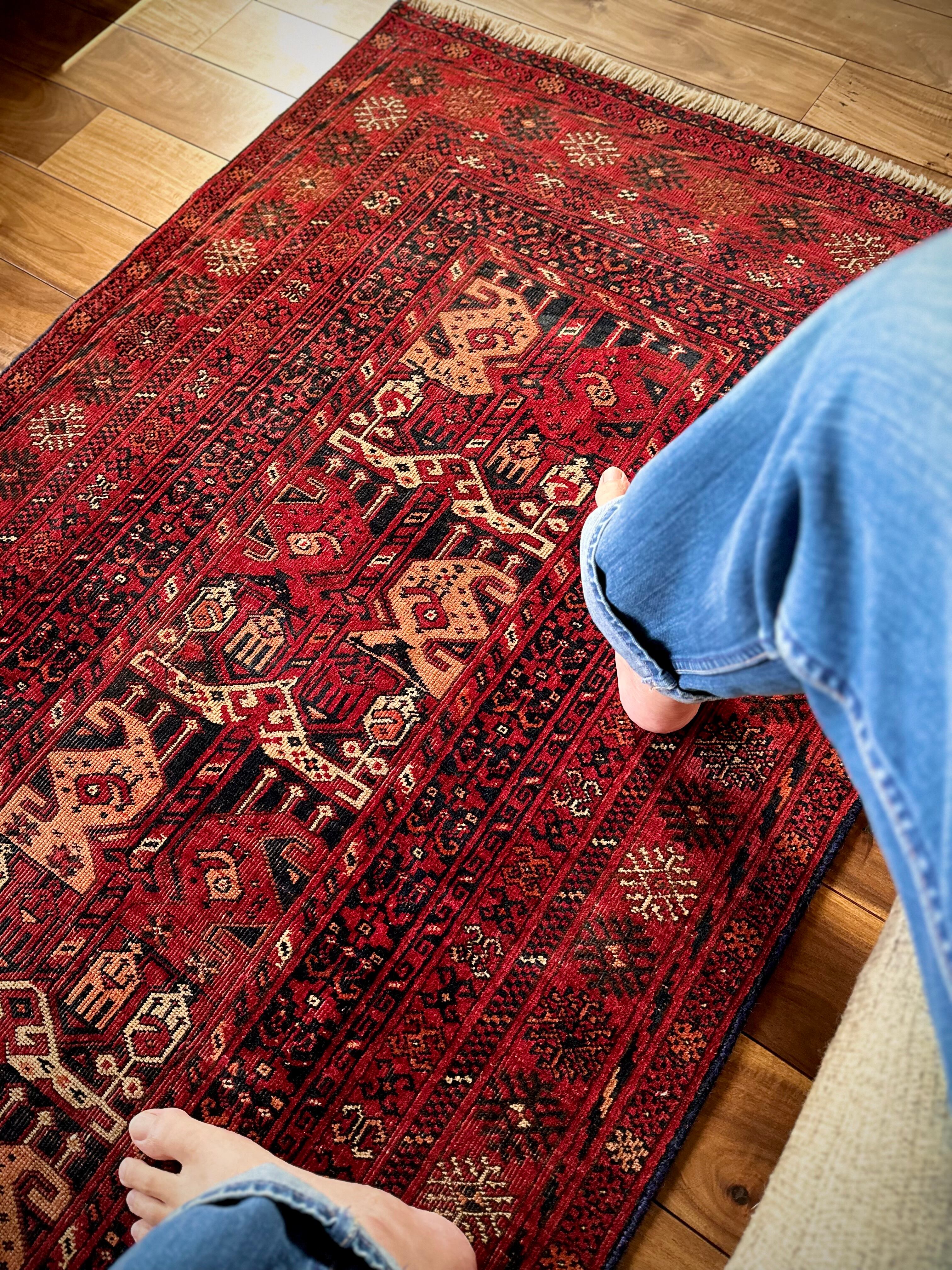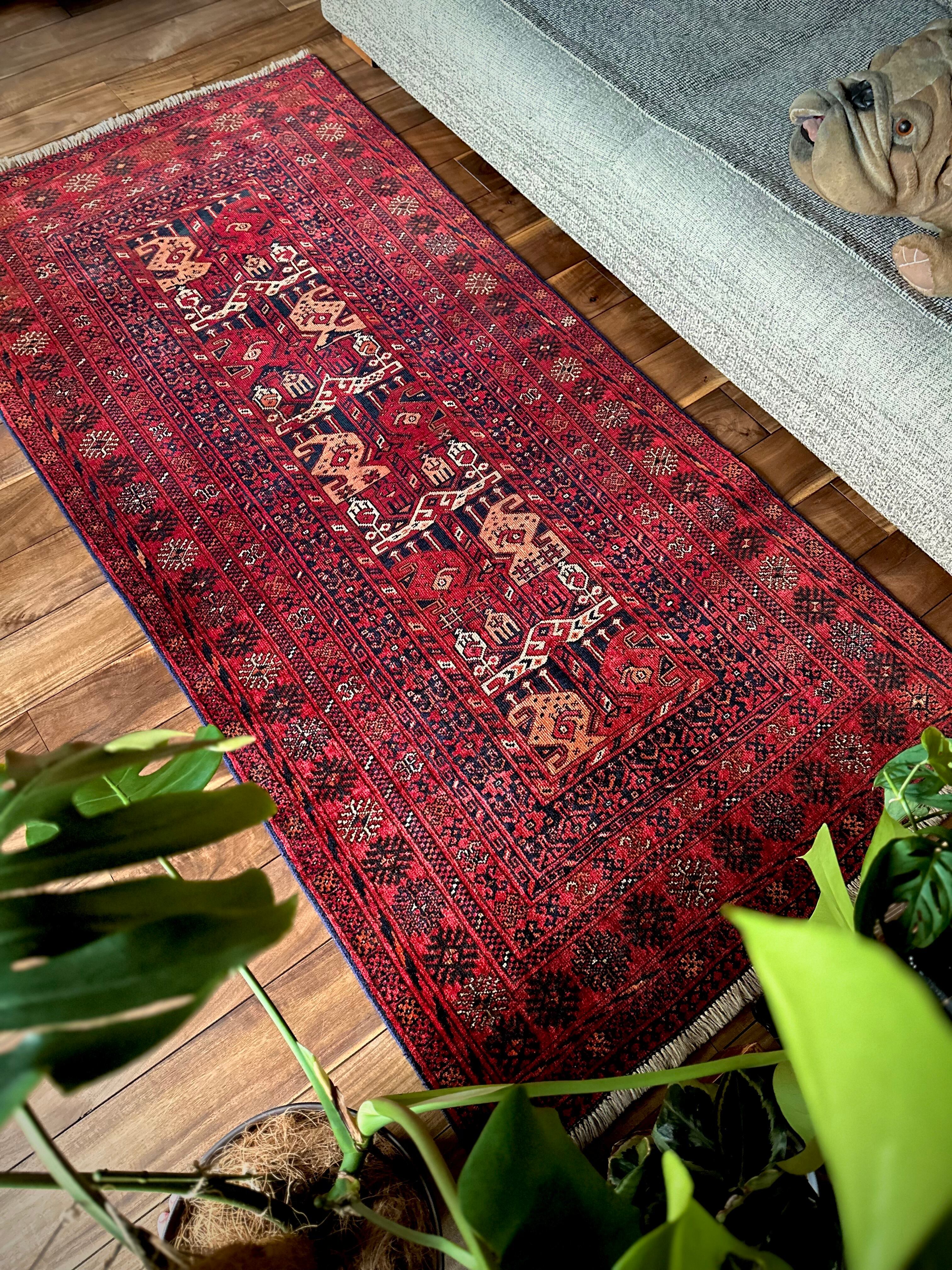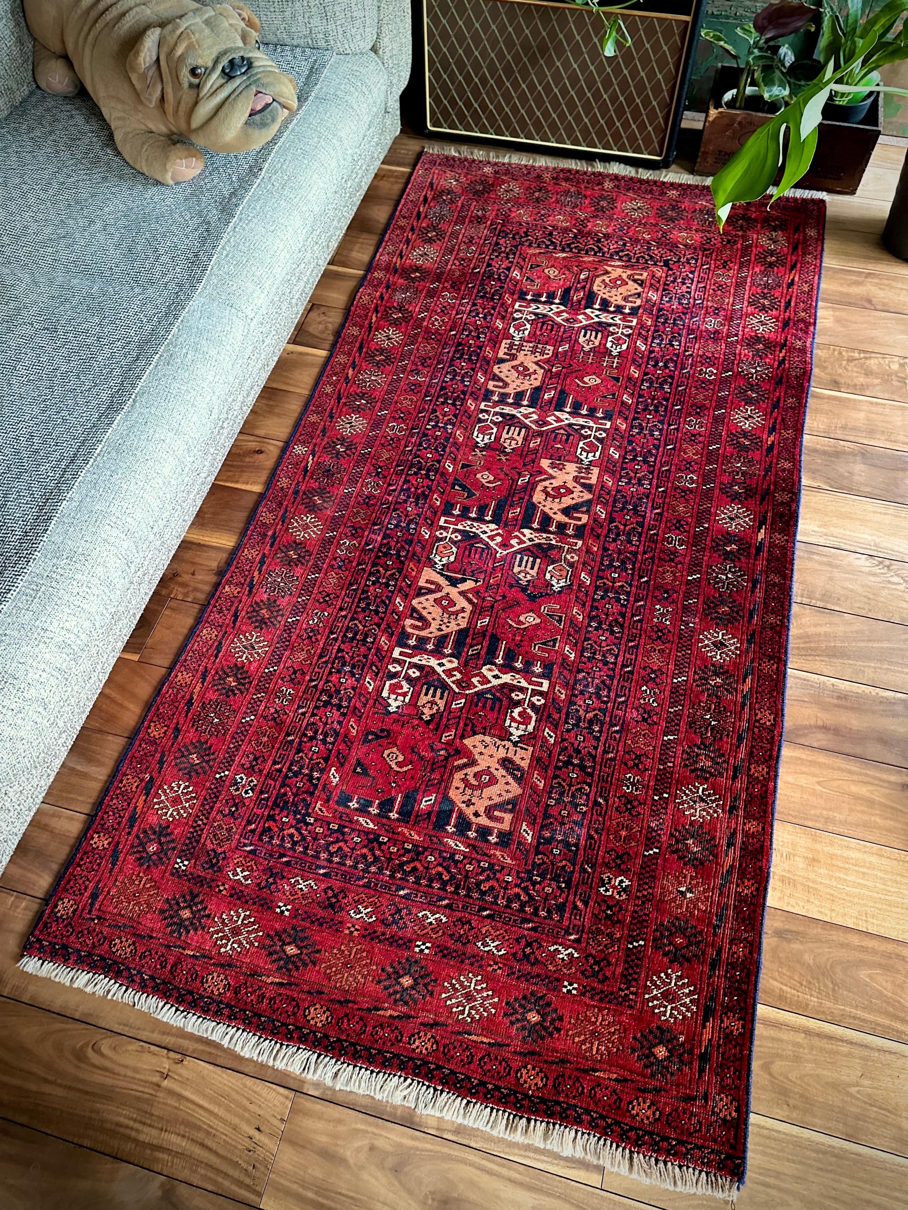 かなり深みのある真紅なレッドが映えるこちらは、アフガニスタン北部に居住するトルクメン族のトライバルラグで、かなり使い込まれてヤレた雰囲気がヴィンテージらしいシングル・タイプの1枚になります。