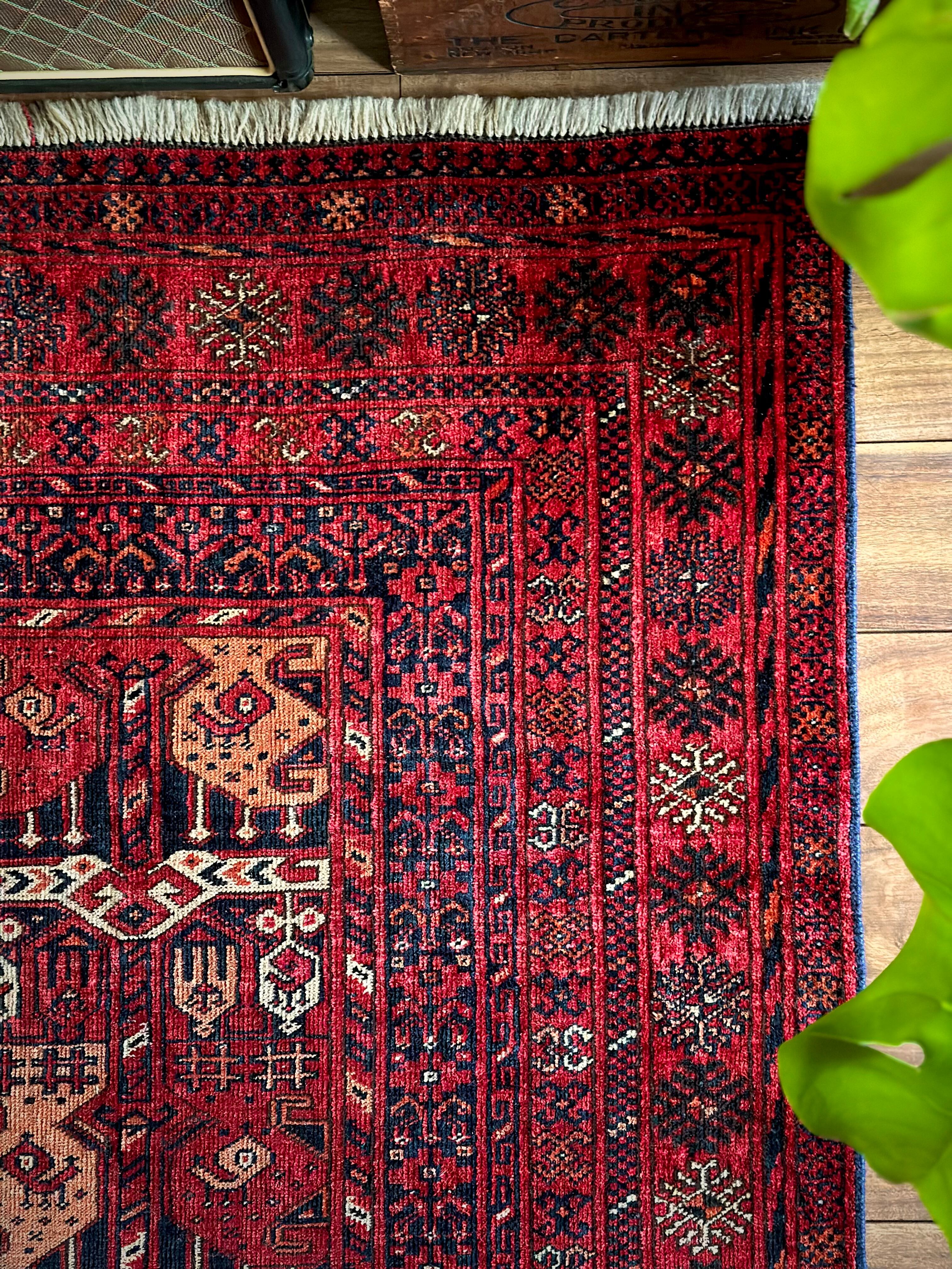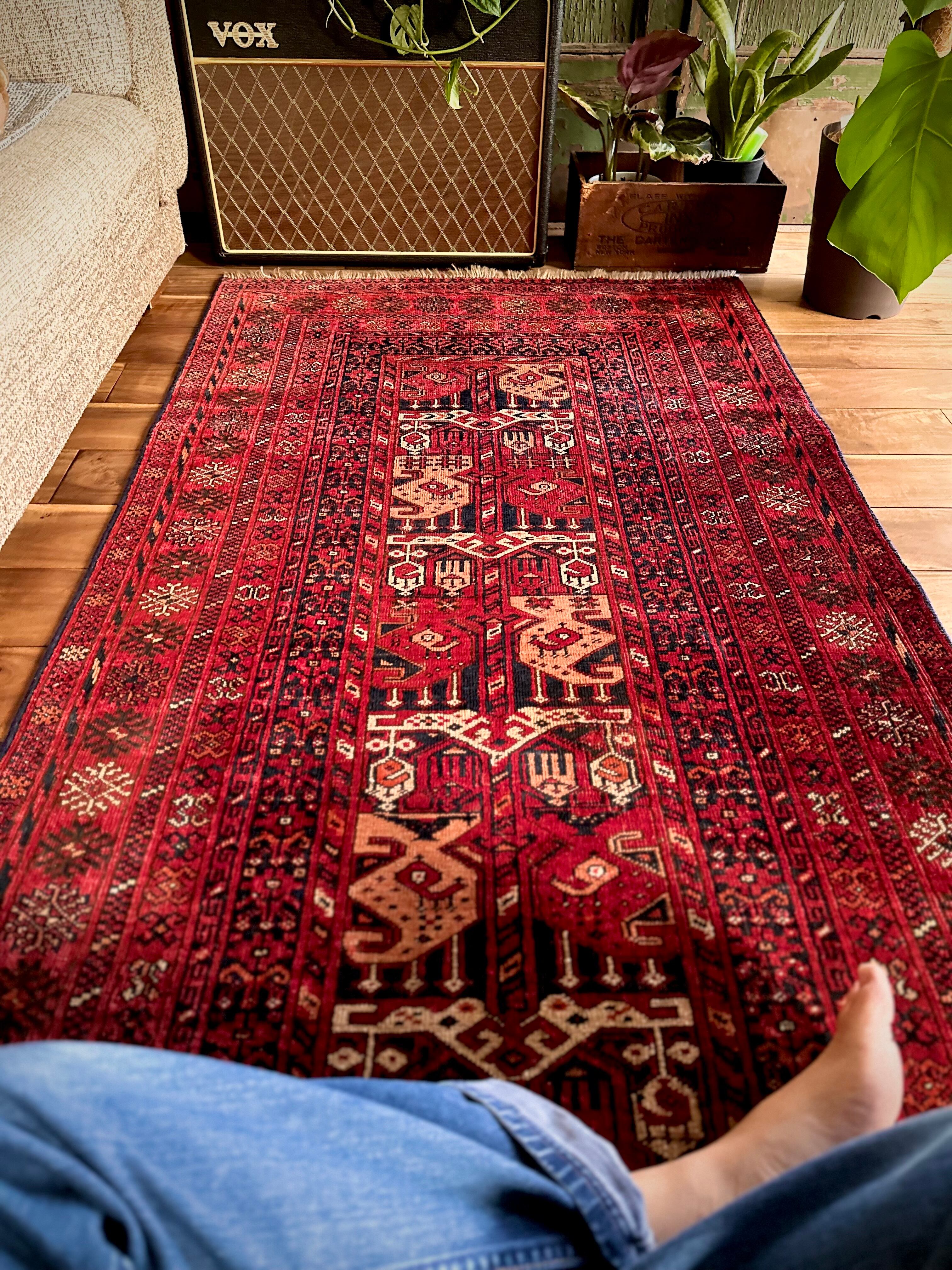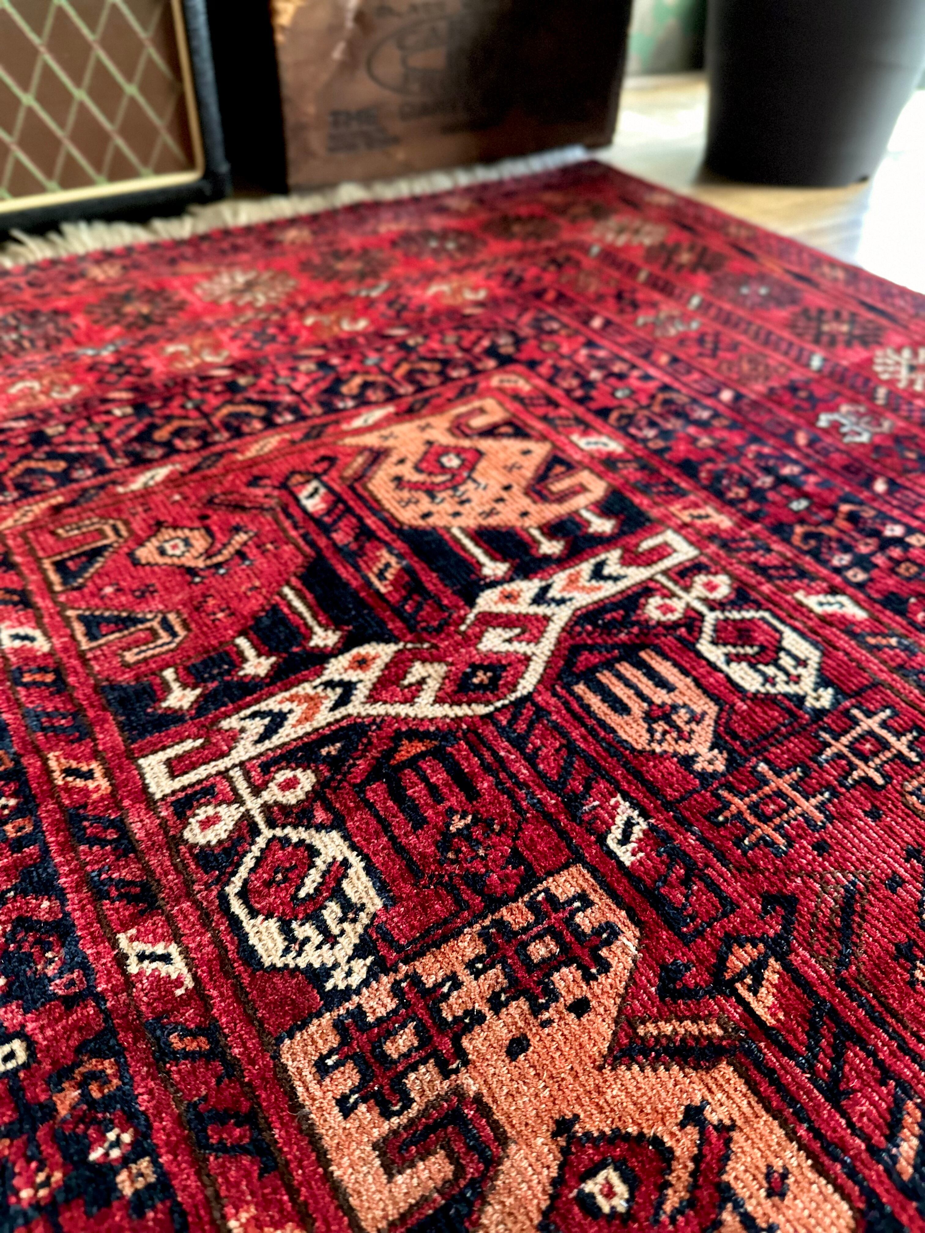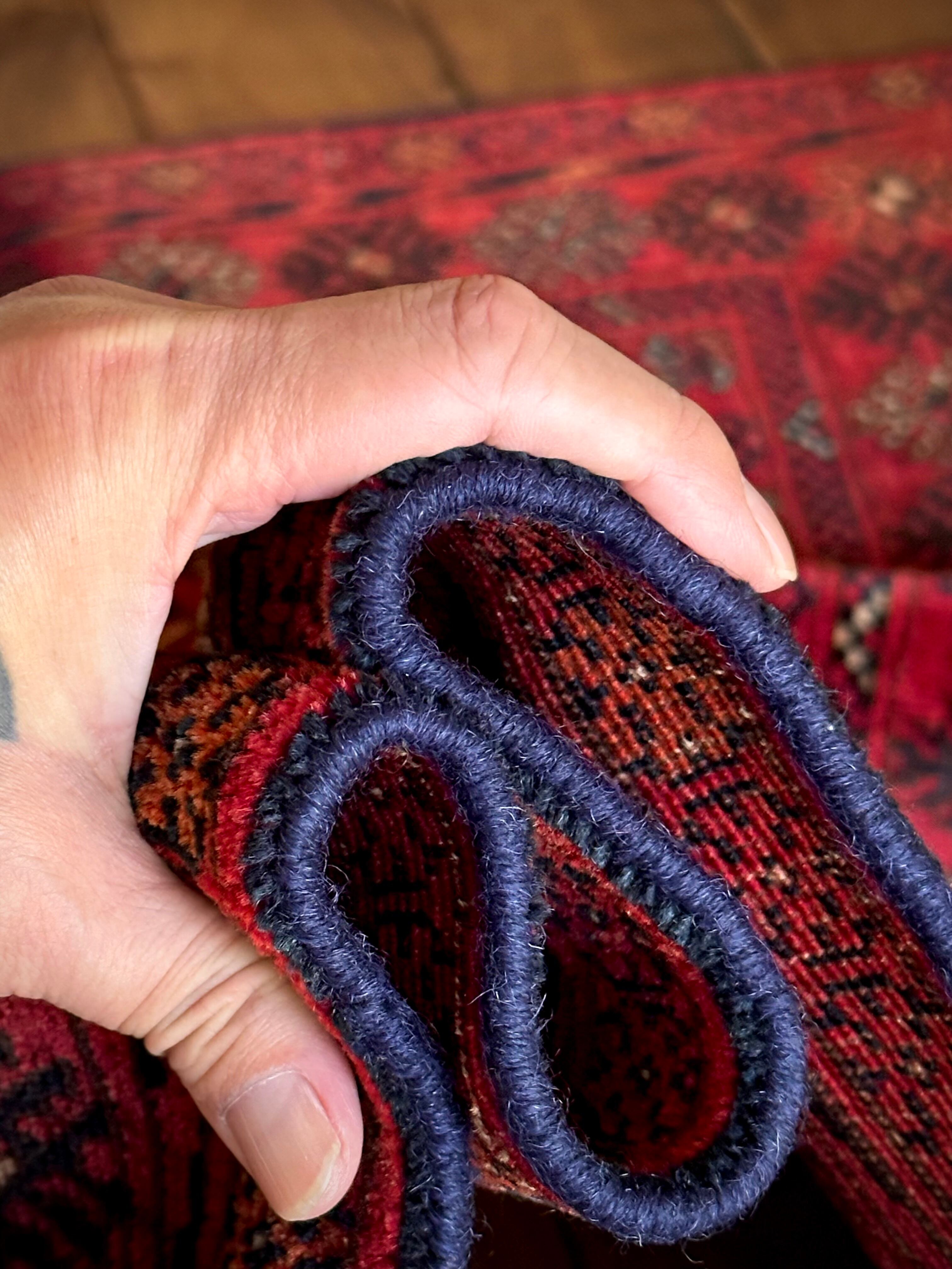 かなり深みのある真紅なレッドが映えるこちらは、アフガニスタン北部に居住するトルクメン族のトライバルラグで、かなり使い込まれてヤレた雰囲気がヴィンテージらしいシングル・タイプの1枚になります。