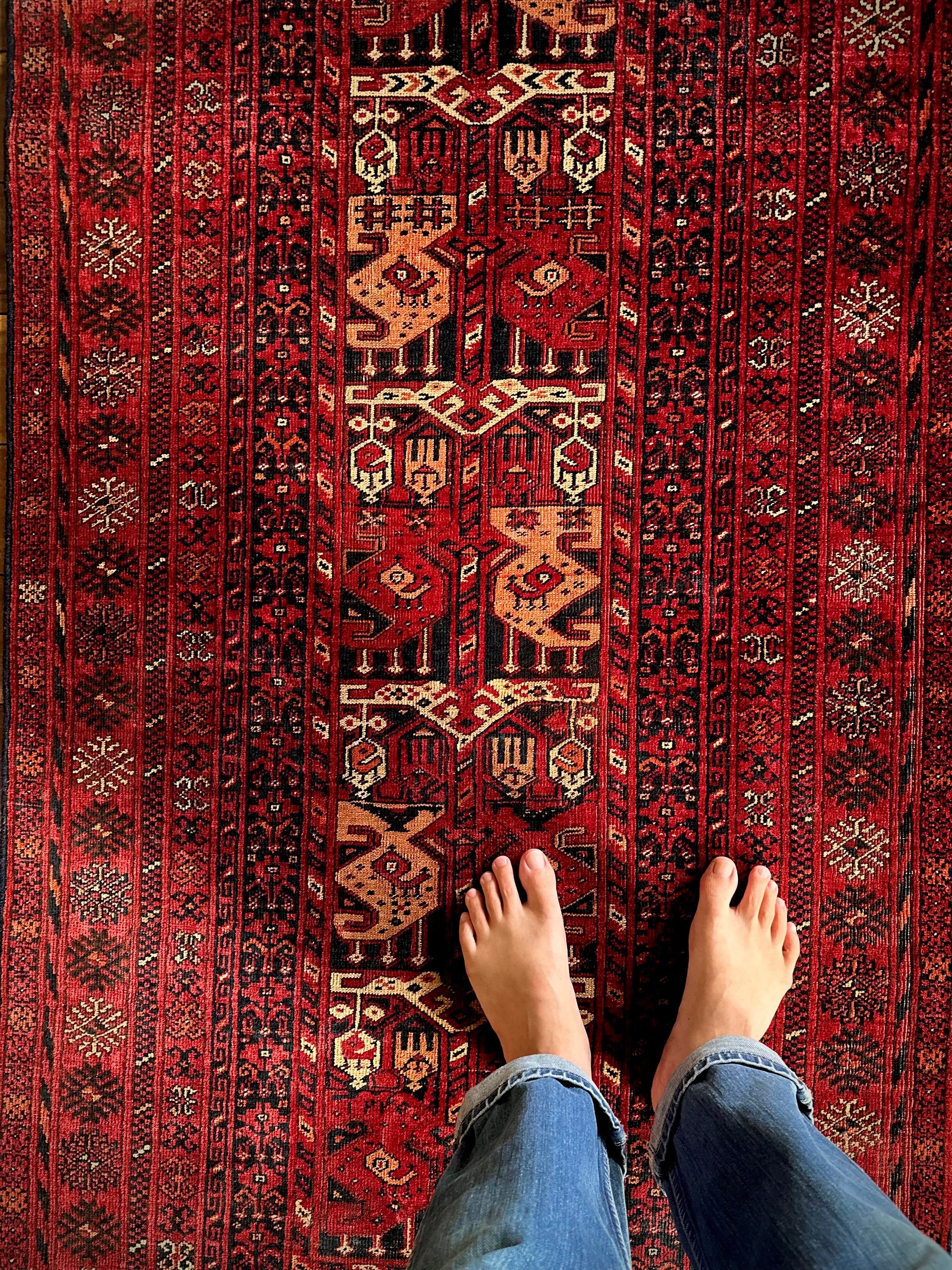フィールドに描かれたペイズリー柄の元と言われるボテ柄が愛らしく、それを取り囲む細かなミルフィーユ状のボーダーはトルクメンならではの力作でしょうか。大きさは一般的な細長タイプとなりソファ前やベッドサイドに適したサイズ感の1枚になります。