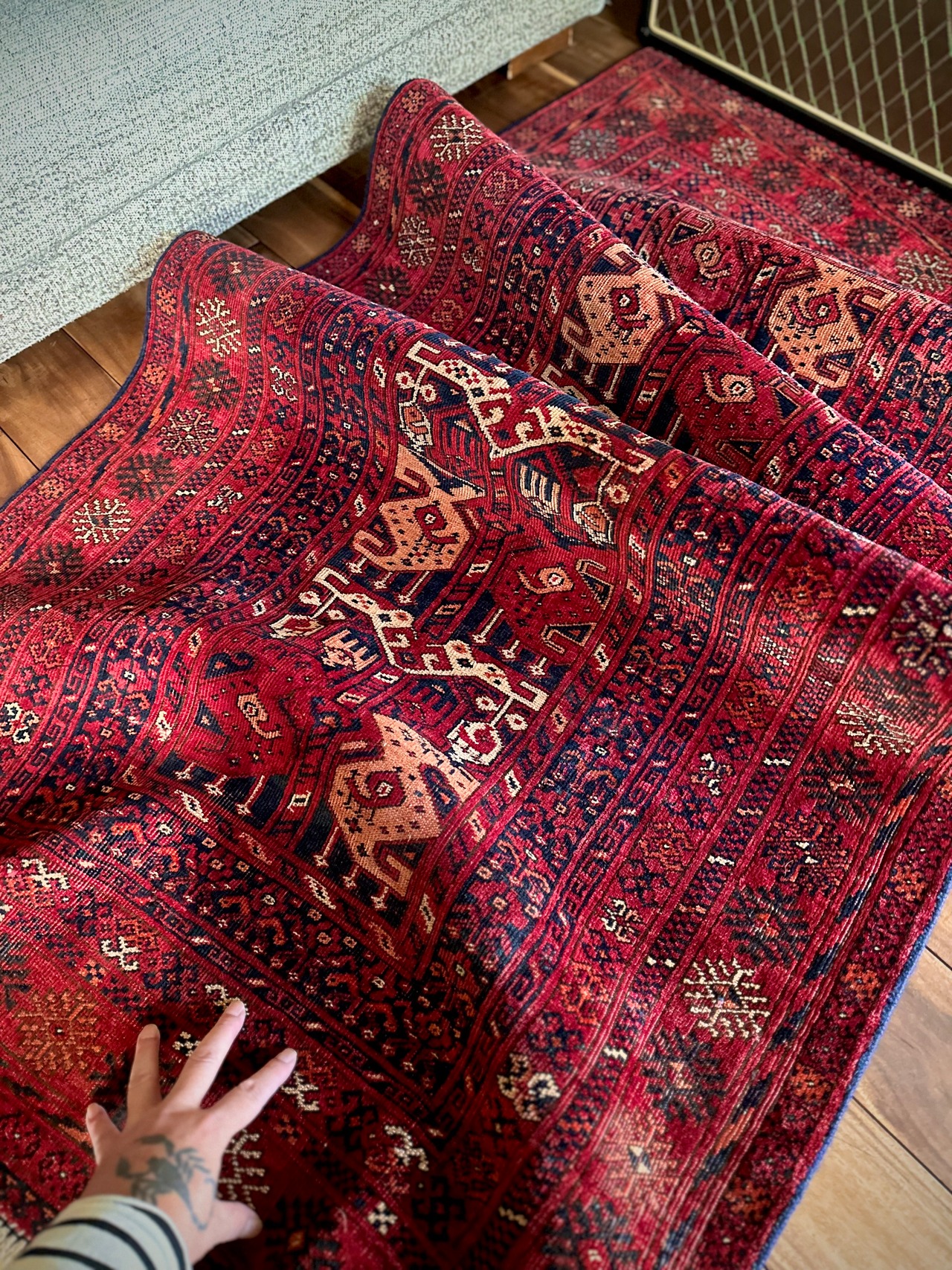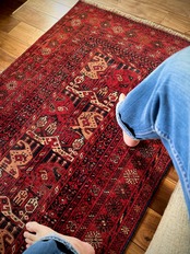 最後にラグそのものに関しては羊毛特有の匂いがあり、採寸は中央付近で計測していますが、手織りならではの歪みによる誤差や水洗いクリーニングによる縮み、また草木染めによる経年劣化の色ムラなどがありますが、それもまたヴィンテージラグの魅力かとご理解ください。