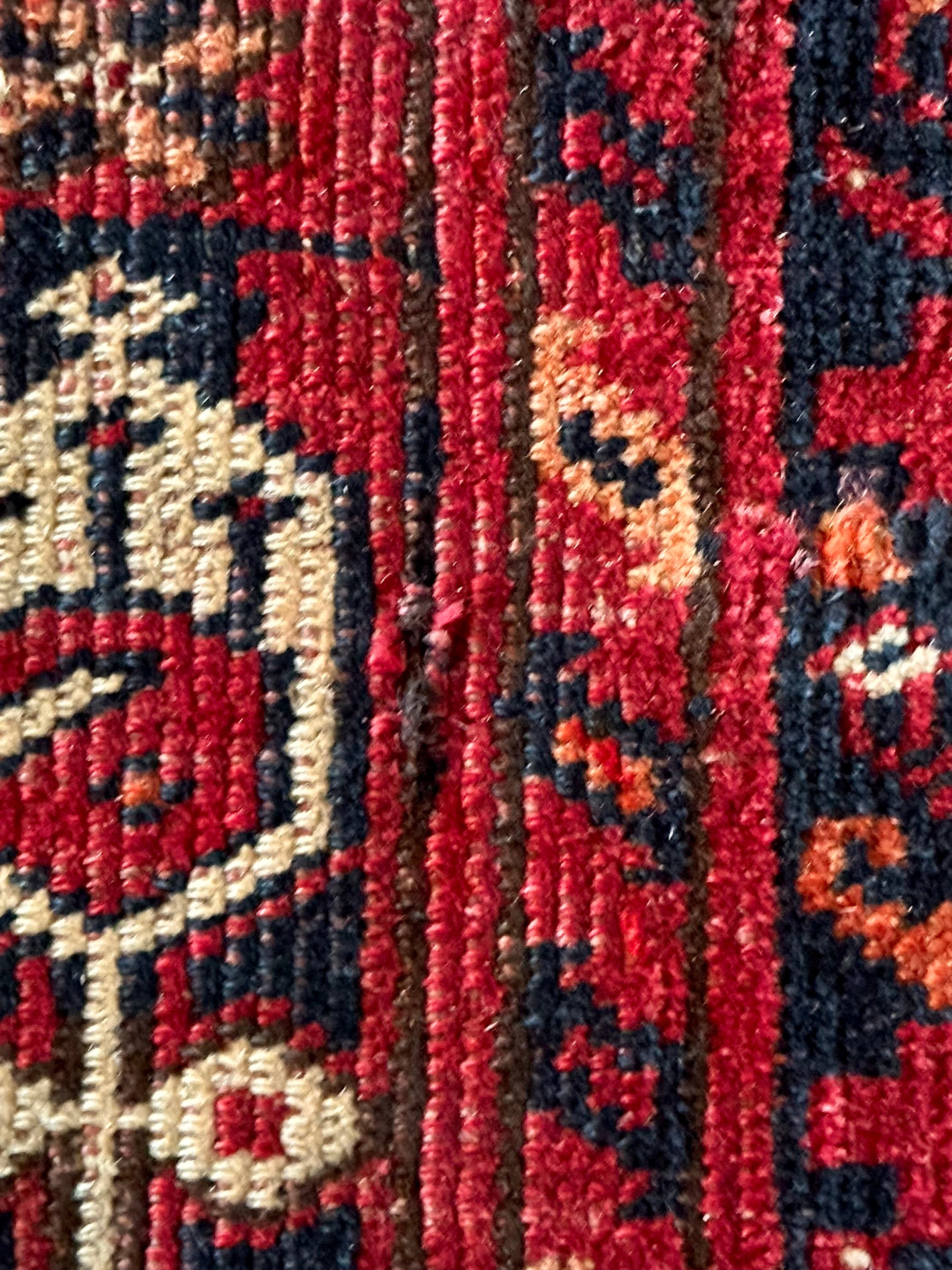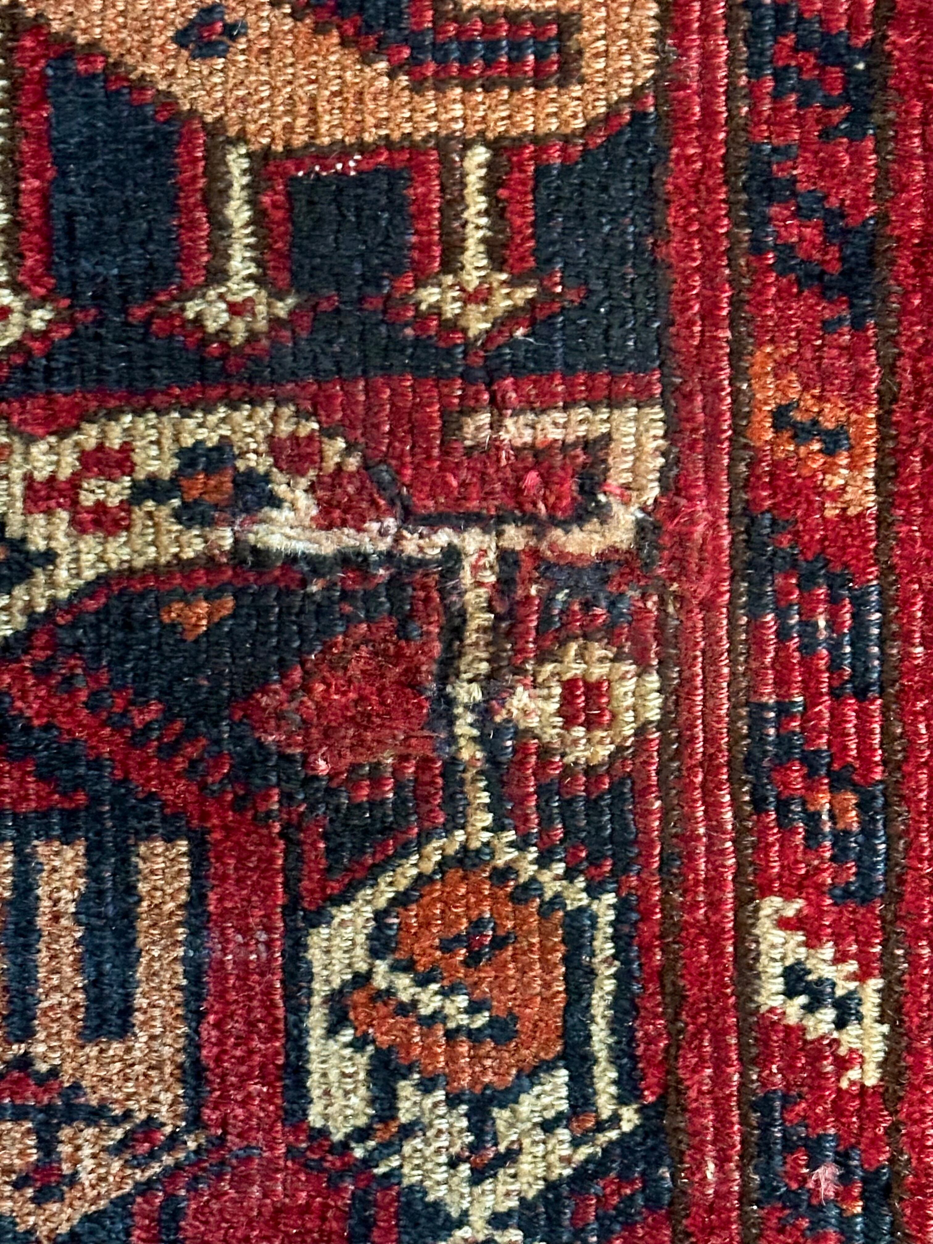 経年としてはかなり古い60年のヴィンテージラグらしく、中央部から使い込まれたパイルの擦れが全体的にあり短めのサラッとした肌触りで年中ご使用できます。またシラーゼは巻き直され何度もメンテナンスしたであろうリペアが5〜6箇所ありますが、上手く修復されて表側からは分かりづらくなっていますので画像にてご確認ください。※オンラインのみ複数掲載