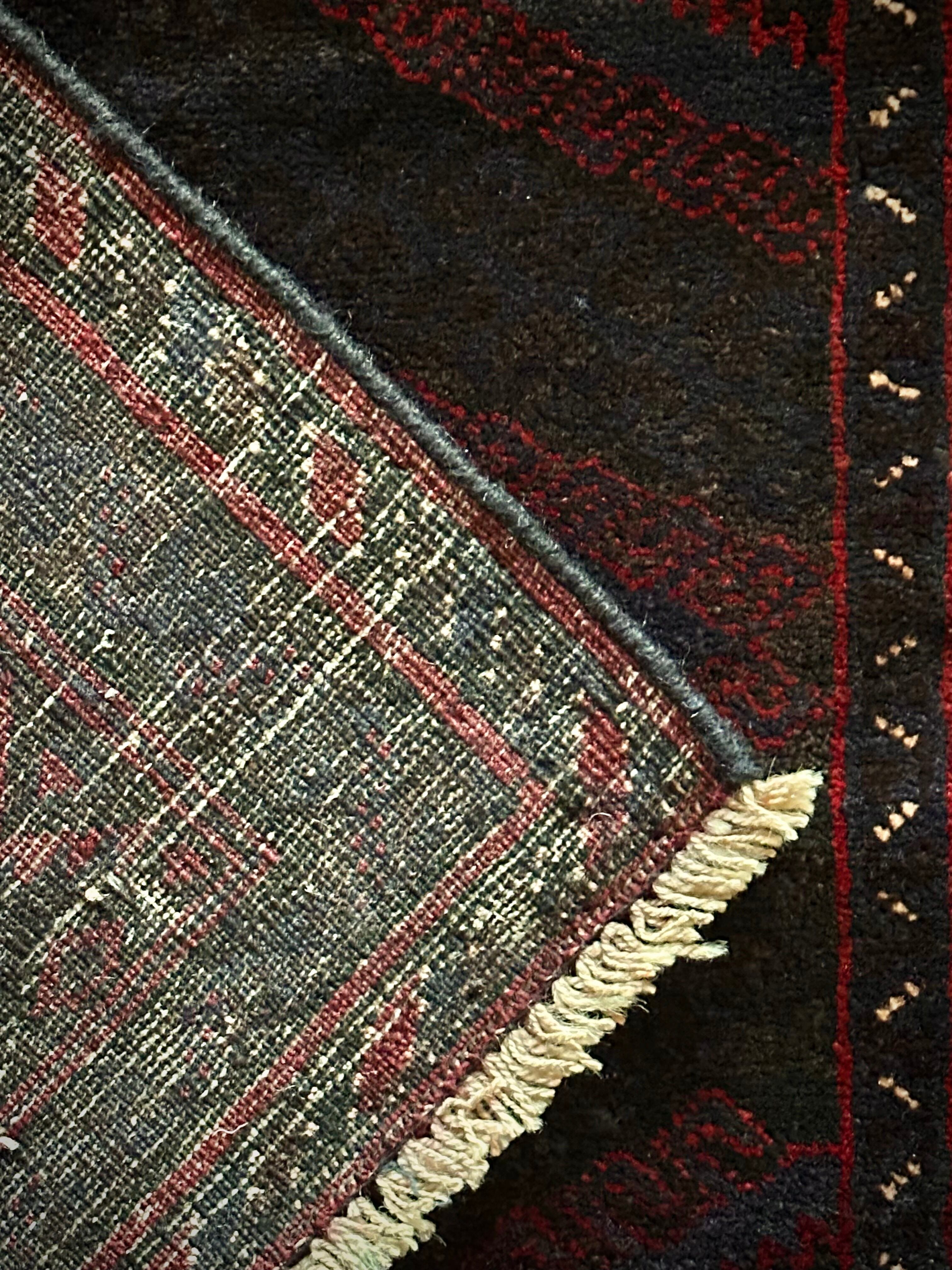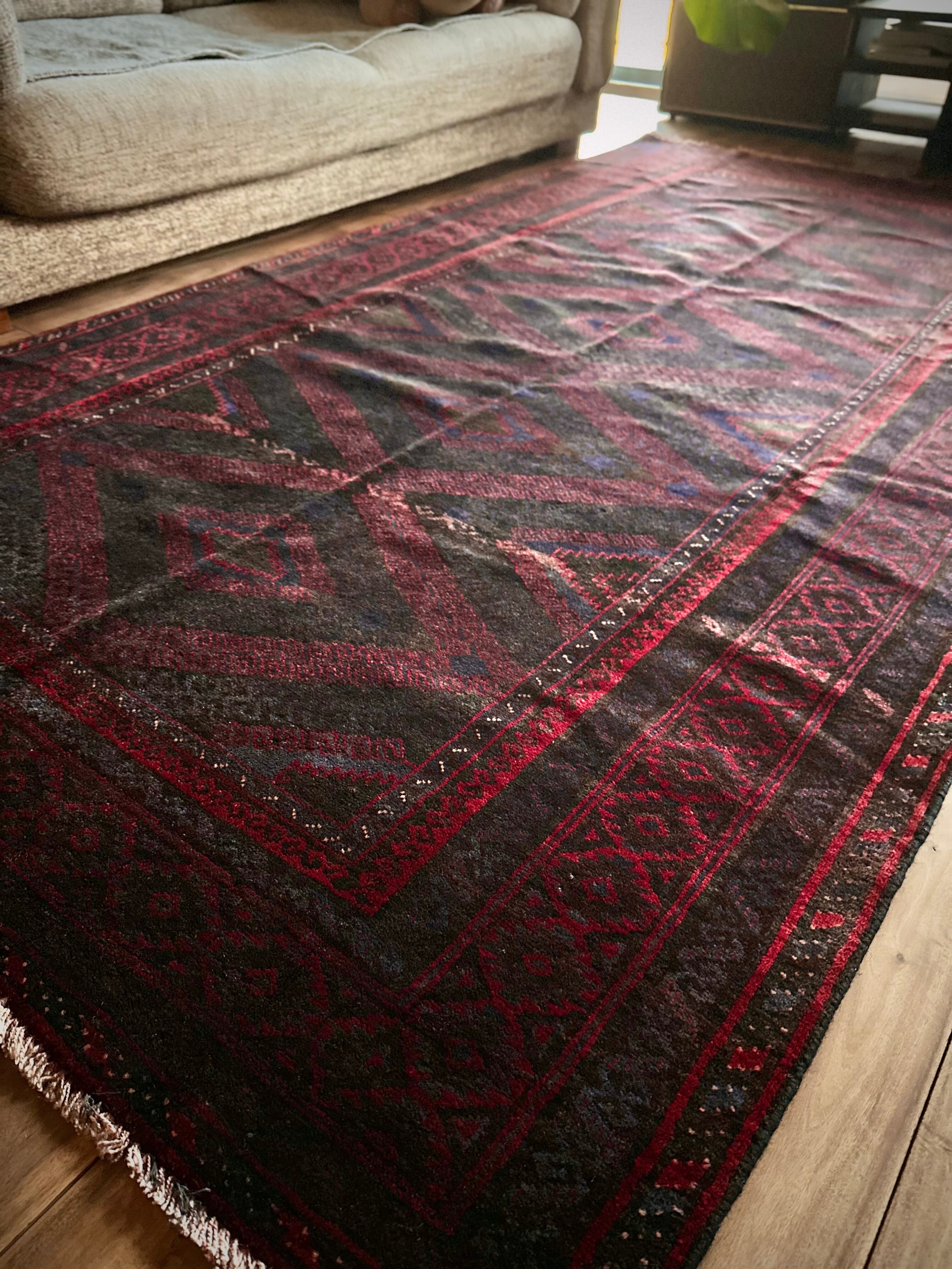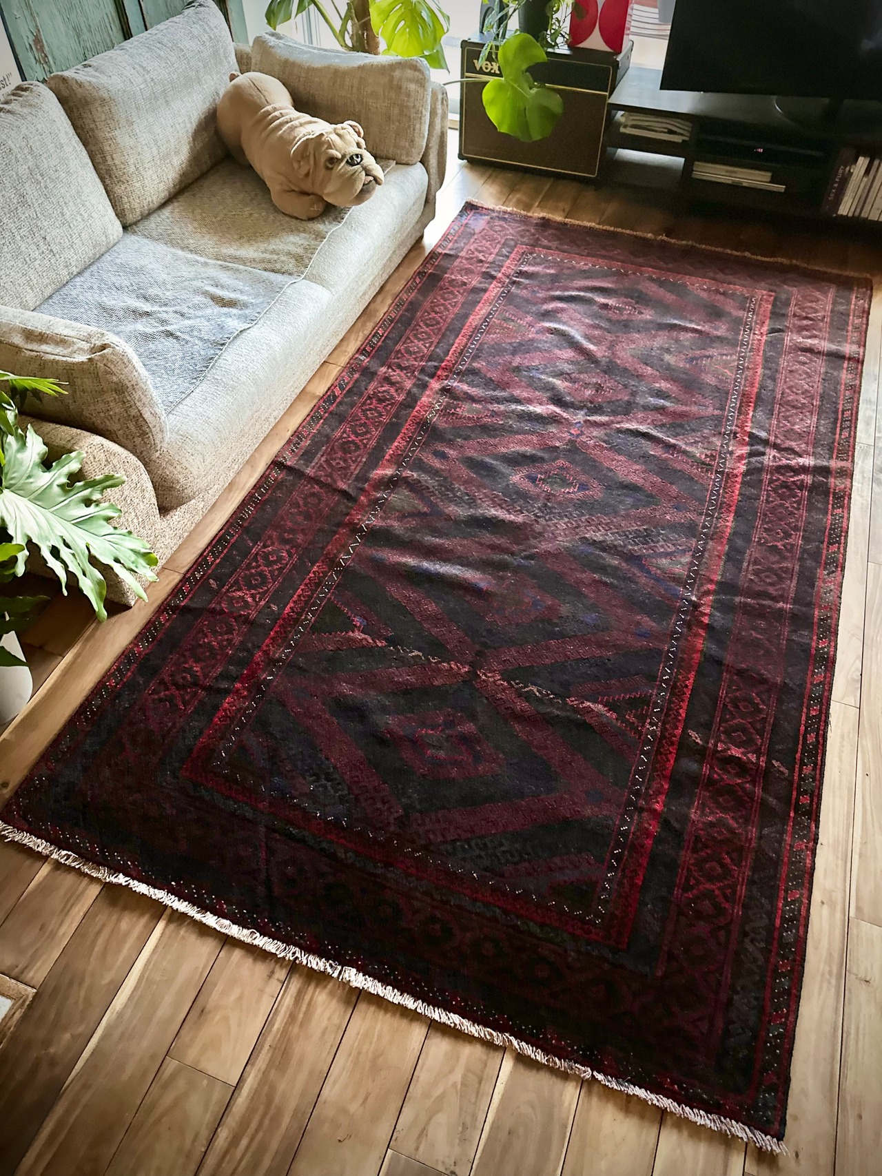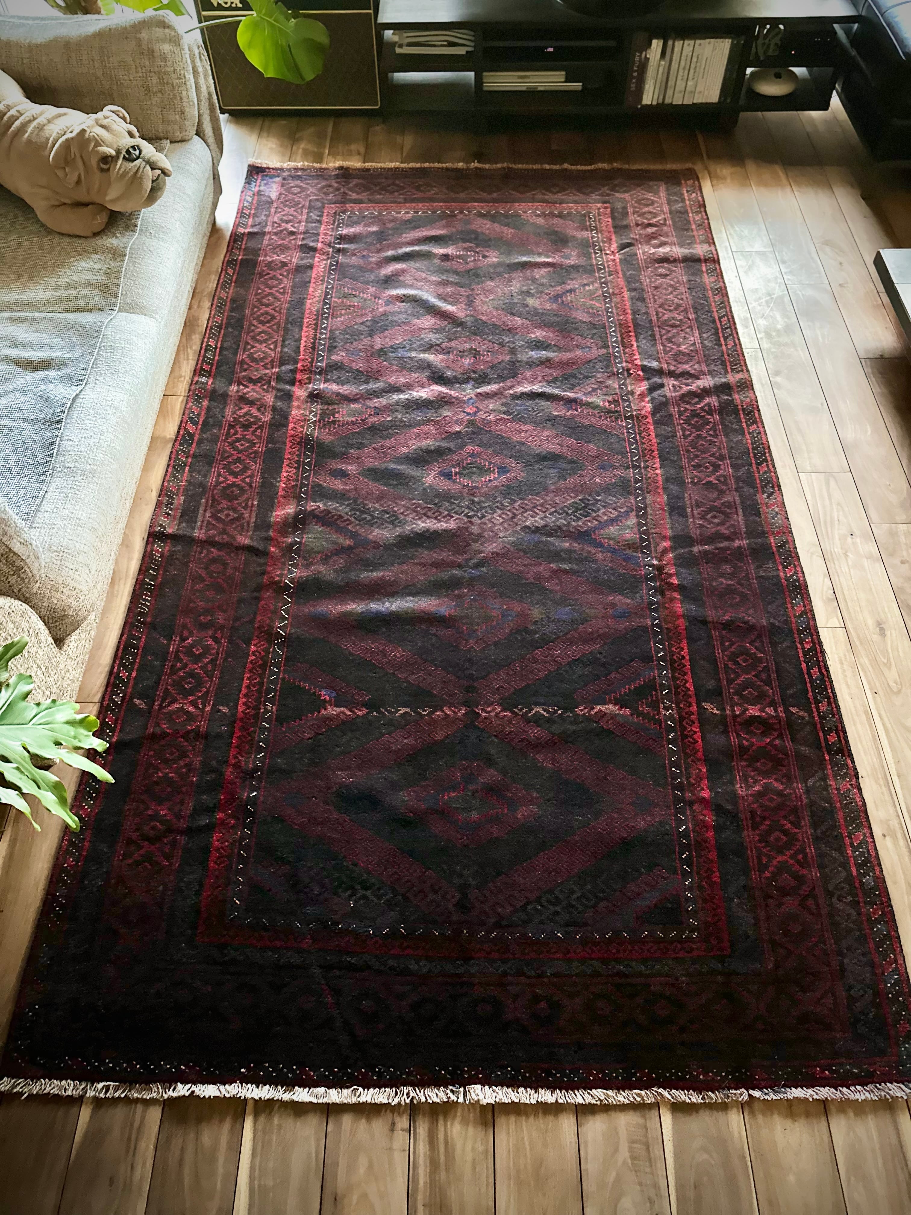 こちら画像ではかなり暗めで色飛びしてしまいますが、シンプルにめちゃくちゃかっこいいバルーチ族のトライバルラグで、ヘラート産ならではのダークで漆黒なブラックベースにレッドにバーガンディの模様、そしてポイントに使われたネイビーブルーの配色が渋い、バルーチにしては珍しい特大サイズの1枚になります。