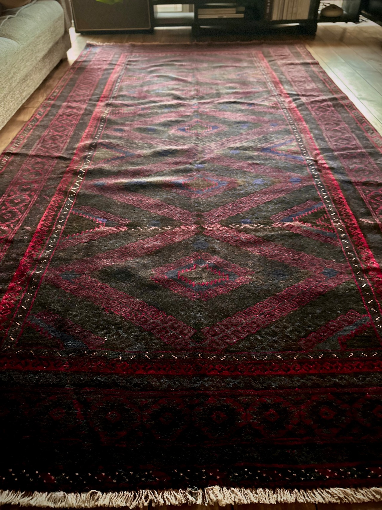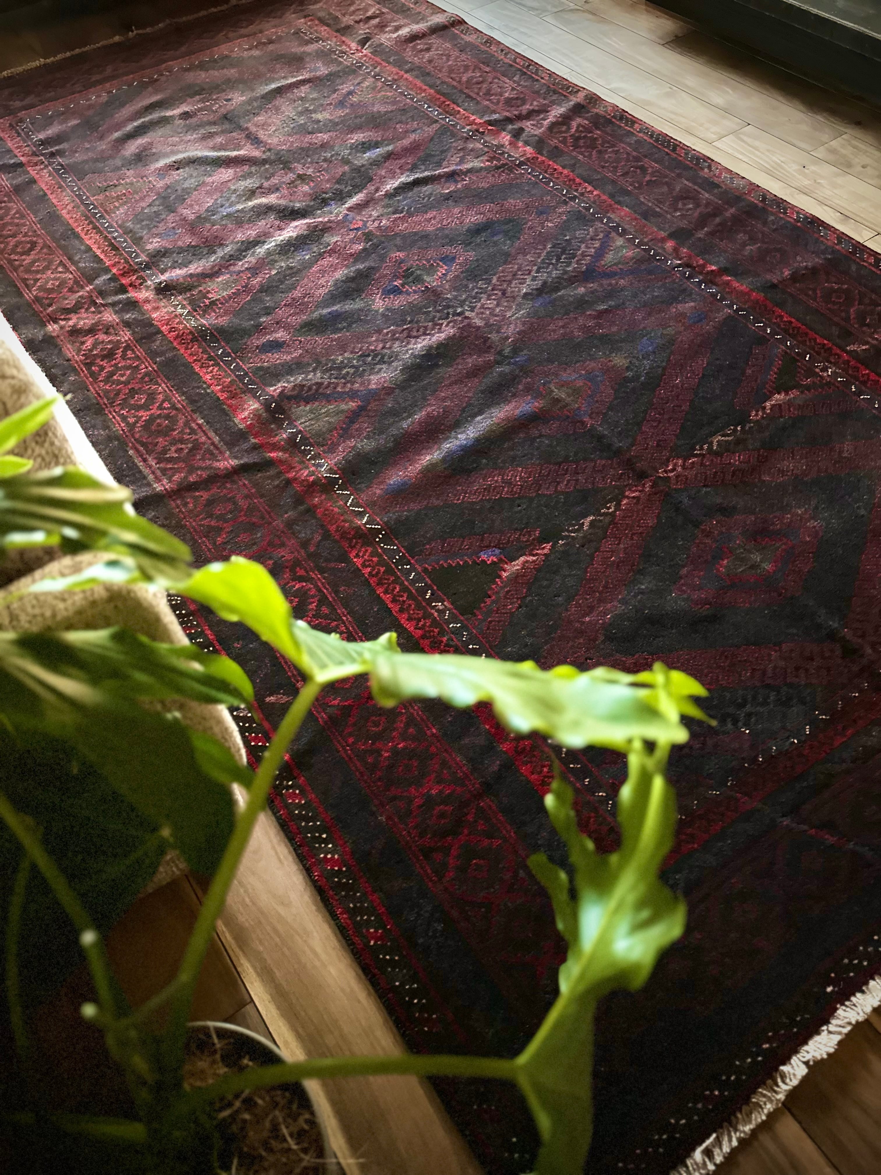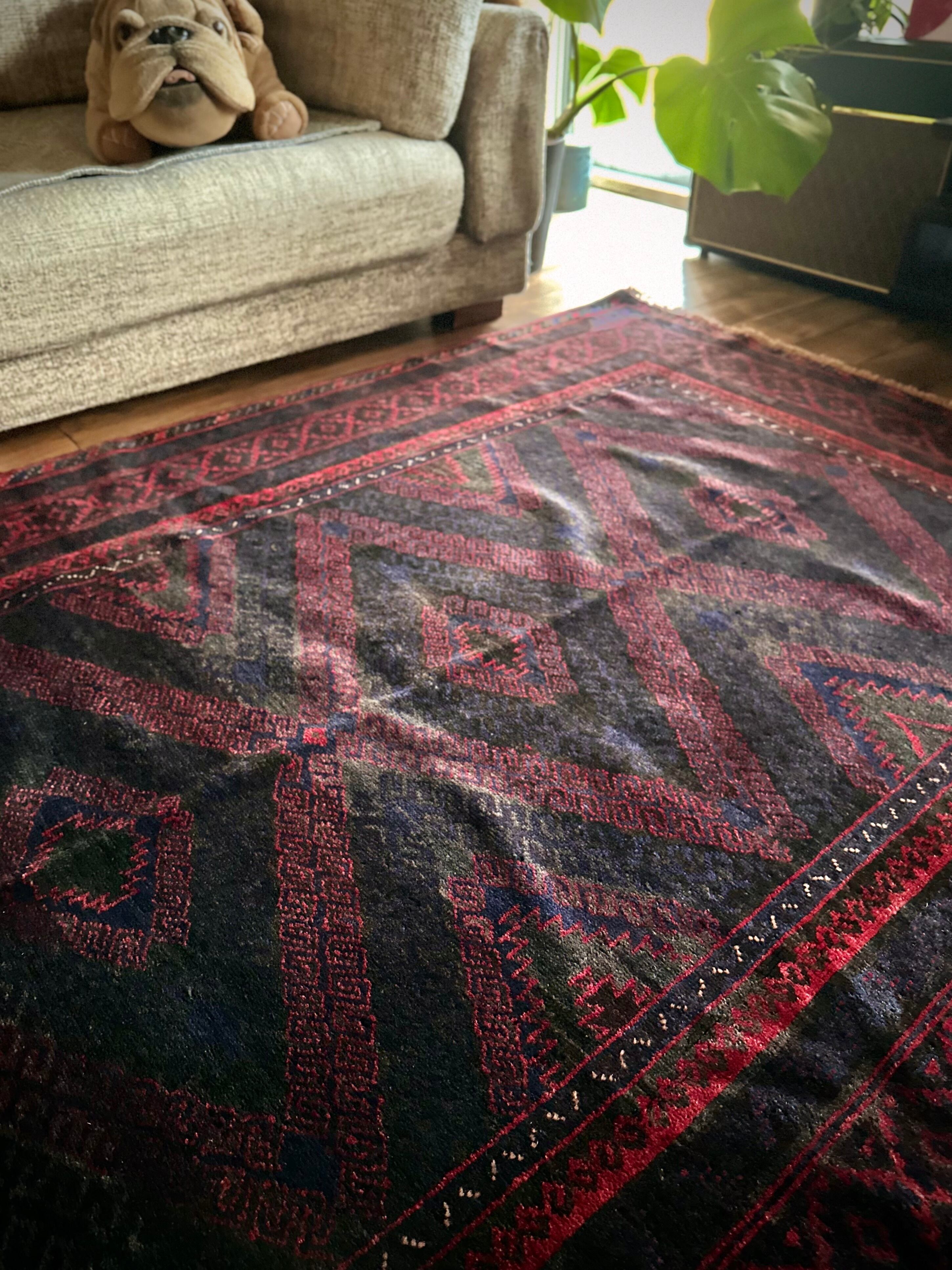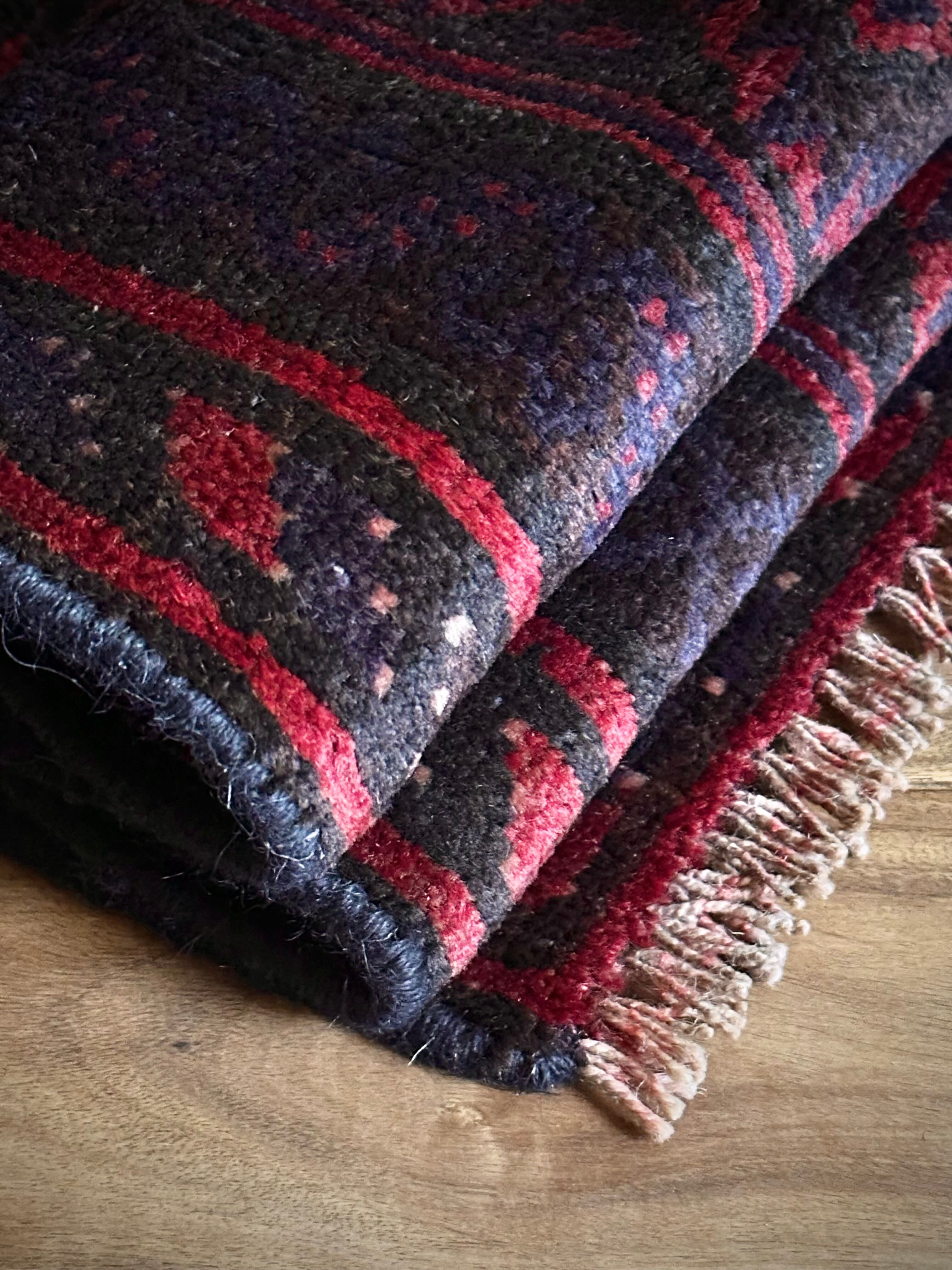 こちら画像ではかなり暗めで色飛びしてしまいますが、シンプルにめちゃくちゃかっこいいバルーチ族のトライバルラグで、ヘラート産ならではのダークで漆黒なブラックベースにレッドにバーガンディの模様、そしてポイントに使われたネイビーブルーの配色が渋い、バルーチにしては珍しい特大サイズの1枚になります。