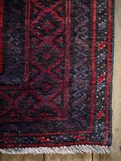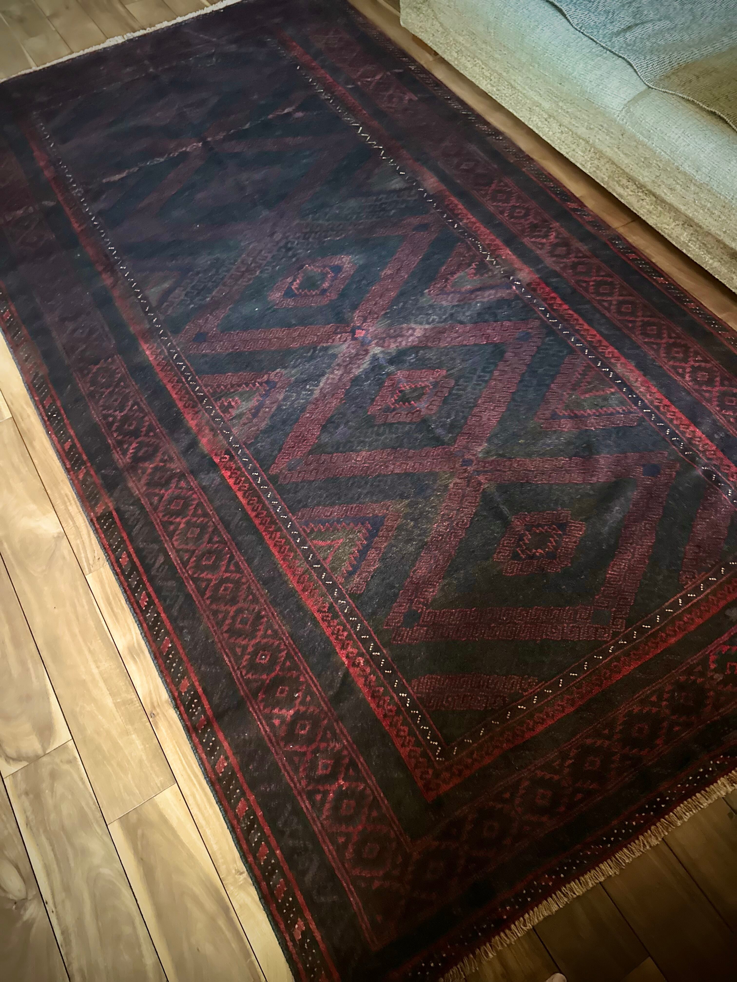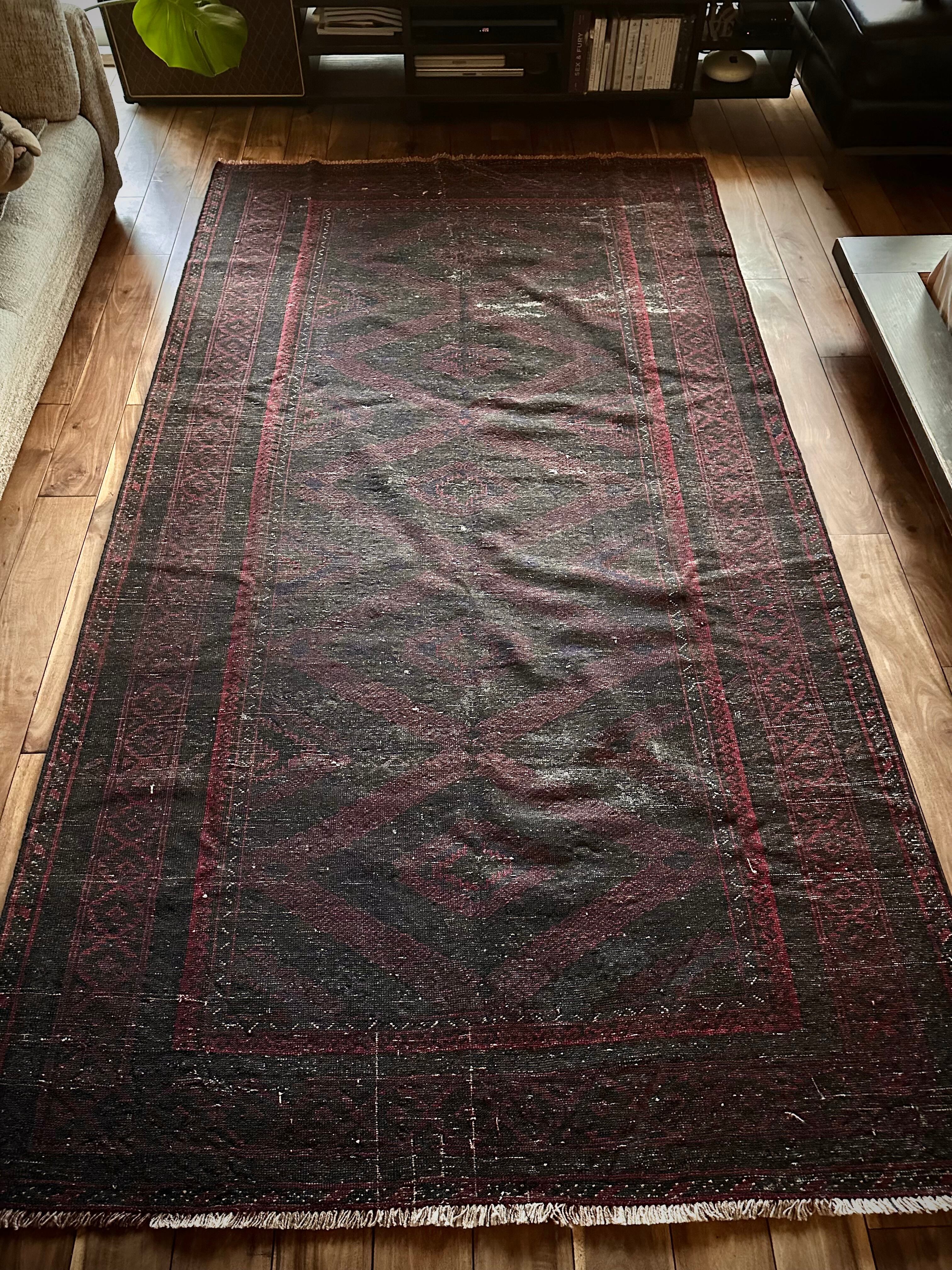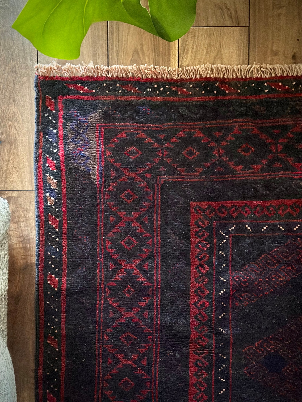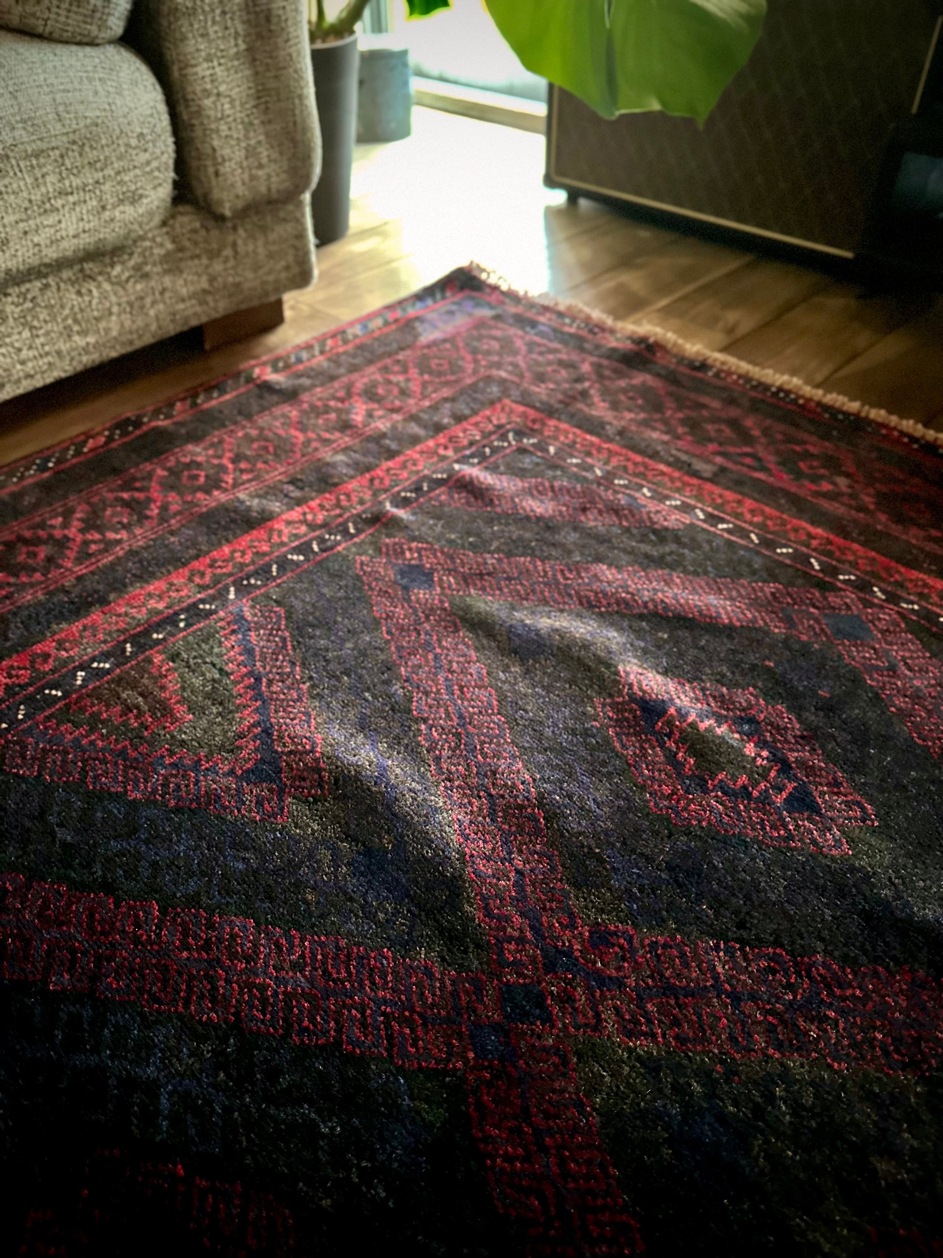 こちら画像ではかなり暗めで色飛びしてしまいますが、シンプルにめちゃくちゃかっこいいバルーチ族のトライバルラグで、ヘラート産ならではのダークで漆黒なブラックベースにレッドにバーガンディの模様、そしてポイントに使われたネイビーブルーの配色が渋い、バルーチにしては珍しい特大サイズの1枚になります。