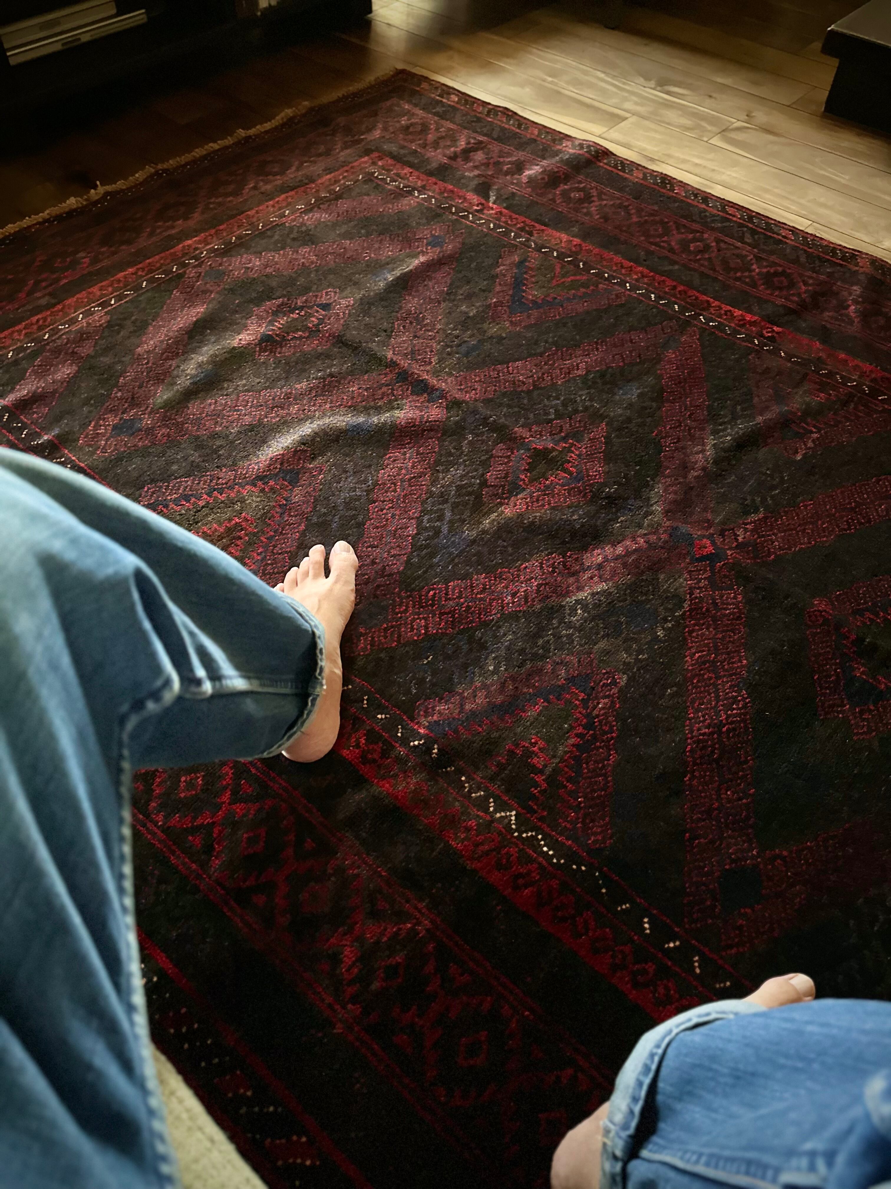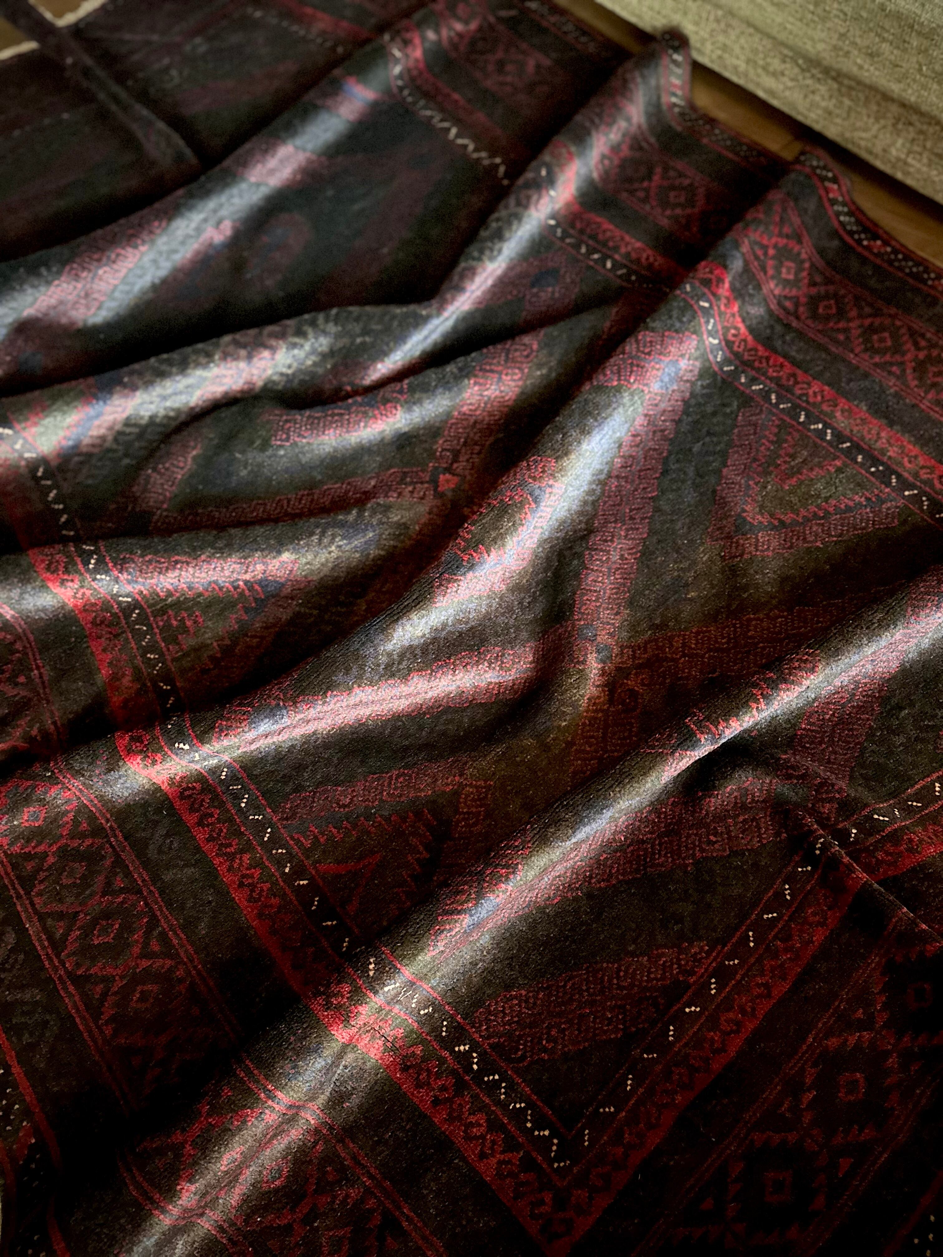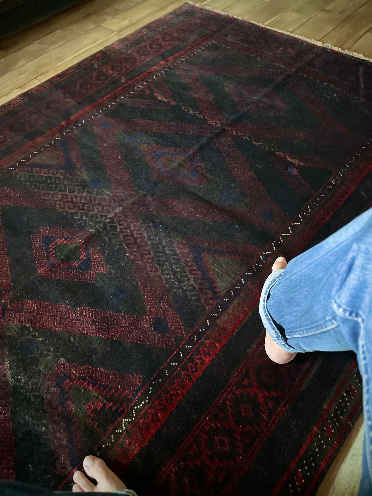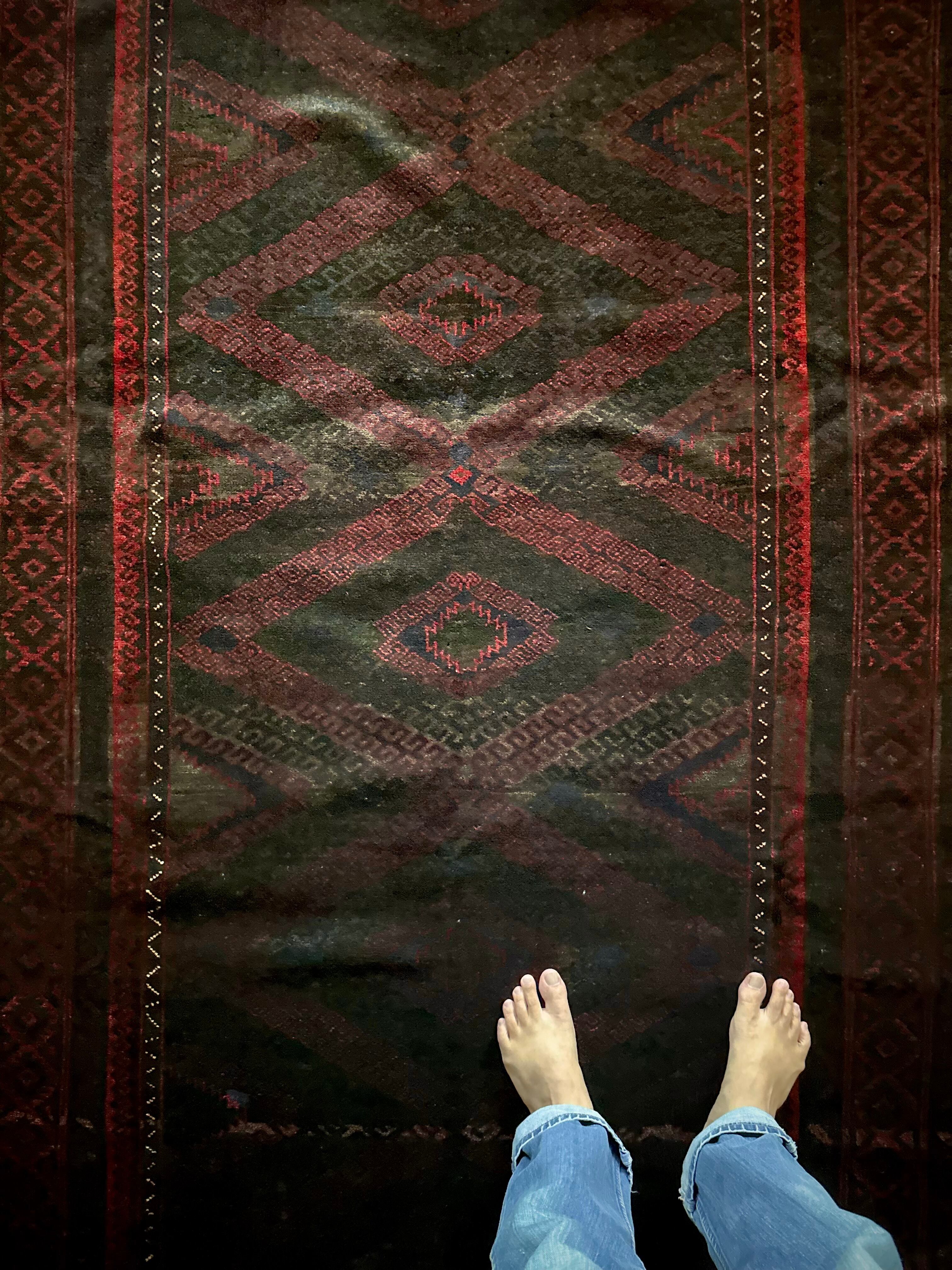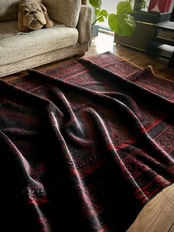 こちら画像ではかなり暗めで色飛びしてしまいますが、シンプルにめちゃくちゃかっこいいバルーチ族のトライバルラグで、ヘラート産ならではのダークで漆黒なブラックベースにレッドにバーガンディの模様、そしてポイントに使われたネイビーブルーの配色が渋い、バルーチにしては珍しい特大サイズの1枚になります。