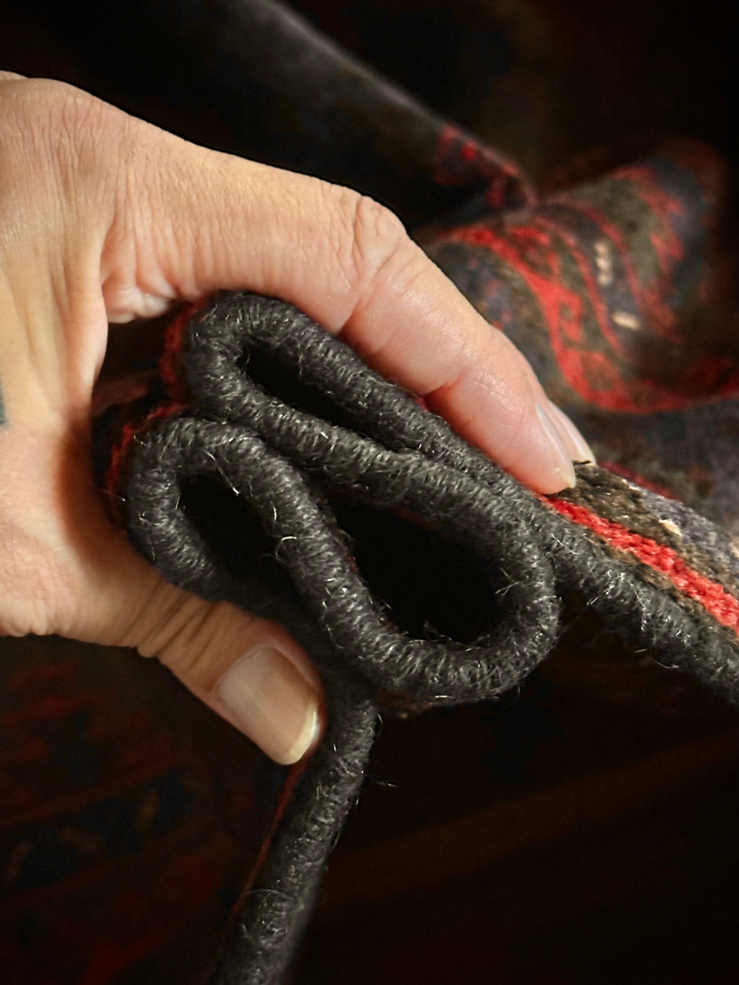 最後にラグそのものに関しては羊毛特有の匂いがあり、採寸は中央付近で計測していますが、手織りならではの歪みによる誤差や水洗いクリーニングによる縮み、また草木染めによる経年劣化の色ムラなどがありますが、それもまたヴィンテージラグの魅力かとご理解ください。