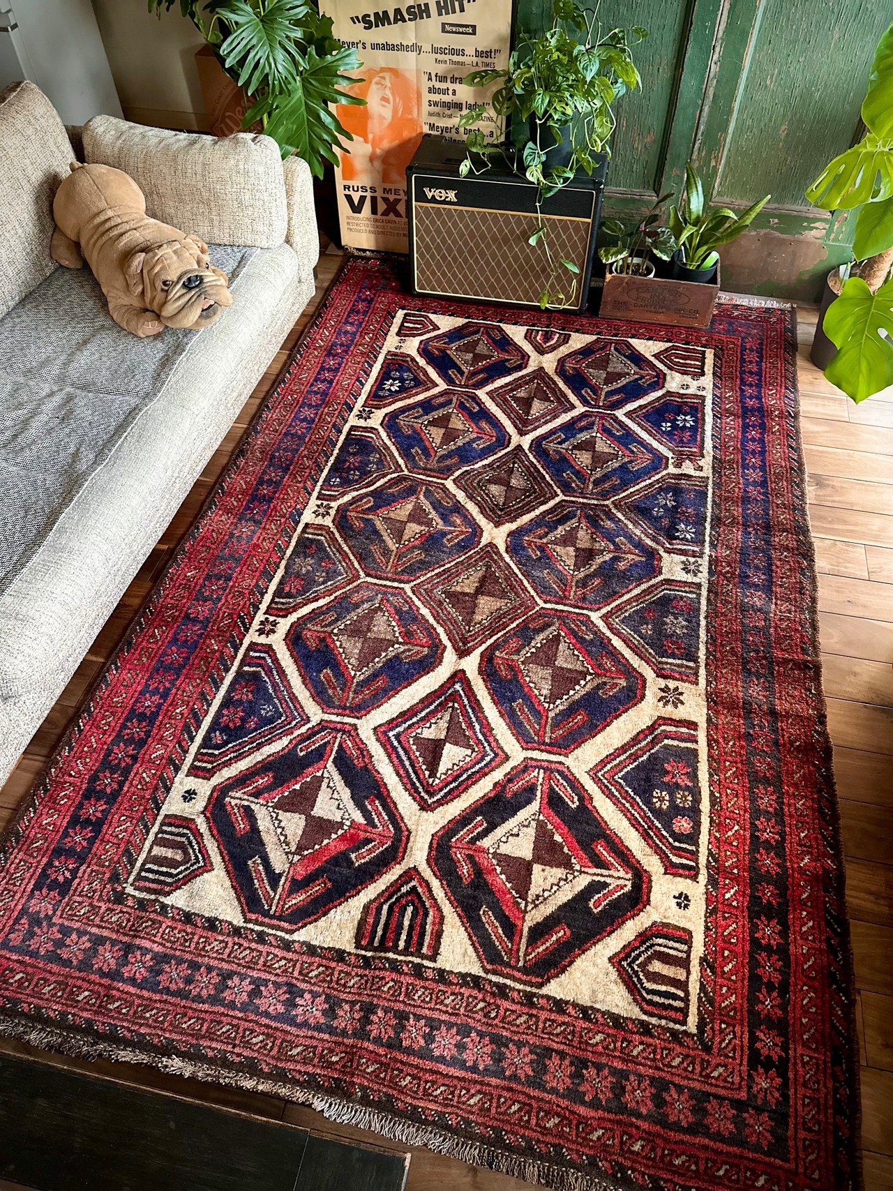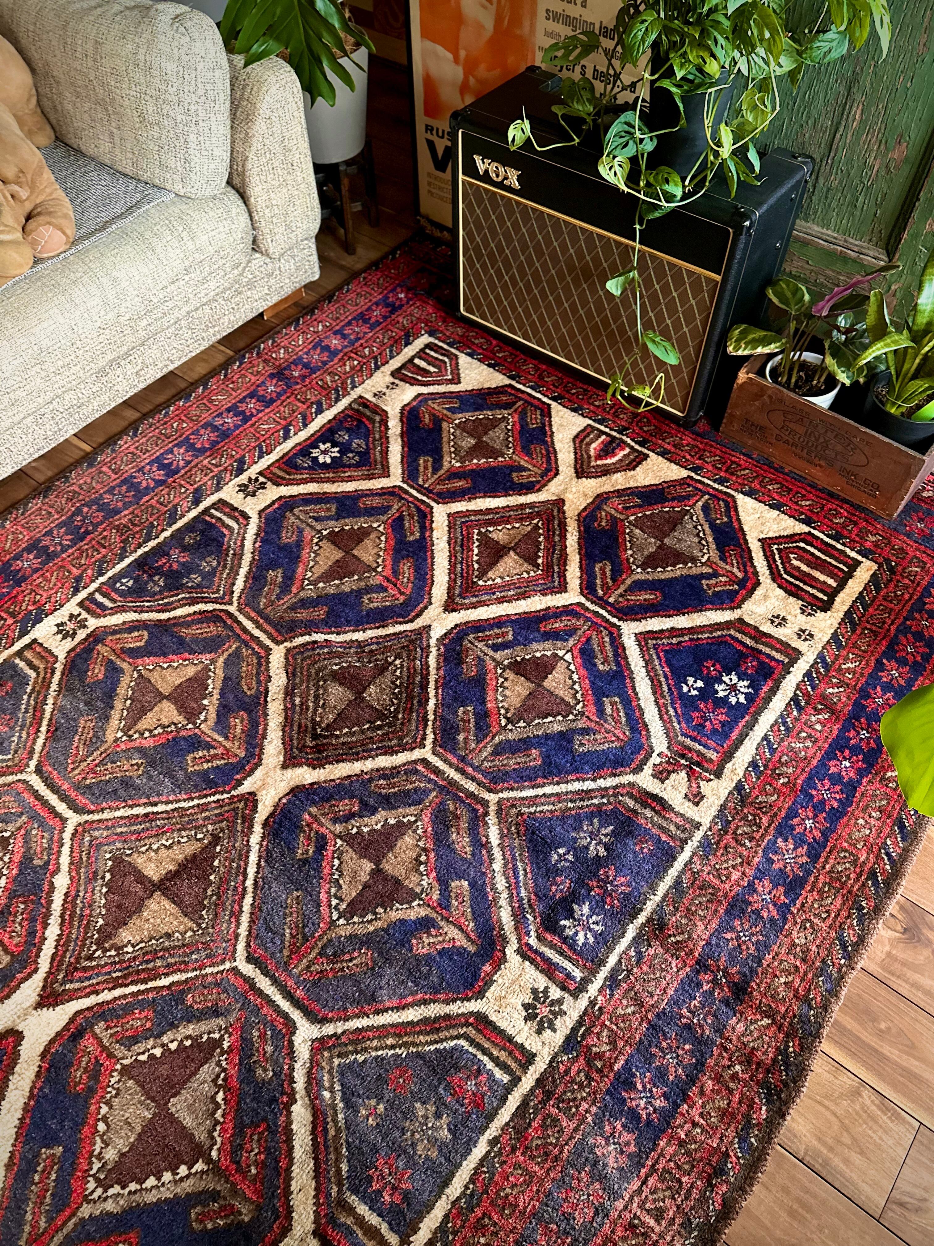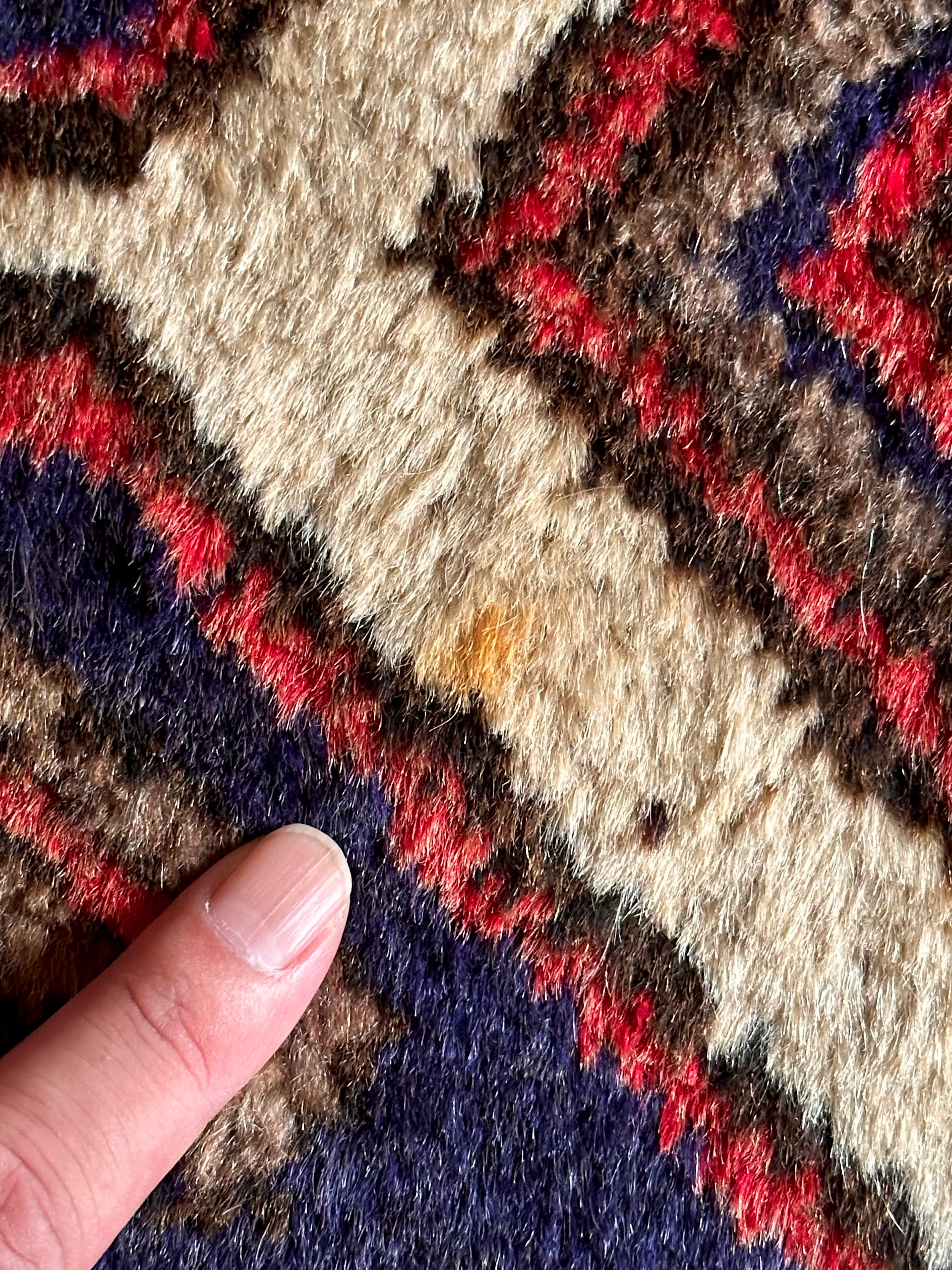 経年としてはかなり古い60年のヴィンテージラグにしては、それほどの使用感は見られませんが小さなシミがありますので画像にてご確認ください。またパイル自体はフサフサとしていて、その柔らかい踏み心地は一度味わえば忘れられない逸品で、気になるダメージにリペア箇所は見当たらないグッドなコンディションの1枚になります。