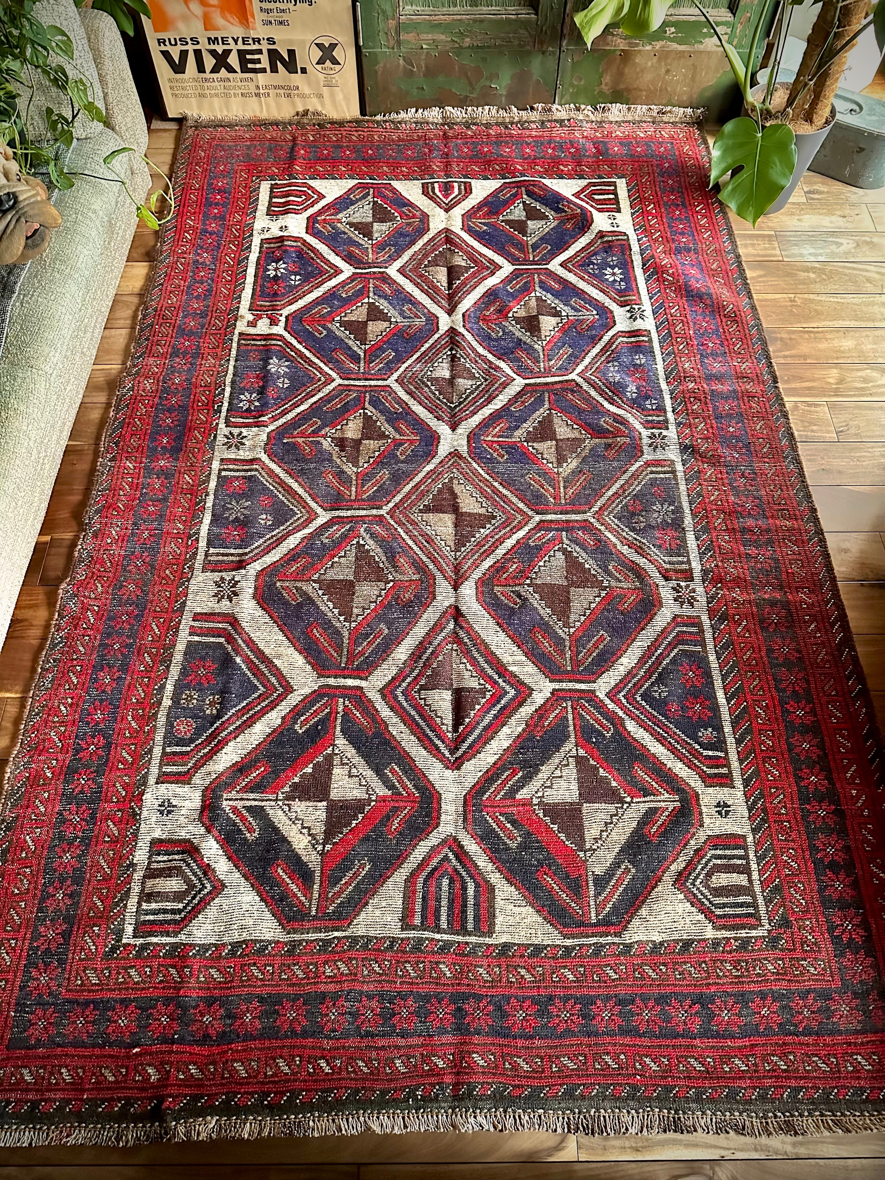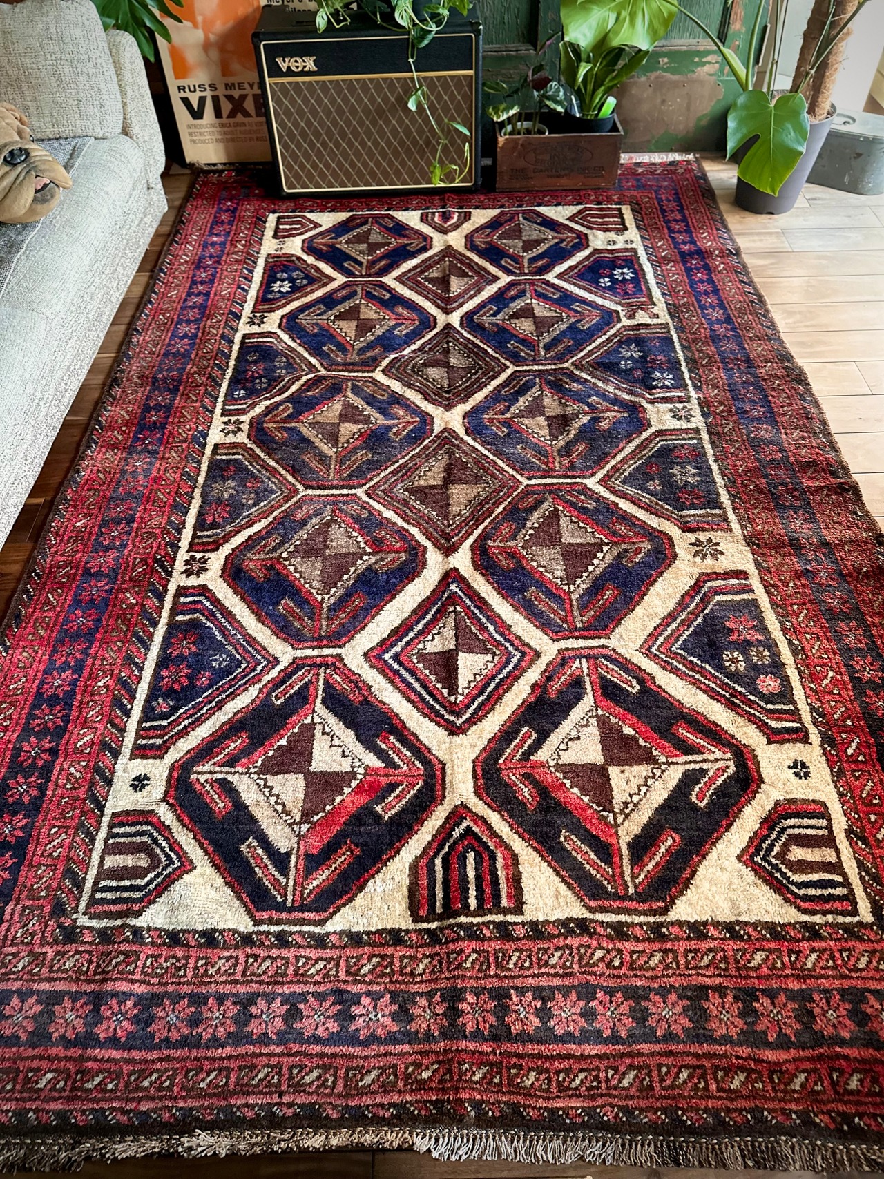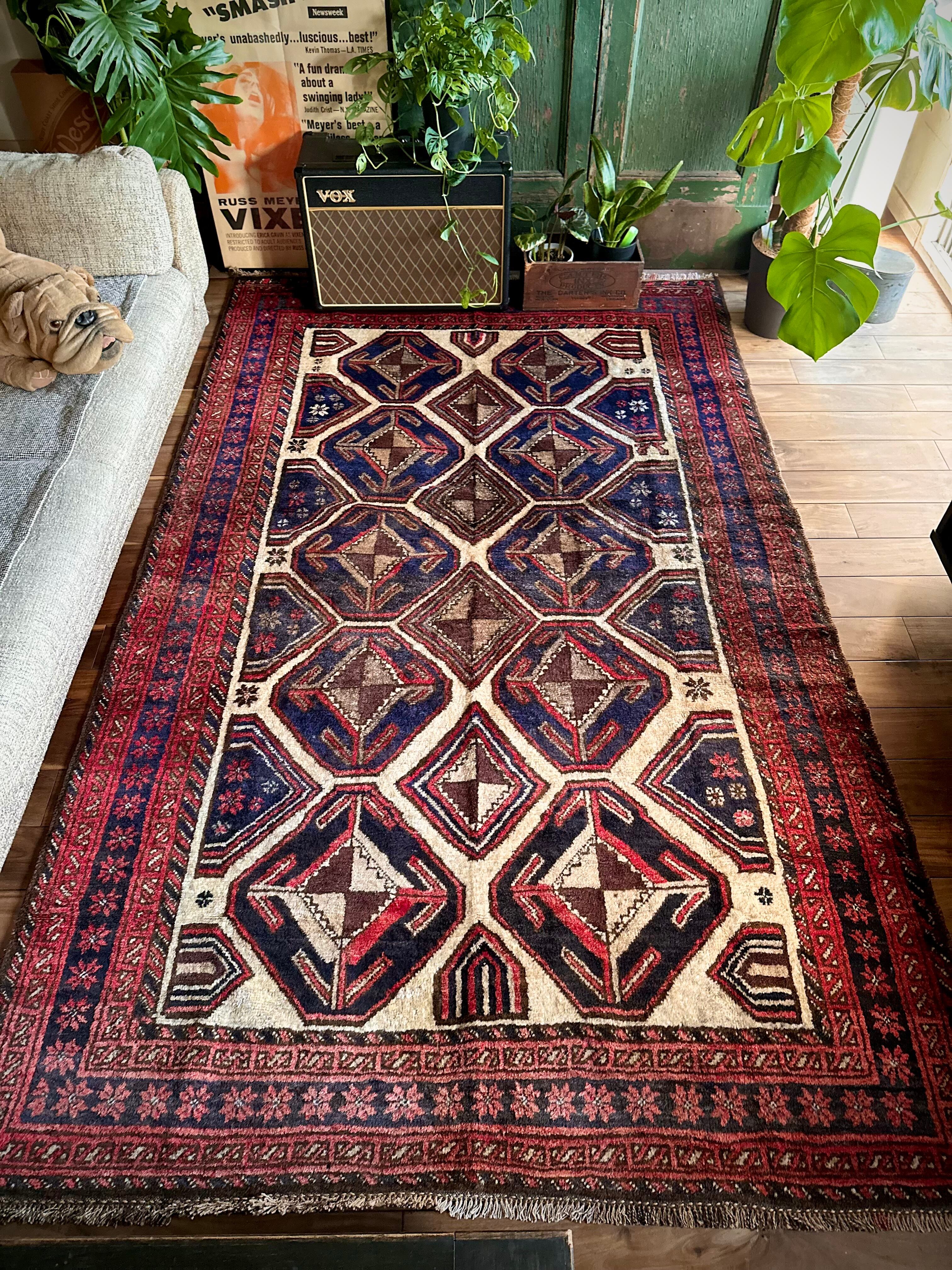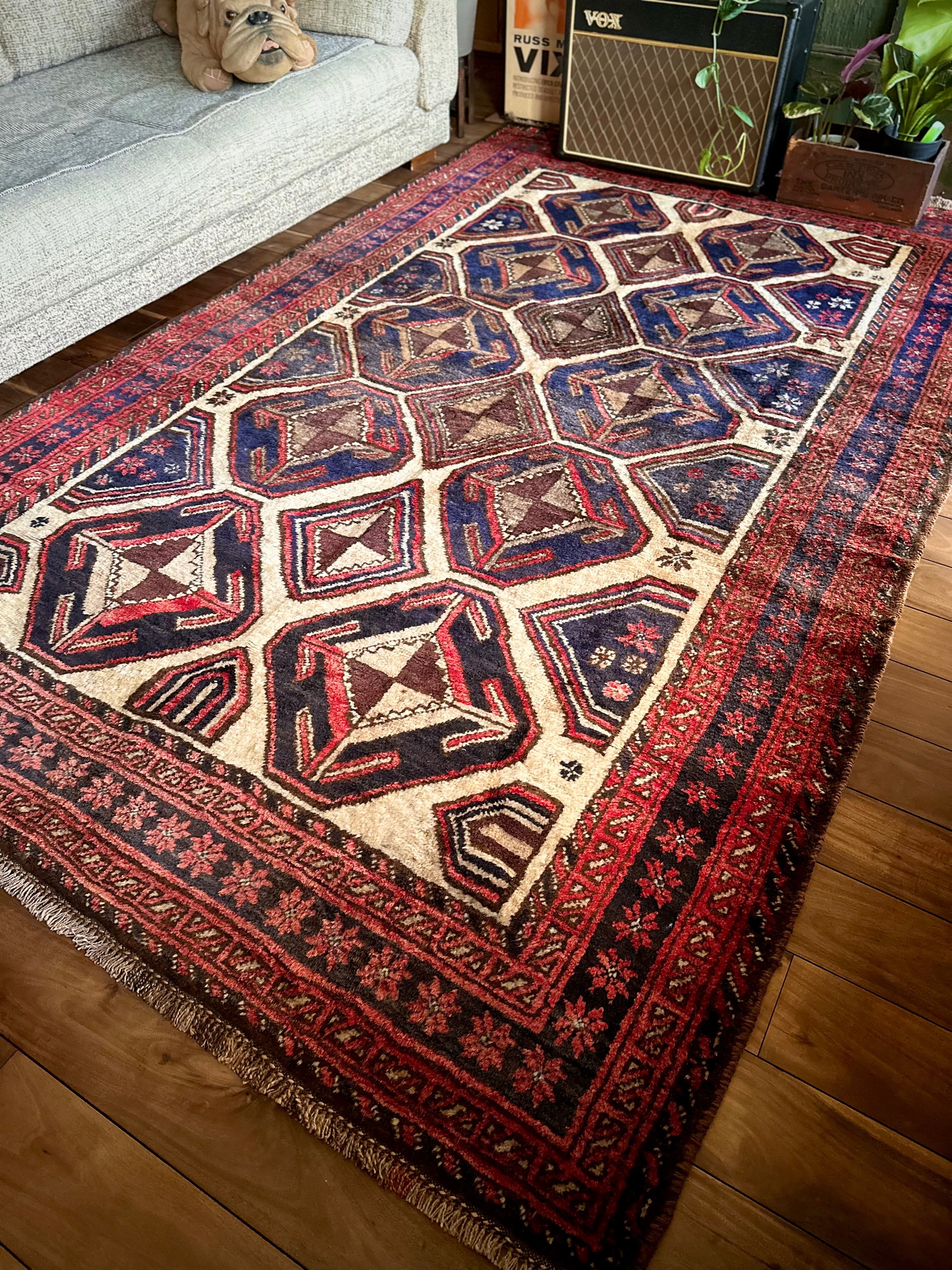 無染色のベージュのフィールドに描かれた子供の落書きの様な大胆な模様に惹かれるこちらは、アフガニスタンはヘラート州にて半遊牧生活を送るマルダリ・バルーチのトライバルラグで、リビングを占領するかなりの大判サイズのメインラグになります。