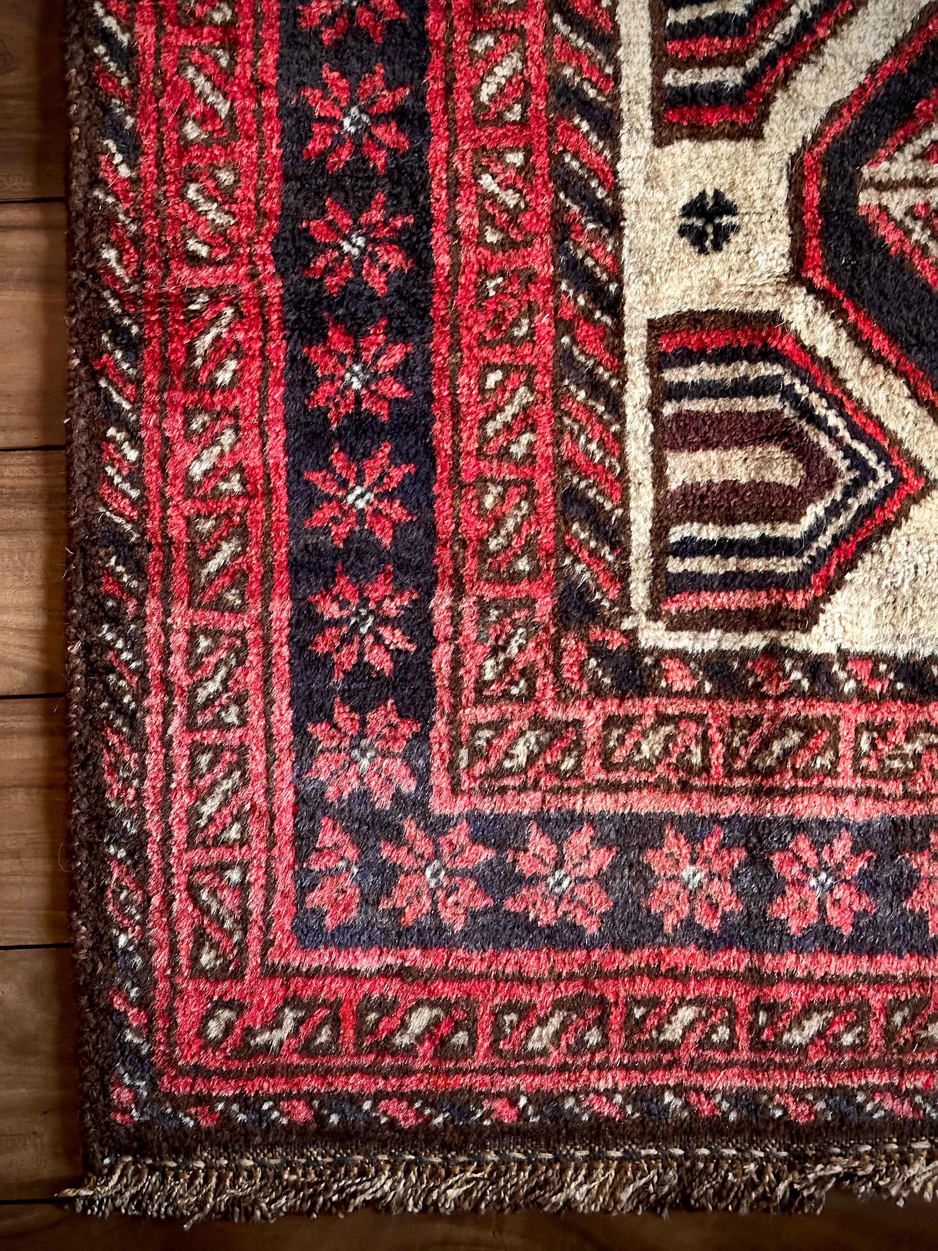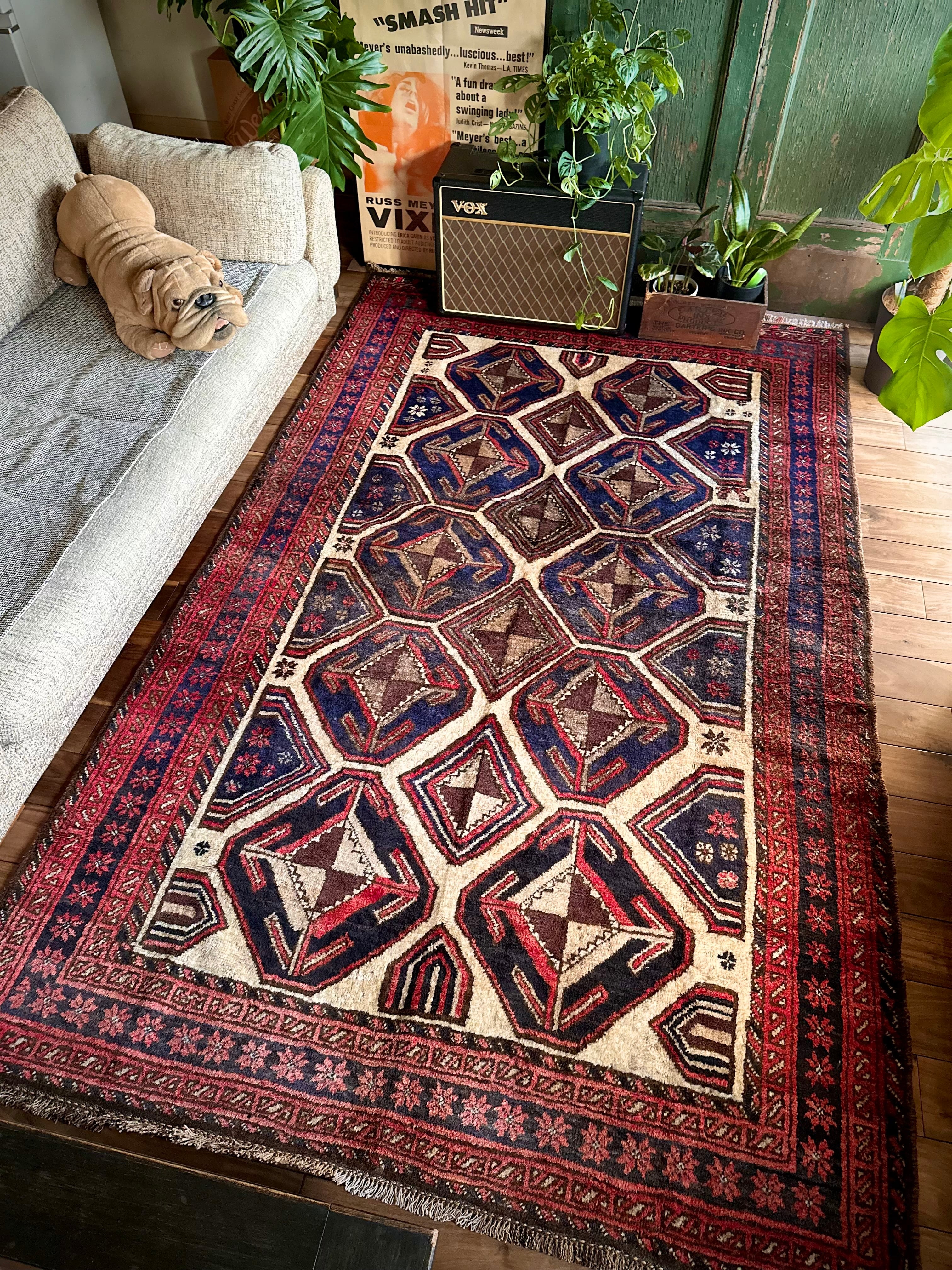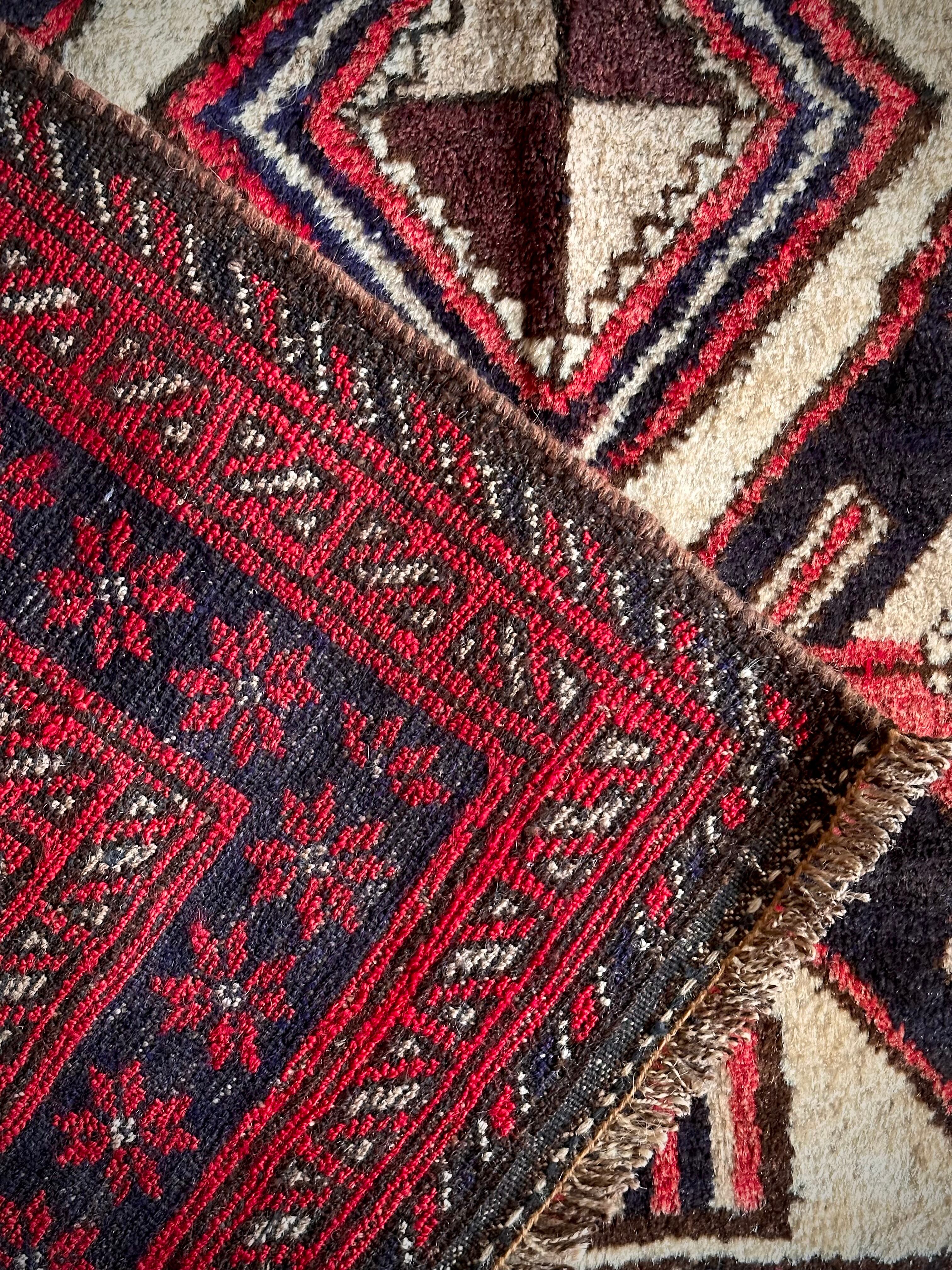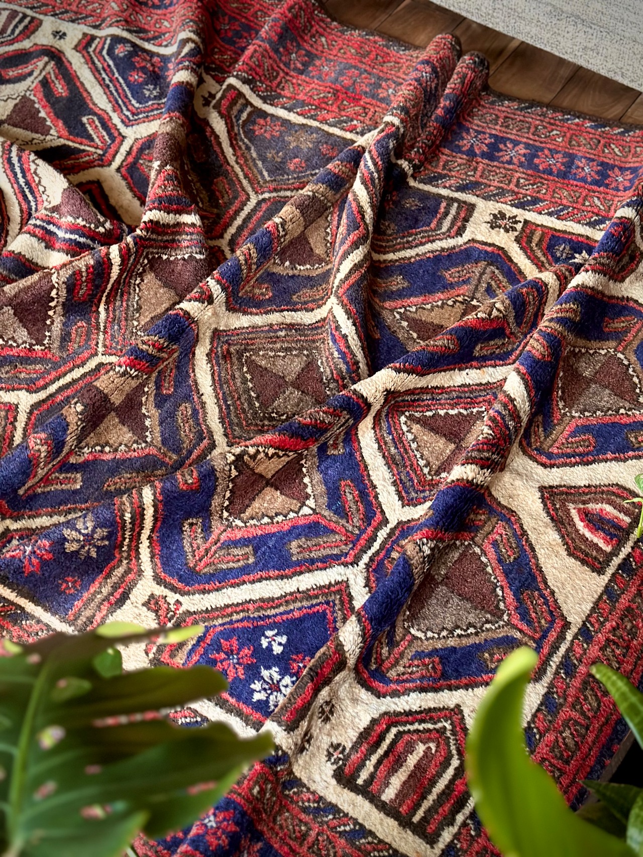 無染色のベージュのフィールドに描かれた子供の落書きの様な大胆な模様に惹かれるこちらは、アフガニスタンはヘラート州にて半遊牧生活を送るマルダリ・バルーチのトライバルラグで、リビングを占領するかなりの大判サイズのメインラグになります。