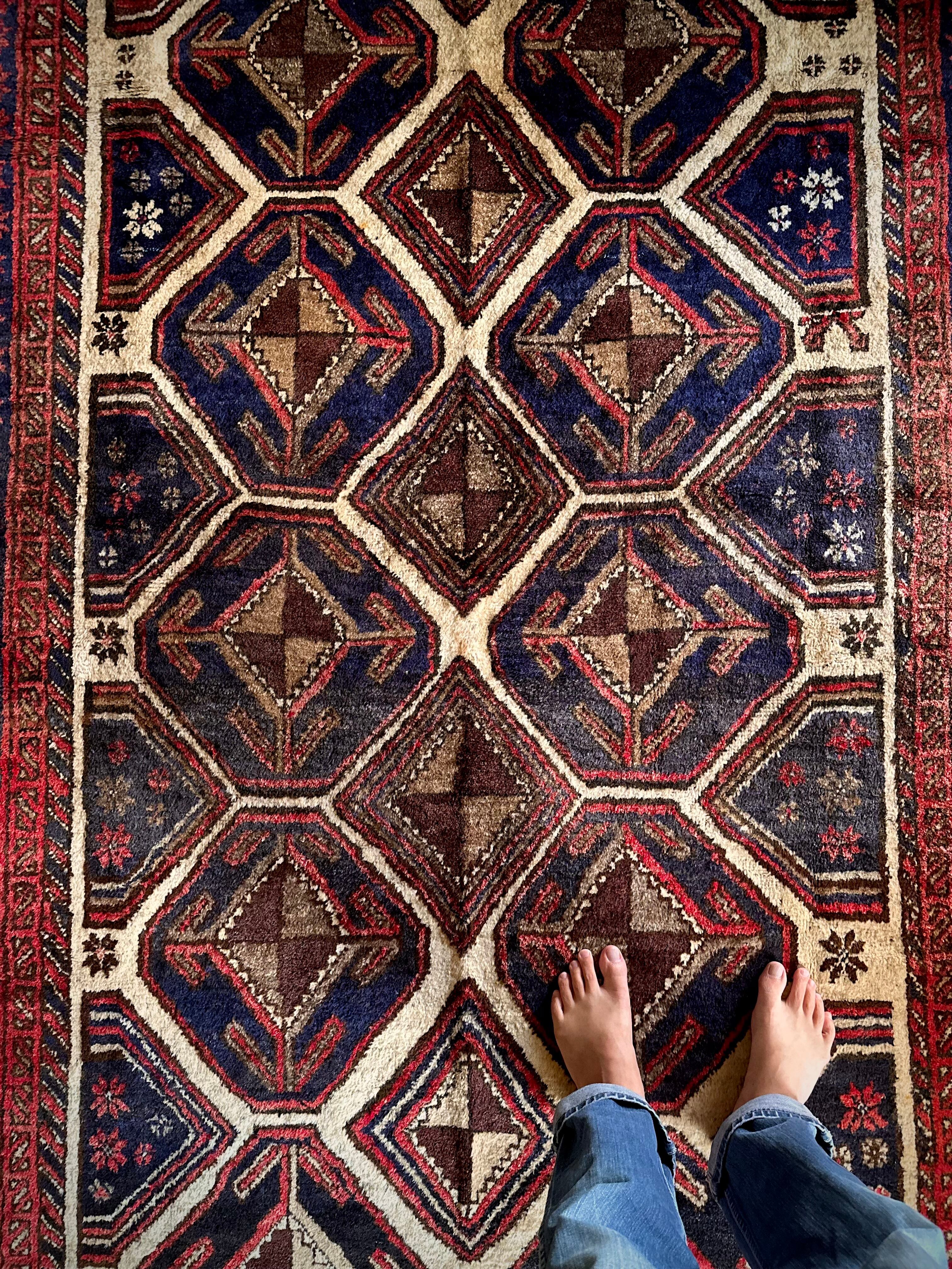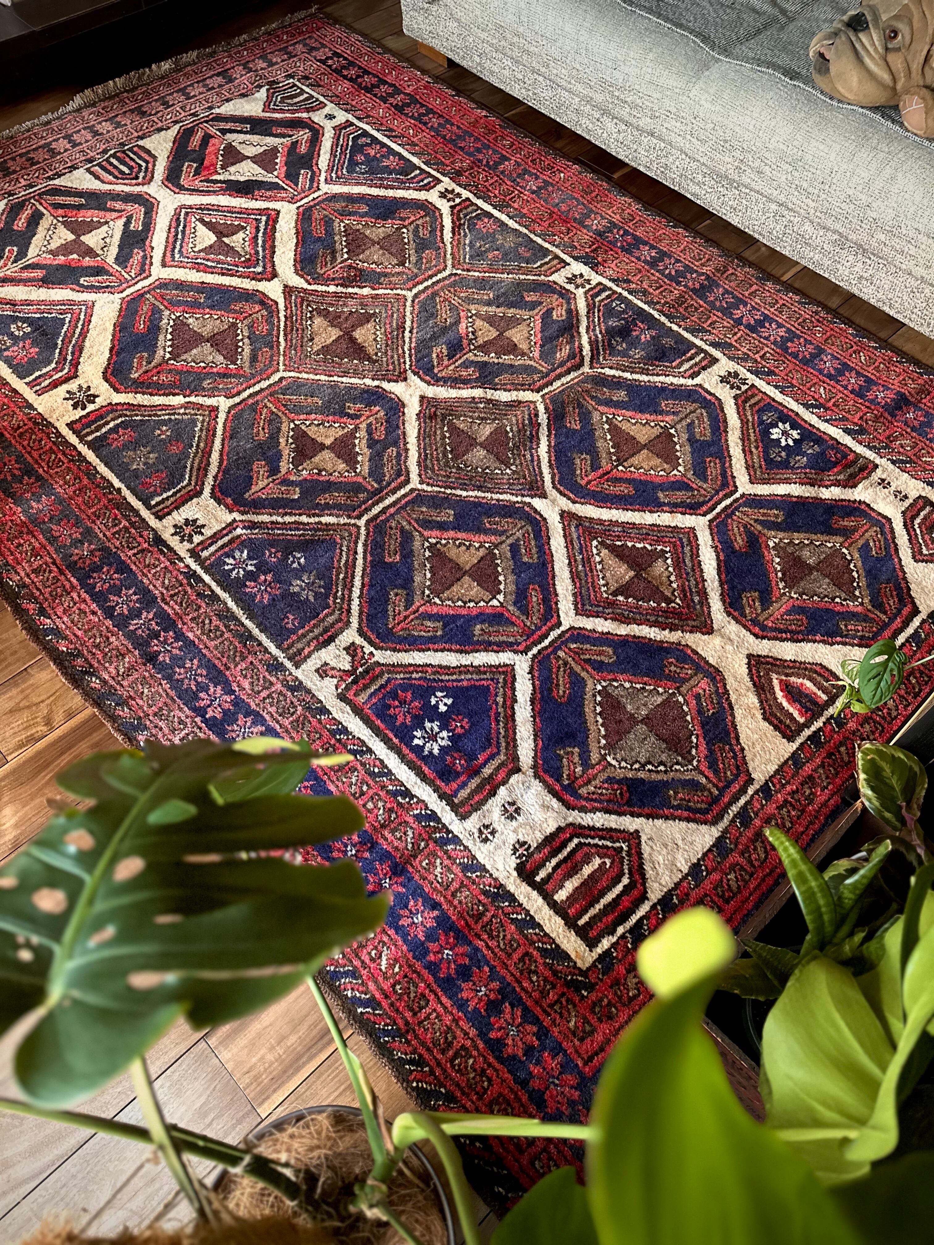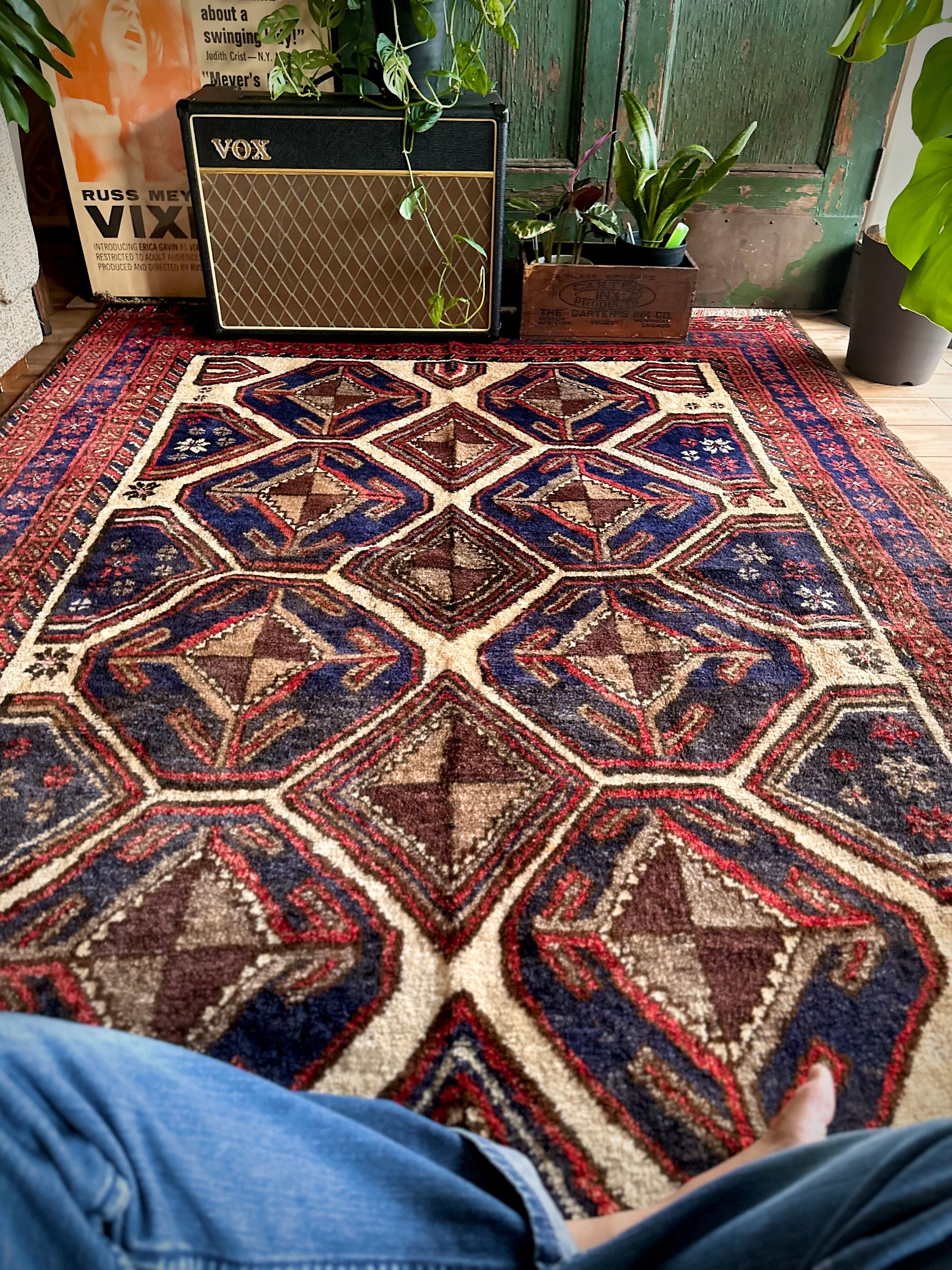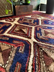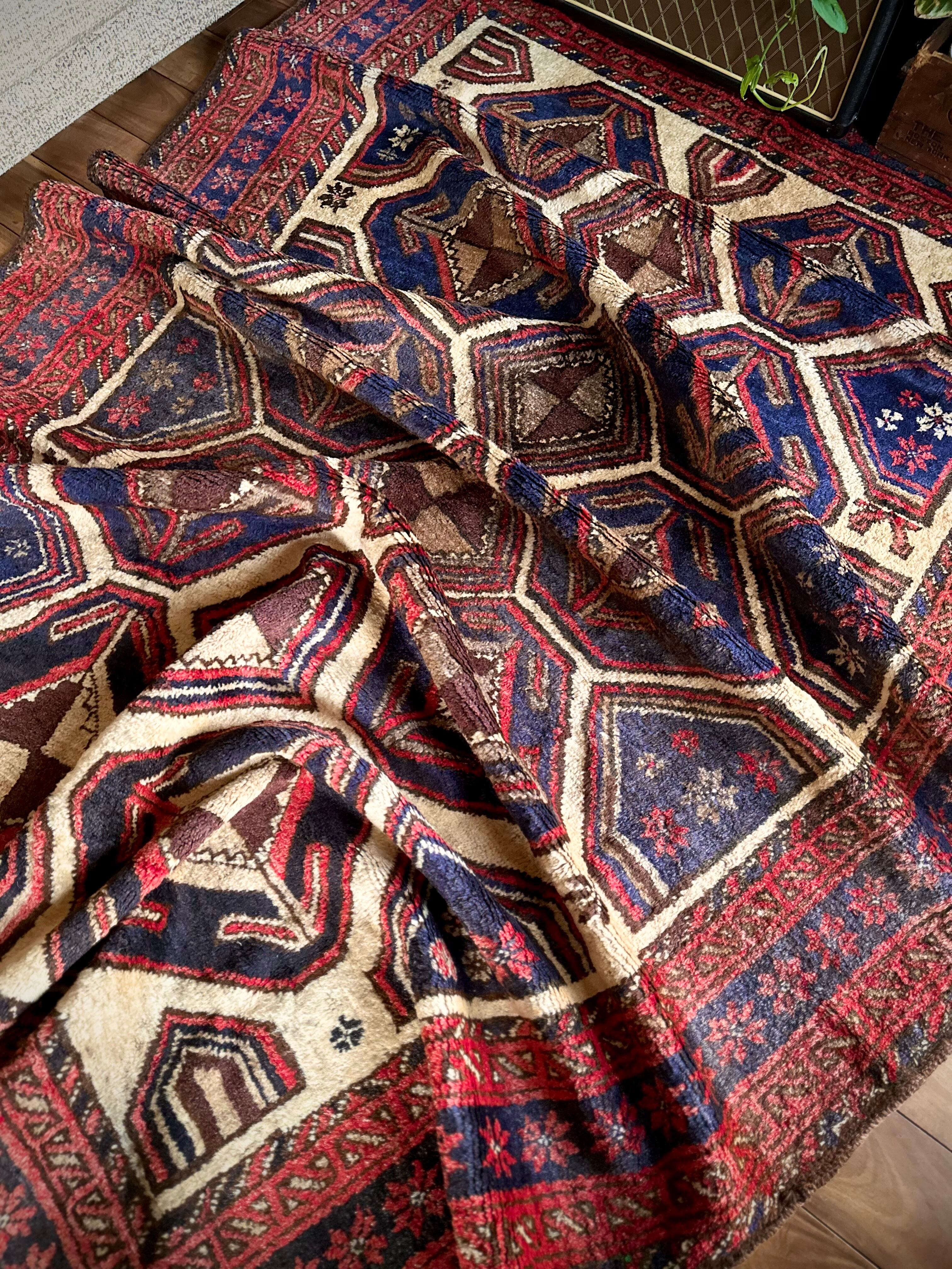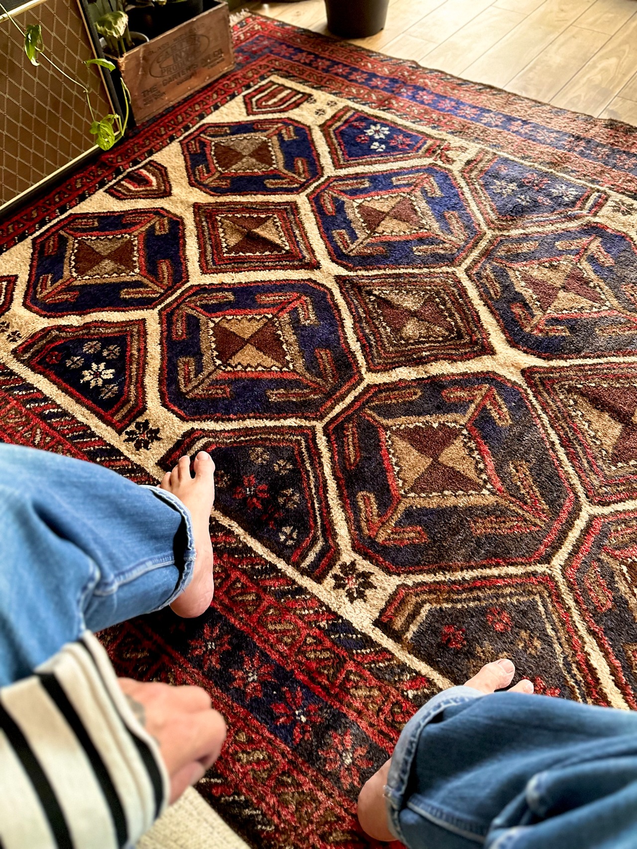 最後にラグそのものに関しては羊毛特有の匂いがあり、採寸は中央付近で計測していますが、手織りならではの歪みによる誤差や水洗いクリーニングによる縮み、また草木染めによる経年劣化の色ムラなどがありますが、それもまたヴィンテージラグの魅力かとご理解ください。