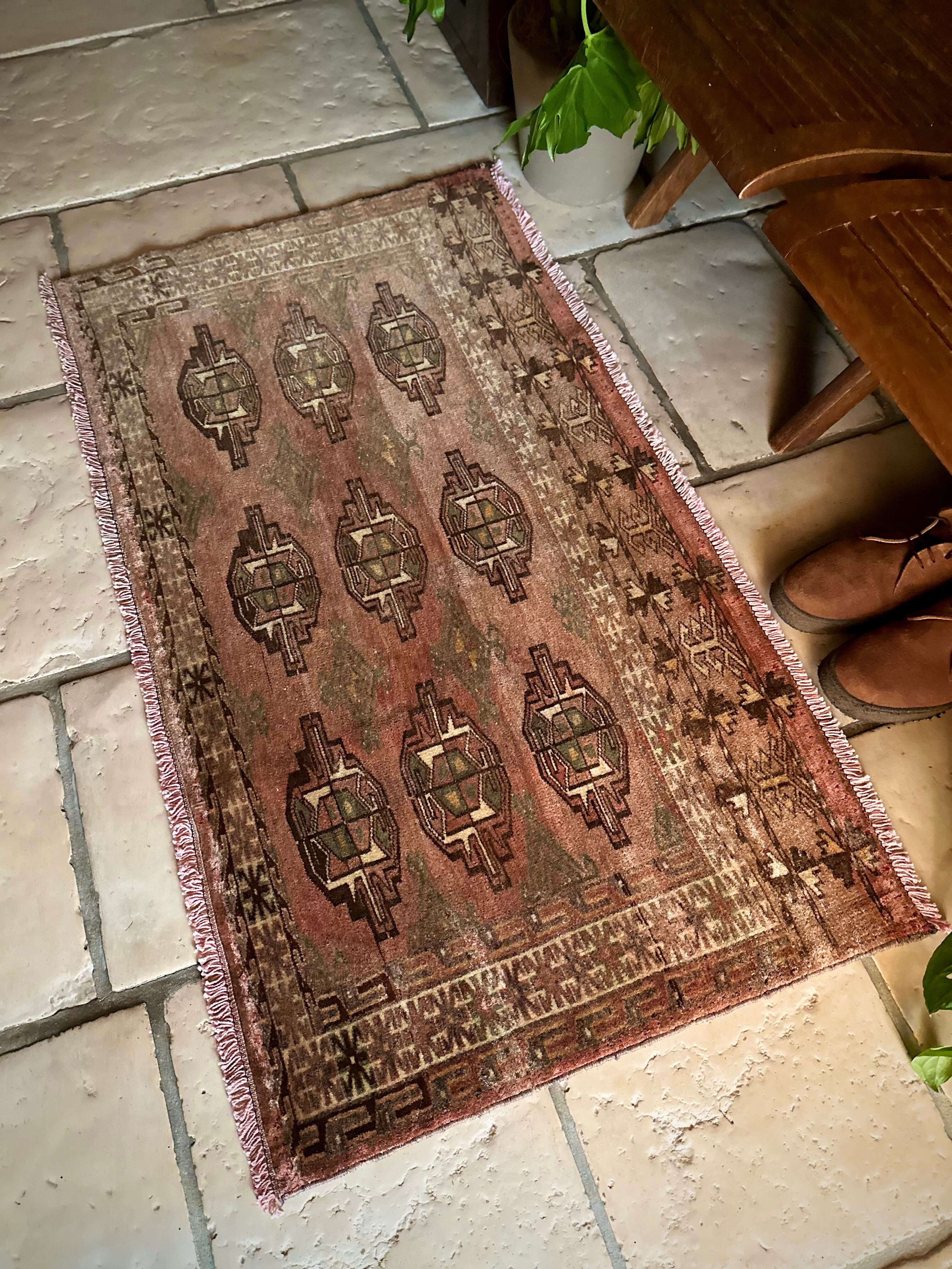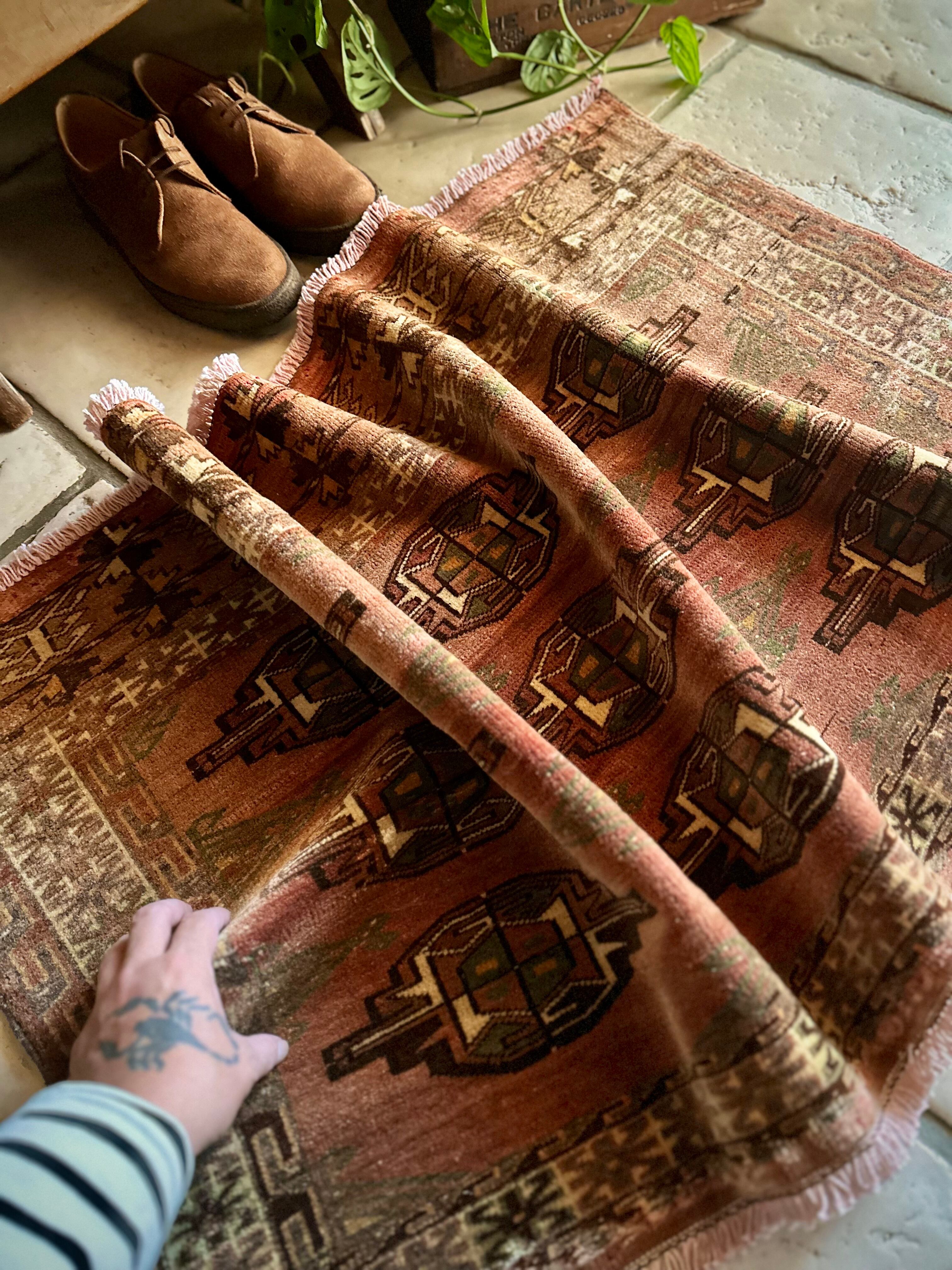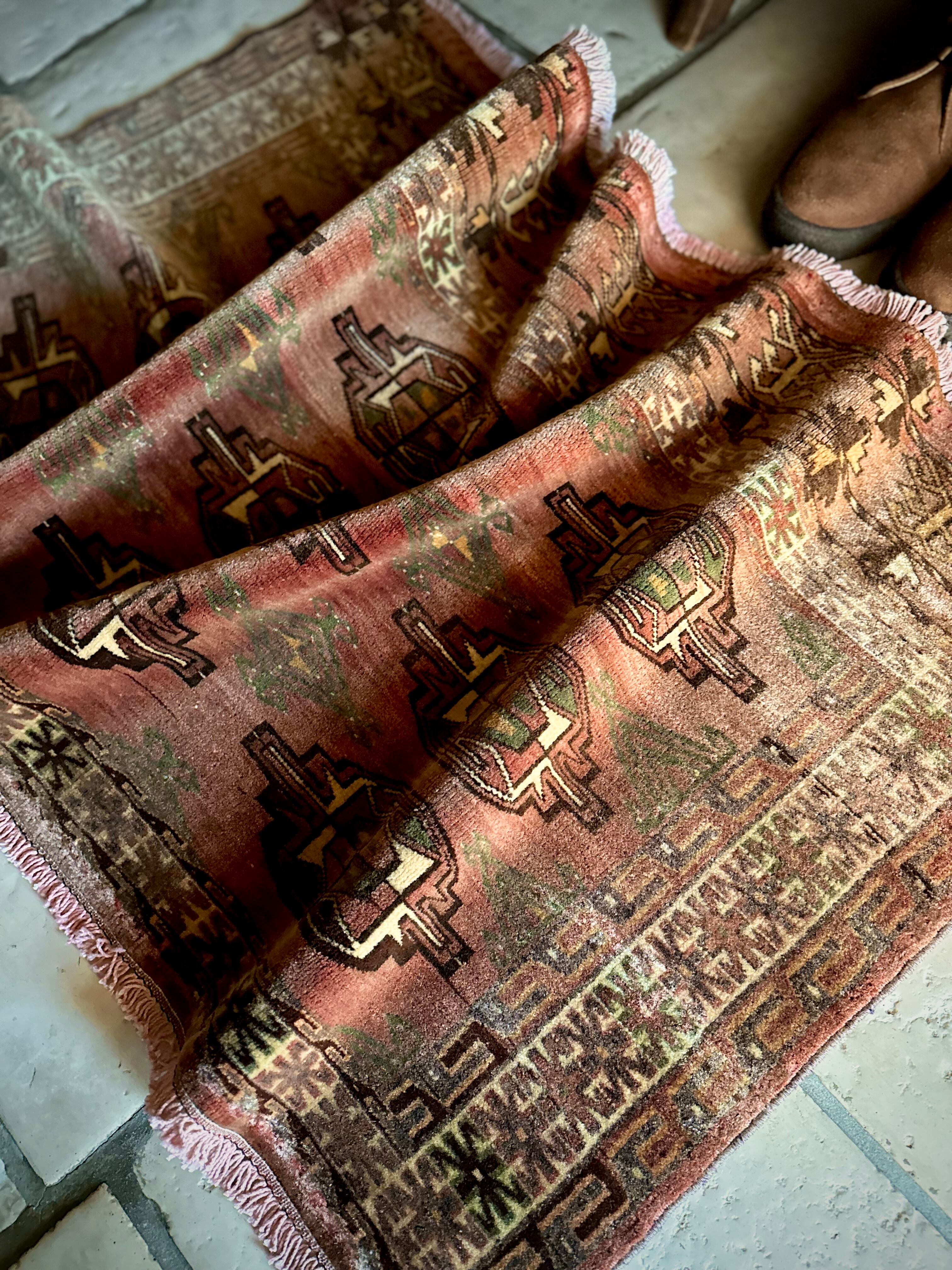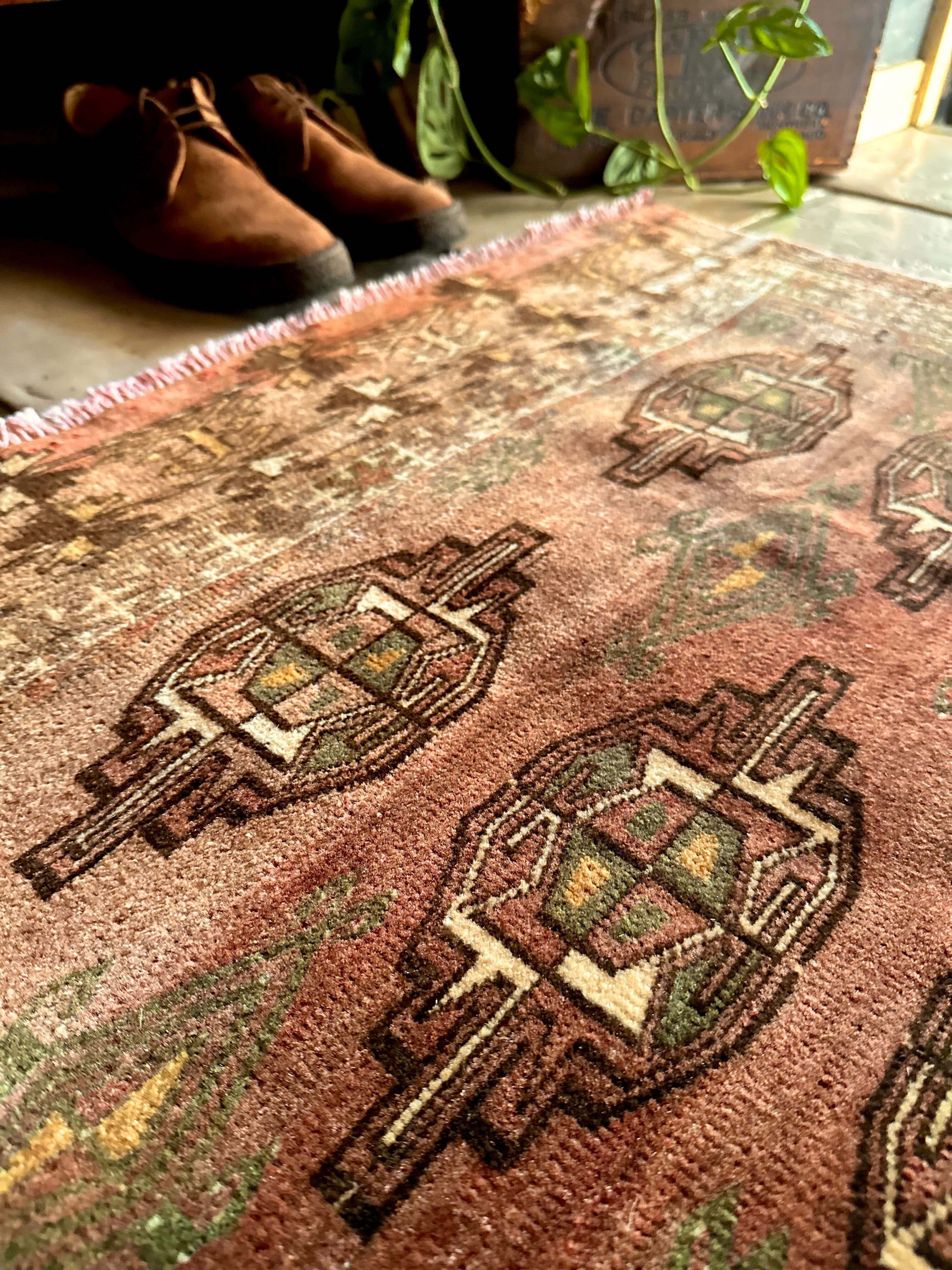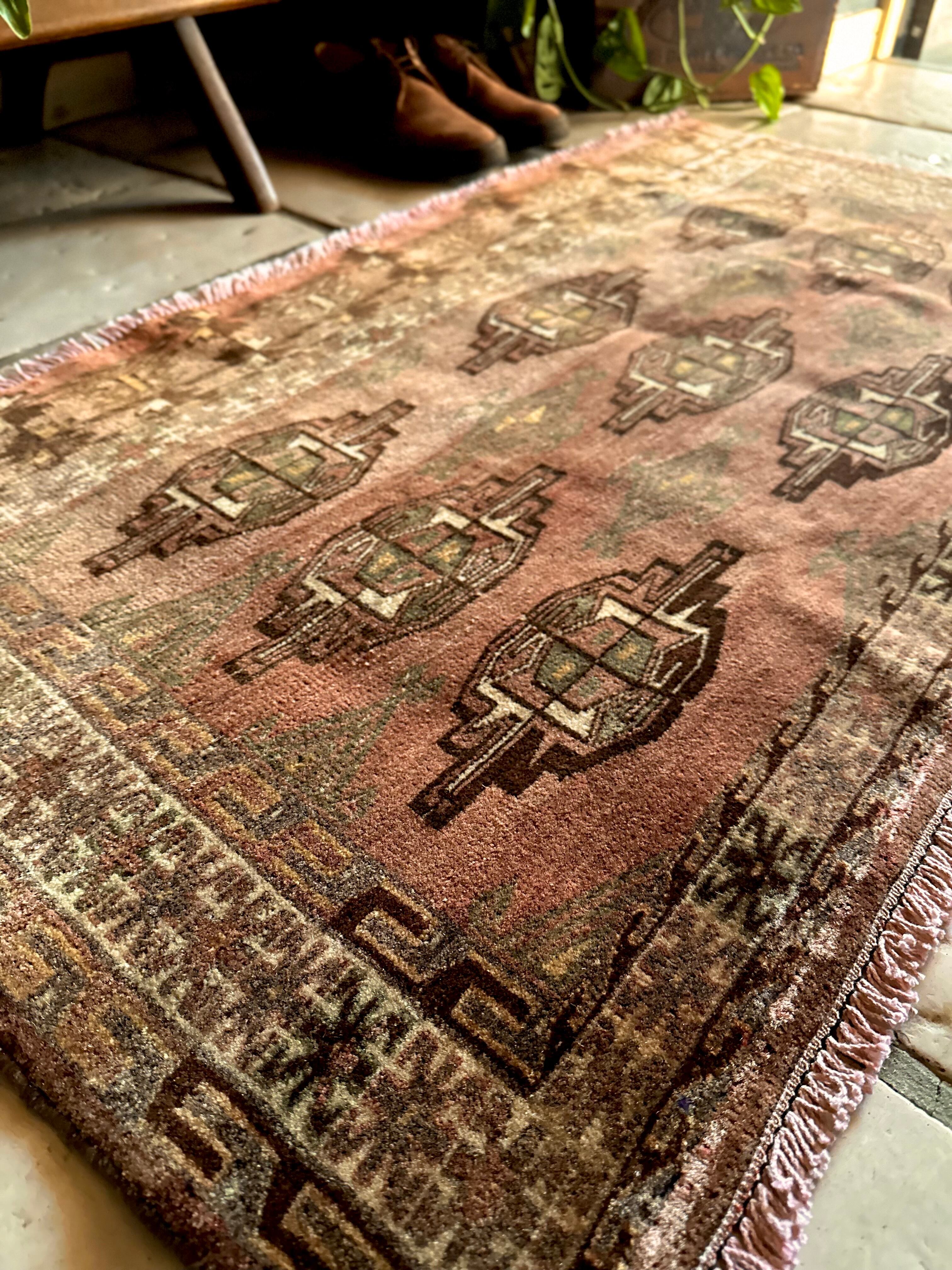 最後にラグそのものに関しては羊毛特有の匂いがあり、採寸は中央付近で計測していますが、手織りならではの歪みによる誤差や水洗いクリーニングによる縮み、また草木染めによる経年劣化の色ムラなどがありますが、それもまたヴィンテージラグの魅力かとご理解ください。