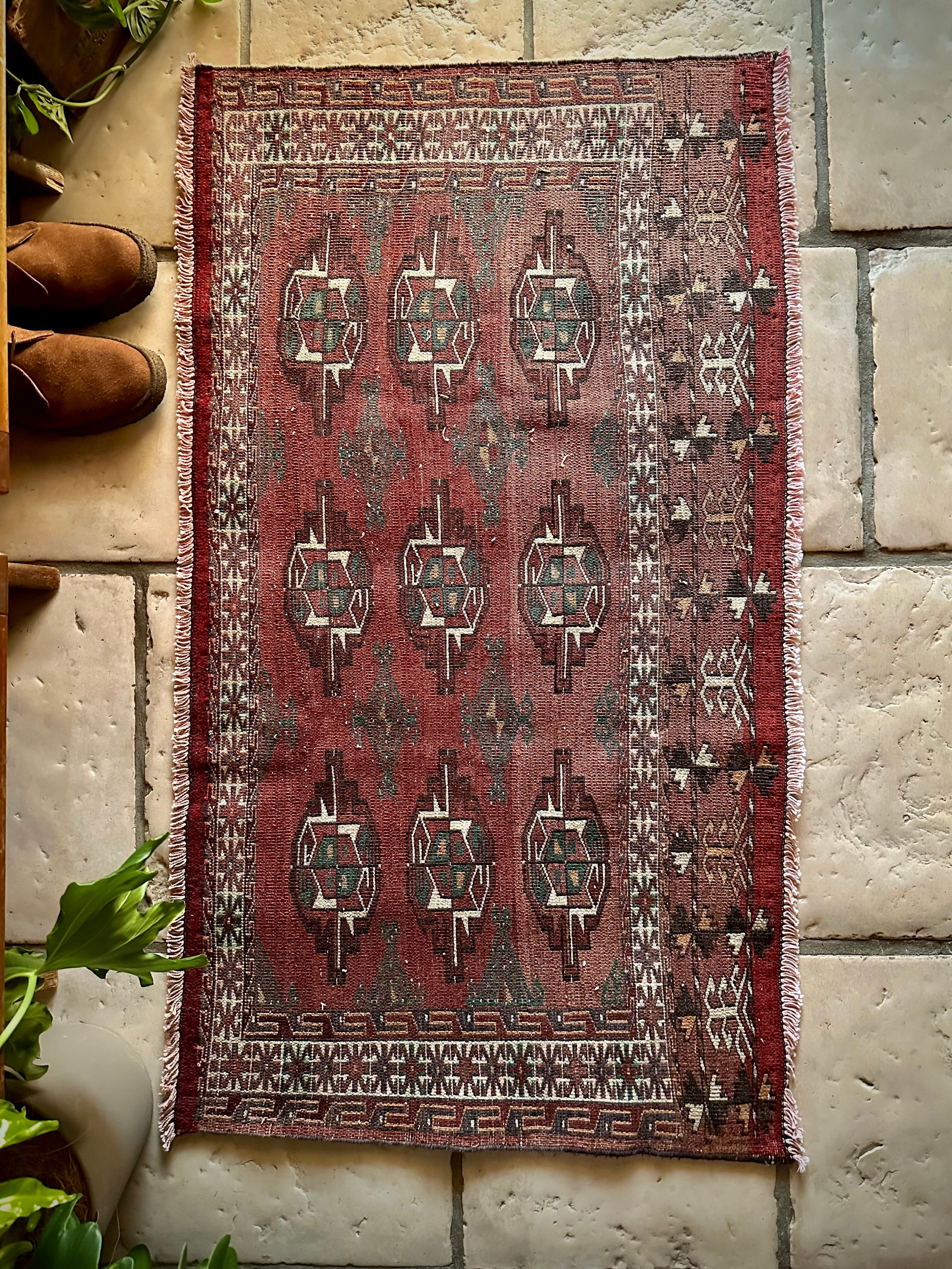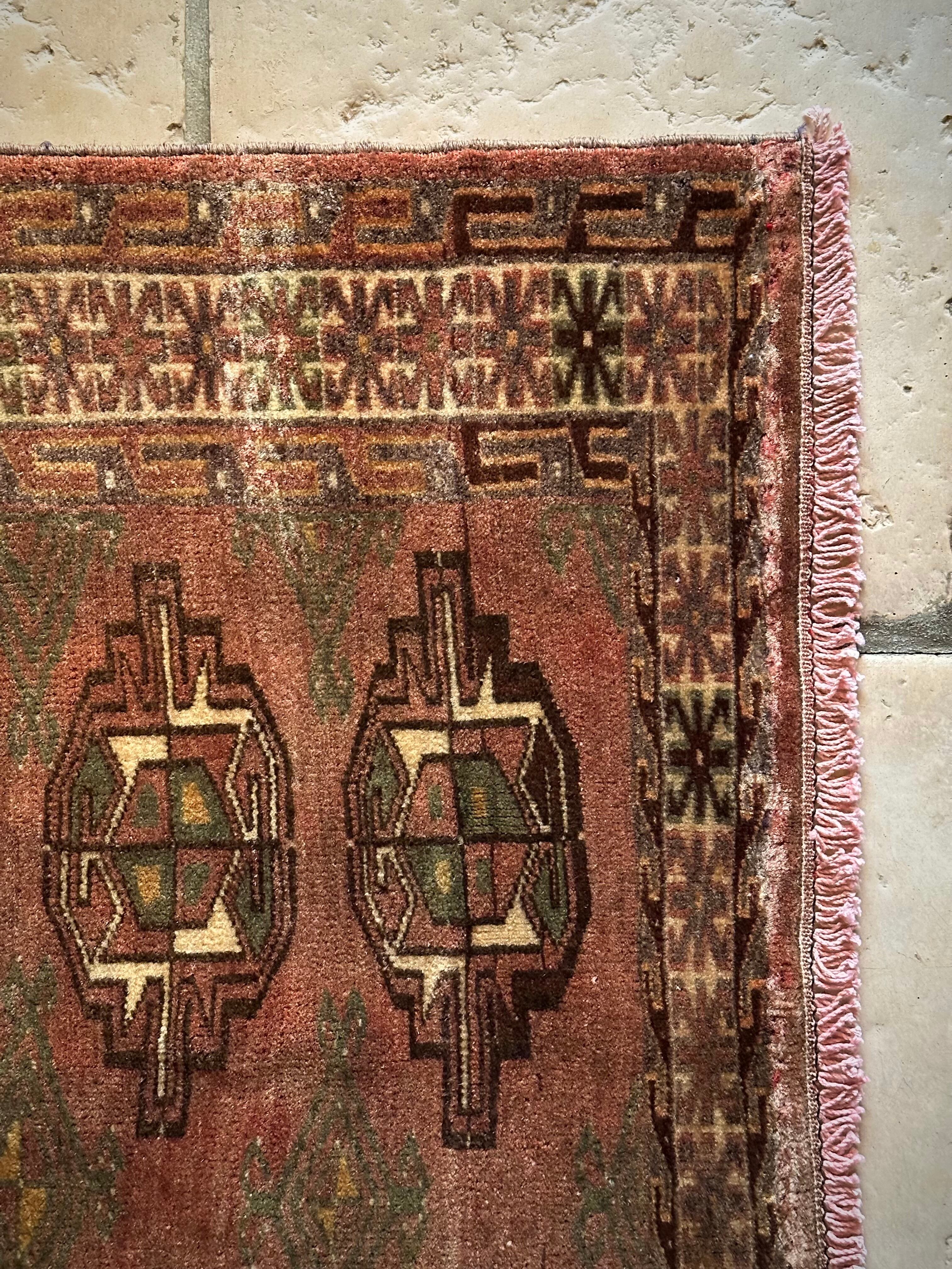 見る方向によって色の違いがありますが、かなり使い込まれた味わいで裏面の色からして褪せた様子が伺えるでしょうか。チュワルならではの長手にフリンジが付いた仕様なので壁に飾ってもかっこよく、床に敷いてもしっかりとした厚みがありますが、若干の歪みがありますので画像をご確認ください。
