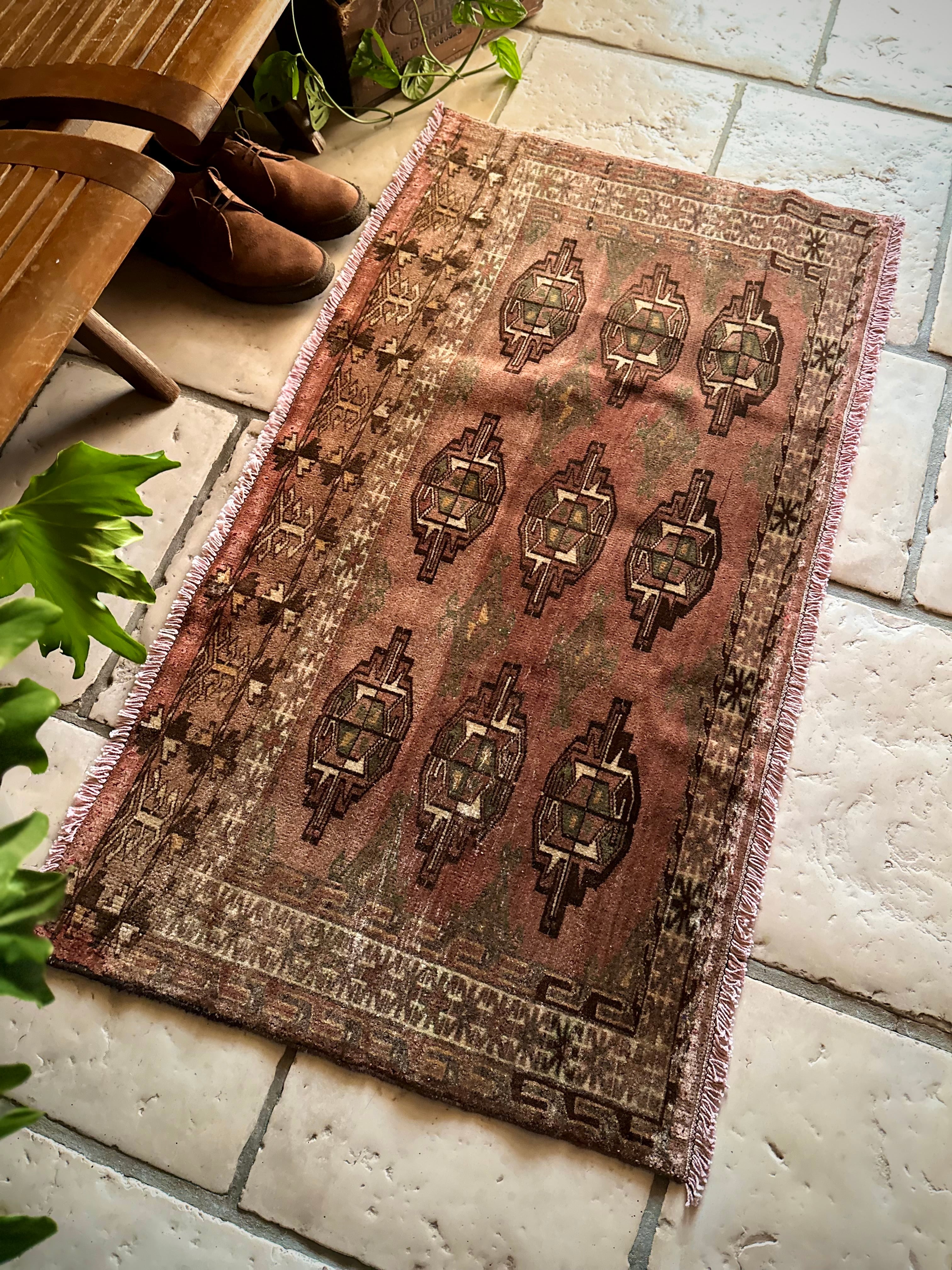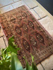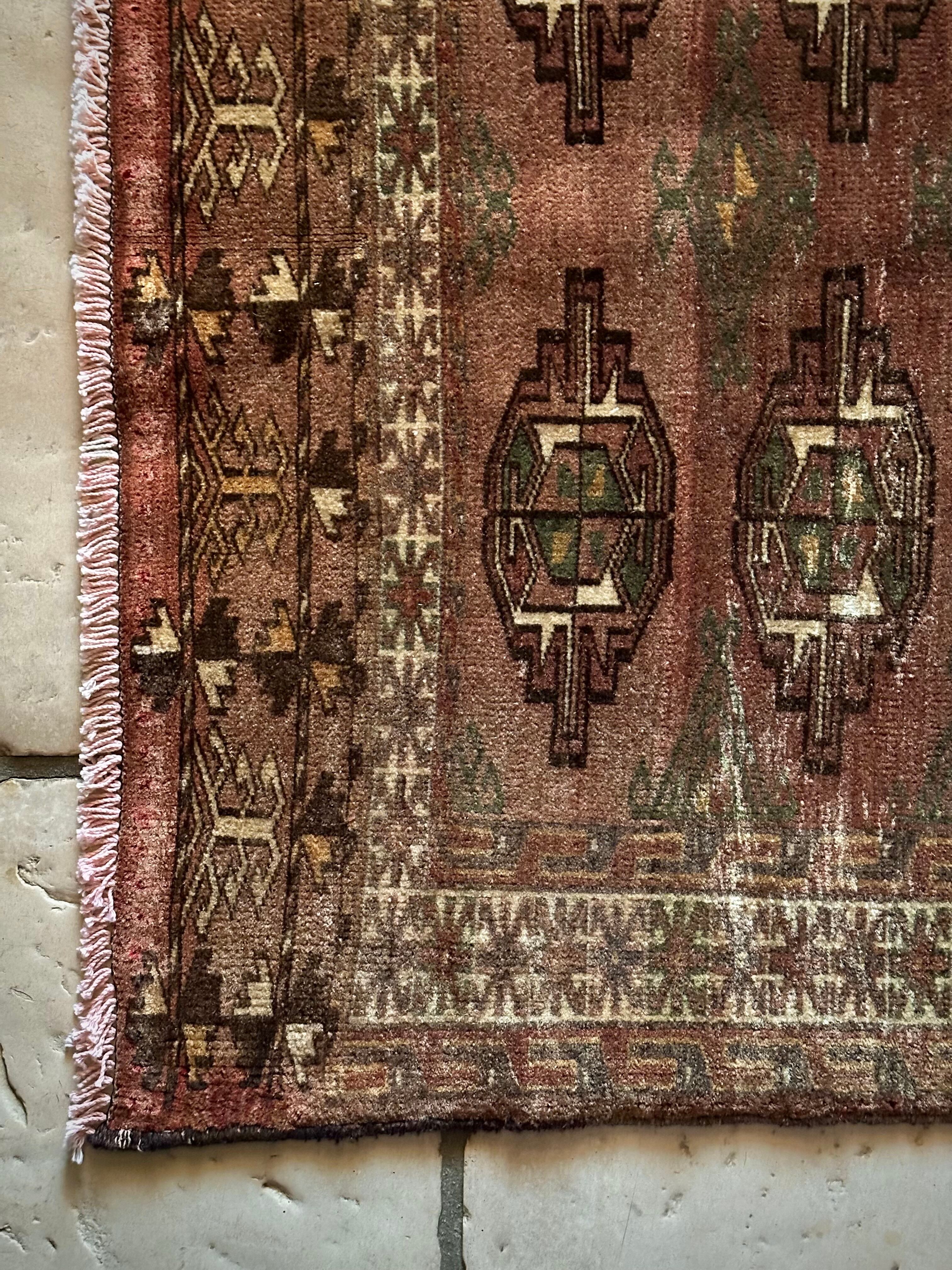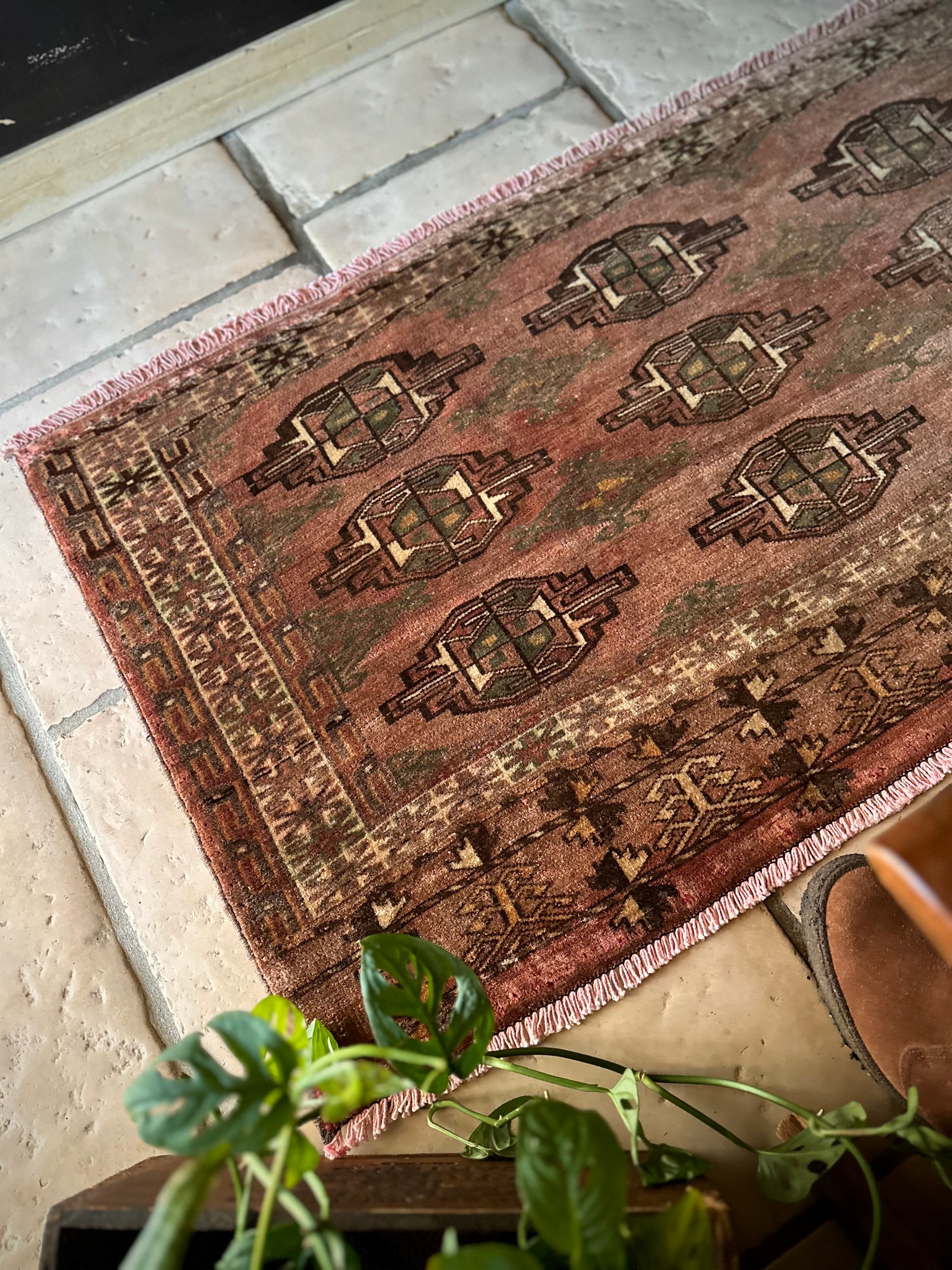 赤茶けたブラウンからコーヒーブラウンへの見事なアブラッシュの変化が素晴らしいこちらは、イラン北東部に居住する数少ないトルクメン族のトライバルラグで、元々は穀物や家財道具などを収納するチュワルと呼ばれる袋物の表皮になります。