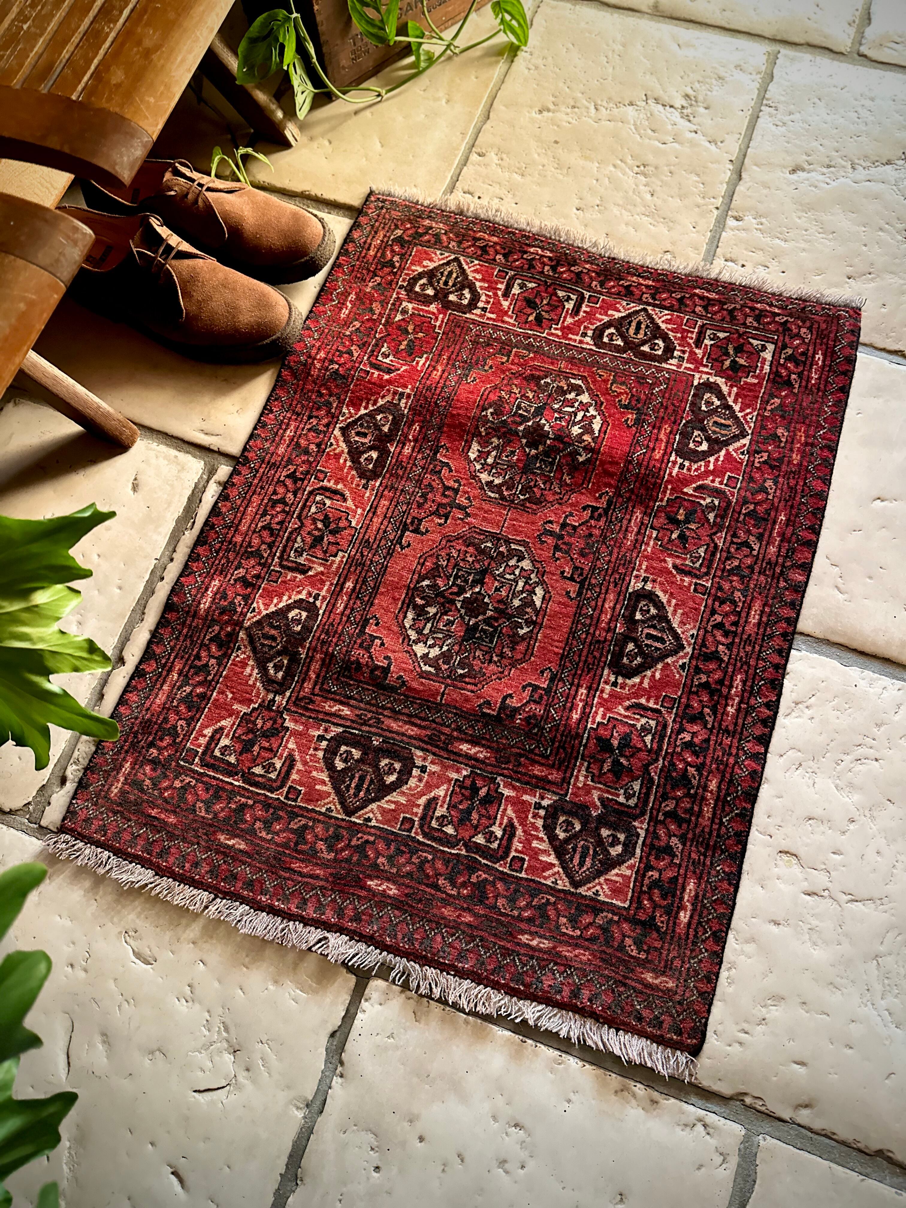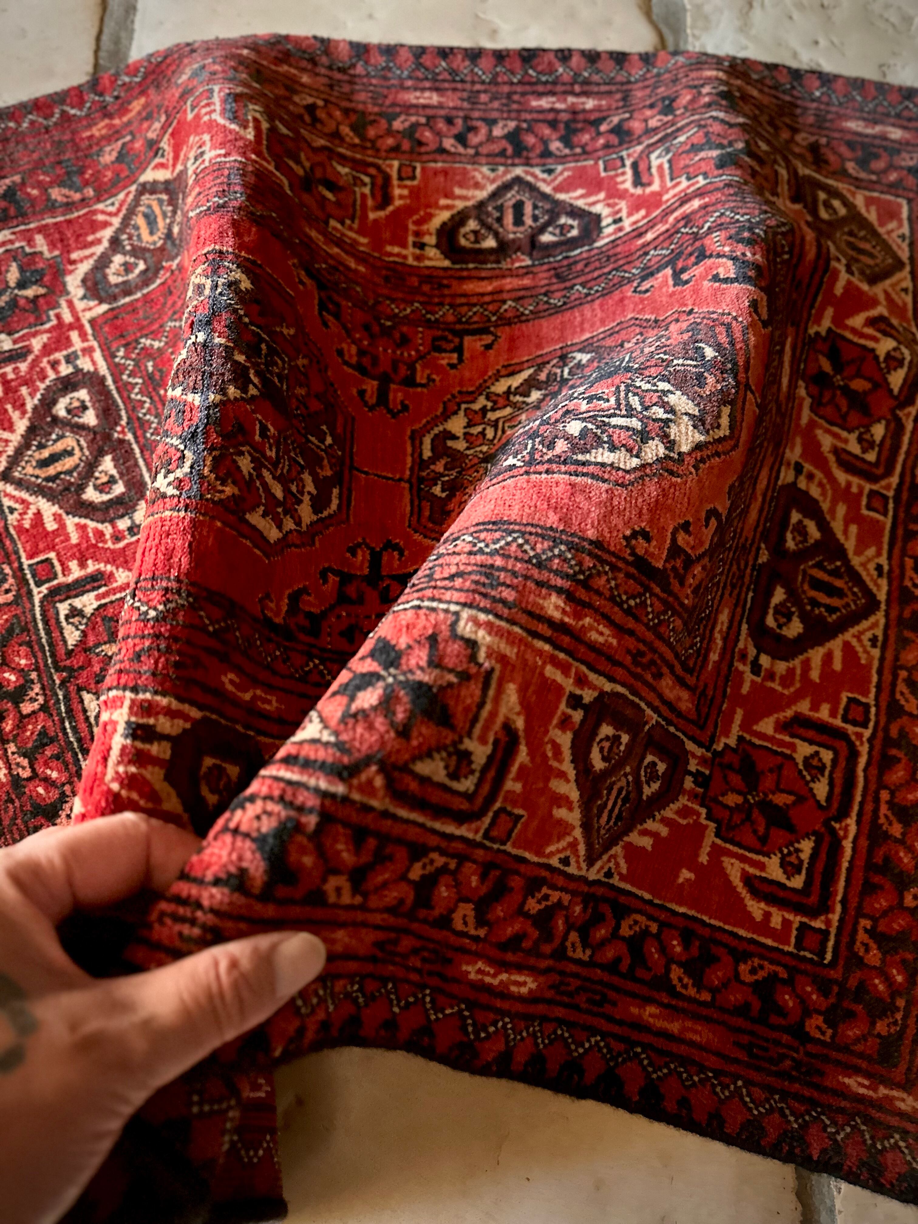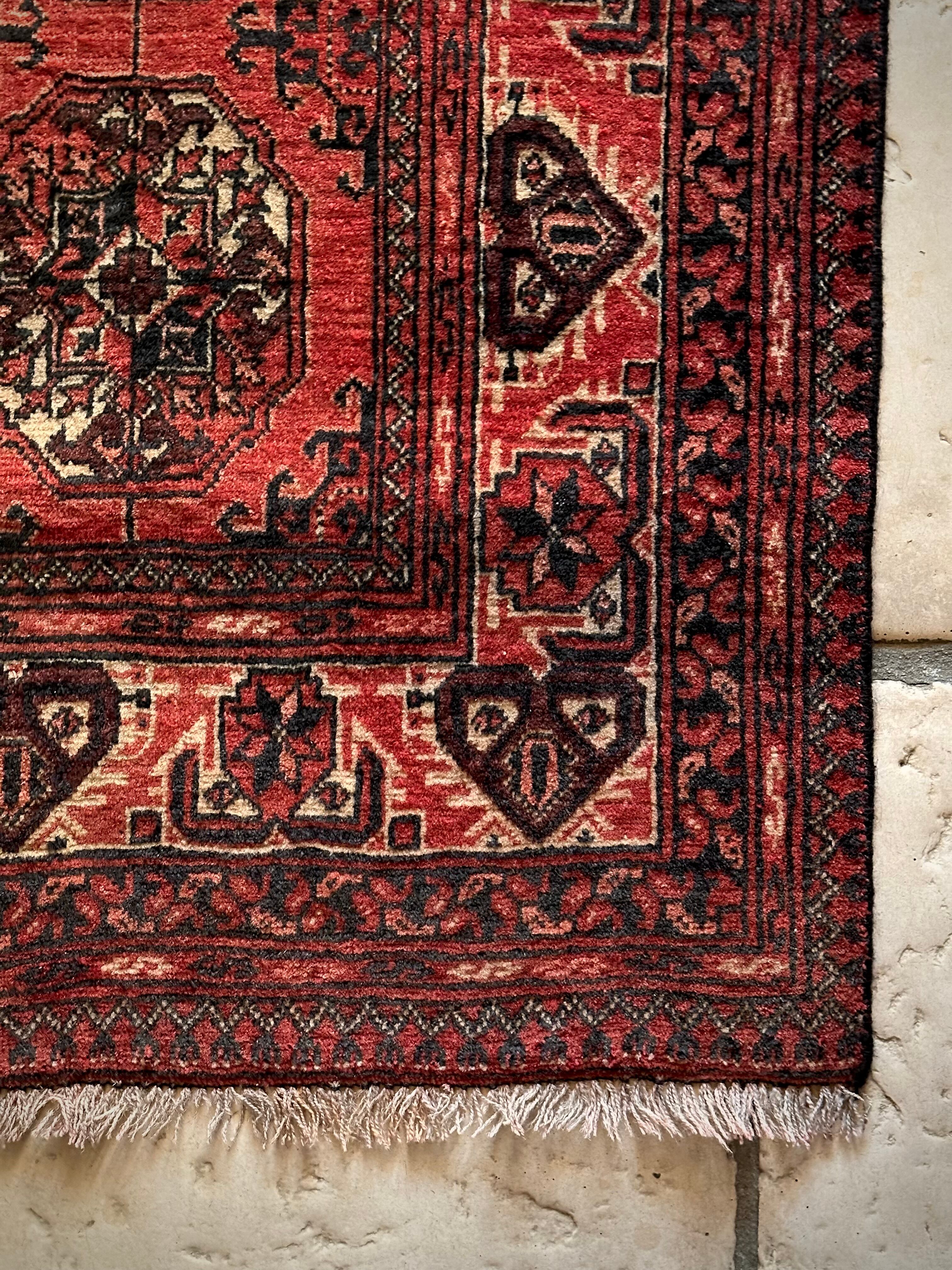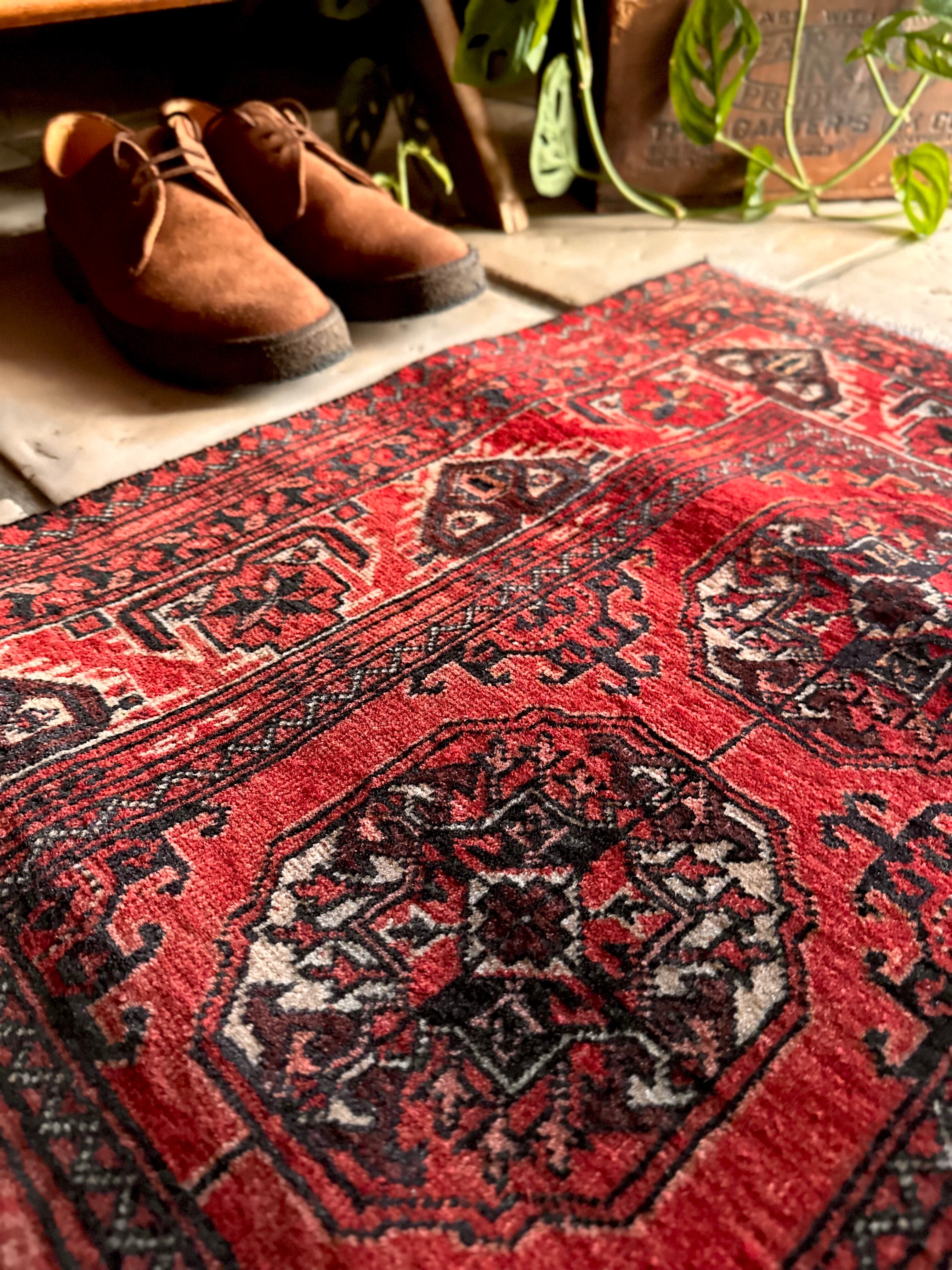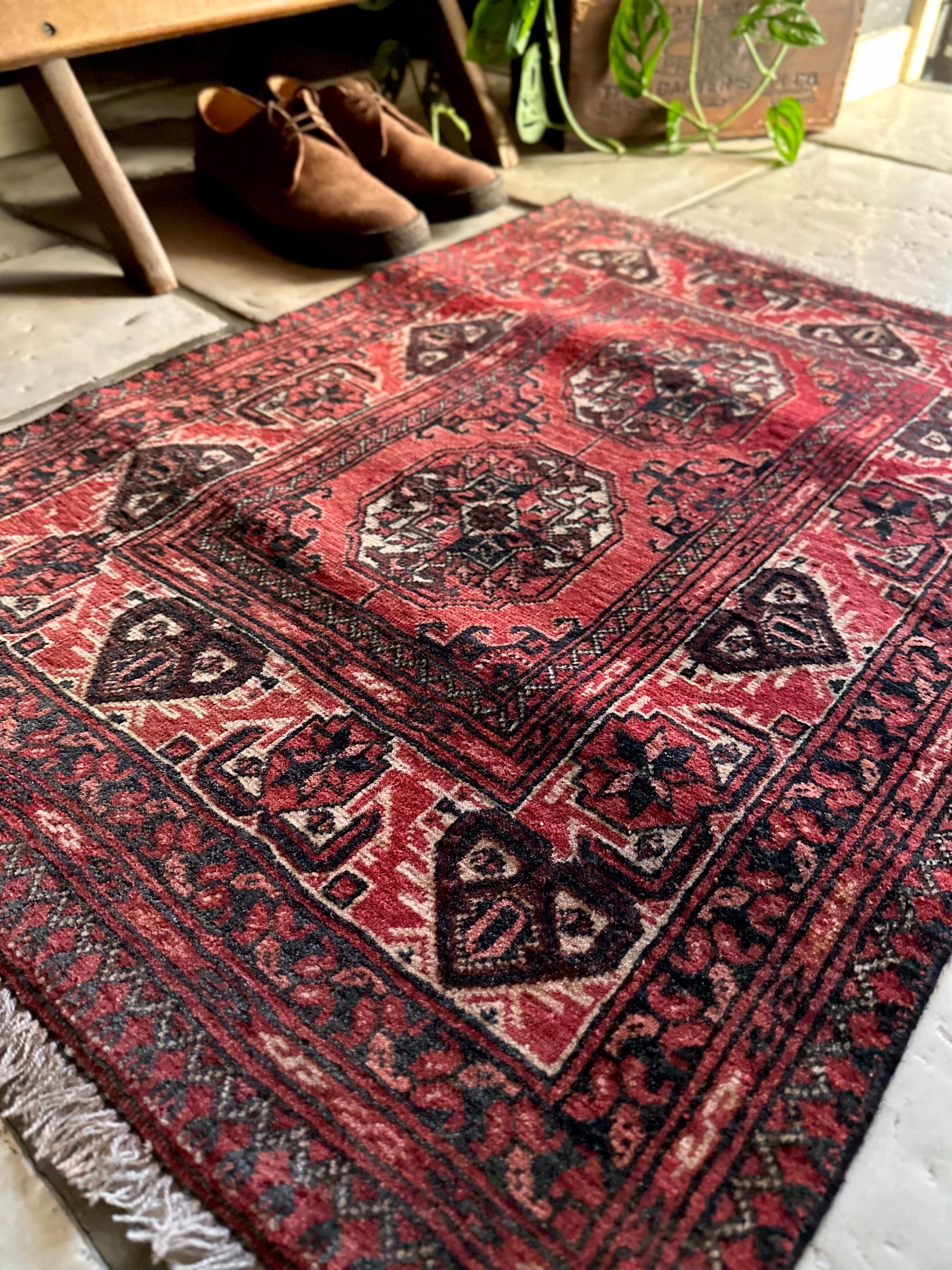 夕陽に照らされた真っ赤な色彩美に見慣れた由緒あるテッケギュルが鎮座するこちらは、アフガニスタン北部に居住するトルクメン族のトライバルラグで、小さいながらも強烈なインパクトを放つその見た目にやられてしまう1枚になります。