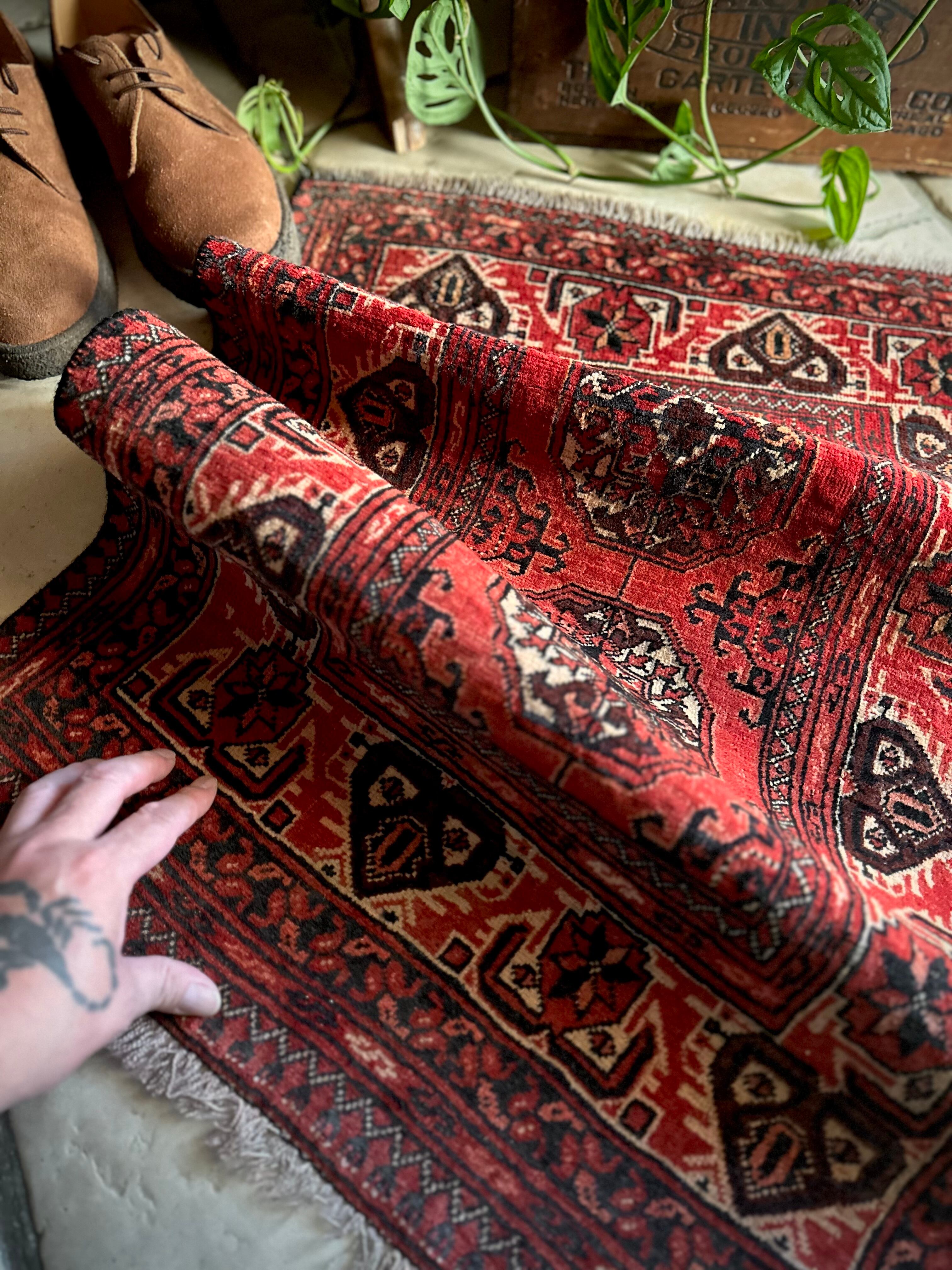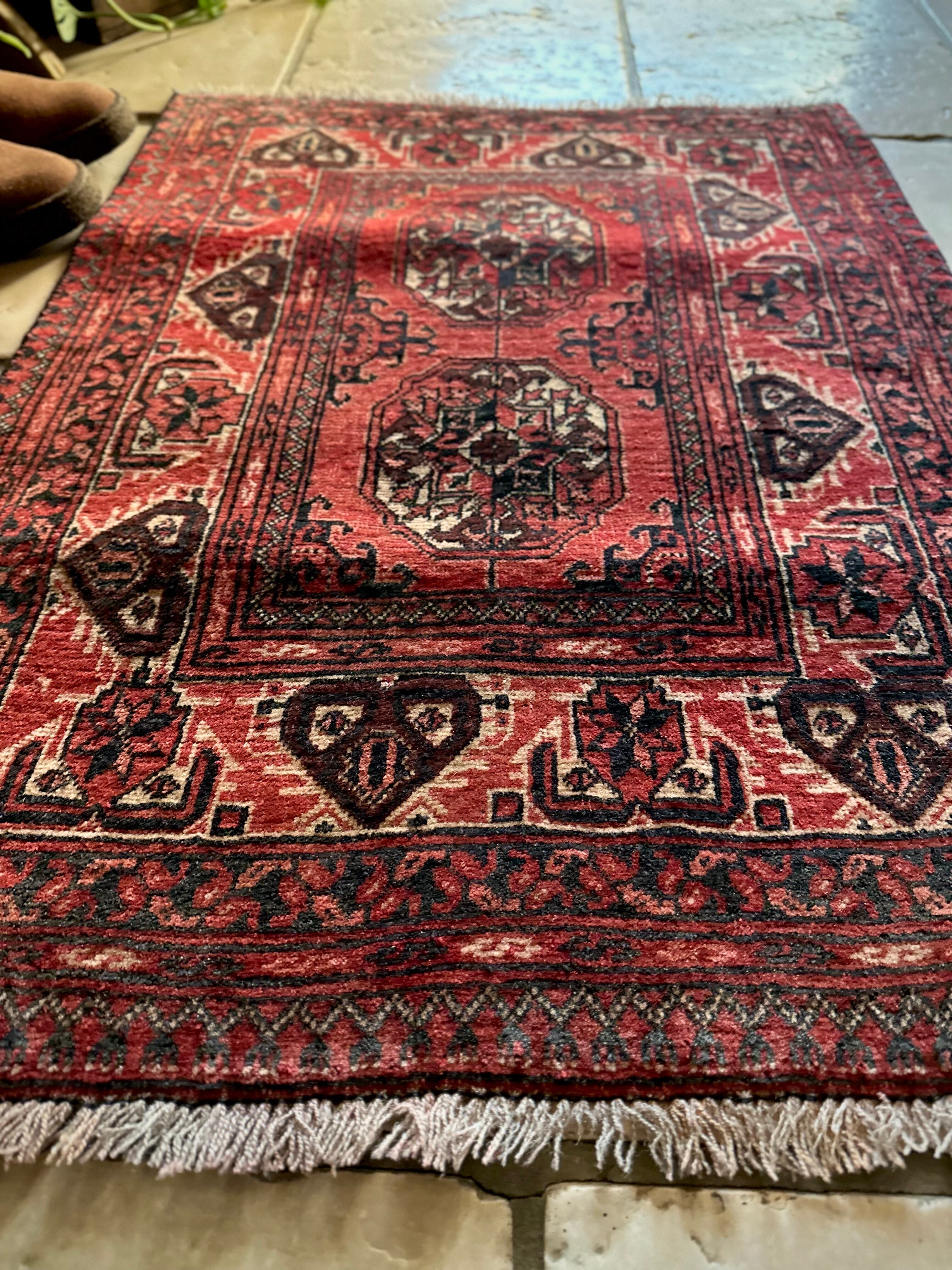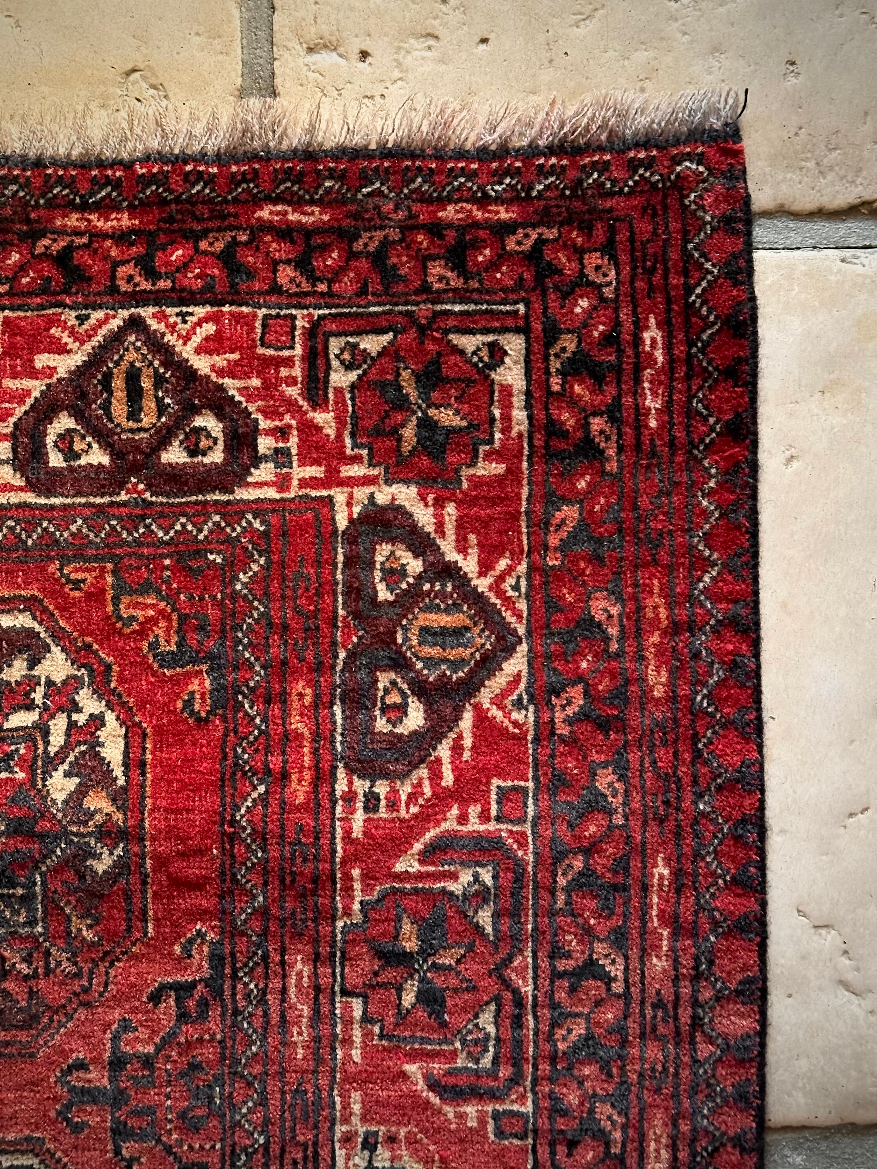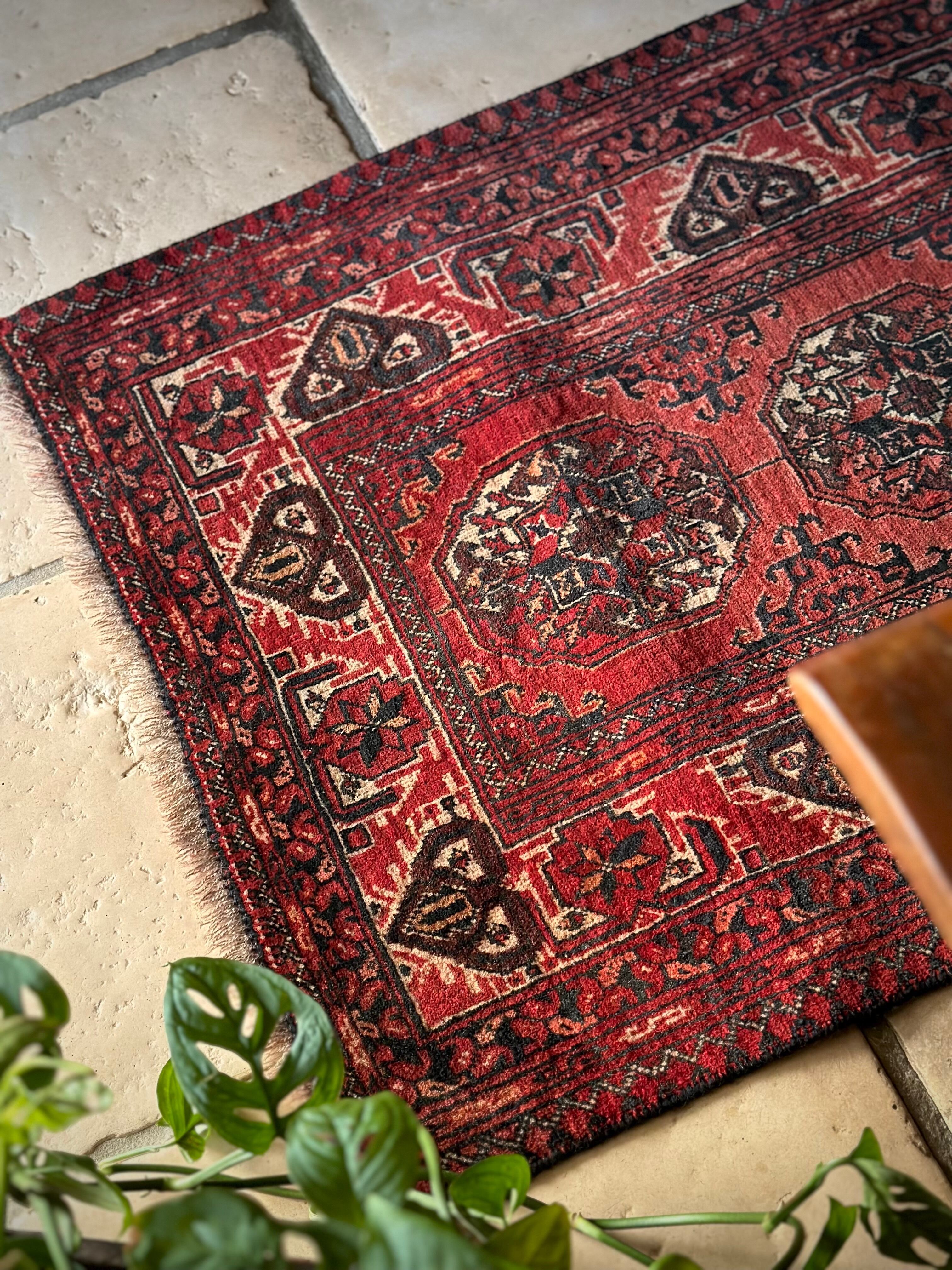 夕陽に照らされた真っ赤な色彩美に見慣れた由緒あるテッケギュルが鎮座するこちらは、アフガニスタン北部に居住するトルクメン族のトライバルラグで、小さいながらも強烈なインパクトを放つその見た目にやられてしまう1枚になります。