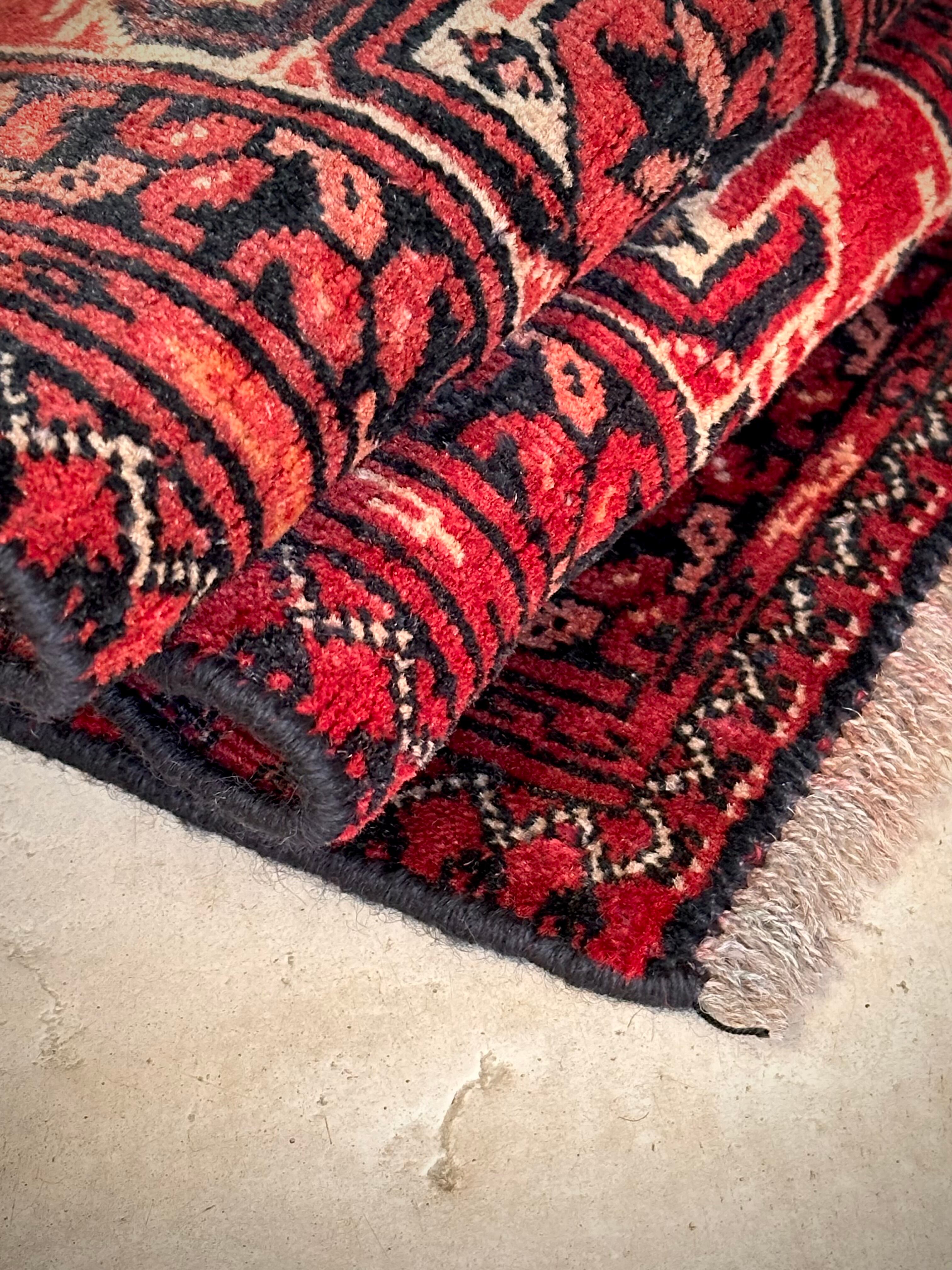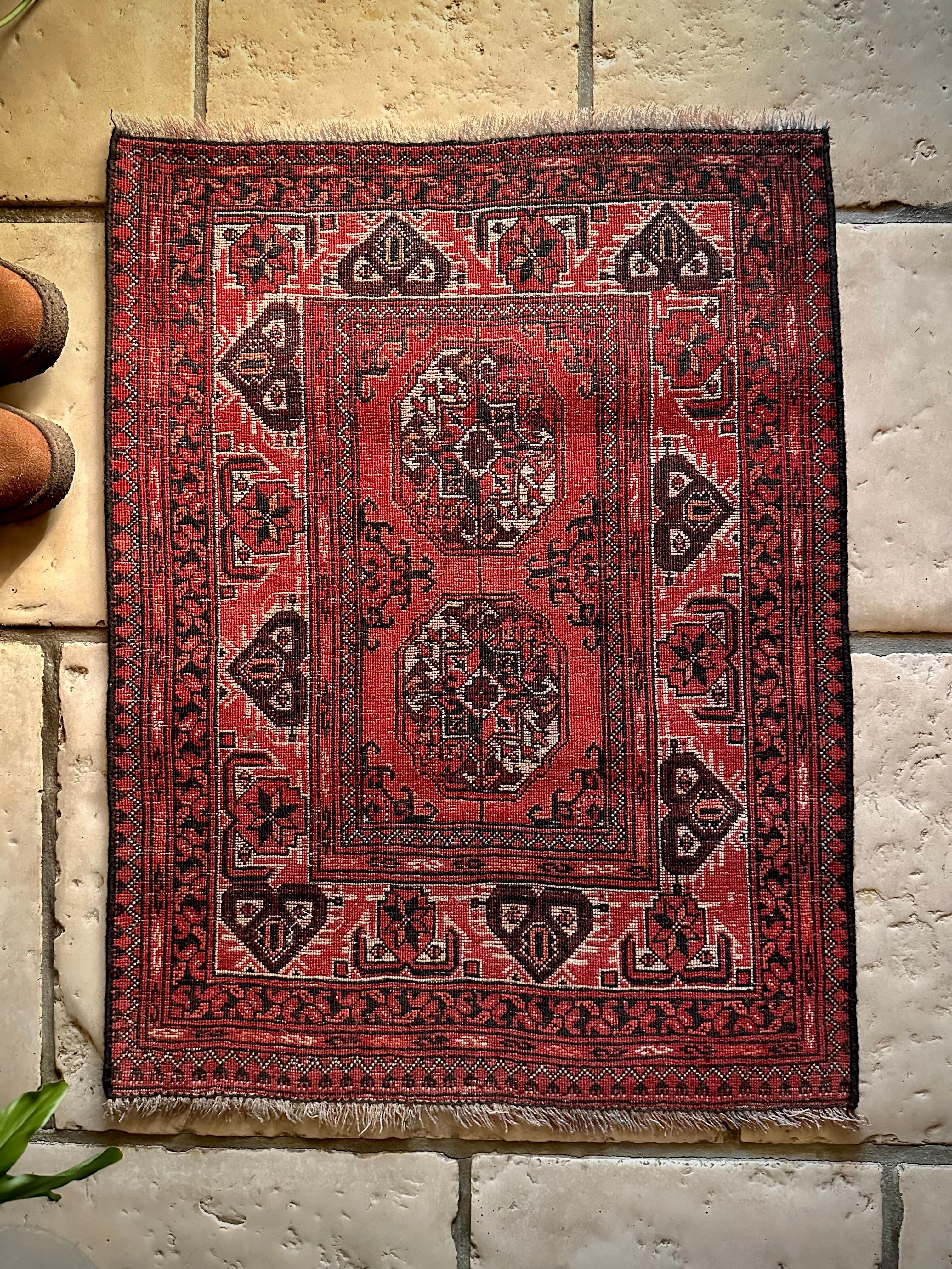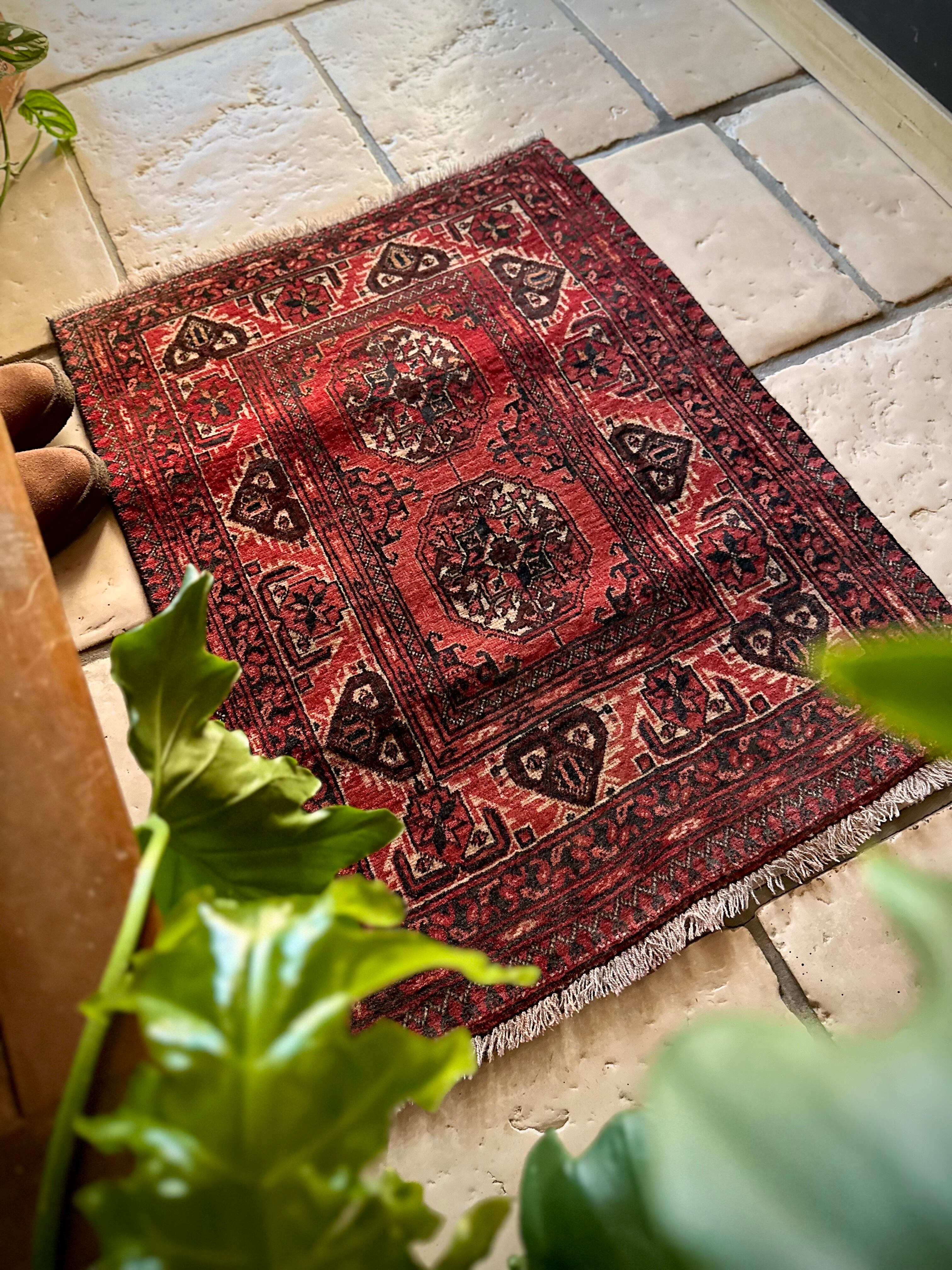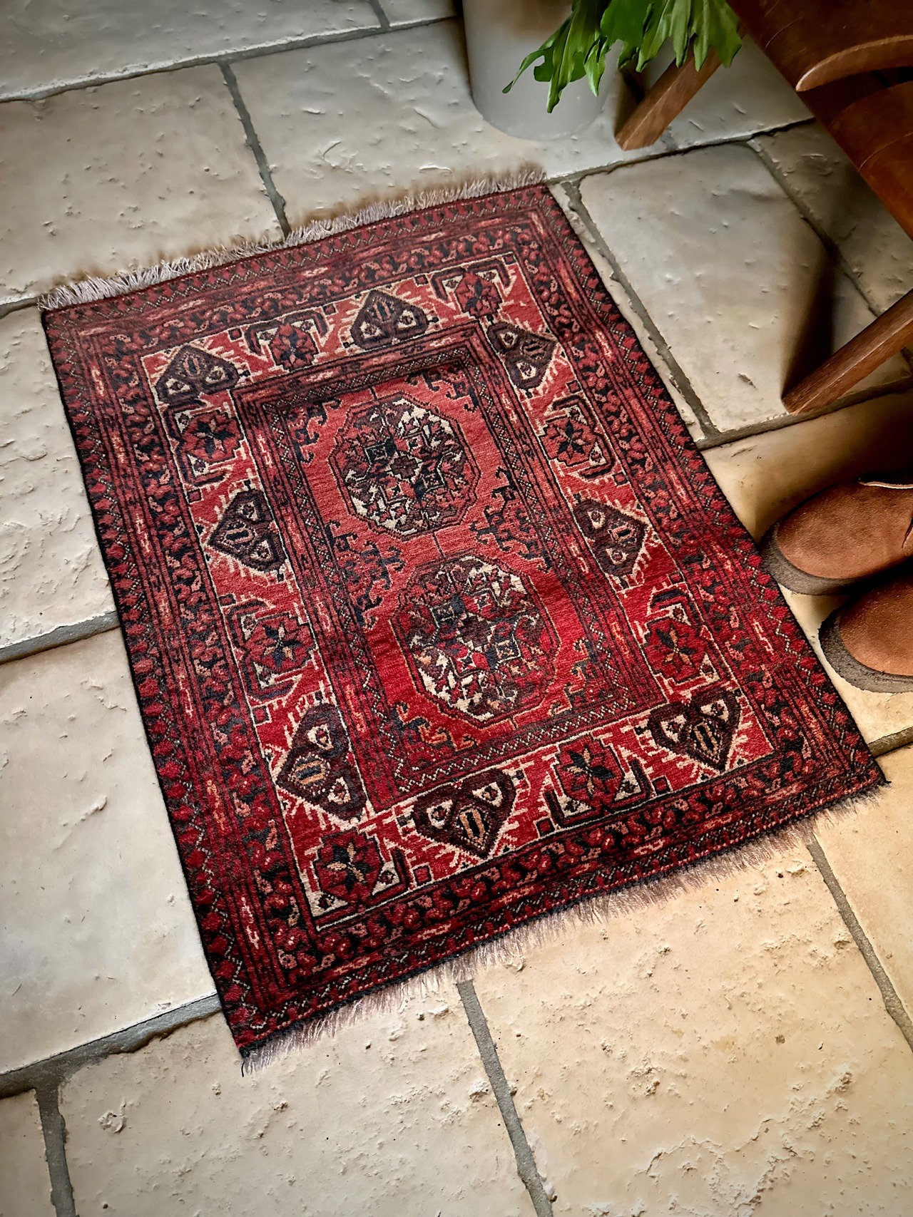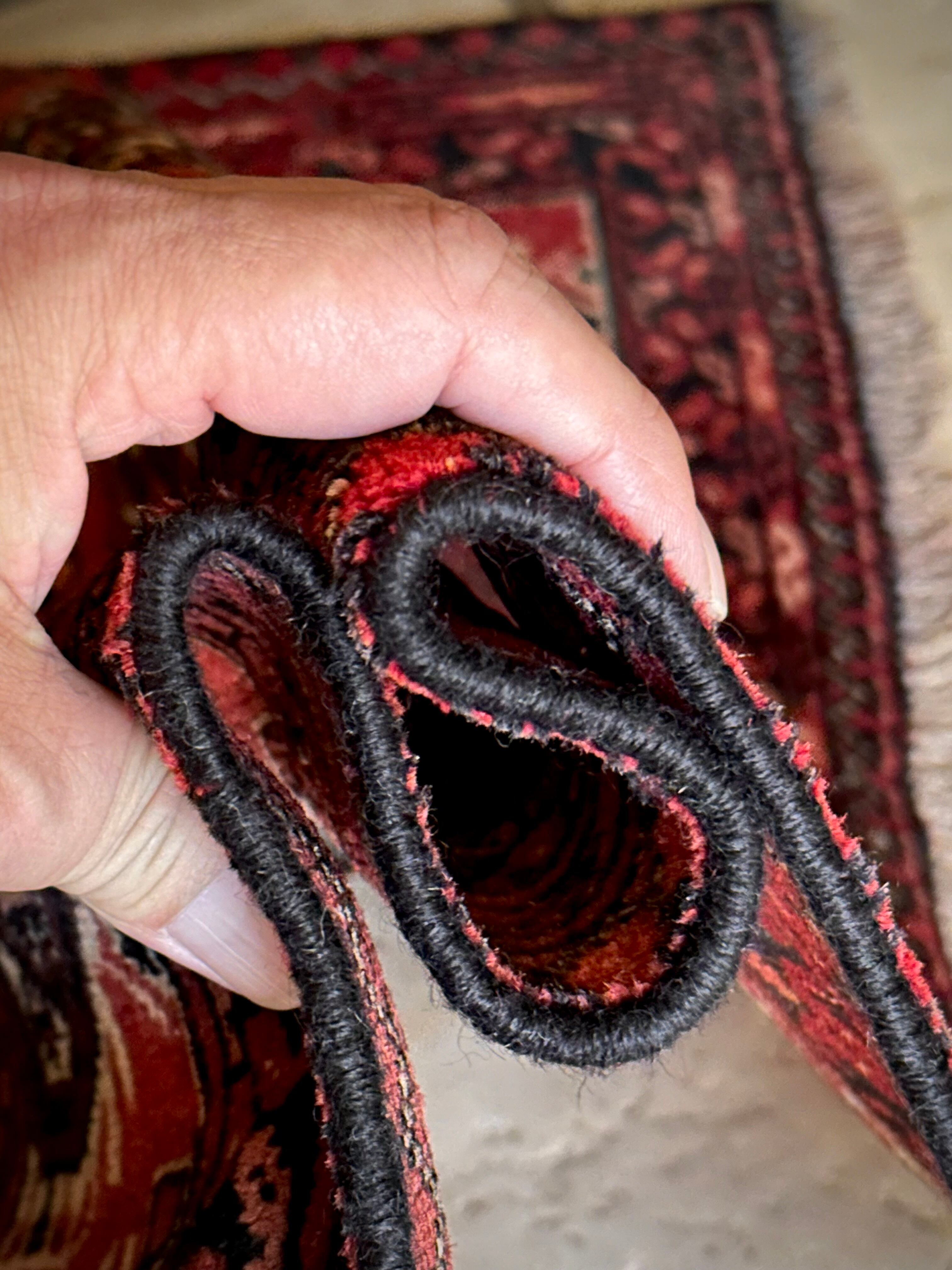 夕陽に照らされた真っ赤な色彩美に見慣れた由緒あるテッケギュルが鎮座するこちらは、アフガニスタン北部に居住するトルクメン族のトライバルラグで、小さいながらも強烈なインパクトを放つその見た目にやられてしまう1枚になります。