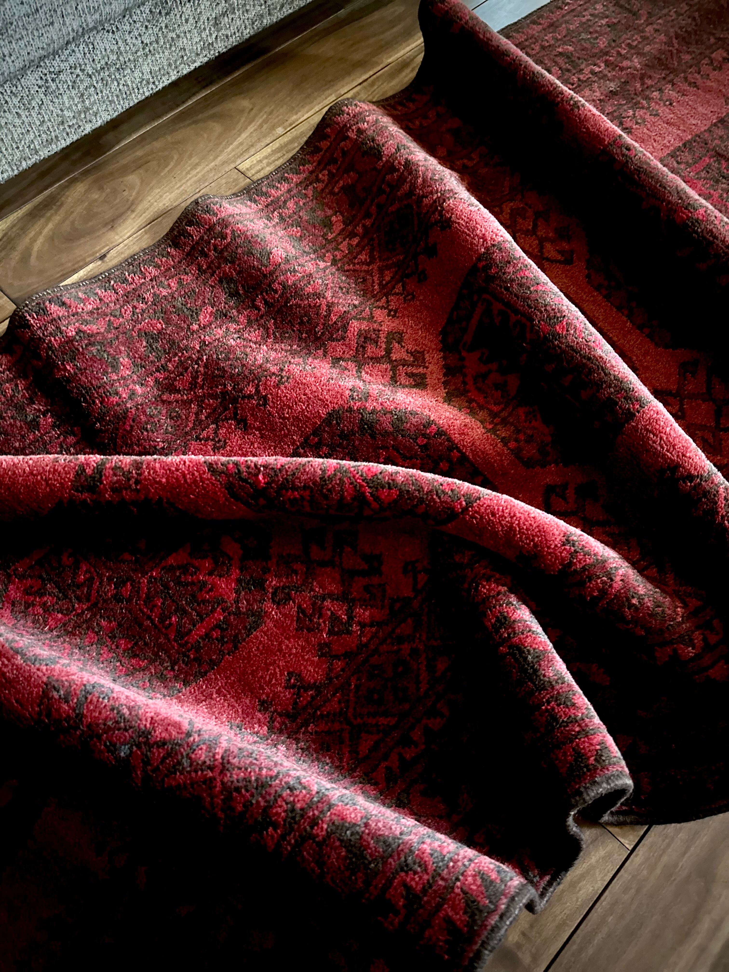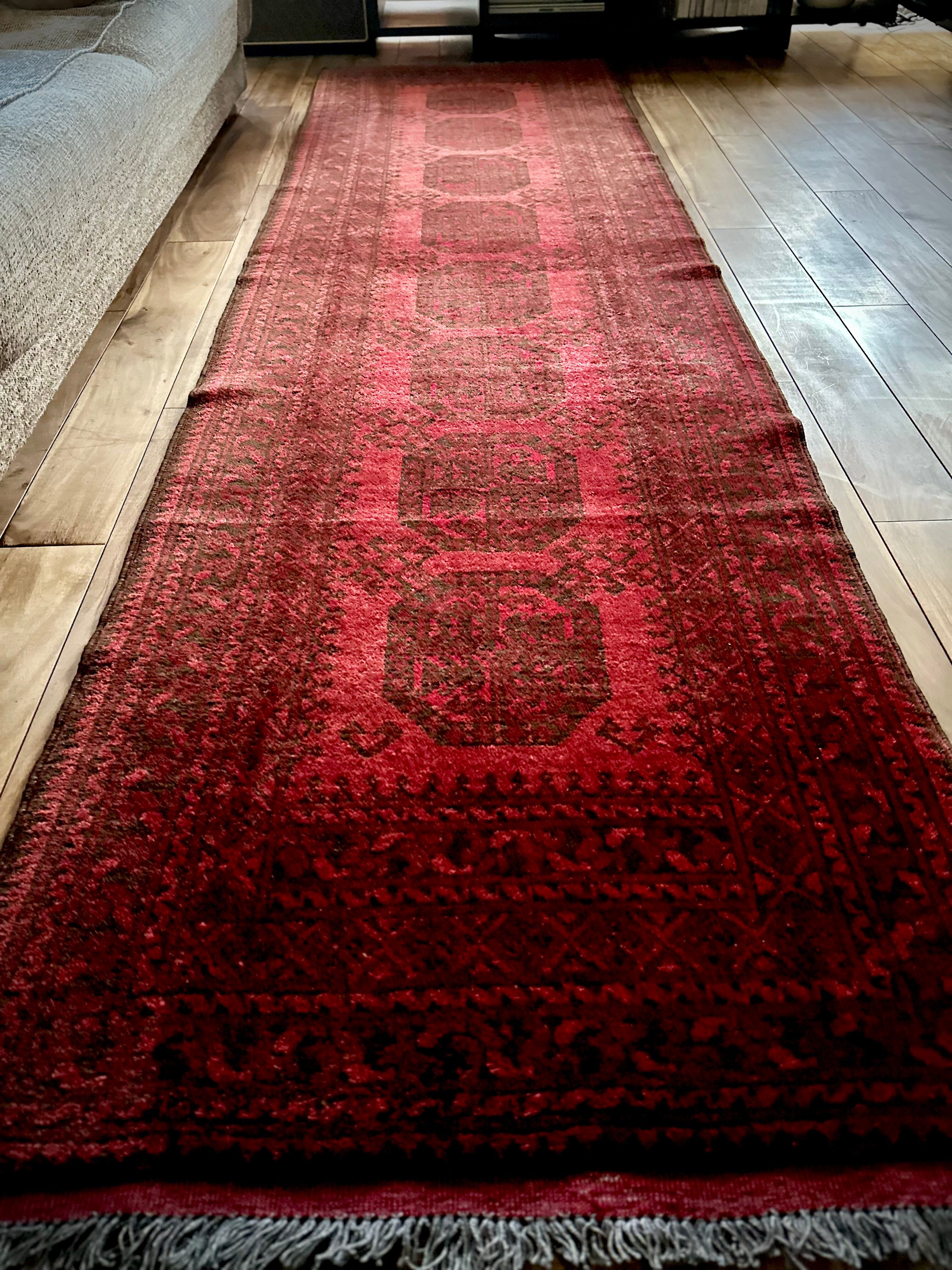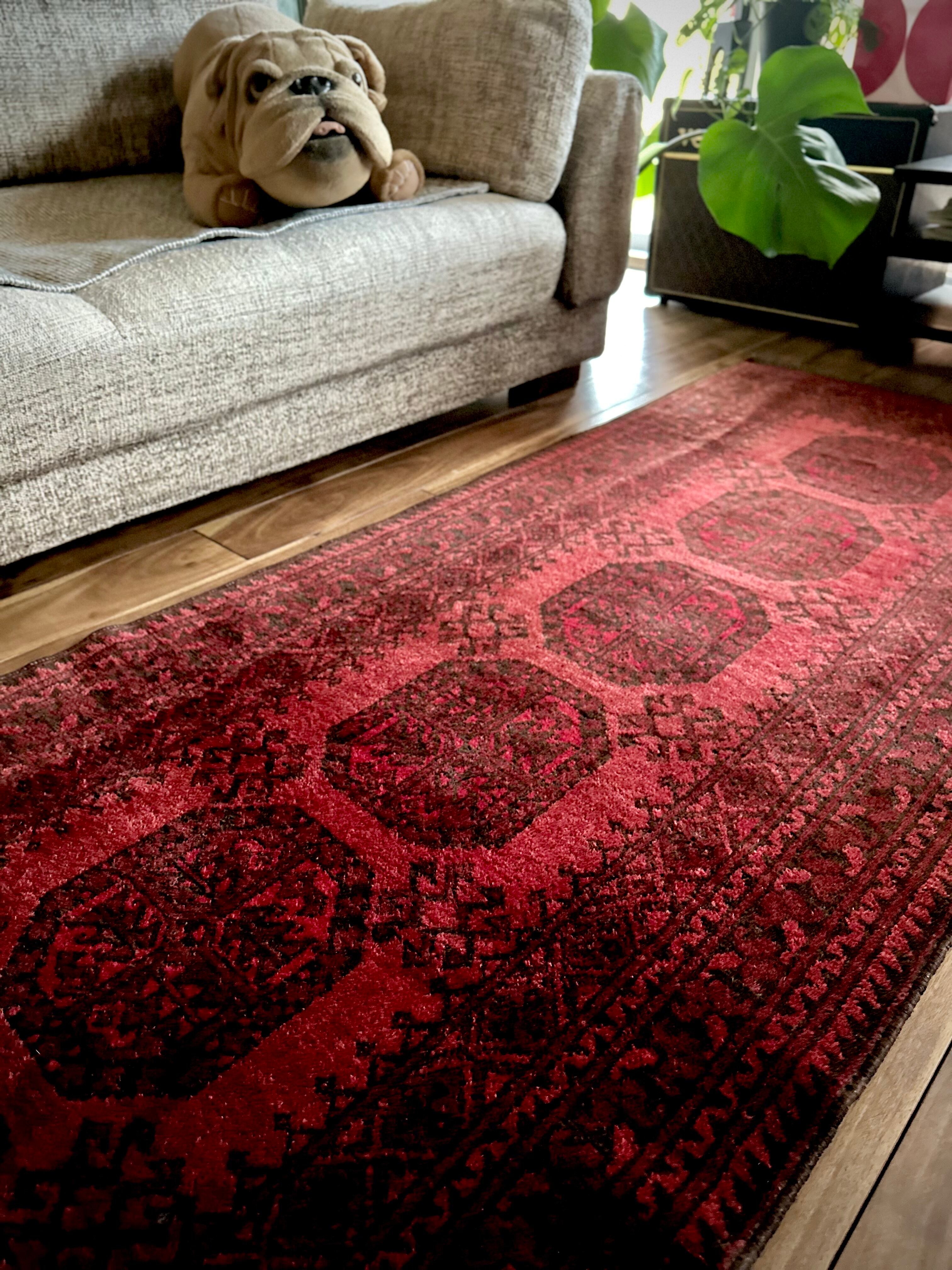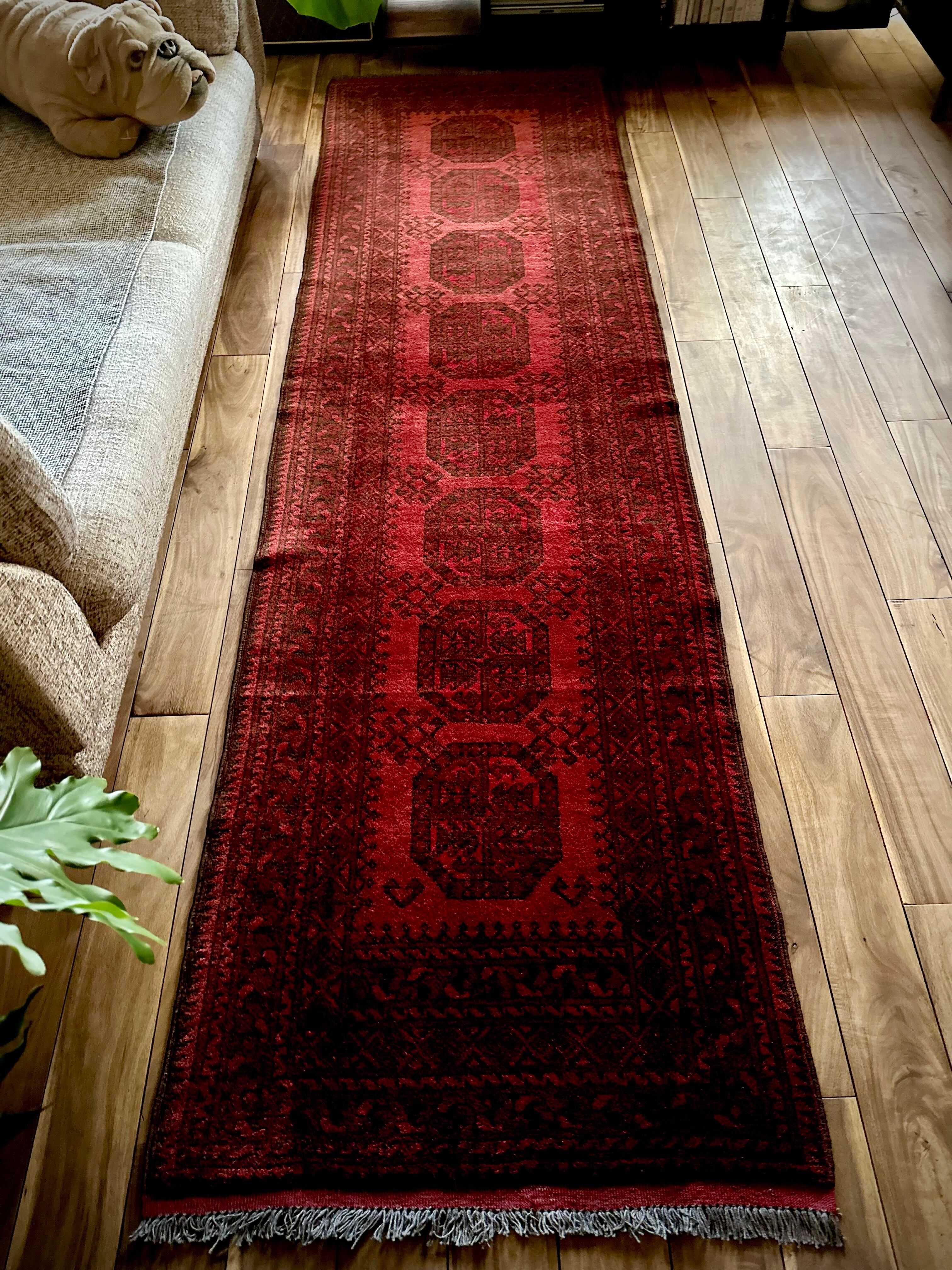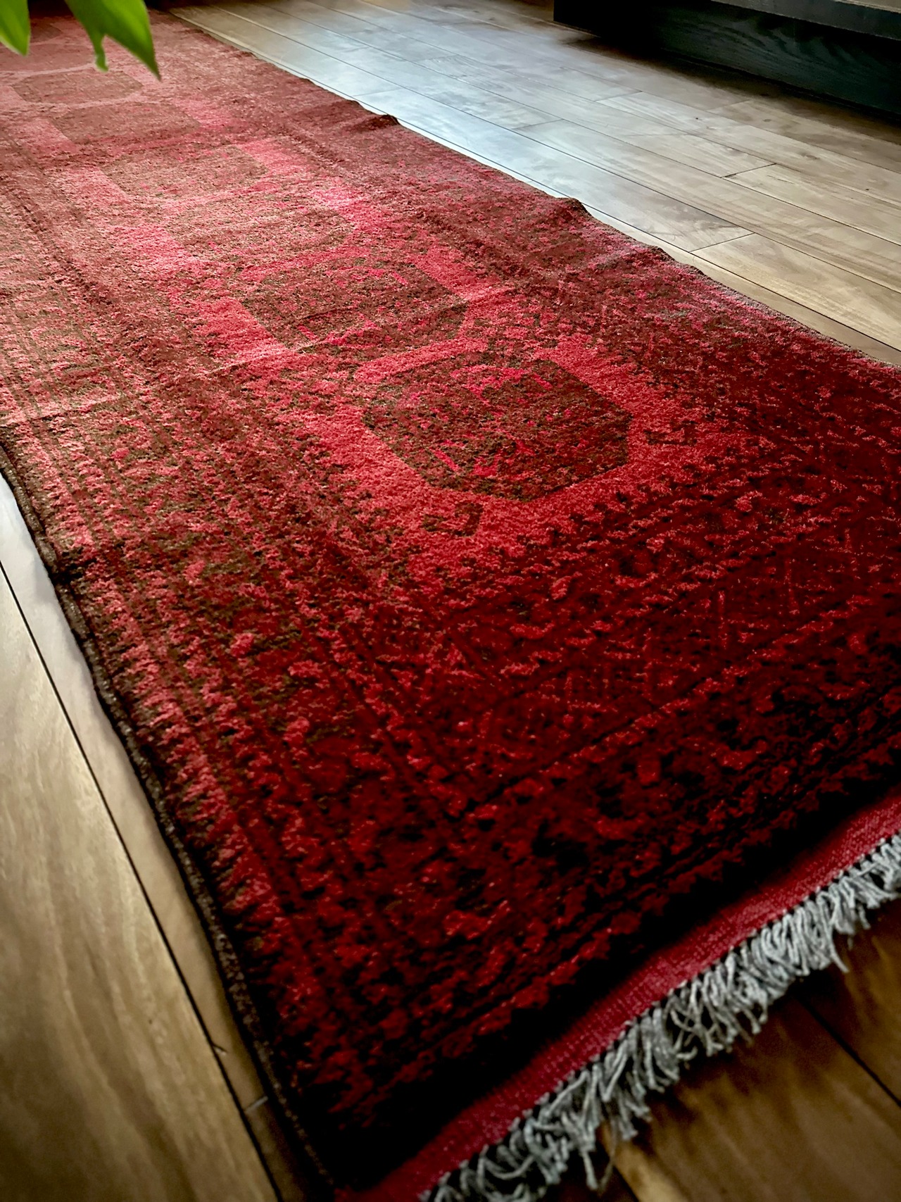 これぞ深みのある真紅のレッドカーペットと言わんばかりの迫力ある佇まいで室内を演出してくれそうなこちらは、アフガニスタン北部に居住するトルクメンの支族であるエルサリ族のトライバルで、廊下などに敷かれる細長い形状のランナーと呼ばれるラグになります。