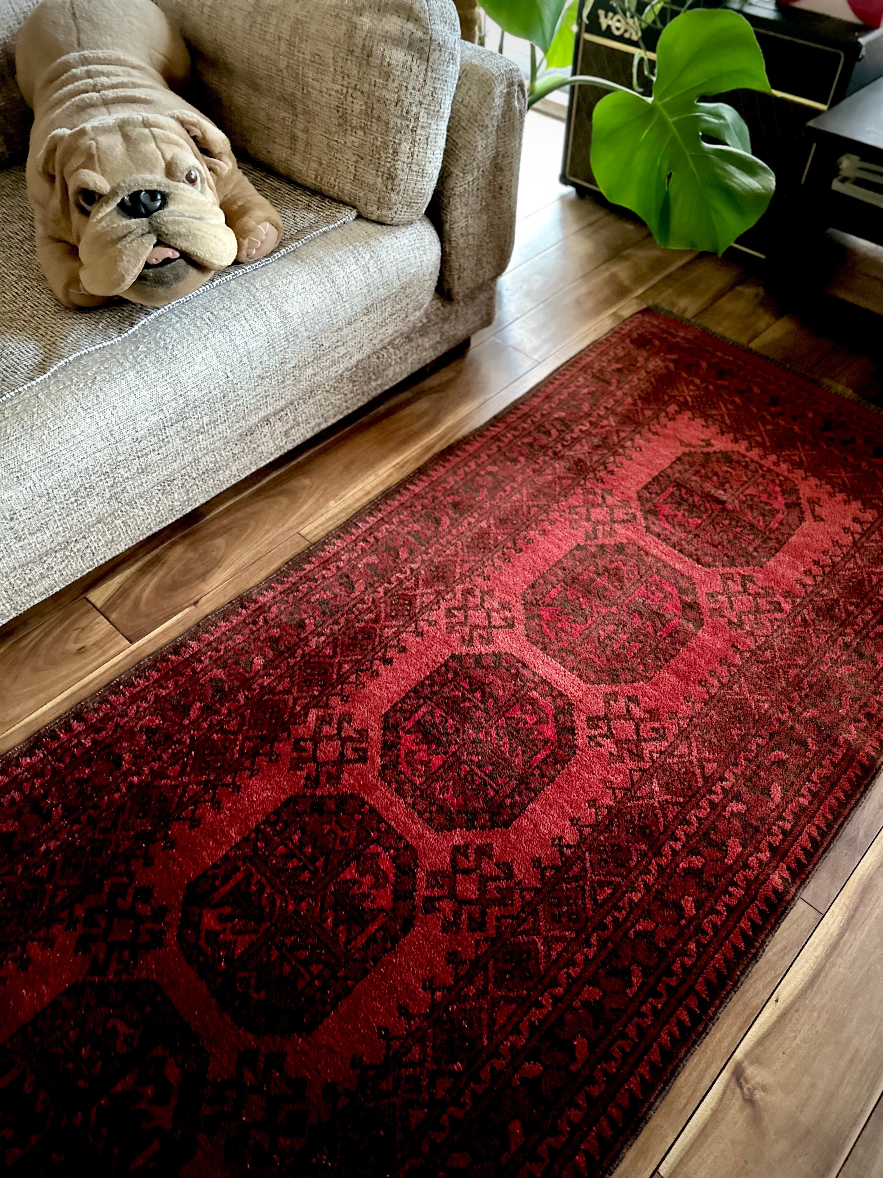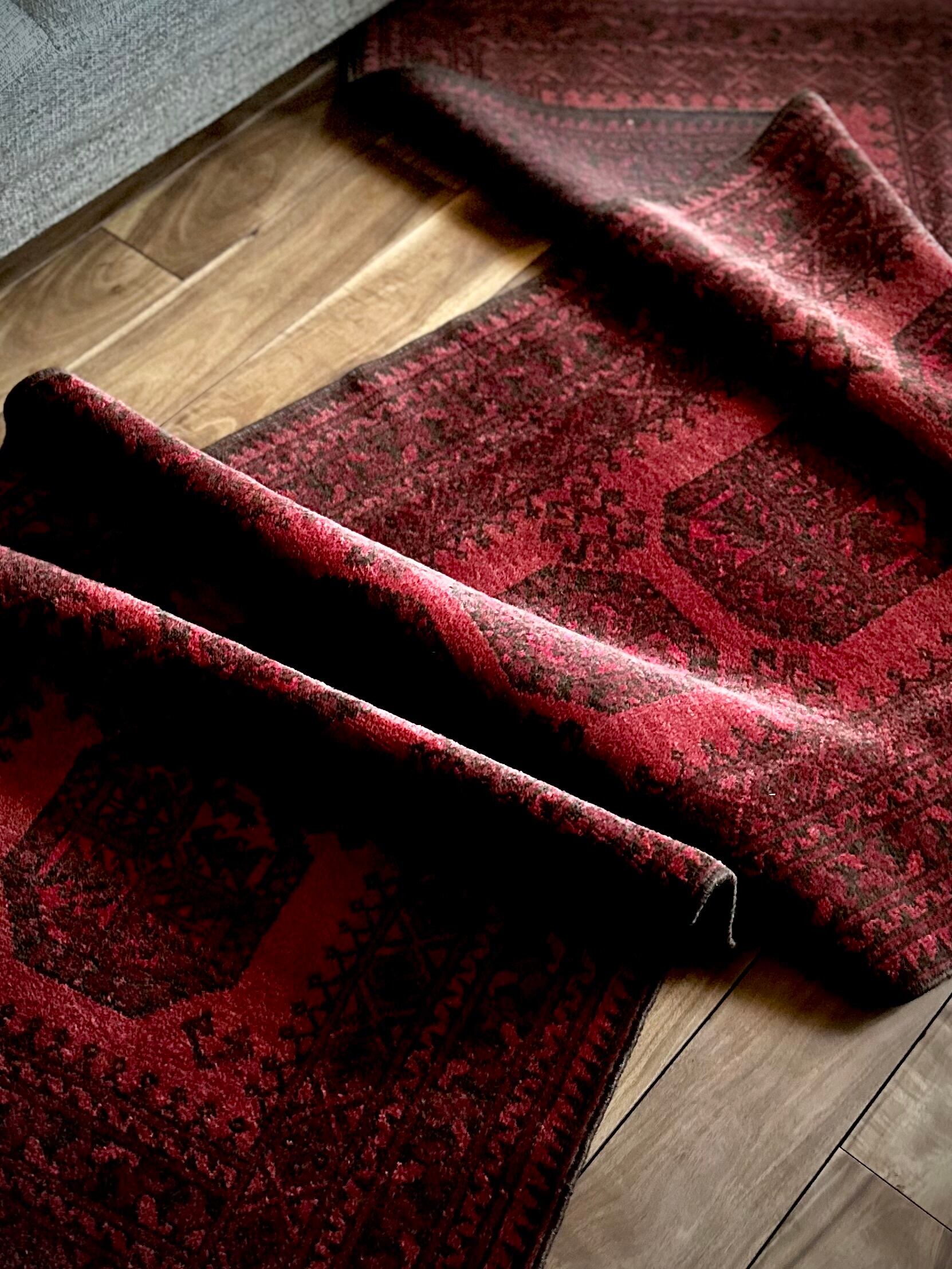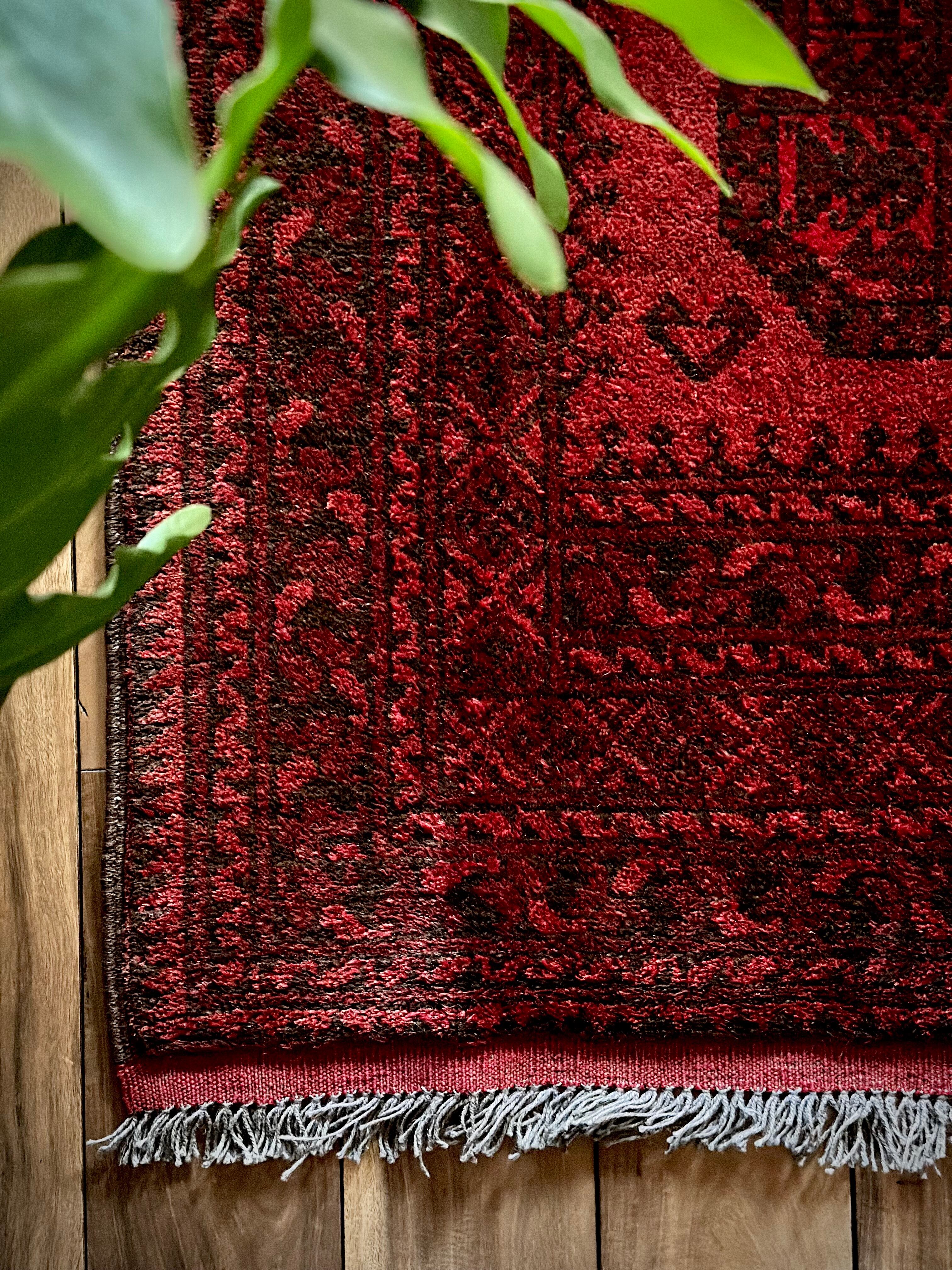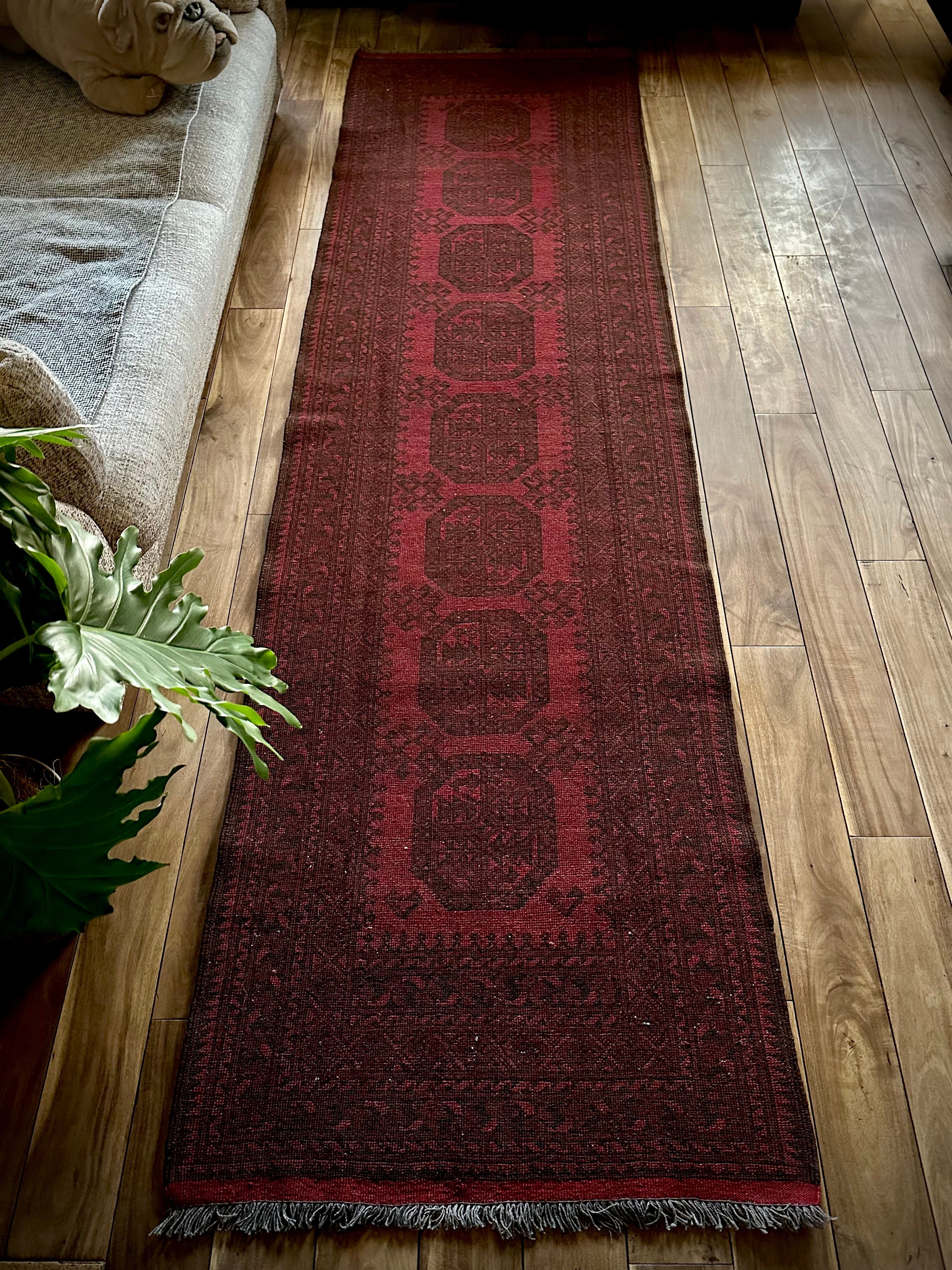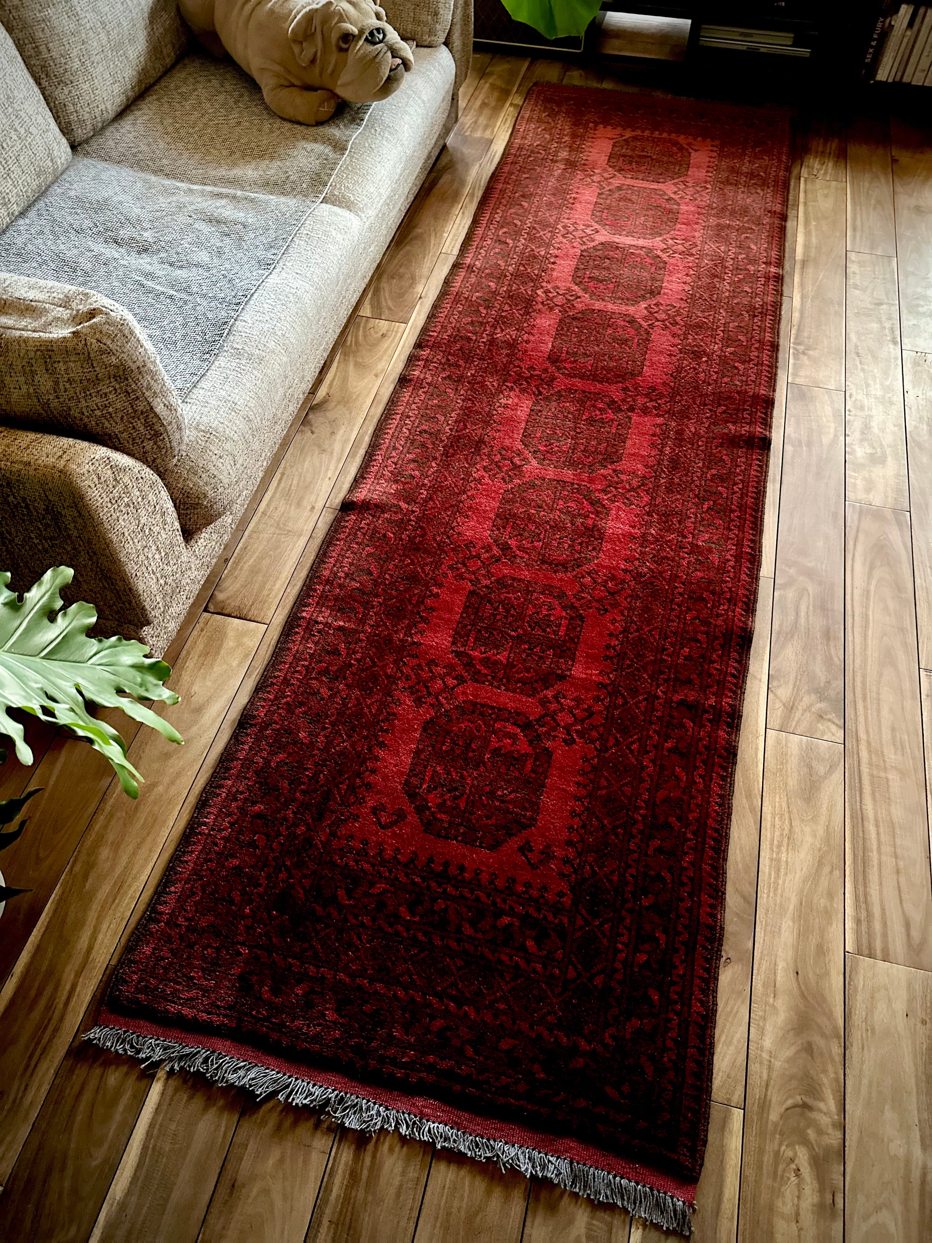 これぞ深みのある真紅のレッドカーペットと言わんばかりの迫力ある佇まいで室内を演出してくれそうなこちらは、アフガニスタン北部に居住するトルクメンの支族であるエルサリ族のトライバルで、廊下などに敷かれる細長い形状のランナーと呼ばれるラグになります。