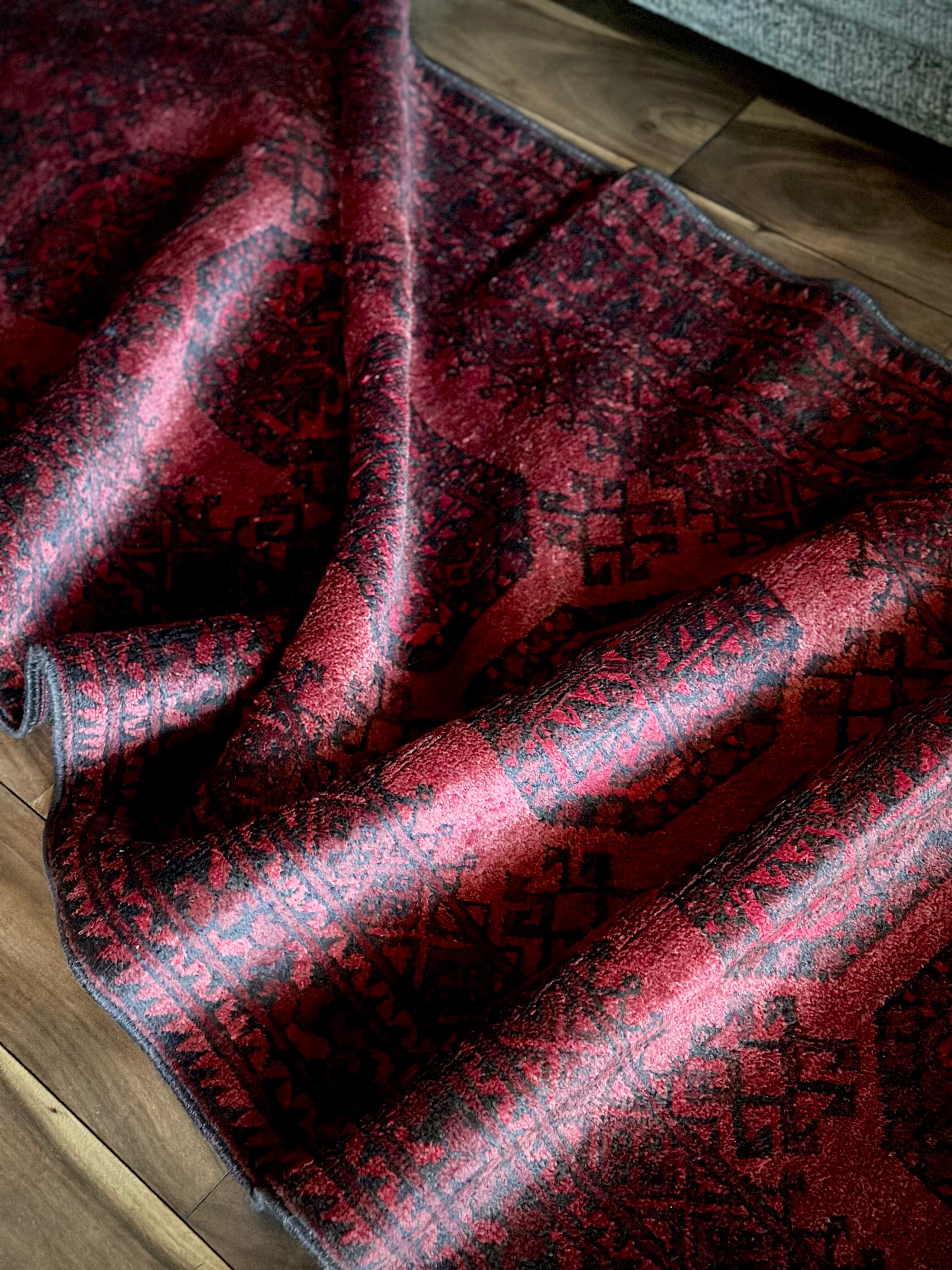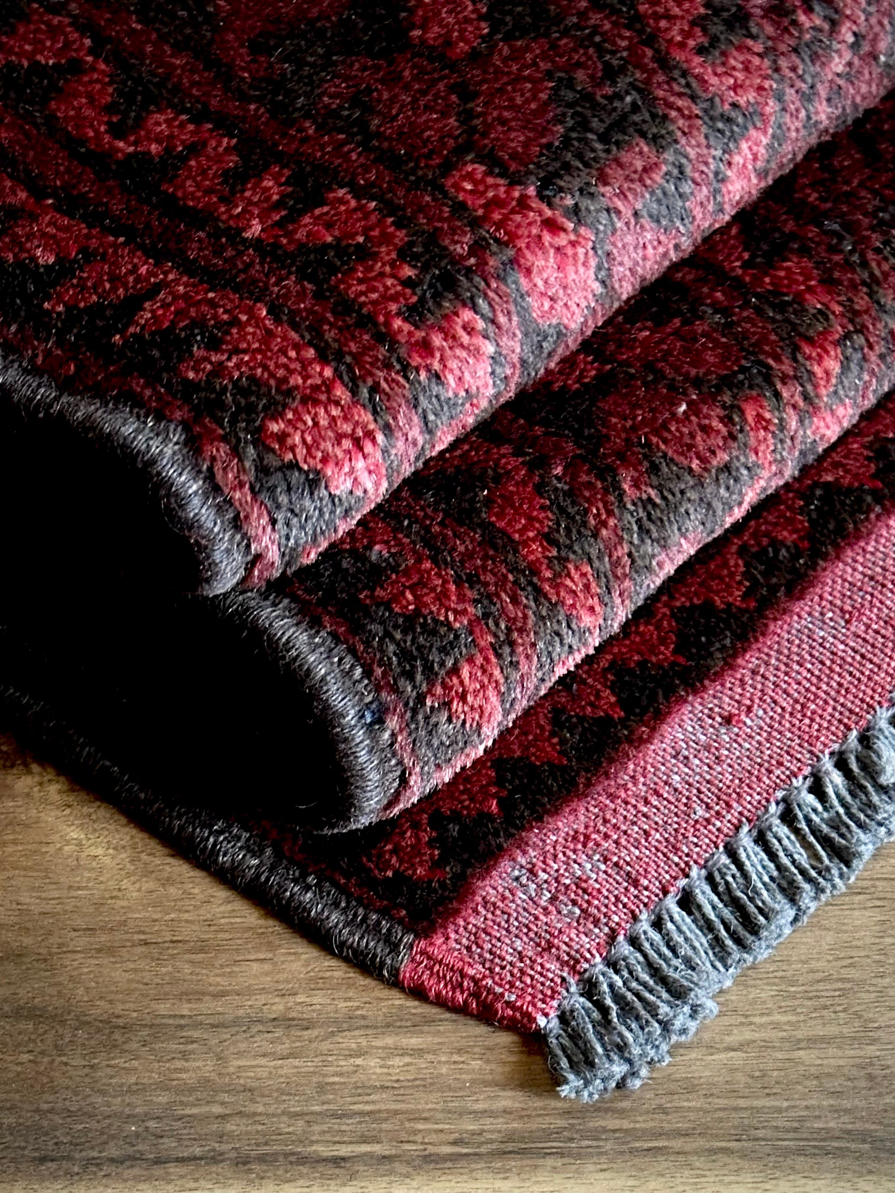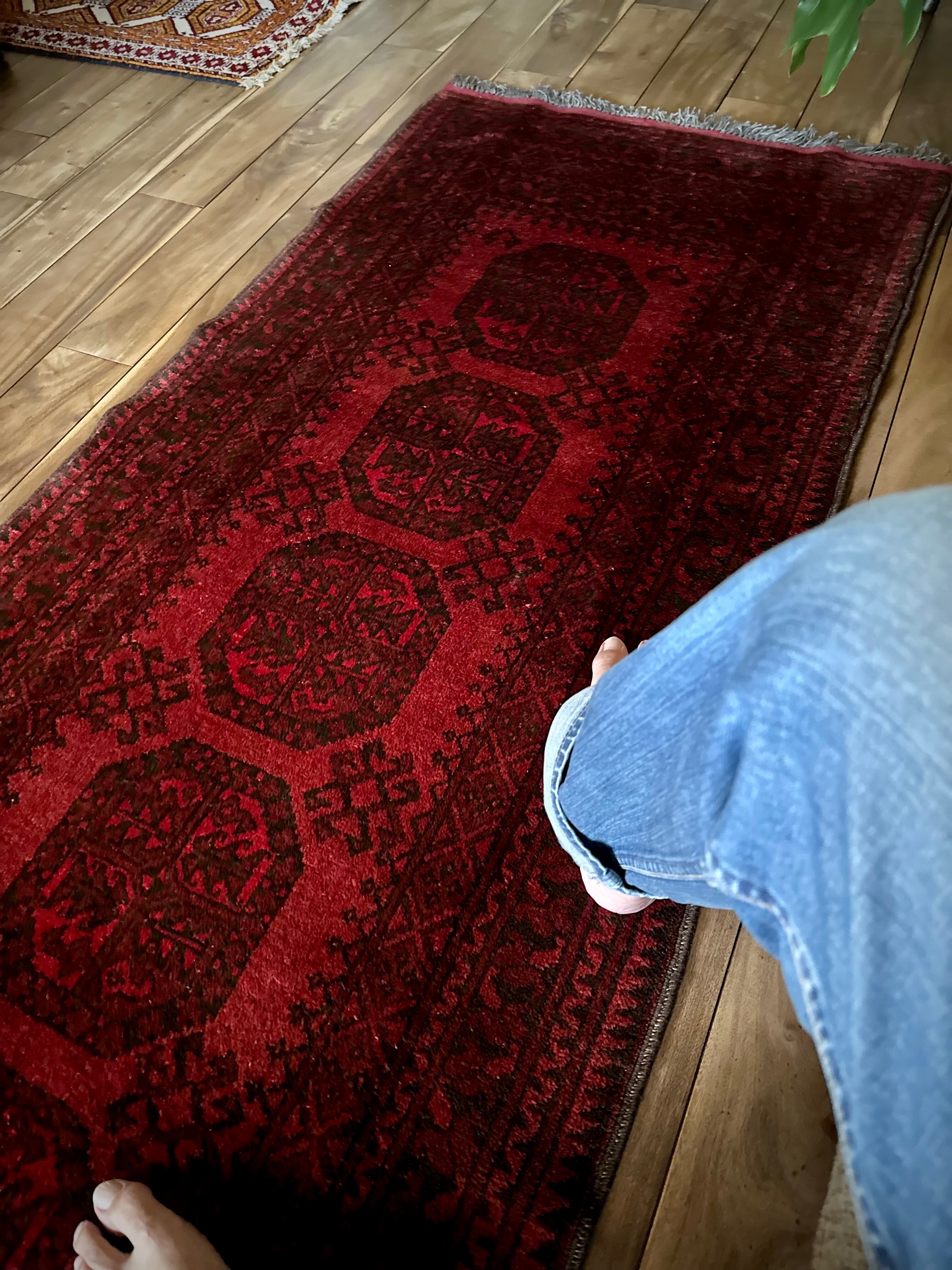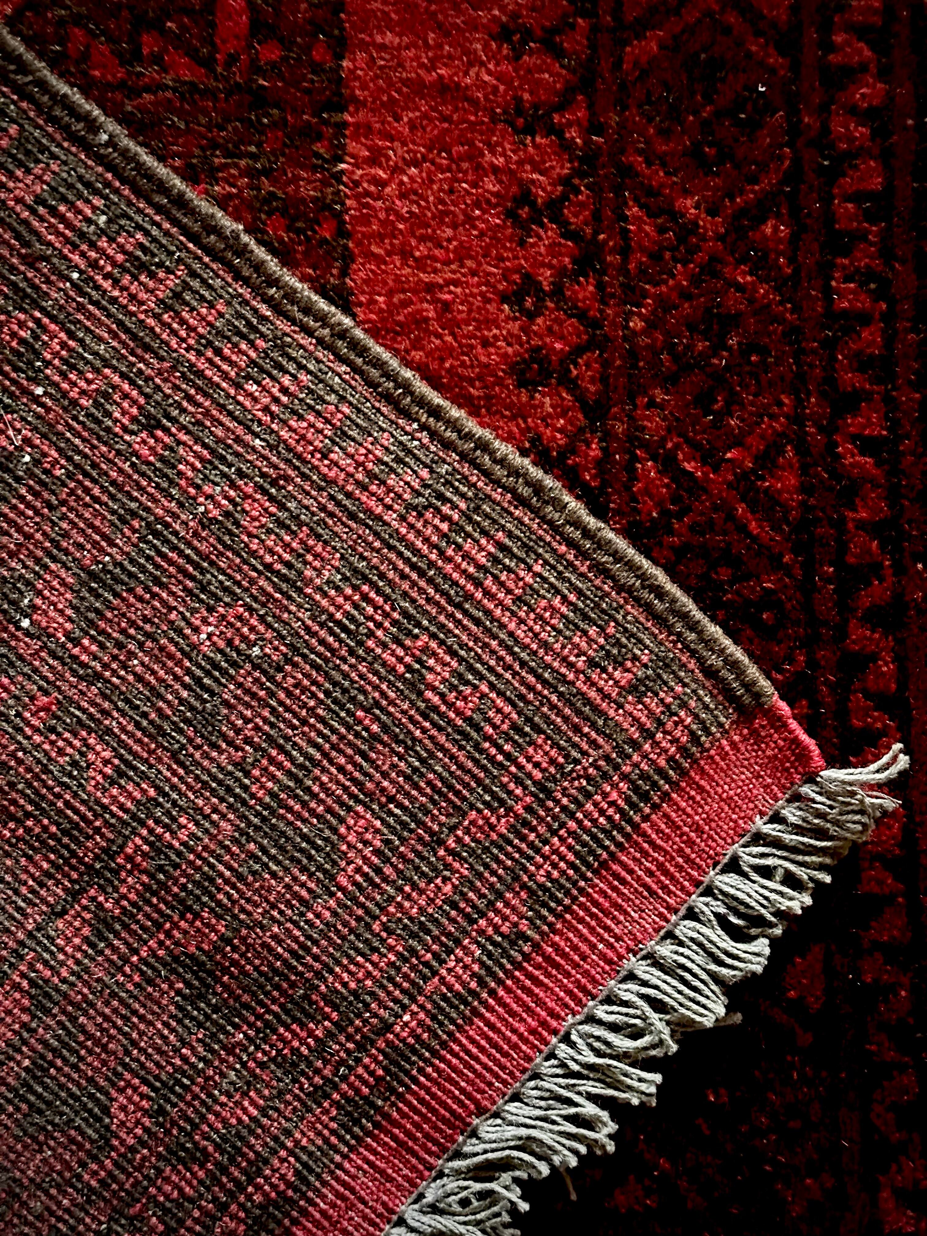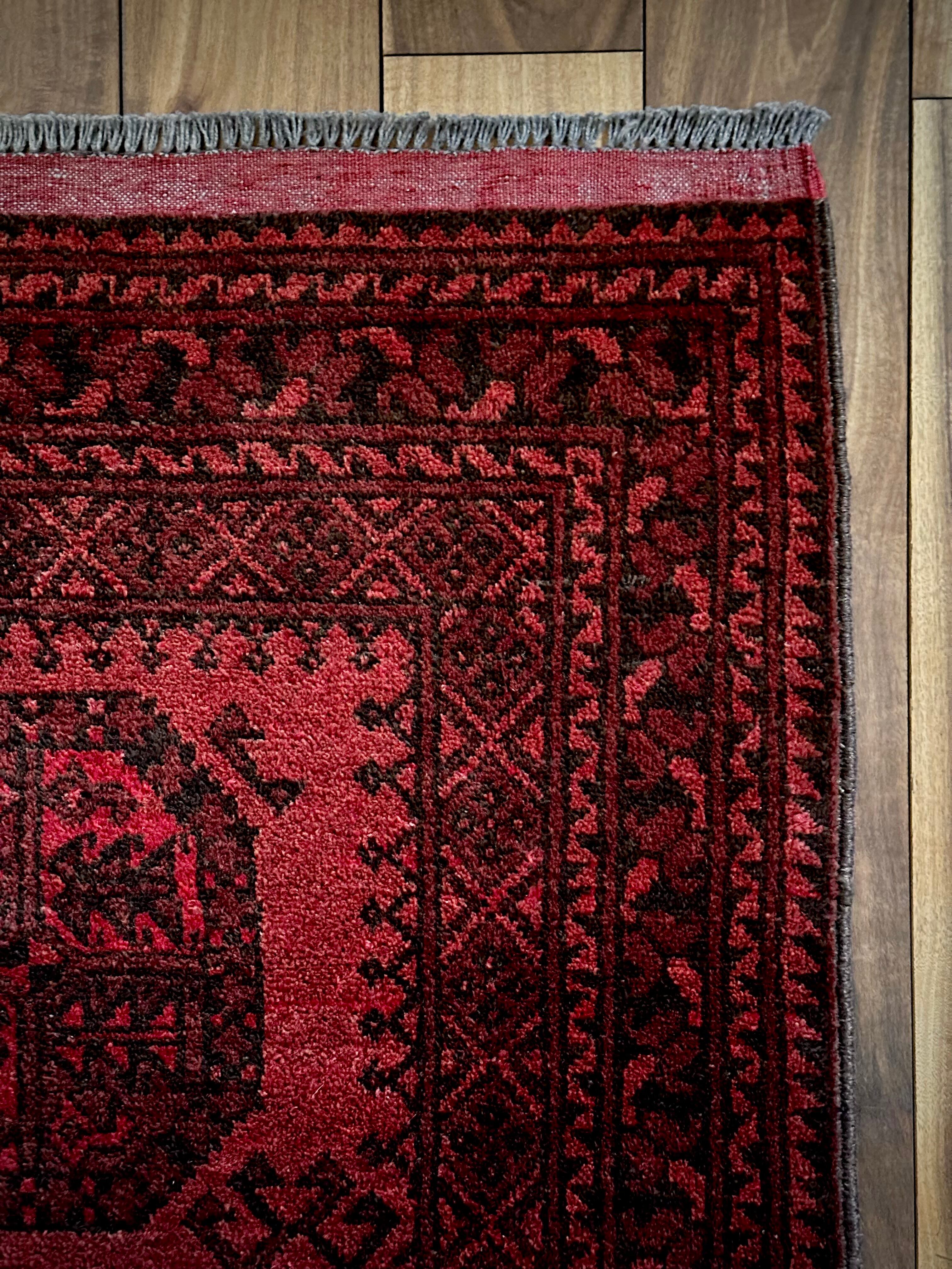 これぞ深みのある真紅のレッドカーペットと言わんばかりの迫力ある佇まいで室内を演出してくれそうなこちらは、アフガニスタン北部に居住するトルクメンの支族であるエルサリ族のトライバルで、廊下などに敷かれる細長い形状のランナーと呼ばれるラグになります。