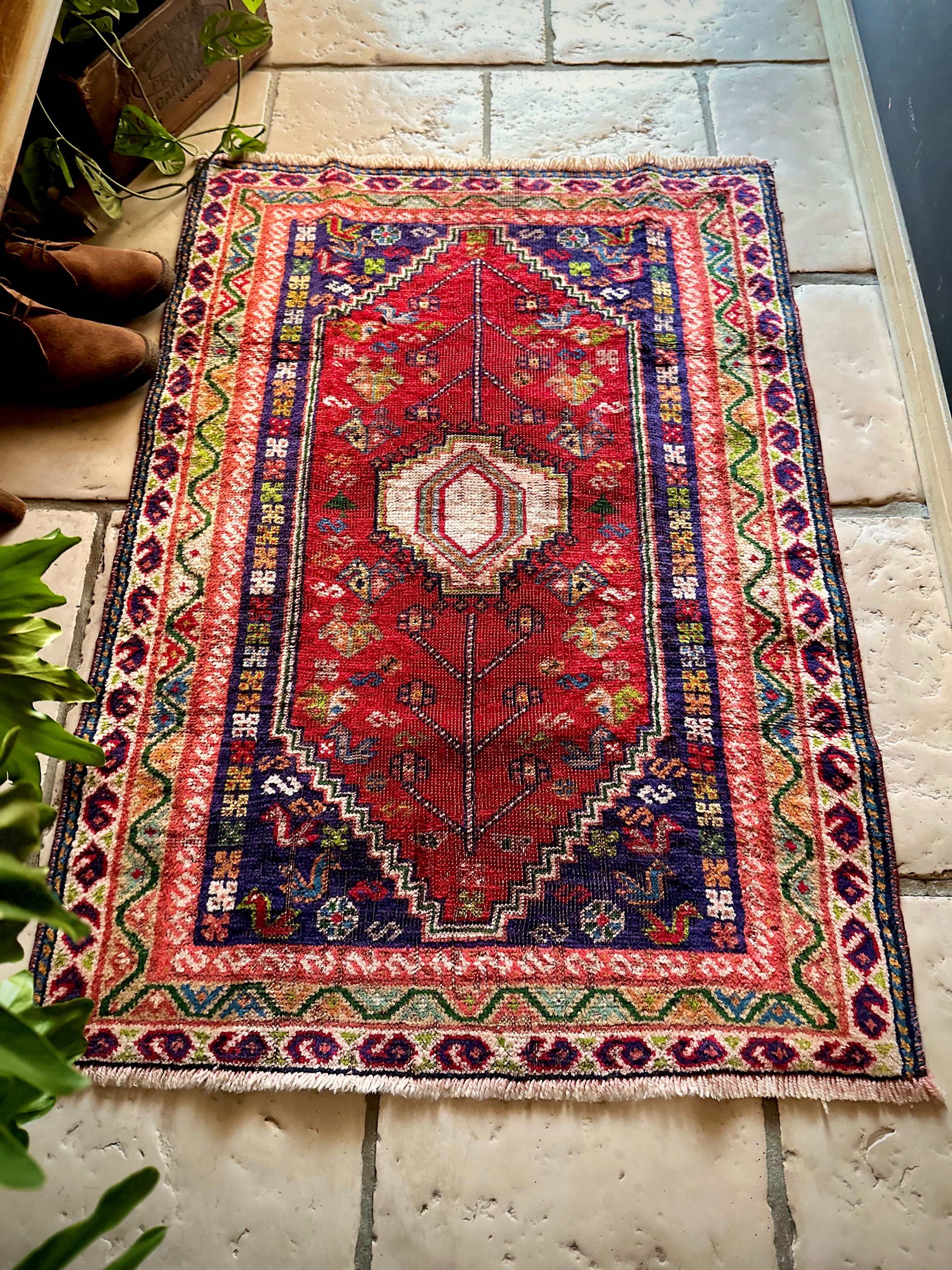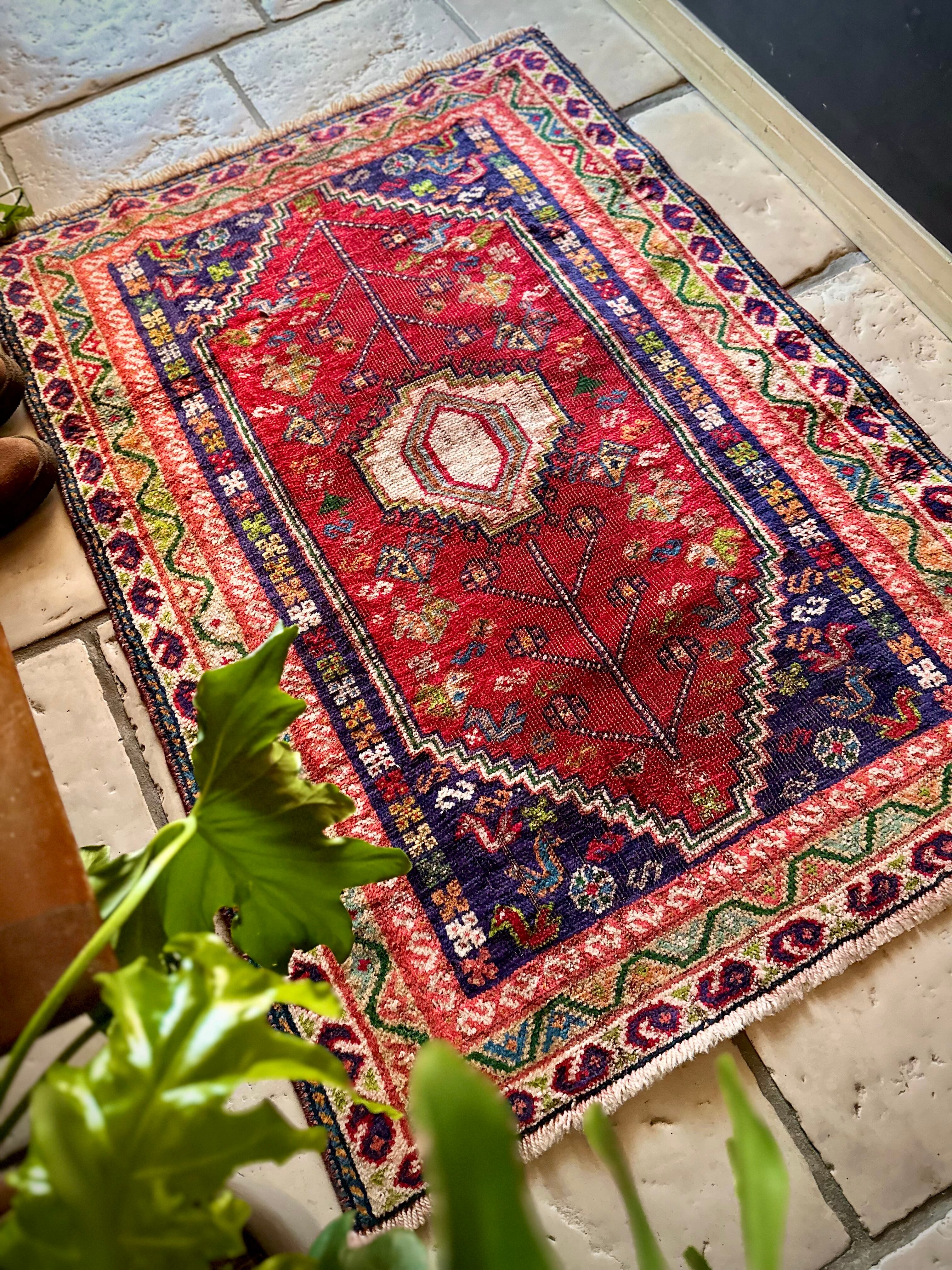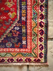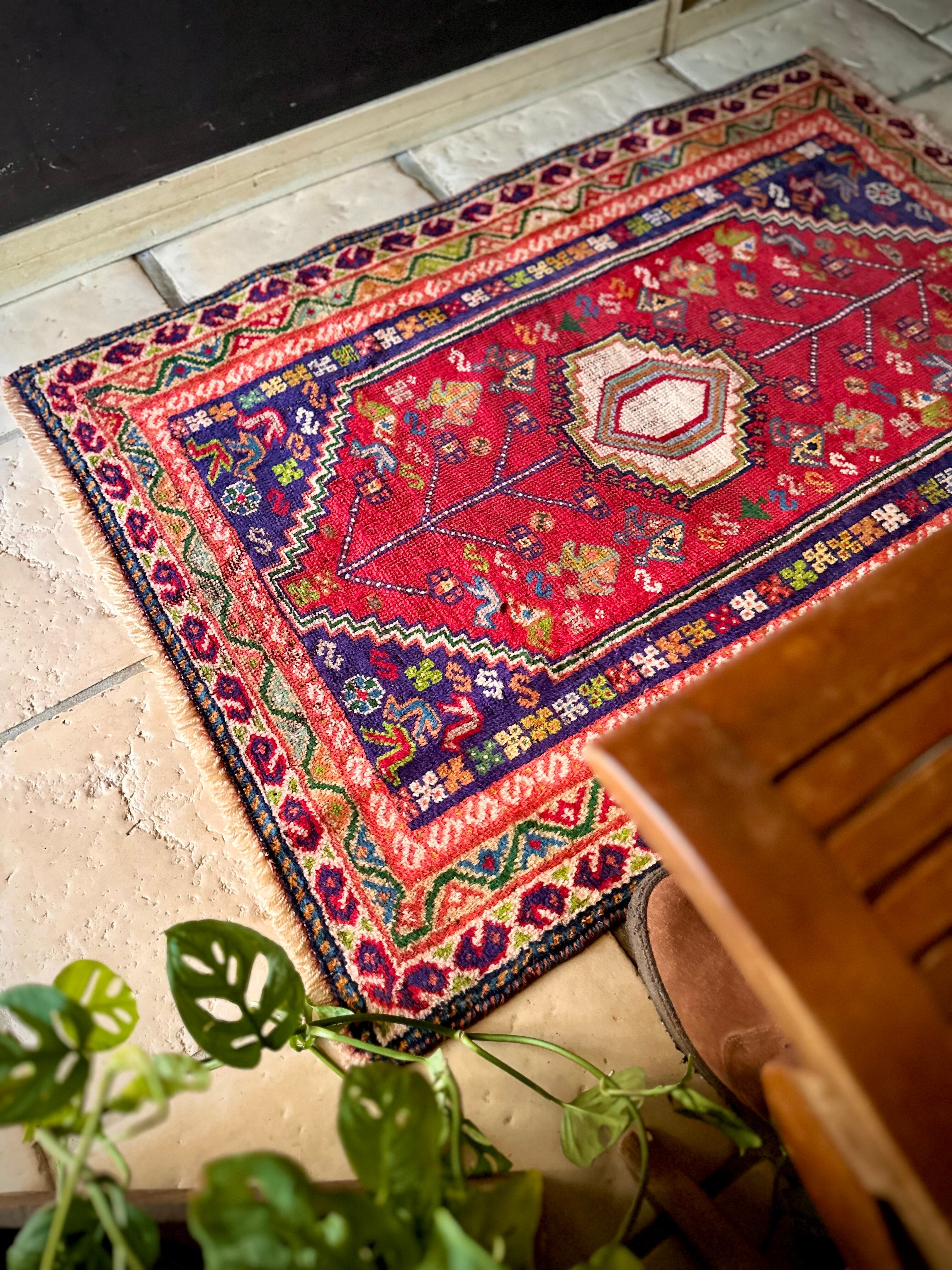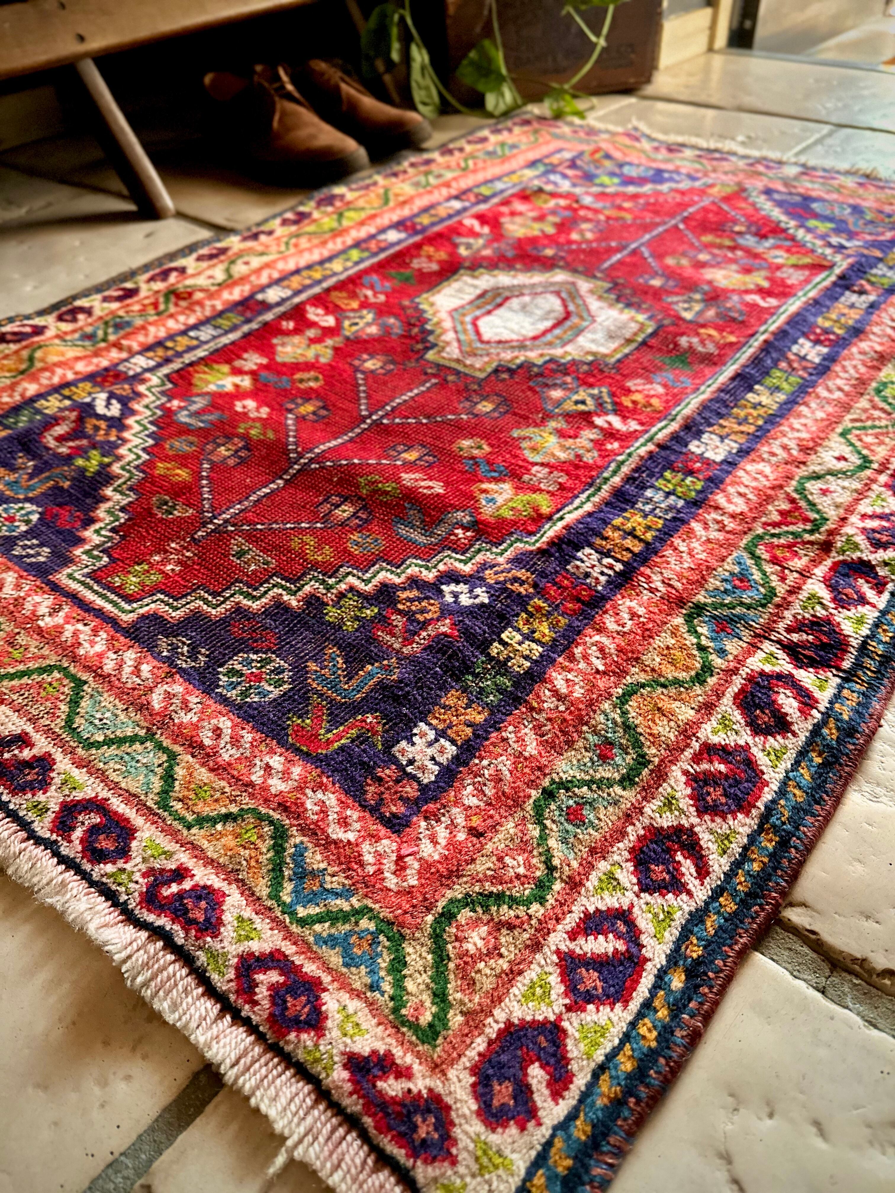 鮮やかなレッドに深みのあるパープル、そこに花々や鳥たちの賑やかな模様が描かれたこちらは、イラン西部のシラーズ近郊に居住するカシュガイ族のトライバルラグで、かなり使い込まれた味わいのあるアクセントラグになります。