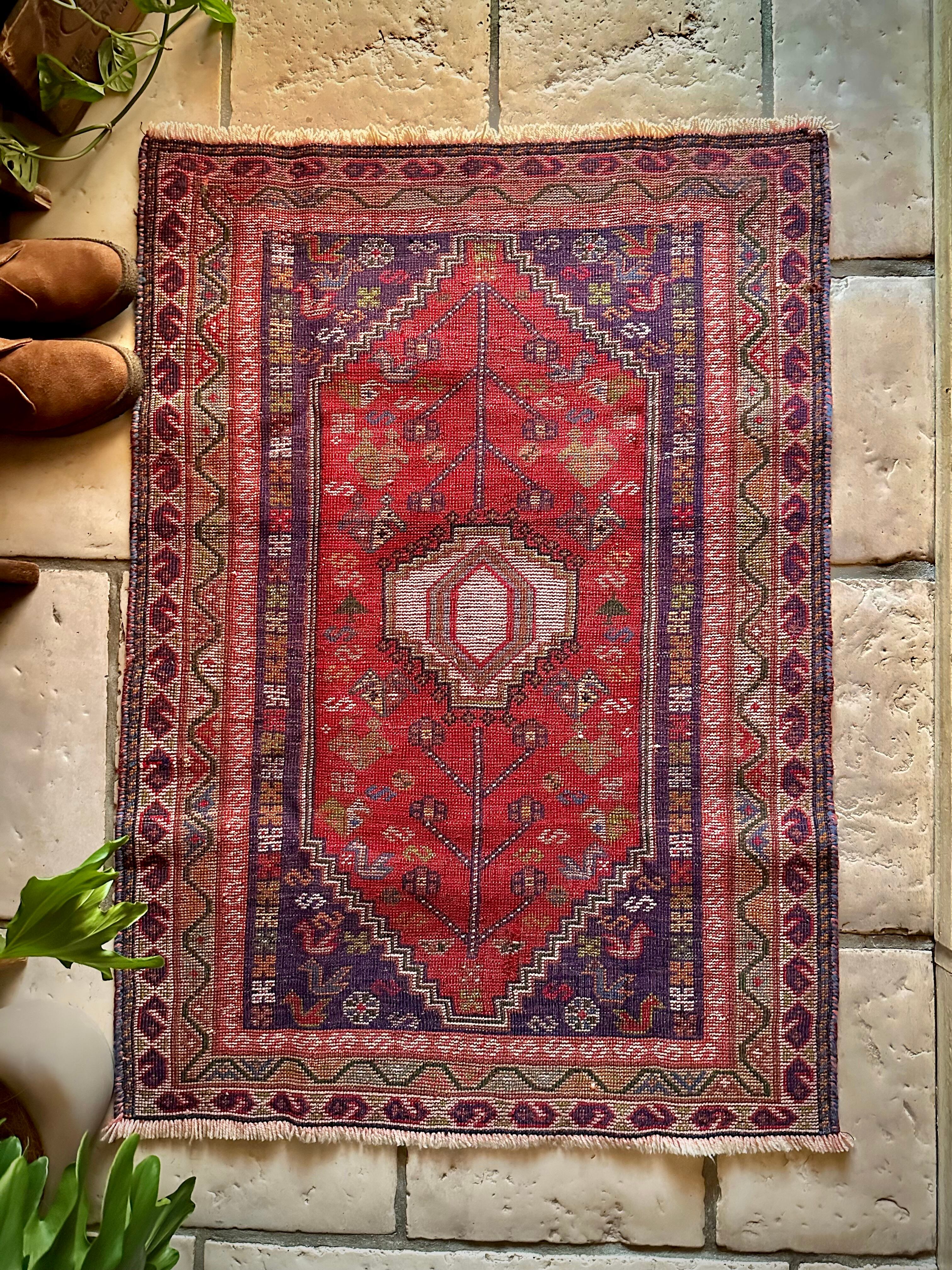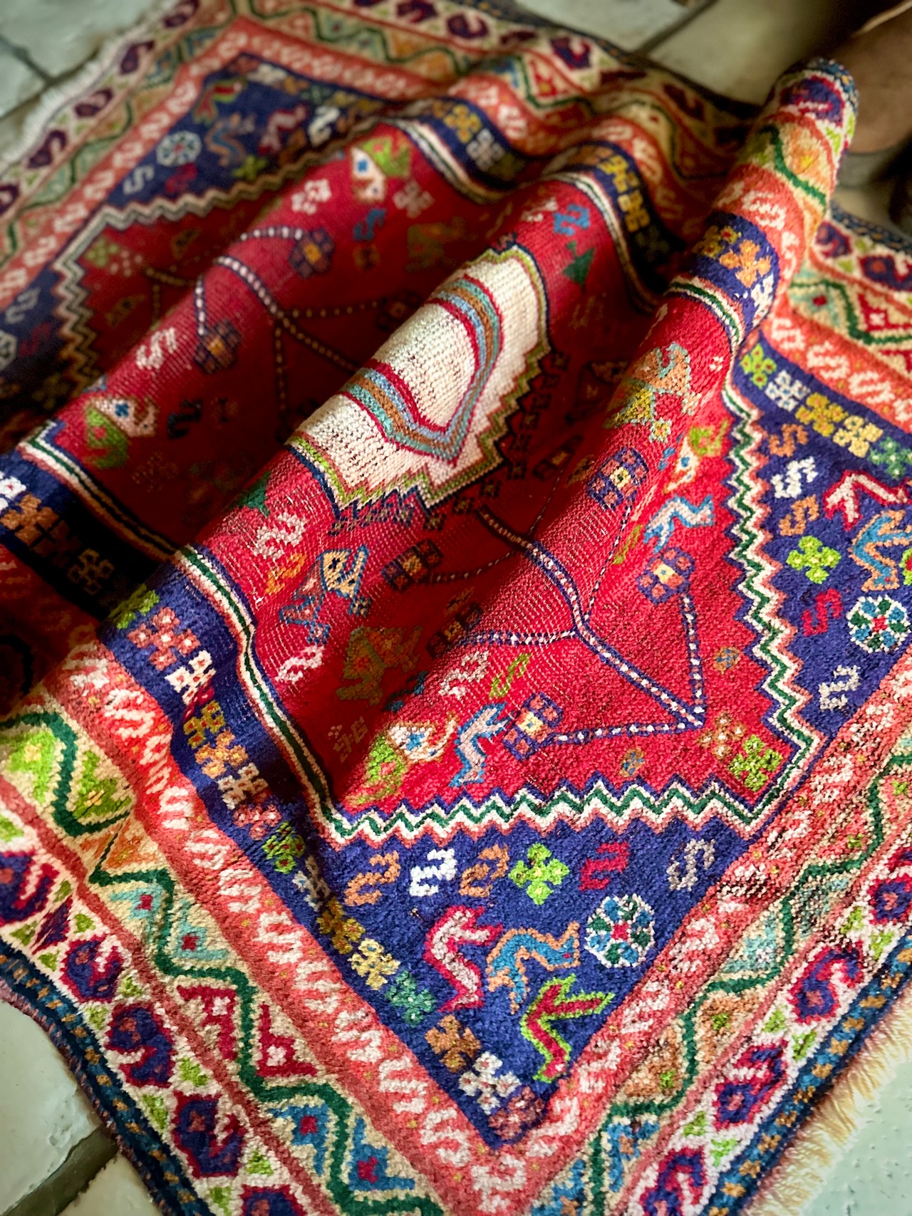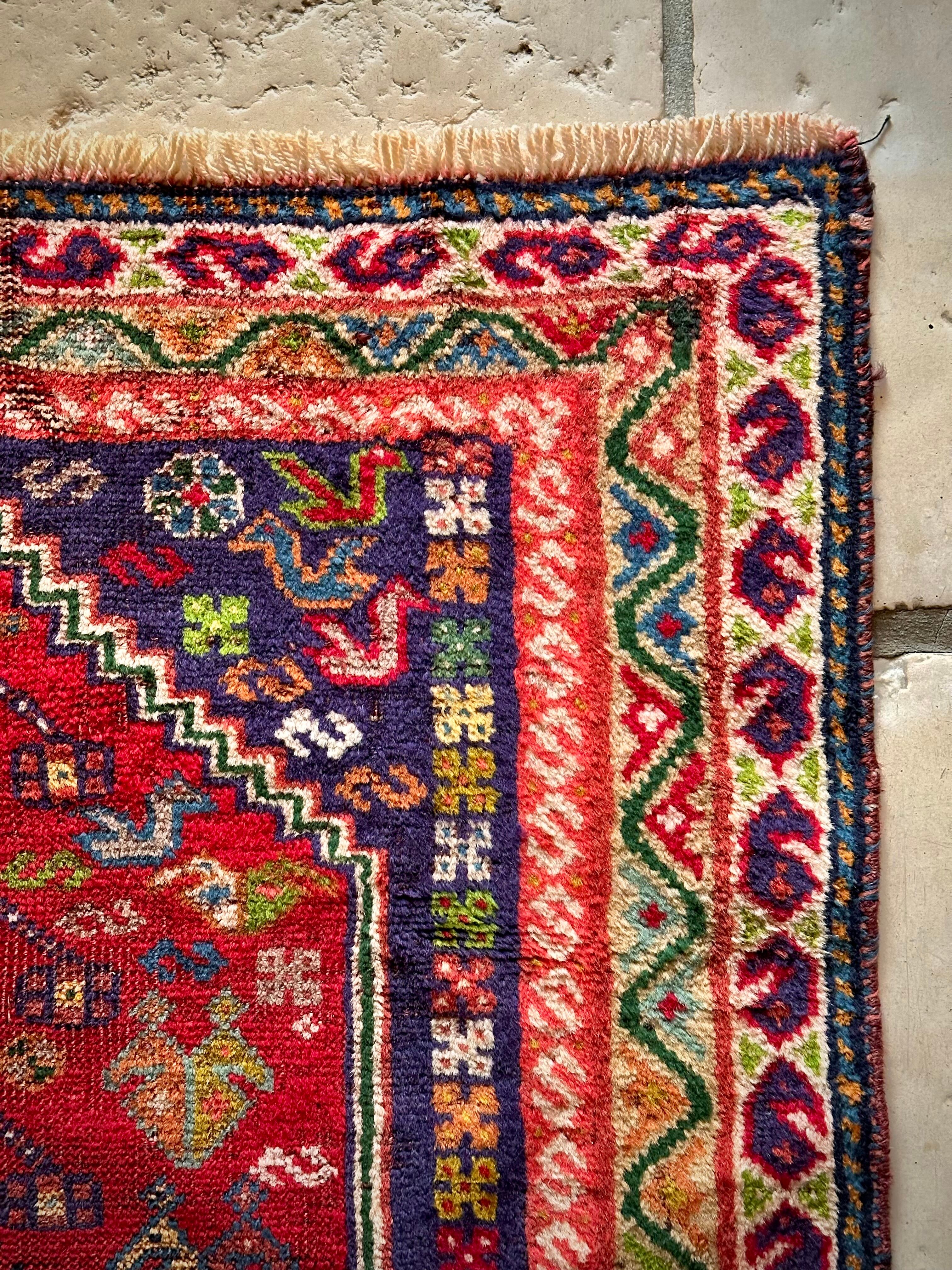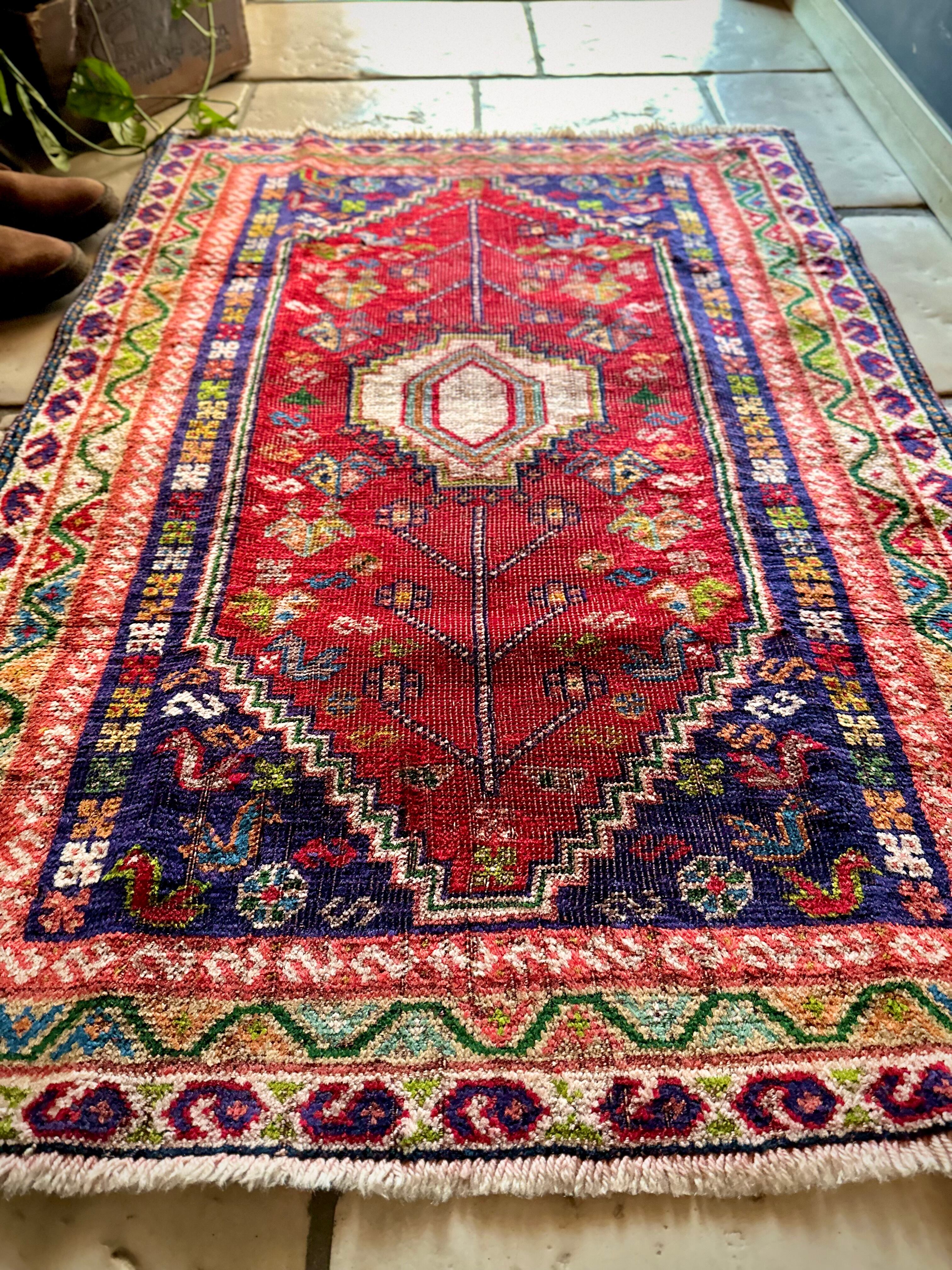 鮮やかなレッドに深みのあるパープル、そこに花々や鳥たちの賑やかな模様が描かれたこちらは、イラン西部のシラーズ近郊に居住するカシュガイ族のトライバルラグで、かなり使い込まれた味わいのあるアクセントラグになります。